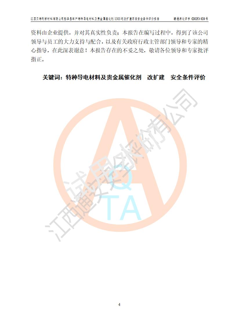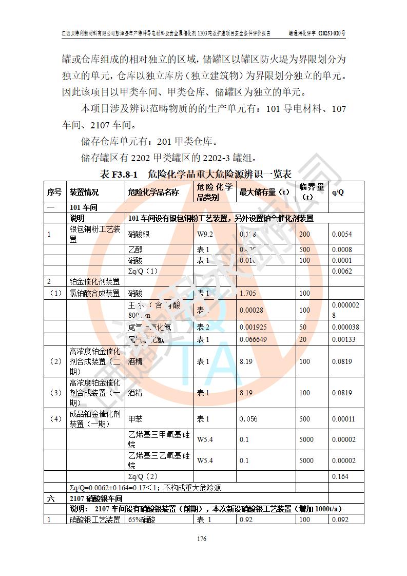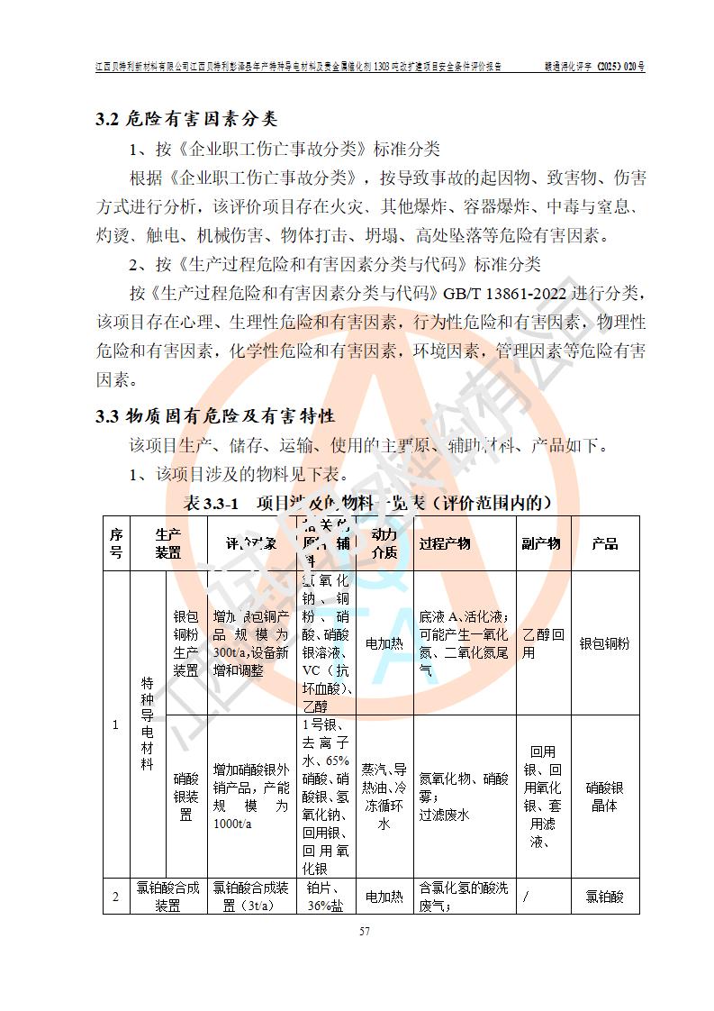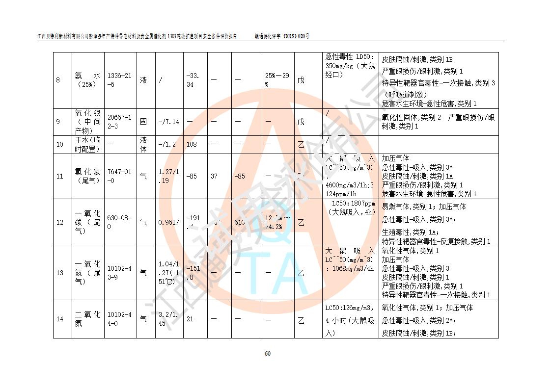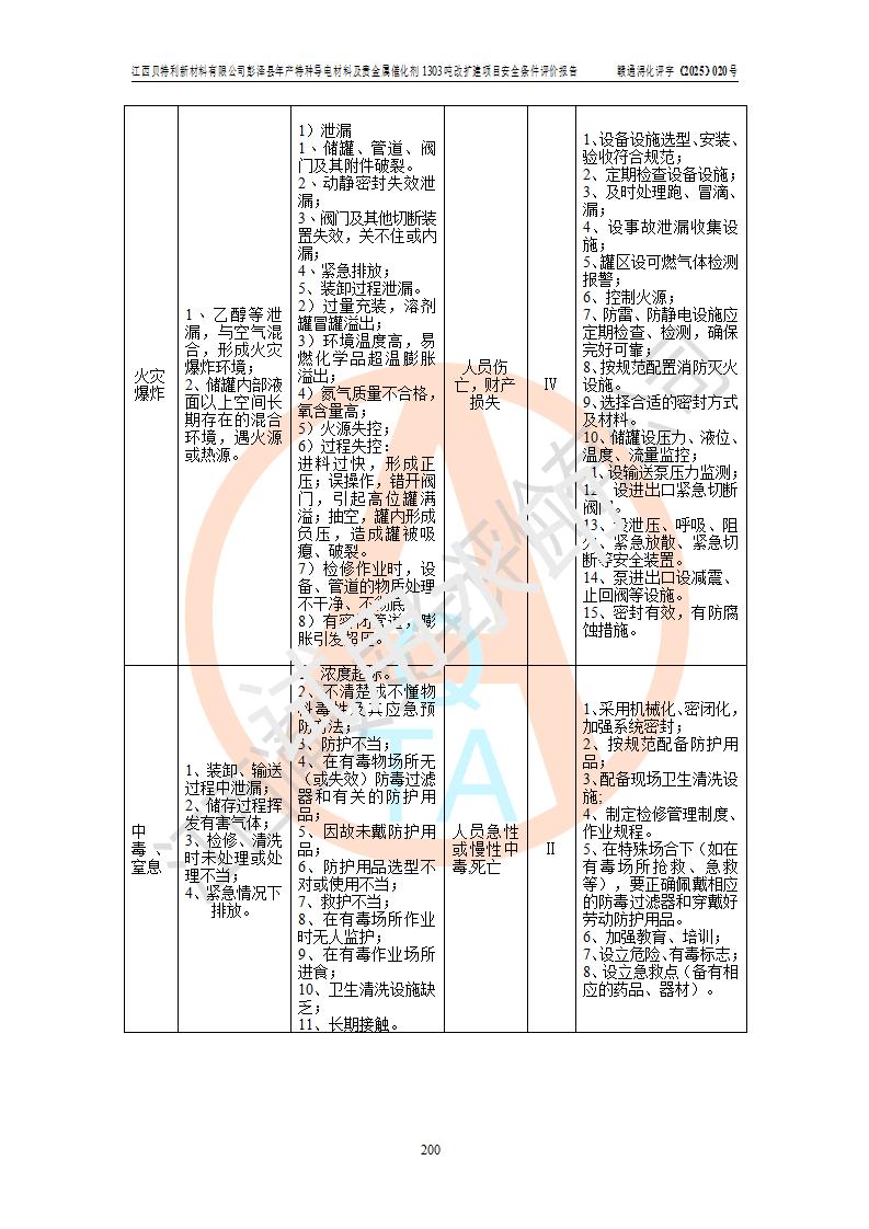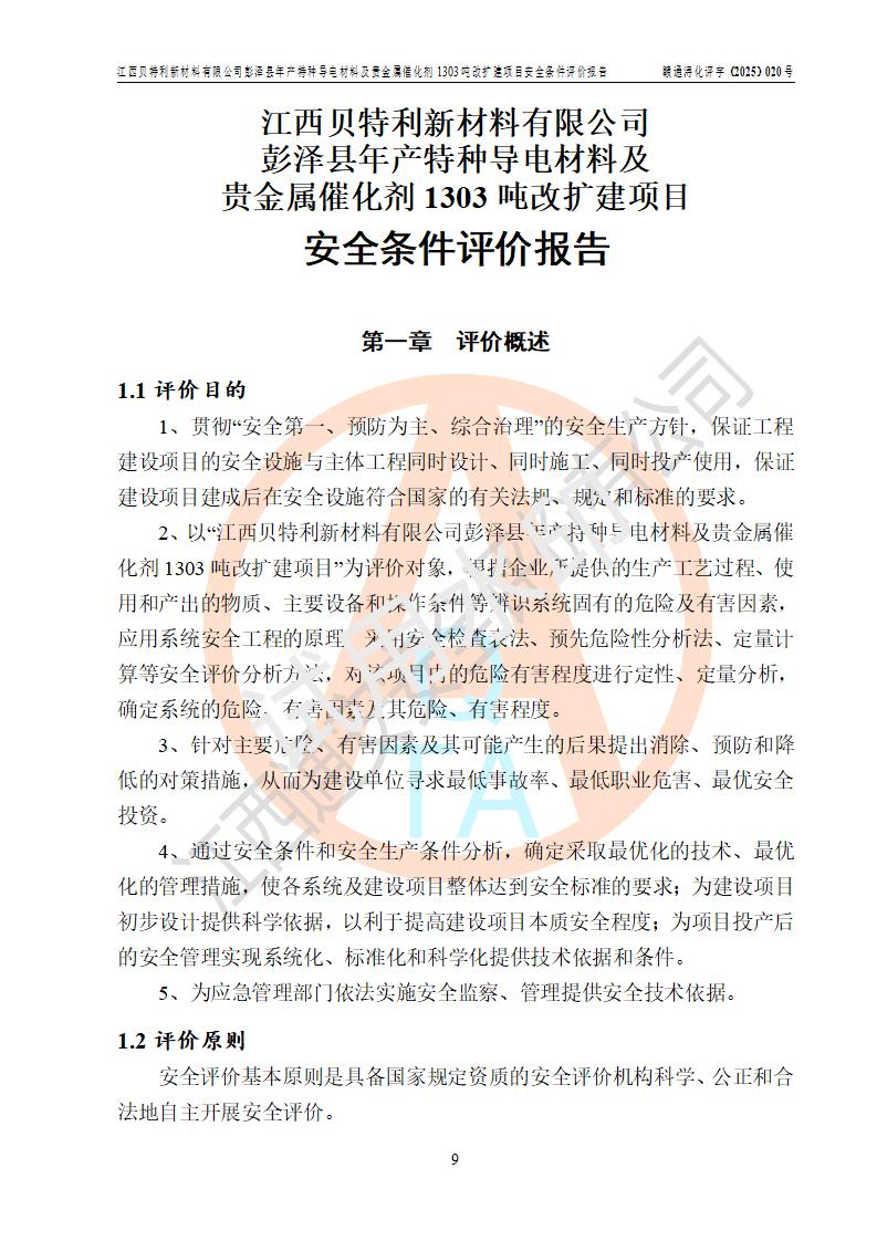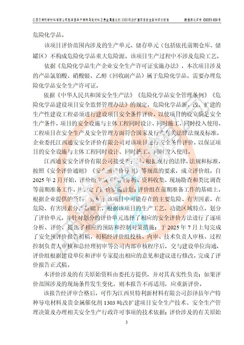評價報告名稱 | 江西貝特利新材料有限公司彭澤縣年產特種導電材料及貴金屬催化劑1303噸改擴建項目安全條件評價報告 | |||||