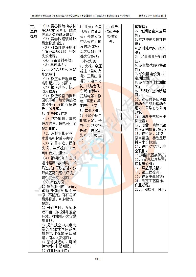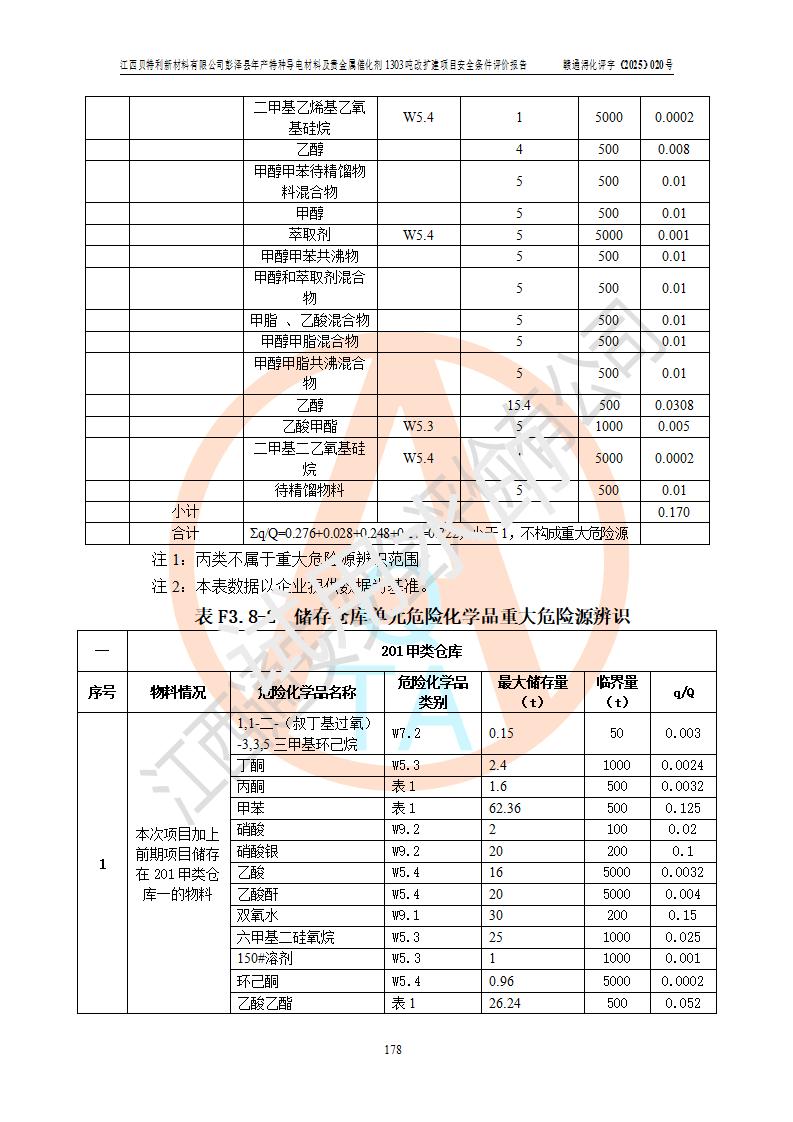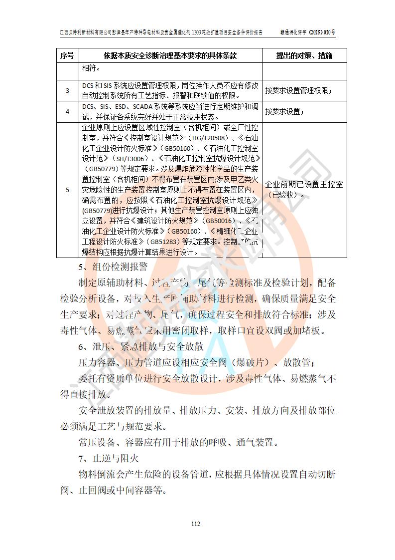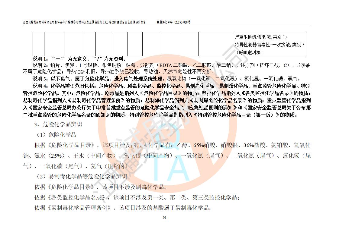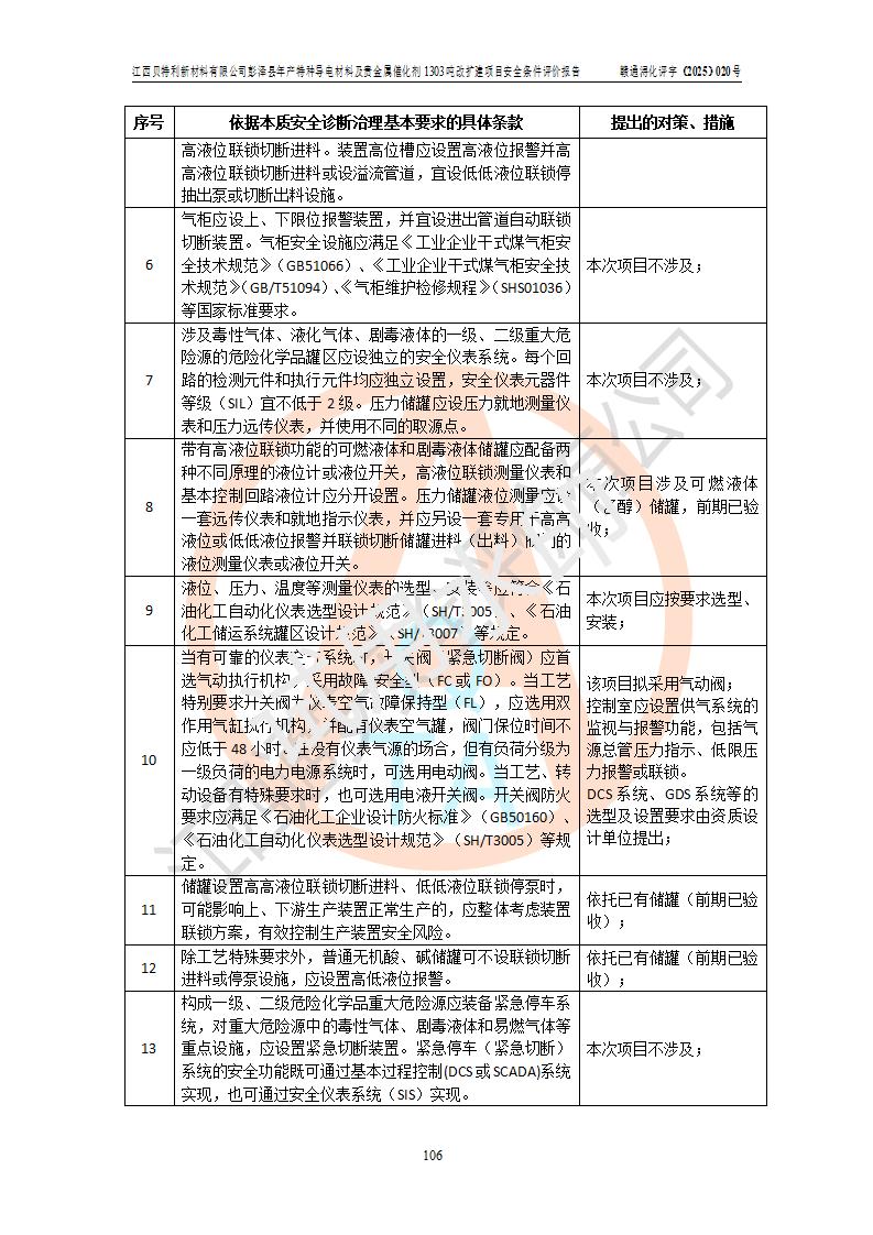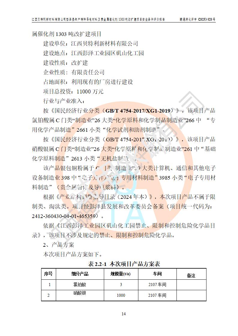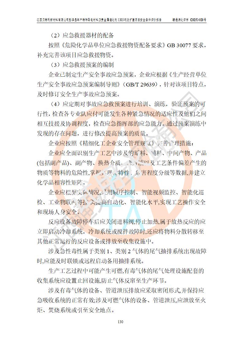 評價報告名稱 | 江西貝特利新材料有限公司彭澤縣年產特種導電材料及貴金屬催化劑1303噸改擴建項目安全條件評價報告 | |||||
