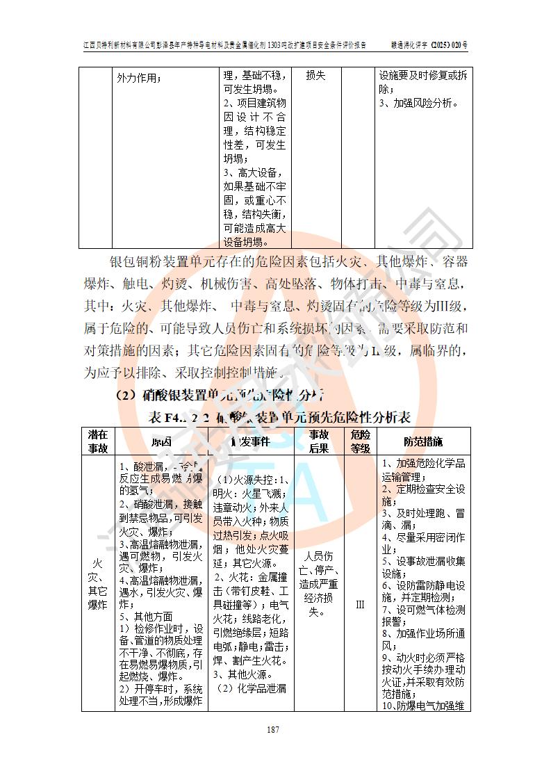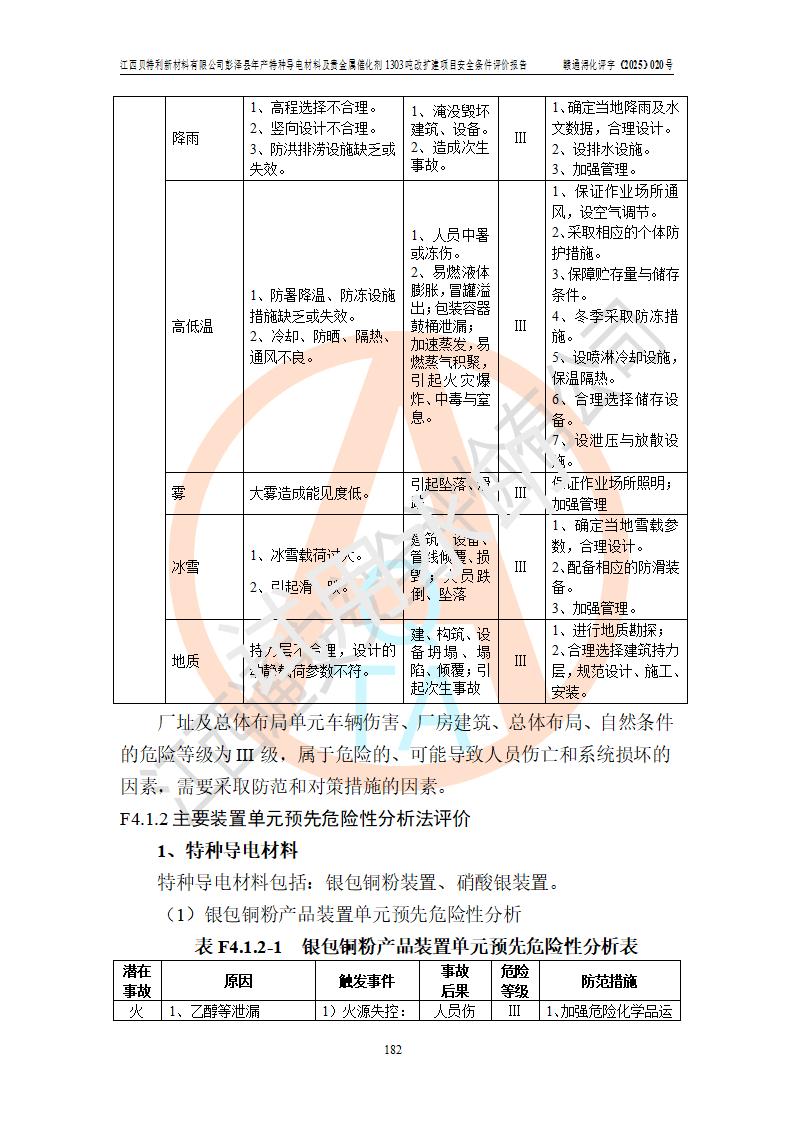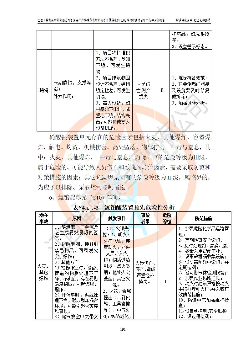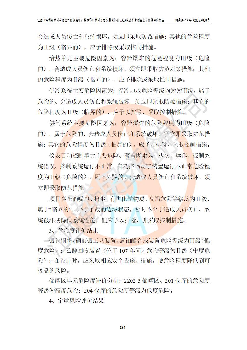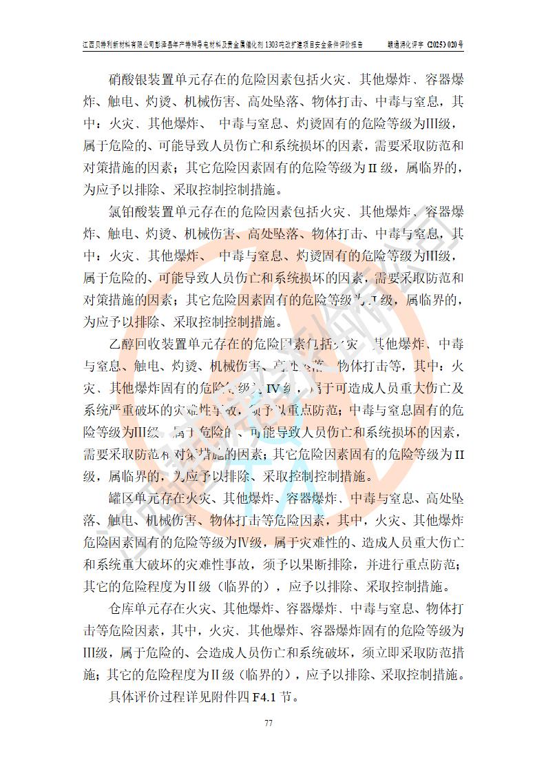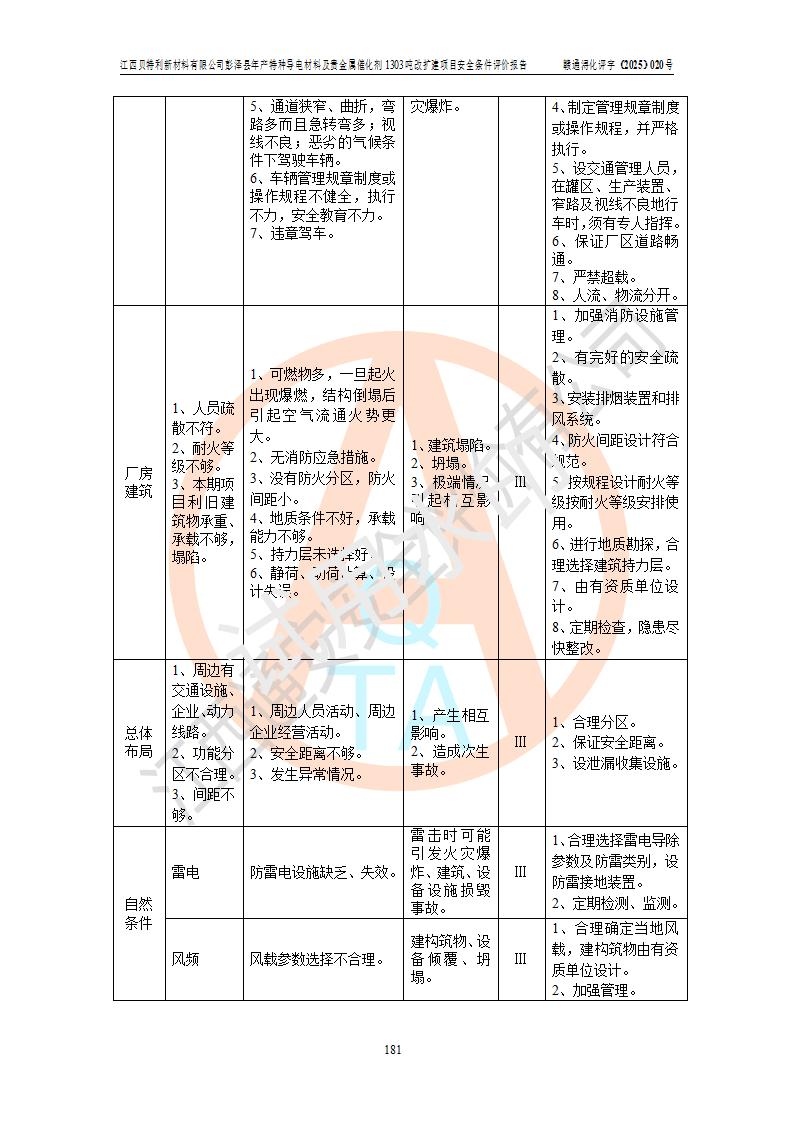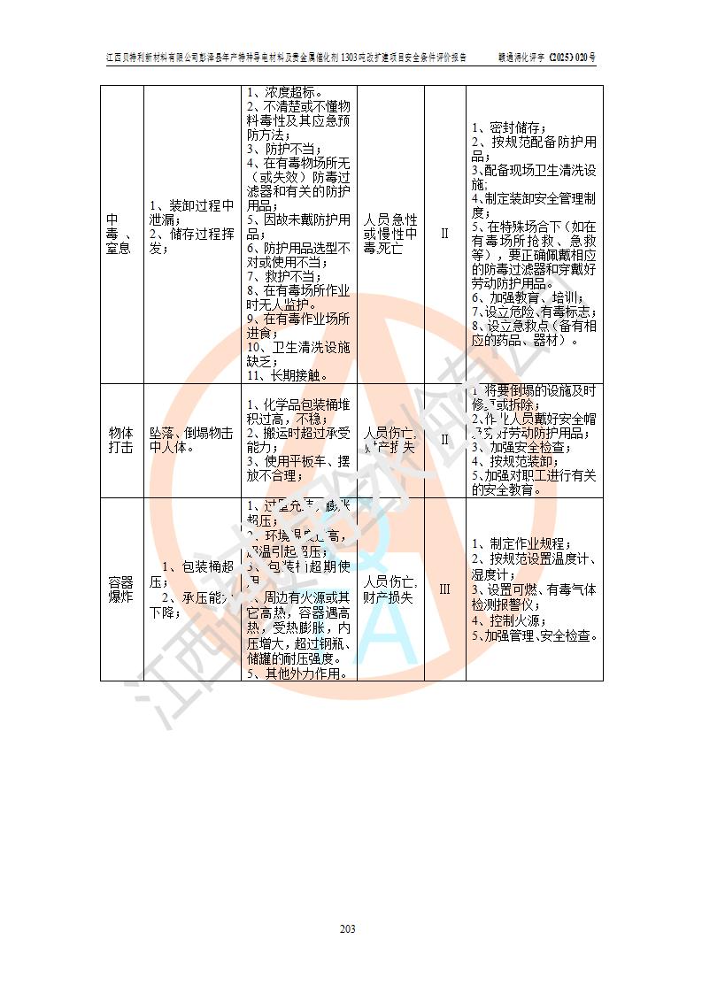 評價結論 | 江西貝特利新材料有限公司江西貝特利彭澤縣年產特種導電材料及貴金屬催化劑 1303噸改擴建項目的選址、總體布局、周邊環(huán)境、自然環(huán)境能滿足建設安全條件:項目選擇的工藝過程及設備設施的安全可靠性能達到**法規(guī)、標準規(guī)定要求。 項目存在的危險有害因素可控,在落實本評價報告提出的有關安全對策措施后,其危險有害程度能達到可以接受的程度,項目建設能夠實現(xiàn)安全運行的目標。 | |||||