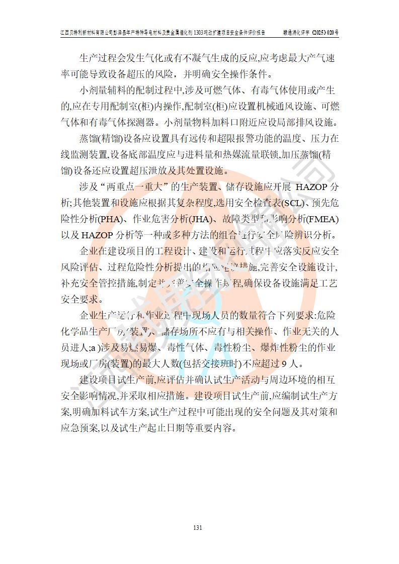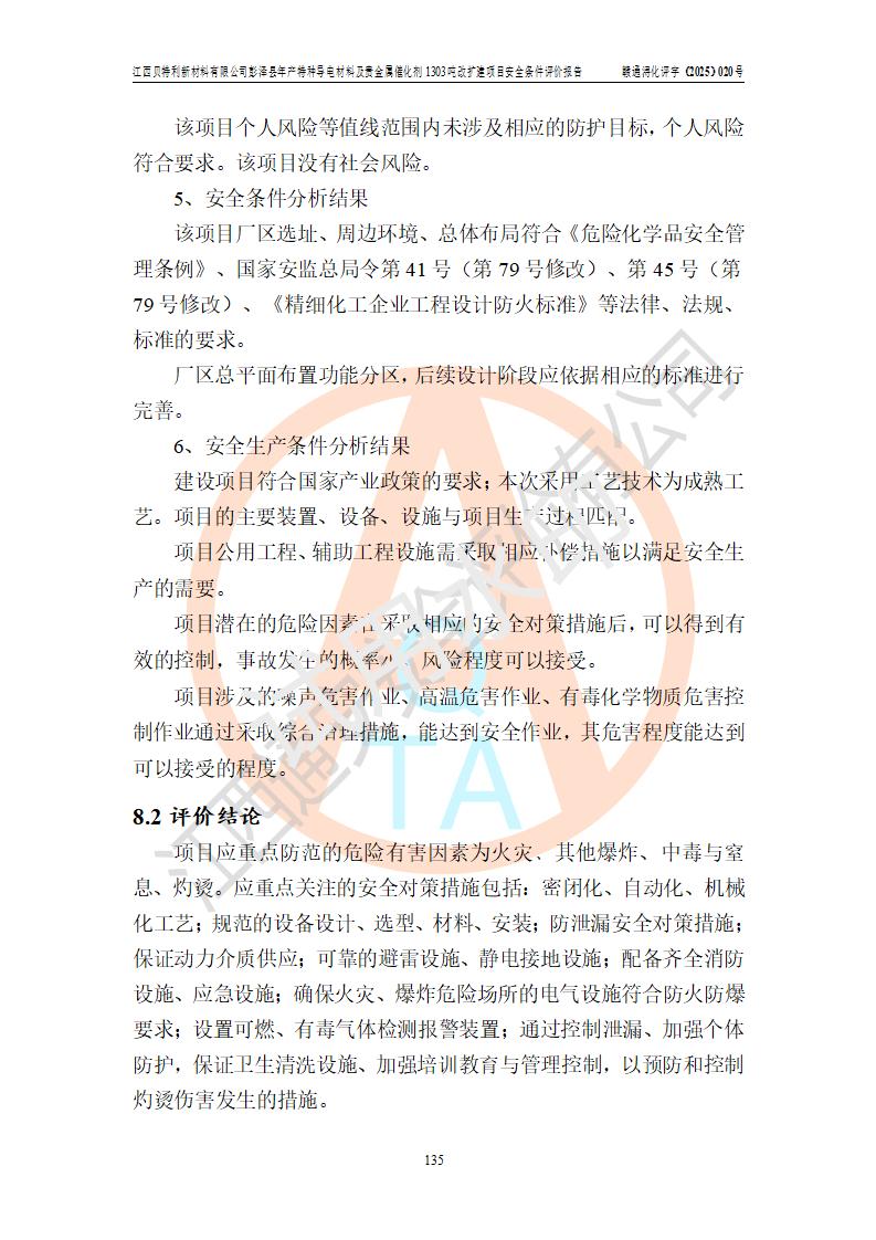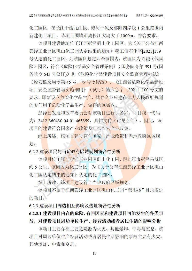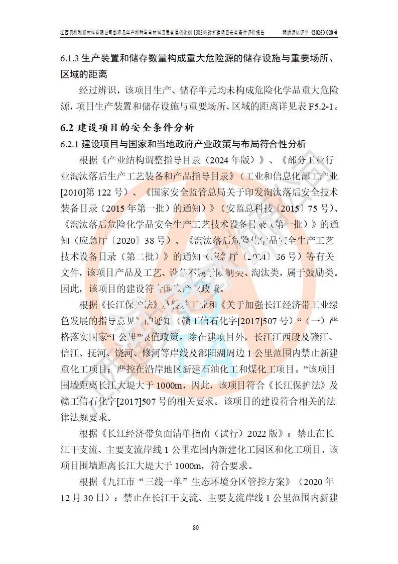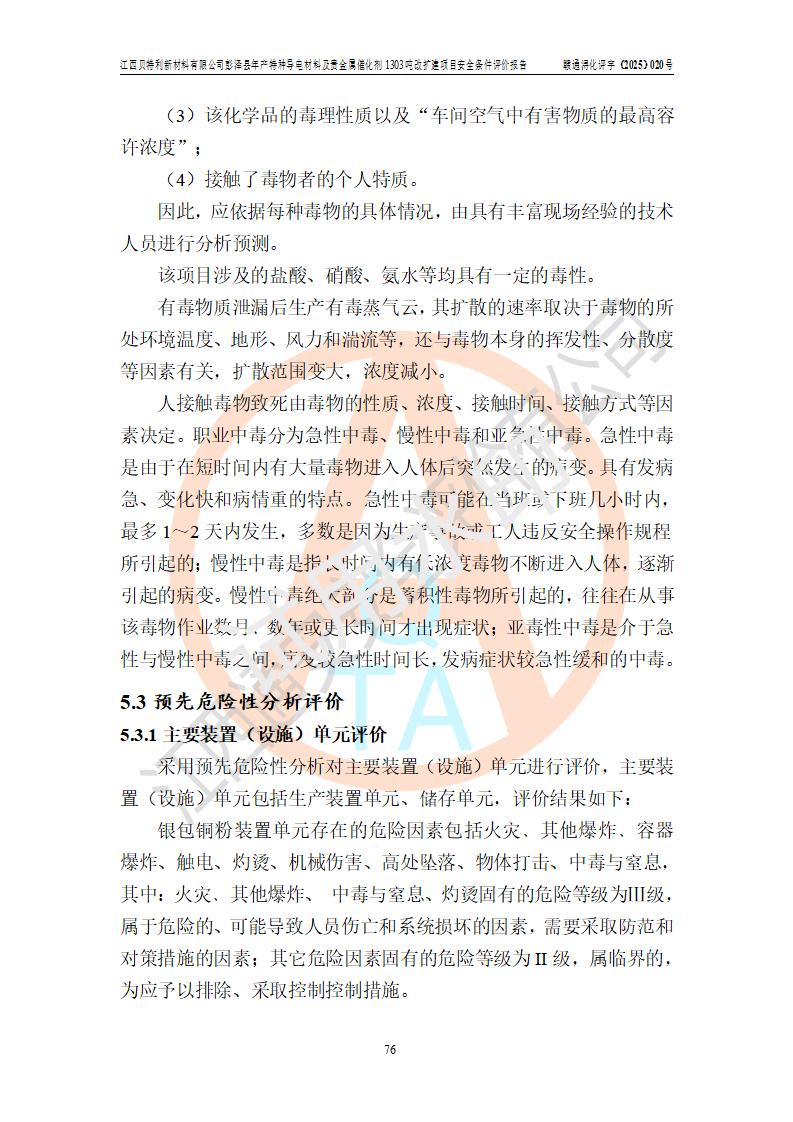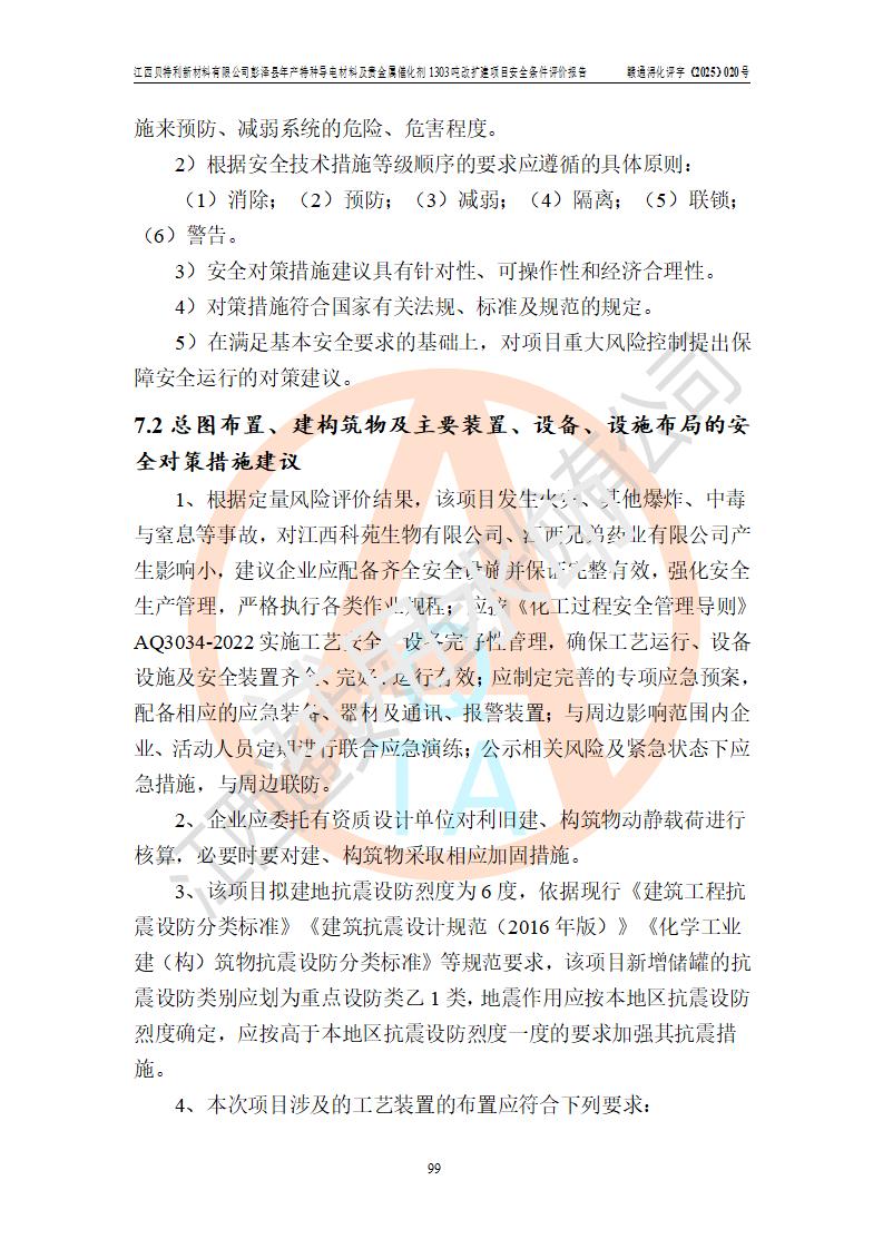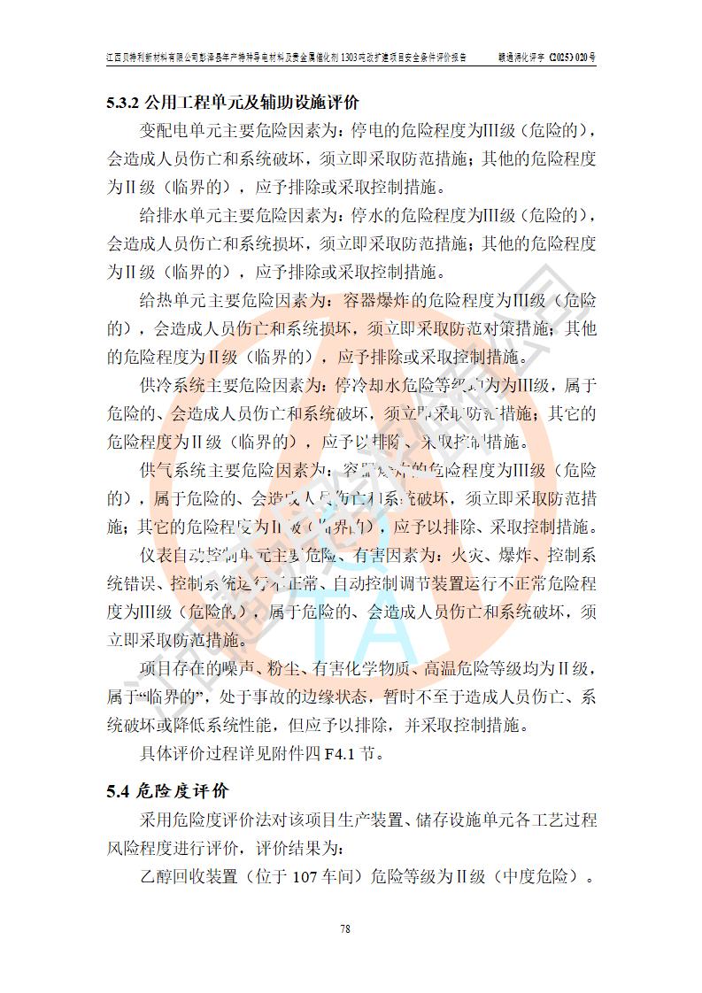 評價結論 | 江西貝特利新材料有限公司江西貝特利彭澤縣年產特種導電材料及貴金屬催化劑 1303噸改擴建項目的選址、總體布局、周邊環(huán)境、自然環(huán)境能滿足建設安全條件:項目選擇的工藝過程及設備設施的安全可靠性能達到**法規(guī)、標準規(guī)定要求。 項目存在的危險有害因素可控,在落實本評價報告提出的有關安全對策措施后,其危險有害程度能達到可以接受的程度,項目建設能夠實現(xiàn)安全運行的目標。 | |||||
