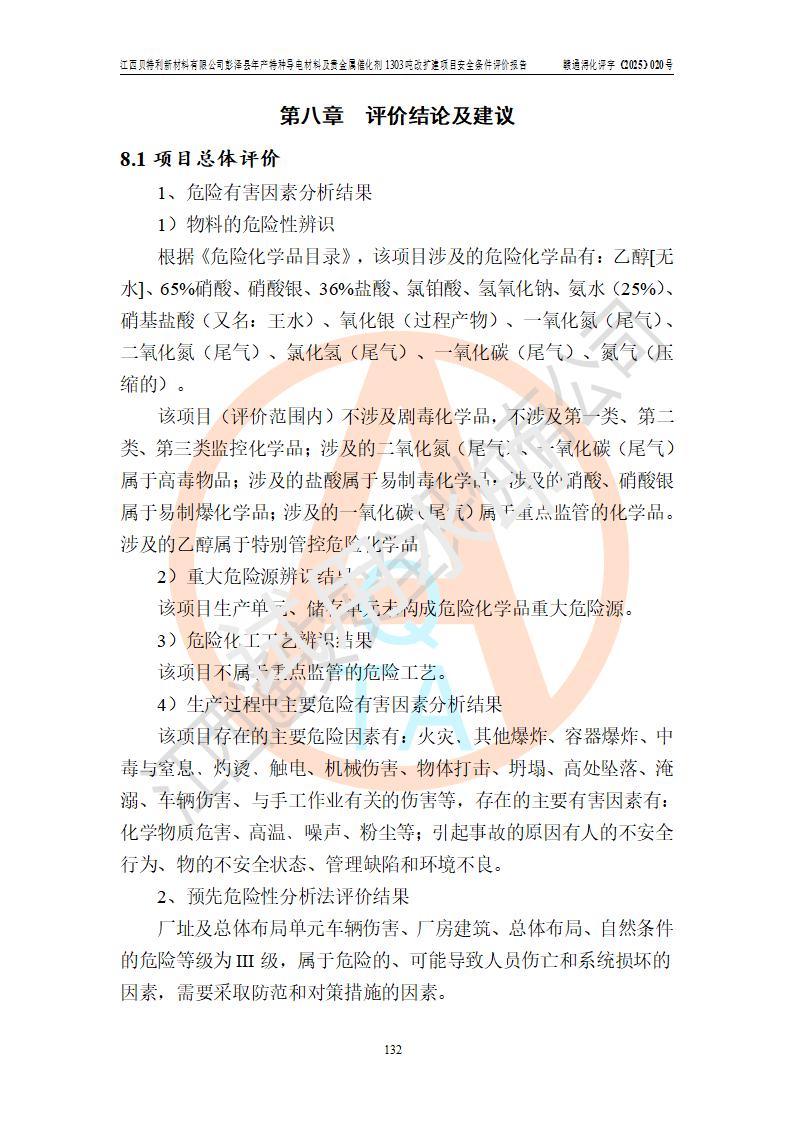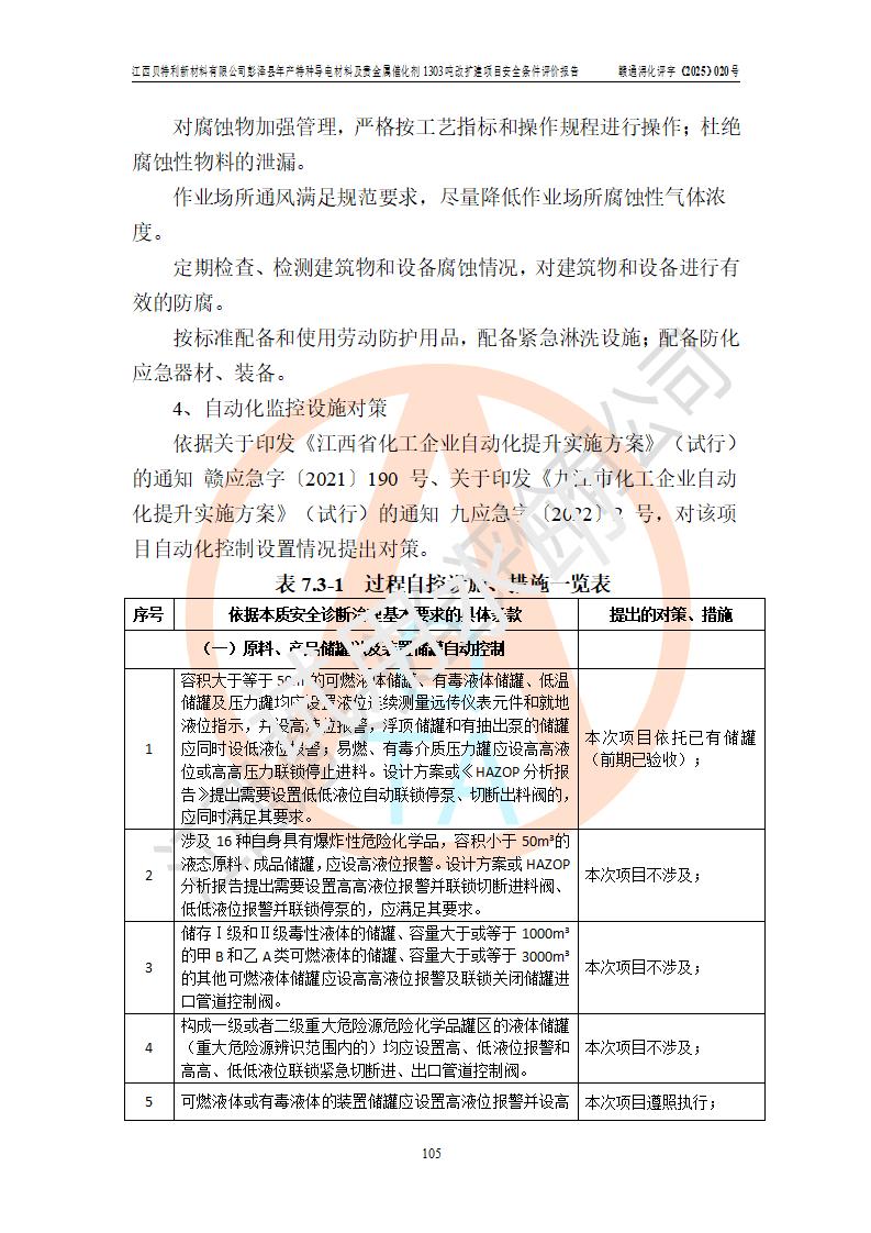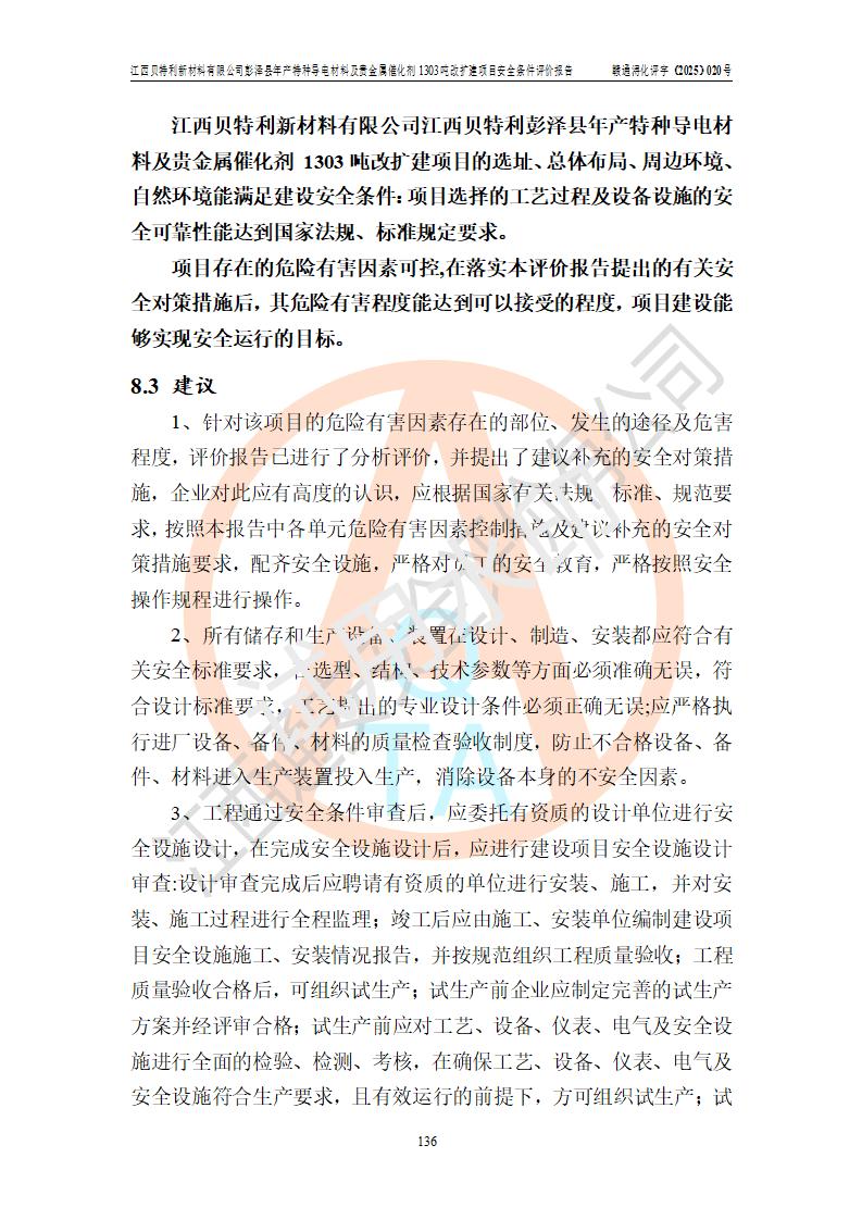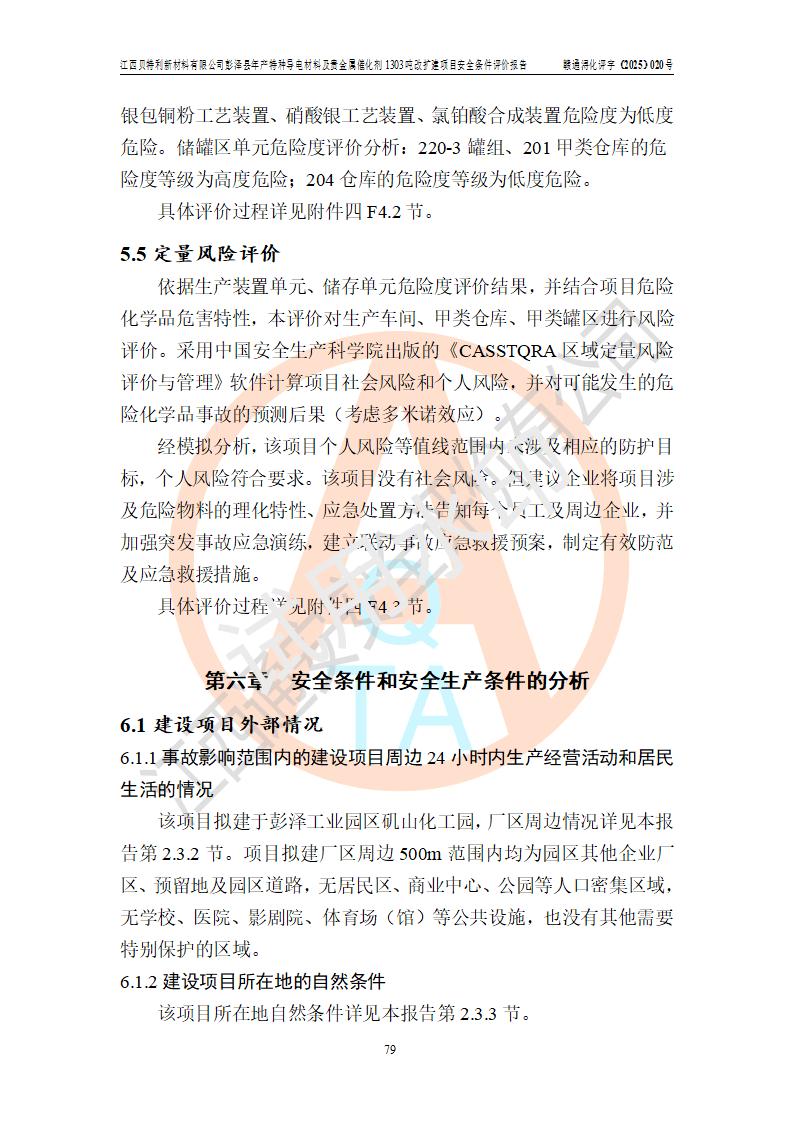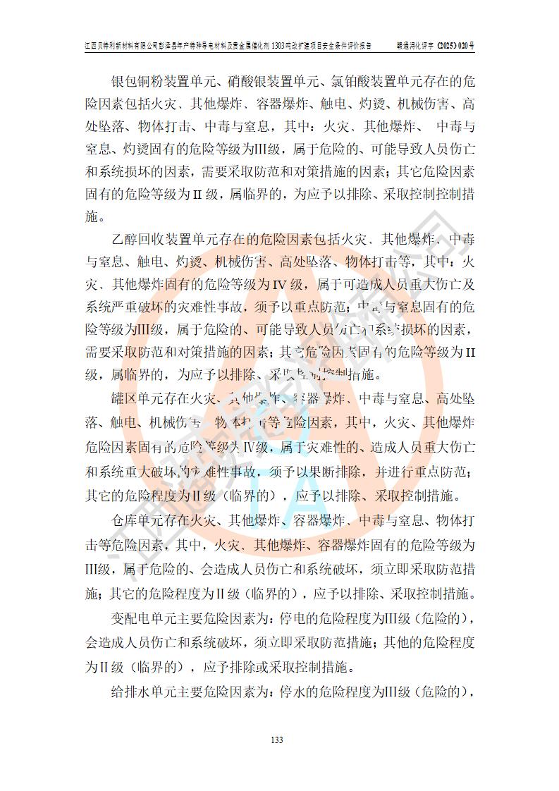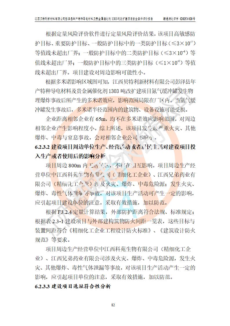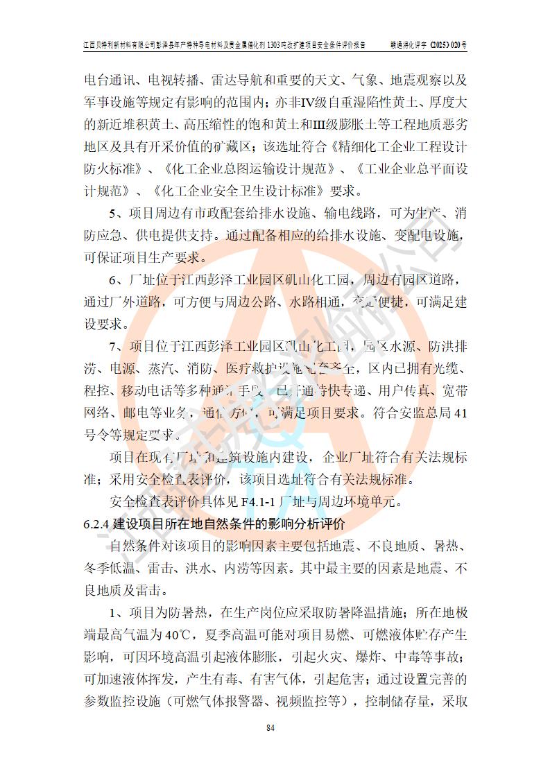 評價結論 | 江西貝特利新材料有限公司江西貝特利彭澤縣年產特種導電材料及貴金屬催化劑 1303噸改擴建項目的選址、總體布局、周邊環(huán)境、自然環(huán)境能滿足建設安全條件:項目選擇的工藝過程及設備設施的安全可靠性能達到**法規(guī)、標準規(guī)定要求。 項目存在的危險有害因素可控,在落實本評價報告提出的有關安全對策措施后,其危險有害程度能達到可以接受的程度,項目建設能夠實現(xiàn)安全運行的目標。 | |||||