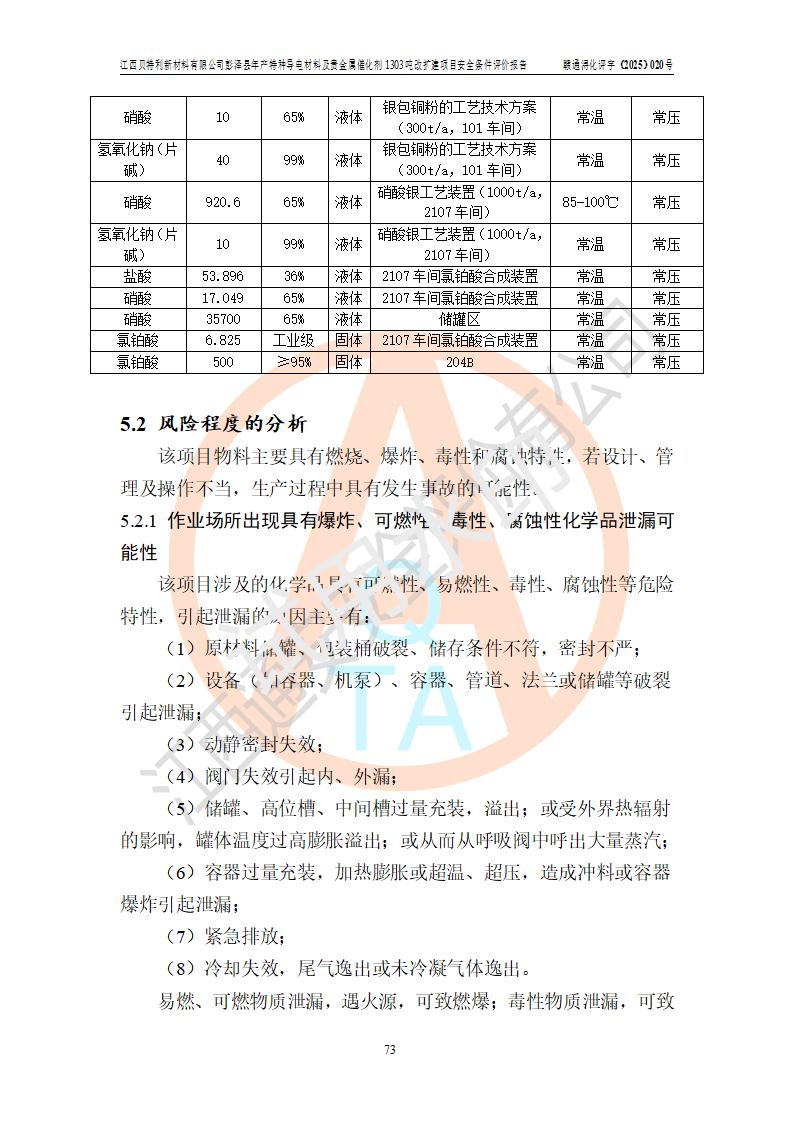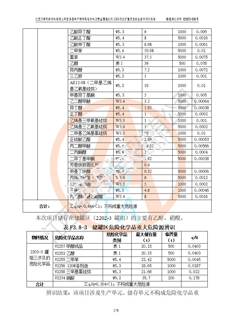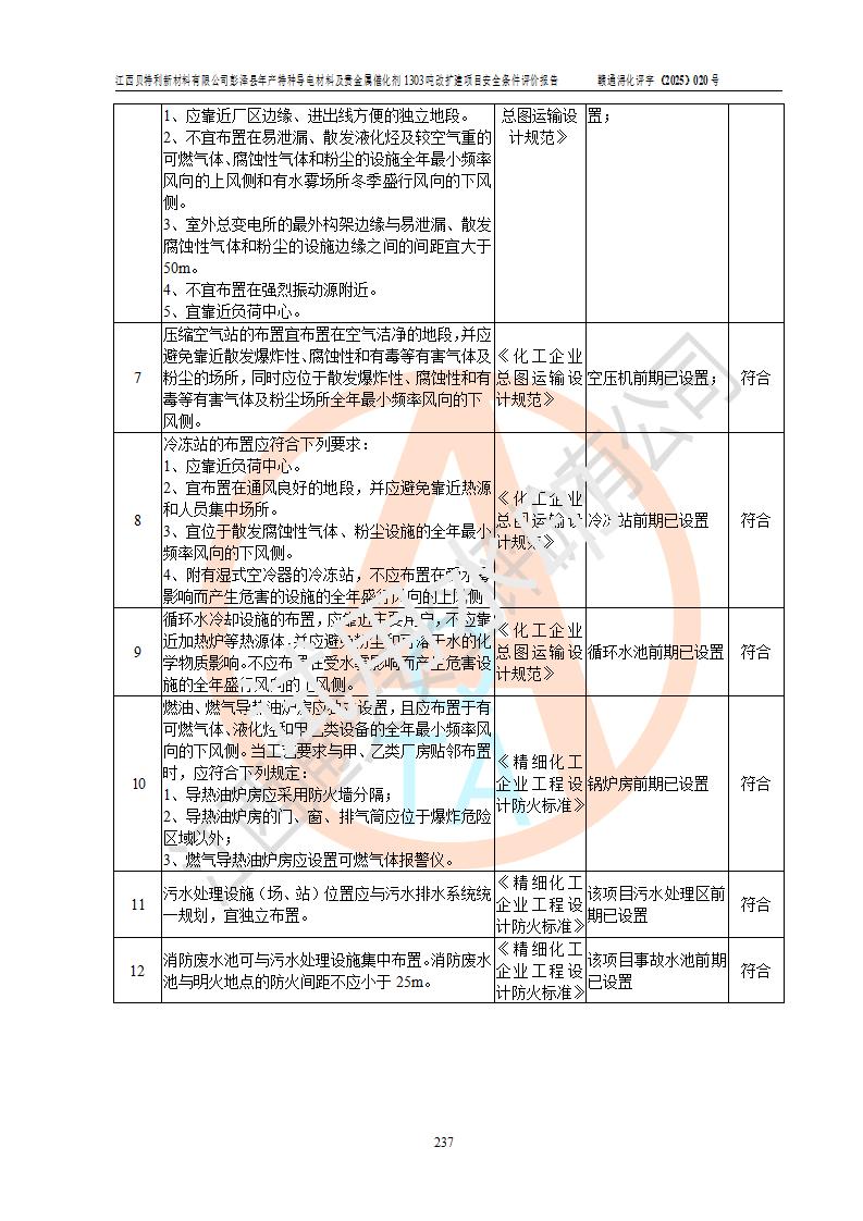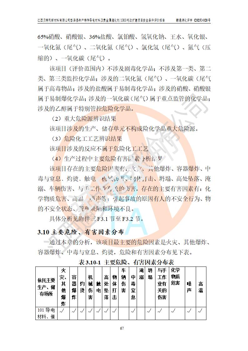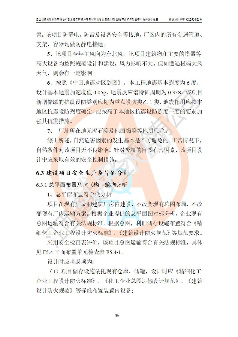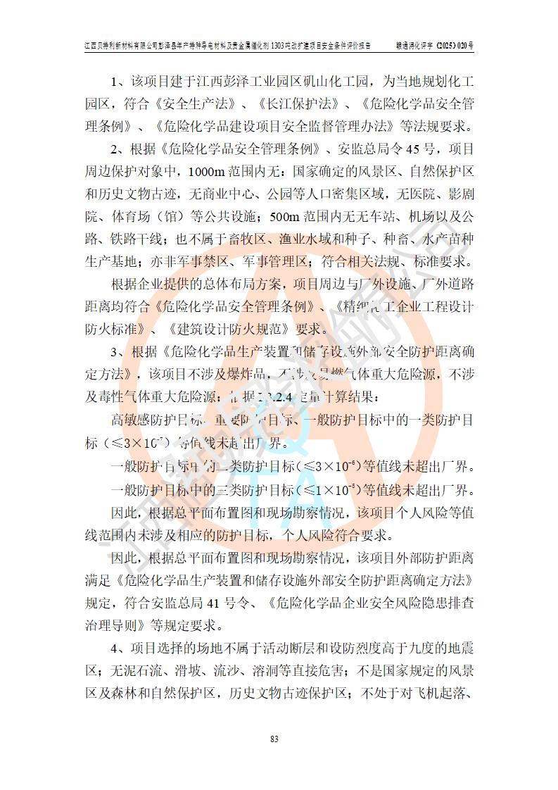 評價結論 | 江西貝特利新材料有限公司江西貝特利彭澤縣年產特種導電材料及貴金屬催化劑 1303噸改擴建項目的選址、總體布局、周邊環(huán)境、自然環(huán)境能滿足建設安全條件:項目選擇的工藝過程及設備設施的安全可靠性能達到**法規(guī)、標準規(guī)定要求。 項目存在的危險有害因素可控,在落實本評價報告提出的有關安全對策措施后,其危險有害程度能達到可以接受的程度,項目建設能夠實現(xiàn)安全運行的目標。 | |||||