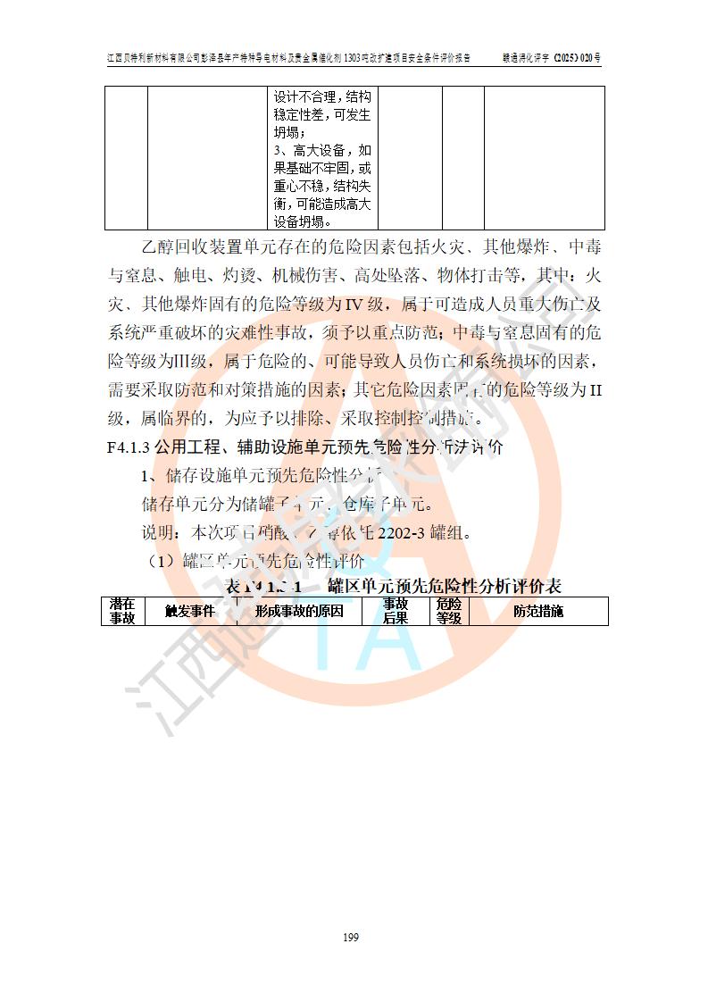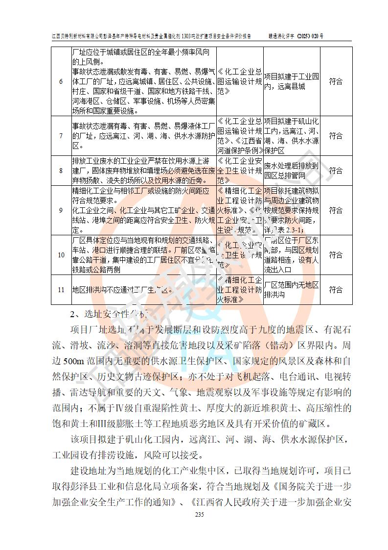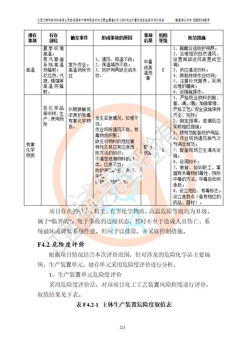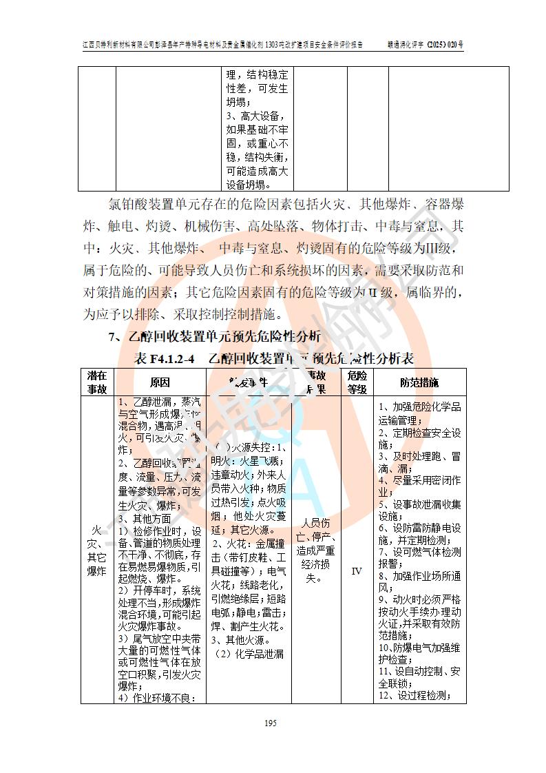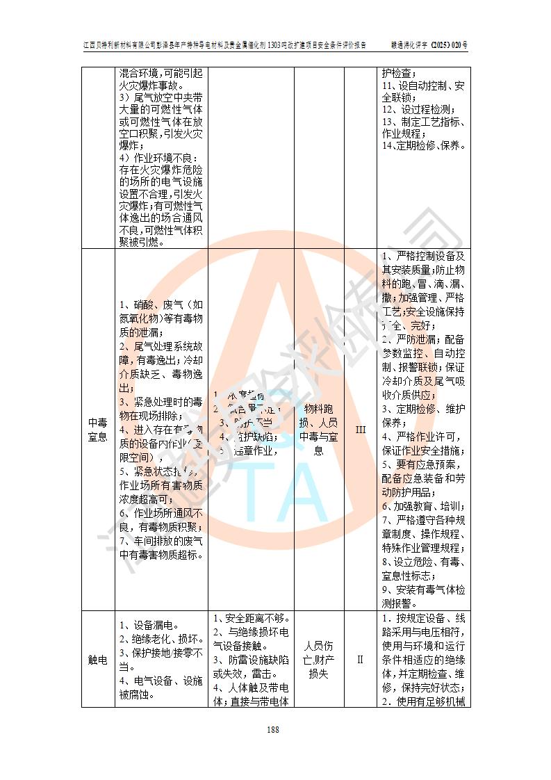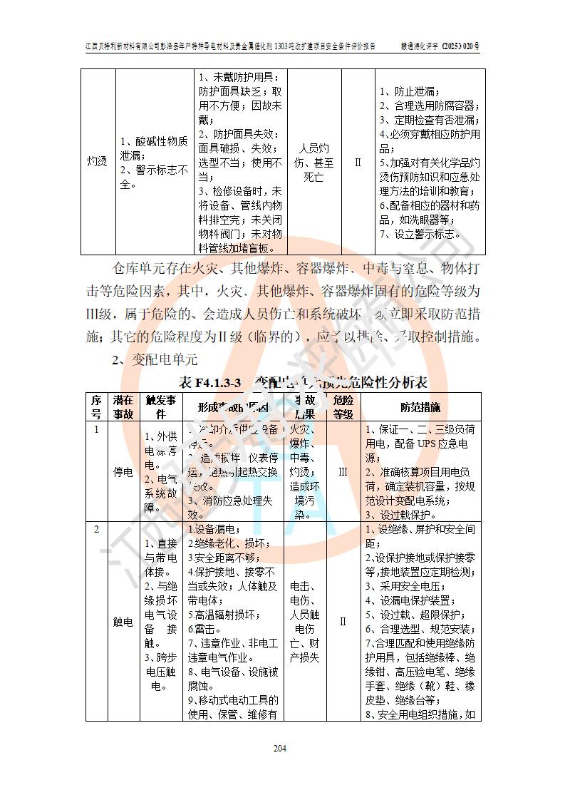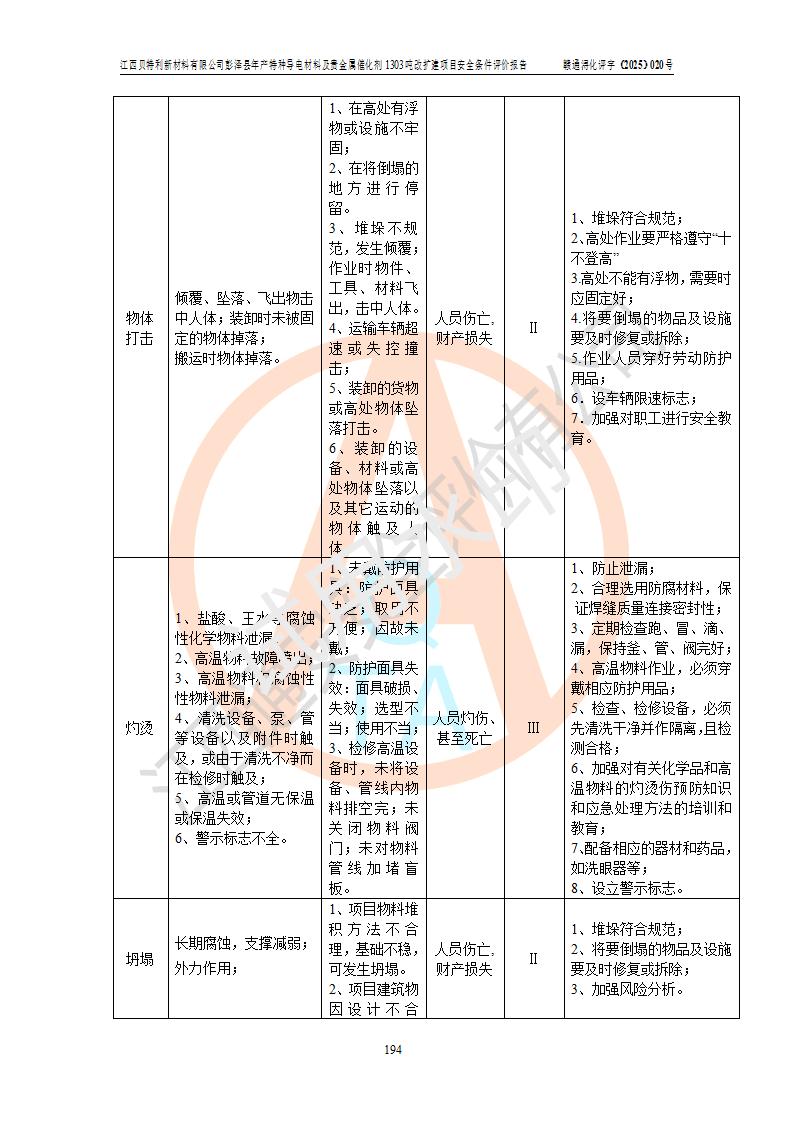 評價結論 | 江西貝特利新材料有限公司江西貝特利彭澤縣年產特種導電材料及貴金屬催化劑 1303噸改擴建項目的選址、總體布局、周邊環(huán)境、自然環(huán)境能滿足建設安全條件:項目選擇的工藝過程及設備設施的安全可靠性能達到**法規(guī)、標準規(guī)定要求。 項目存在的危險有害因素可控,在落實本評價報告提出的有關安全對策措施后,其危險有害程度能達到可以接受的程度,項目建設能夠實現(xiàn)安全運行的目標。 | |||||