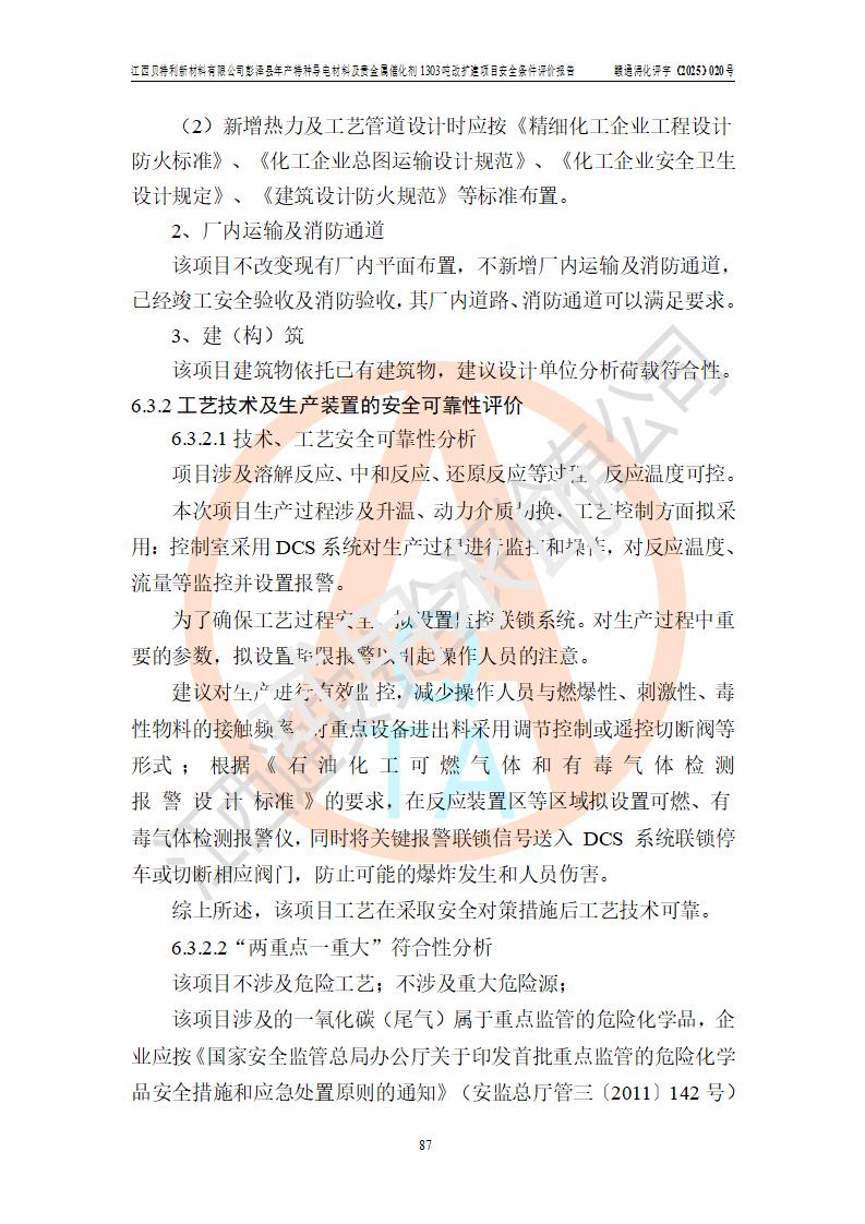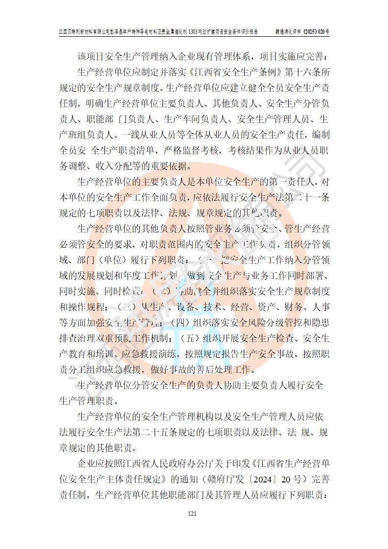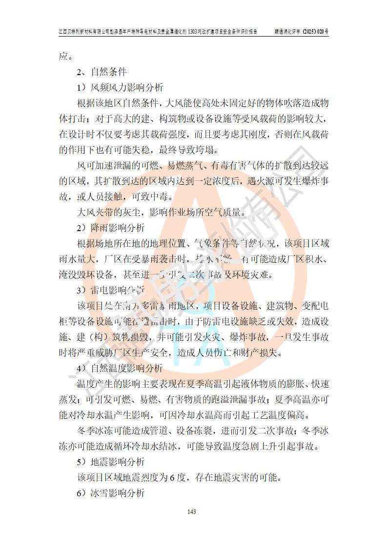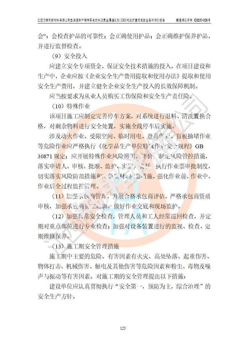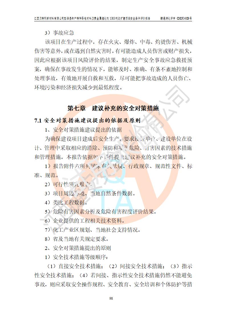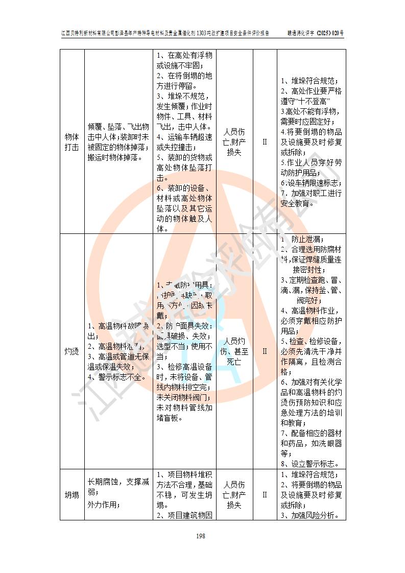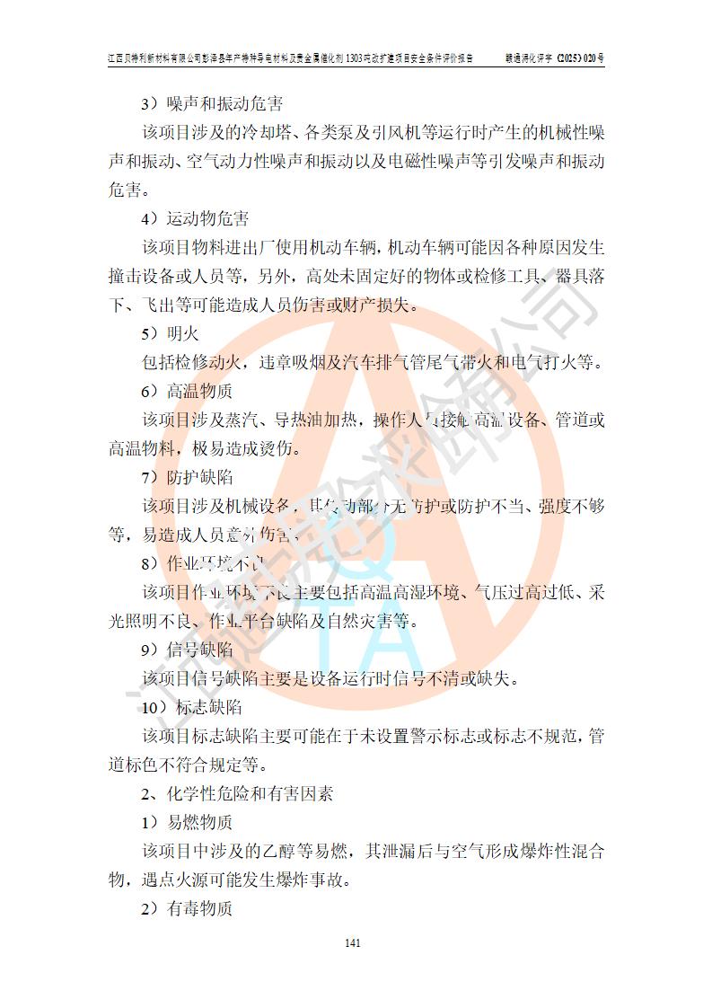 評價結論 | 江西貝特利新材料有限公司江西貝特利彭澤縣年產特種導電材料及貴金屬催化劑 1303噸改擴建項目的選址、總體布局、周邊環(huán)境、自然環(huán)境能滿足建設安全條件:項目選擇的工藝過程及設備設施的安全可靠性能達到**法規(guī)、標準規(guī)定要求。 項目存在的危險有害因素可控,在落實本評價報告提出的有關安全對策措施后,其危險有害程度能達到可以接受的程度,項目建設能夠實現(xiàn)安全運行的目標。 | |||||