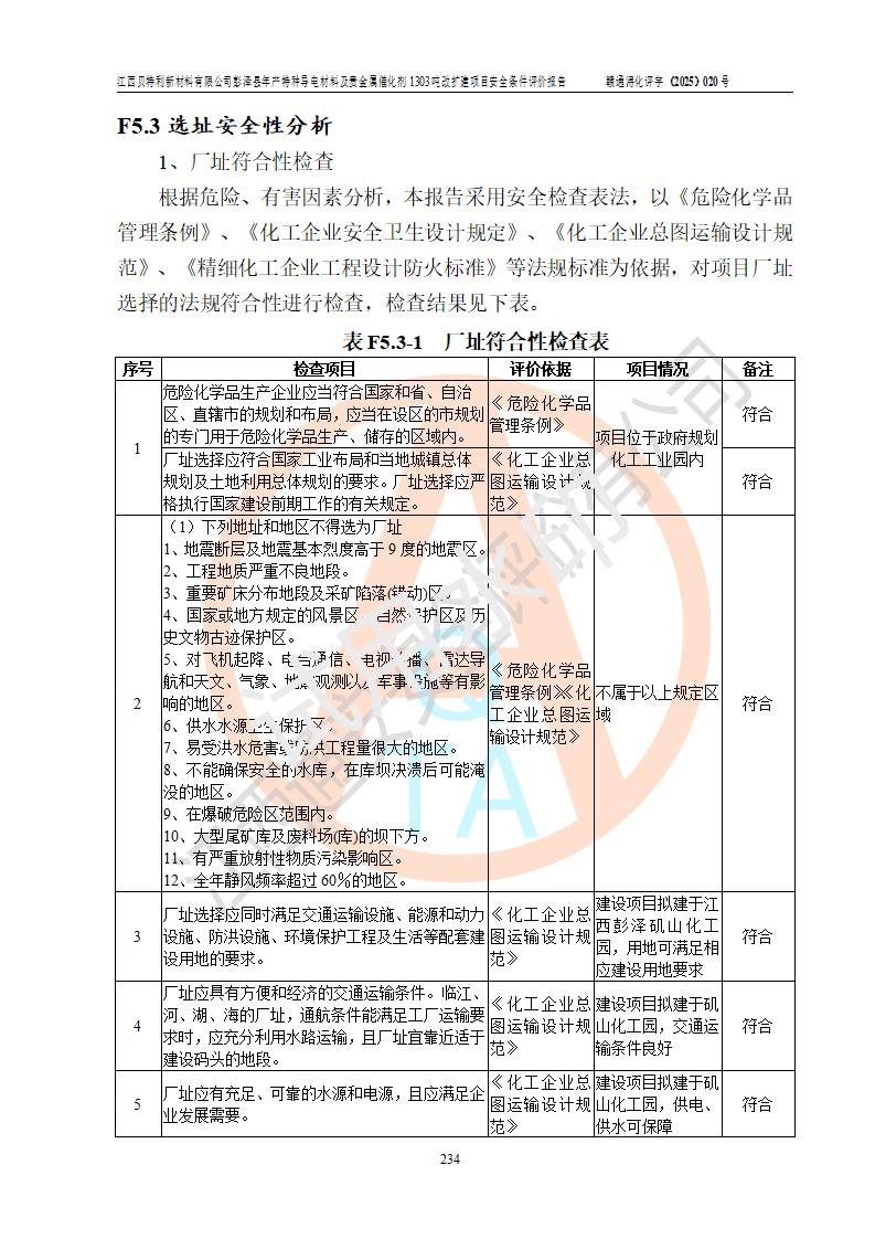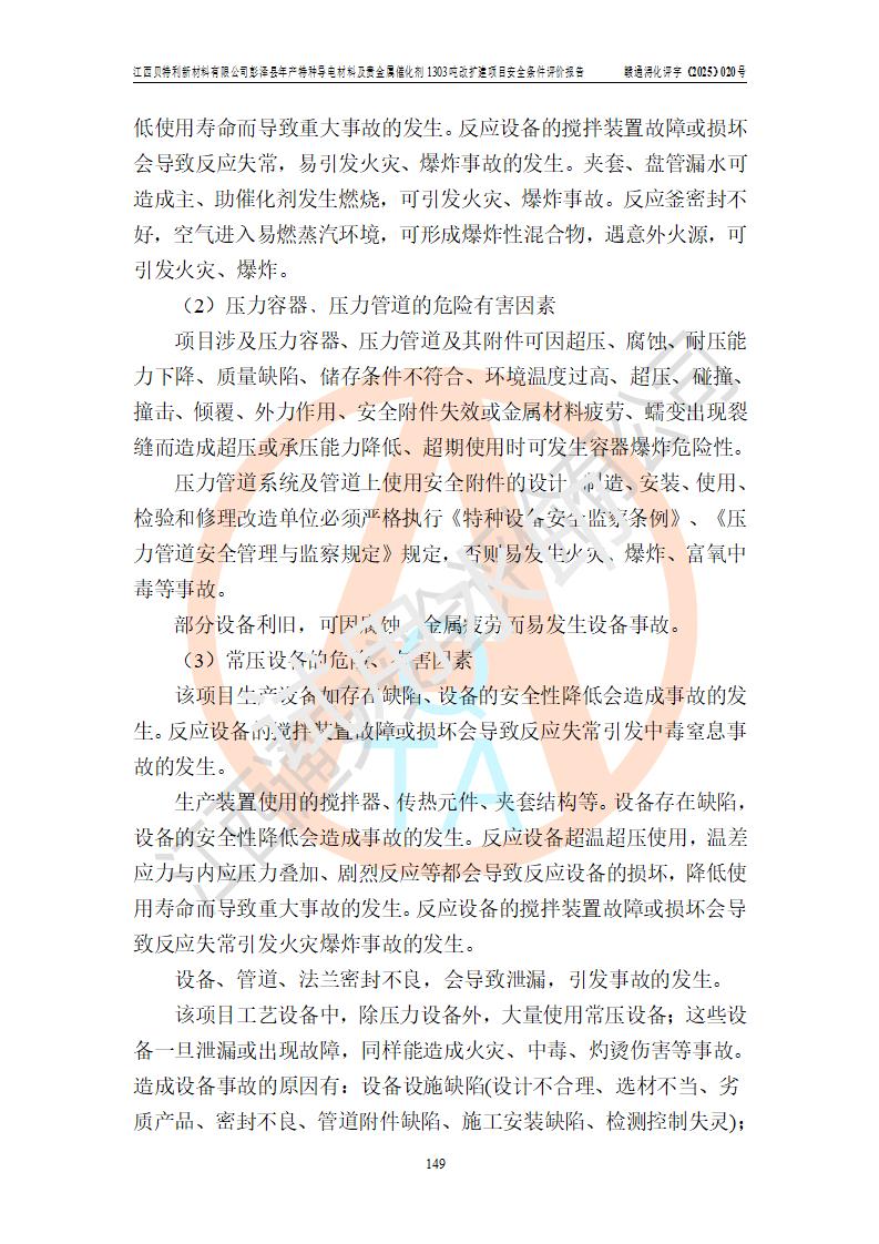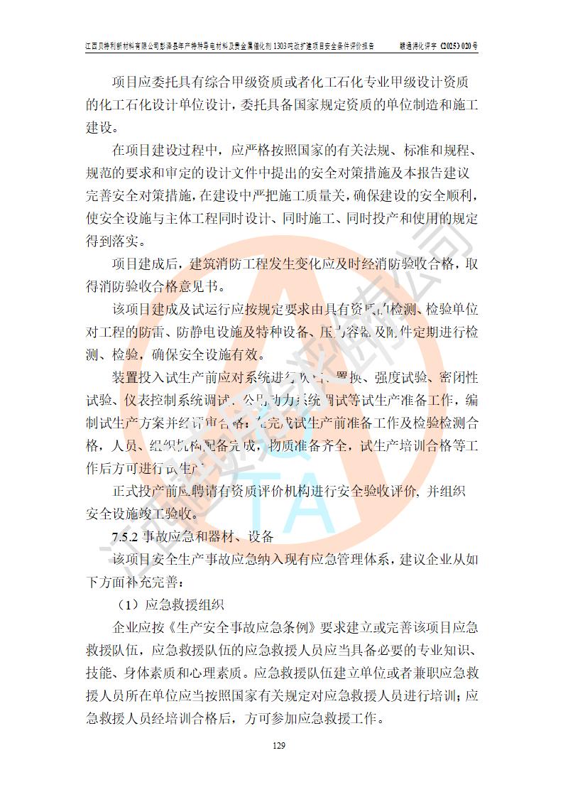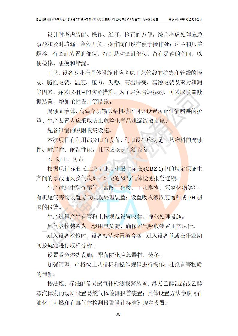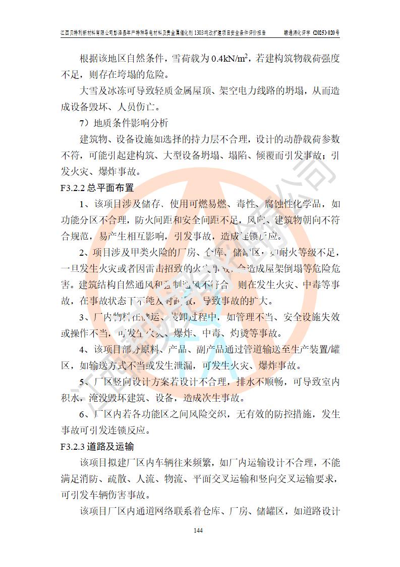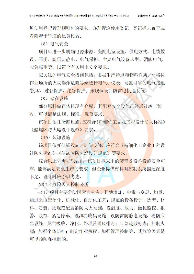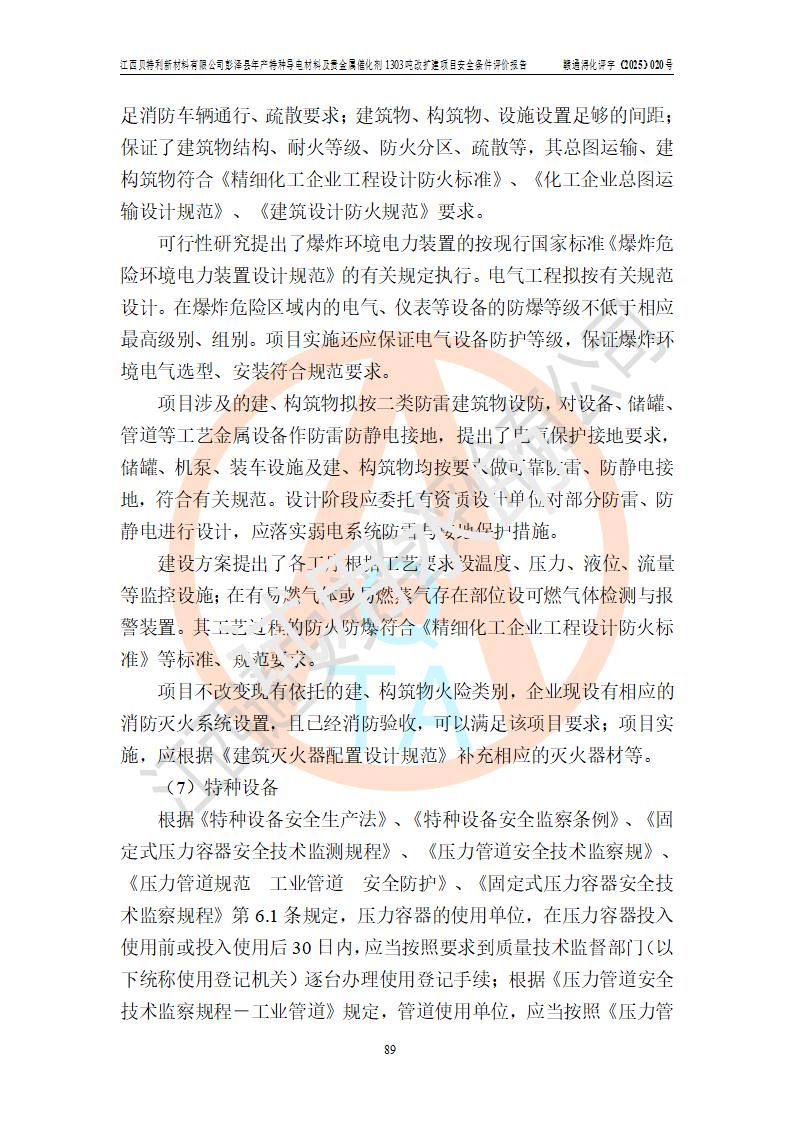 評價結論 | 江西貝特利新材料有限公司江西貝特利彭澤縣年產特種導電材料及貴金屬催化劑 1303噸改擴建項目的選址、總體布局、周邊環(huán)境、自然環(huán)境能滿足建設安全條件:項目選擇的工藝過程及設備設施的安全可靠性能達到**法規(guī)、標準規(guī)定要求。 項目存在的危險有害因素可控,在落實本評價報告提出的有關安全對策措施后,其危險有害程度能達到可以接受的程度,項目建設能夠實現(xiàn)安全運行的目標。 | |||||