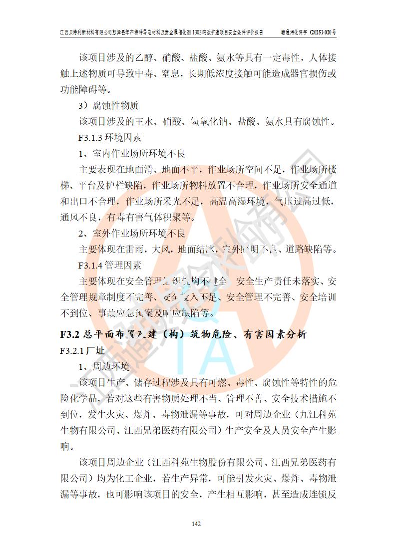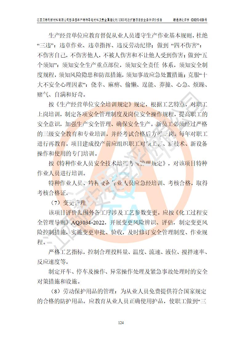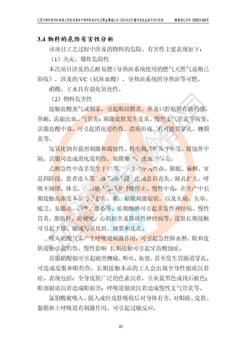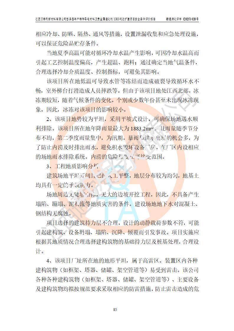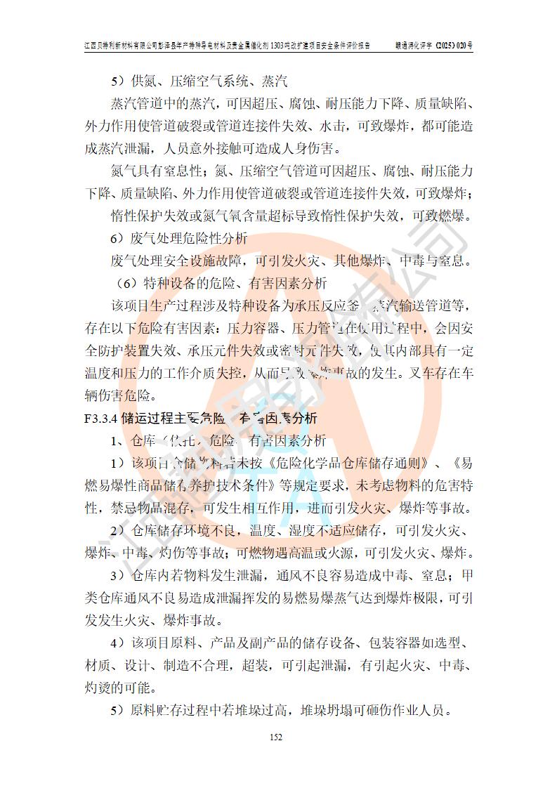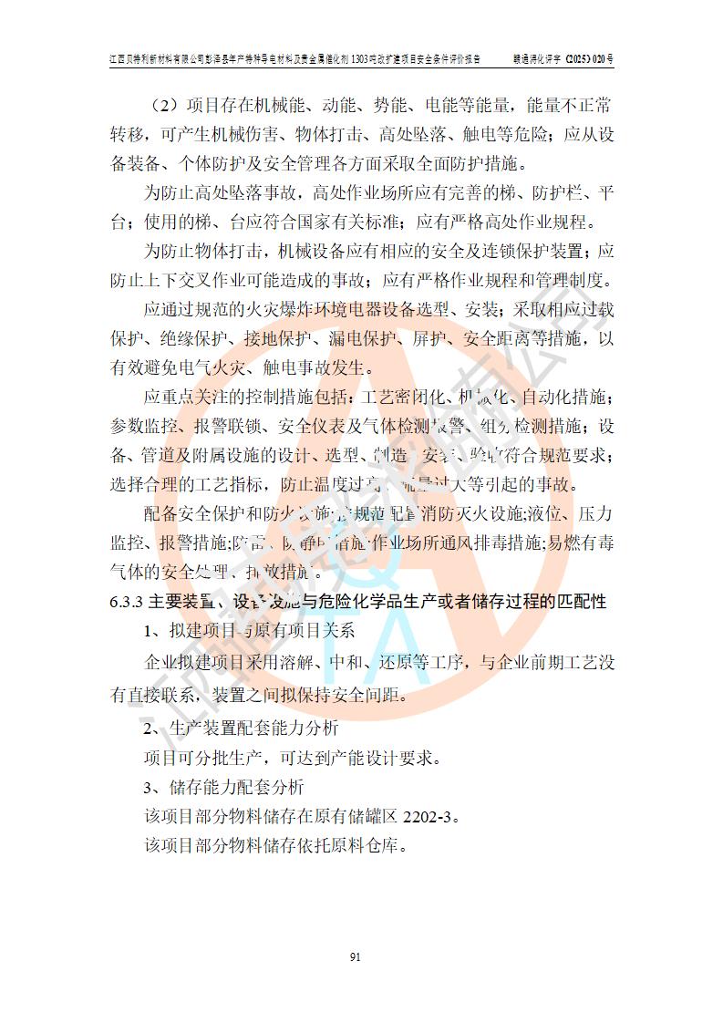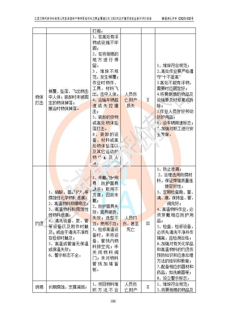 評價結論 | 江西貝特利新材料有限公司江西貝特利彭澤縣年產特種導電材料及貴金屬催化劑 1303噸改擴建項目的選址、總體布局、周邊環(huán)境、自然環(huán)境能滿足建設安全條件:項目選擇的工藝過程及設備設施的安全可靠性能達到**法規(guī)、標準規(guī)定要求。 項目存在的危險有害因素可控,在落實本評價報告提出的有關安全對策措施后,其危險有害程度能達到可以接受的程度,項目建設能夠實現(xiàn)安全運行的目標。 | |||||