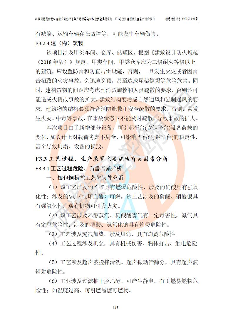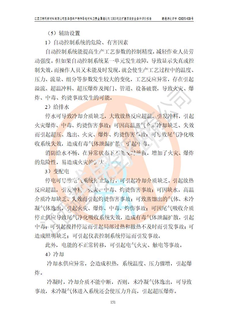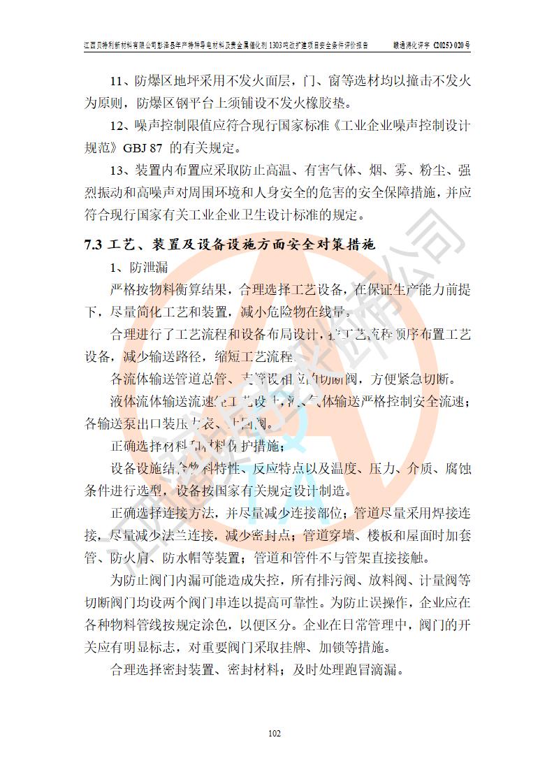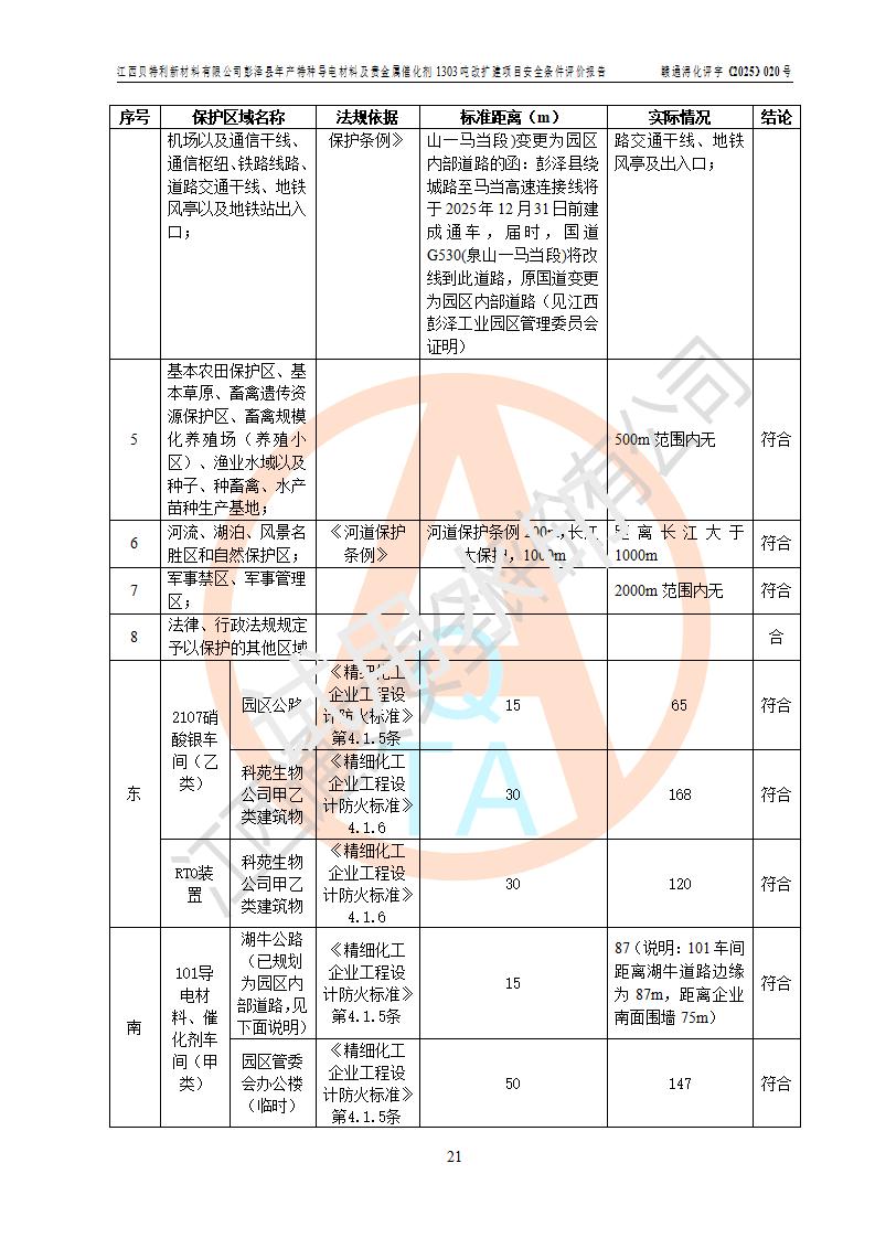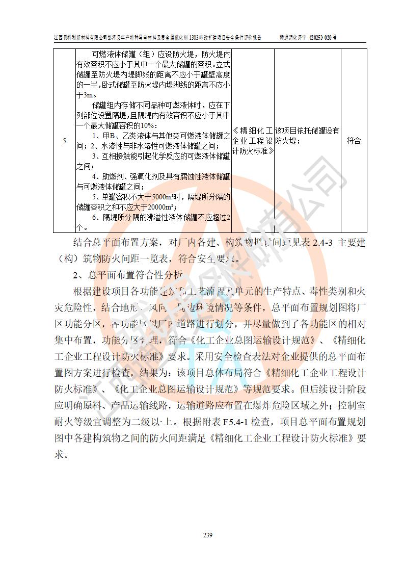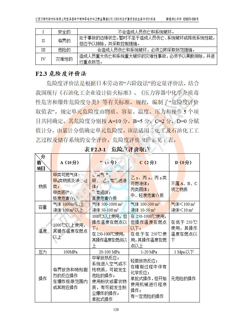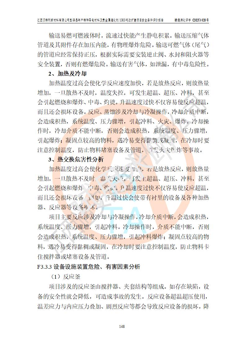 評價結論 | 江西貝特利新材料有限公司江西貝特利彭澤縣年產特種導電材料及貴金屬催化劑 1303噸改擴建項目的選址、總體布局、周邊環(huán)境、自然環(huán)境能滿足建設安全條件:項目選擇的工藝過程及設備設施的安全可靠性能達到**法規(guī)、標準規(guī)定要求。 項目存在的危險有害因素可控,在落實本評價報告提出的有關安全對策措施后,其危險有害程度能達到可以接受的程度,項目建設能夠實現(xiàn)安全運行的目標。 | |||||