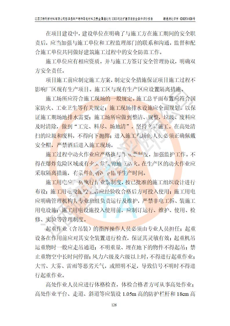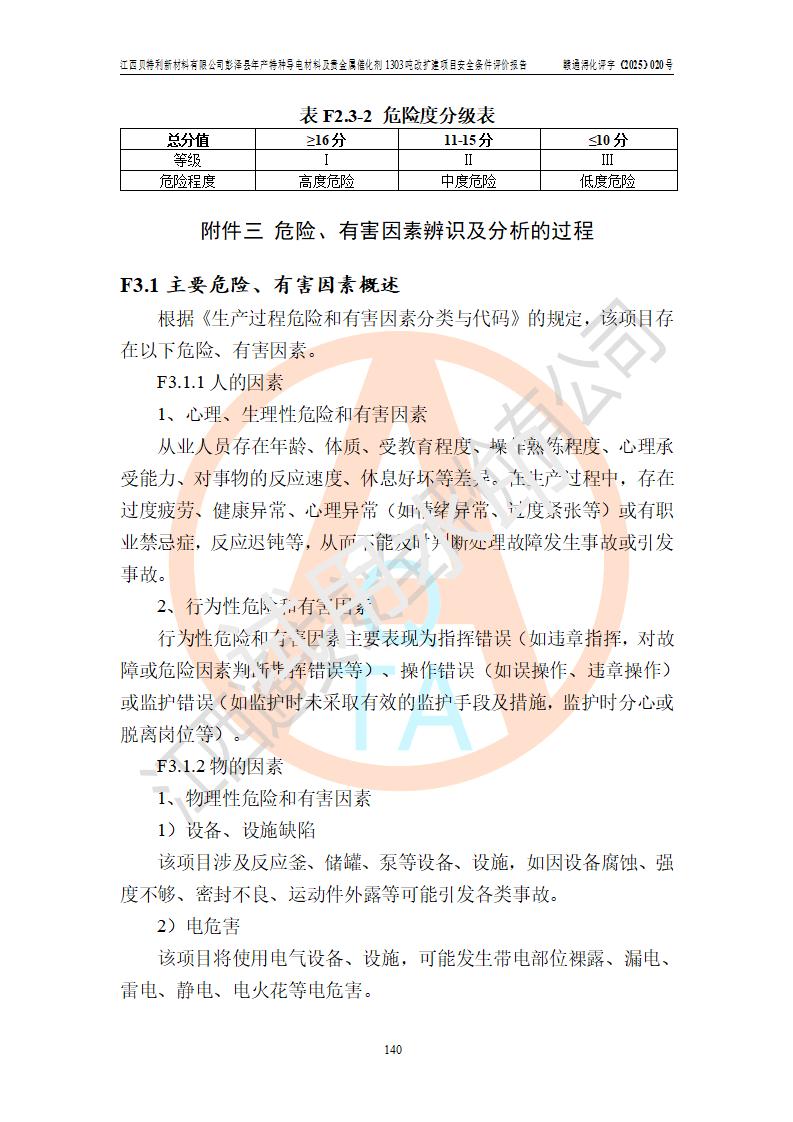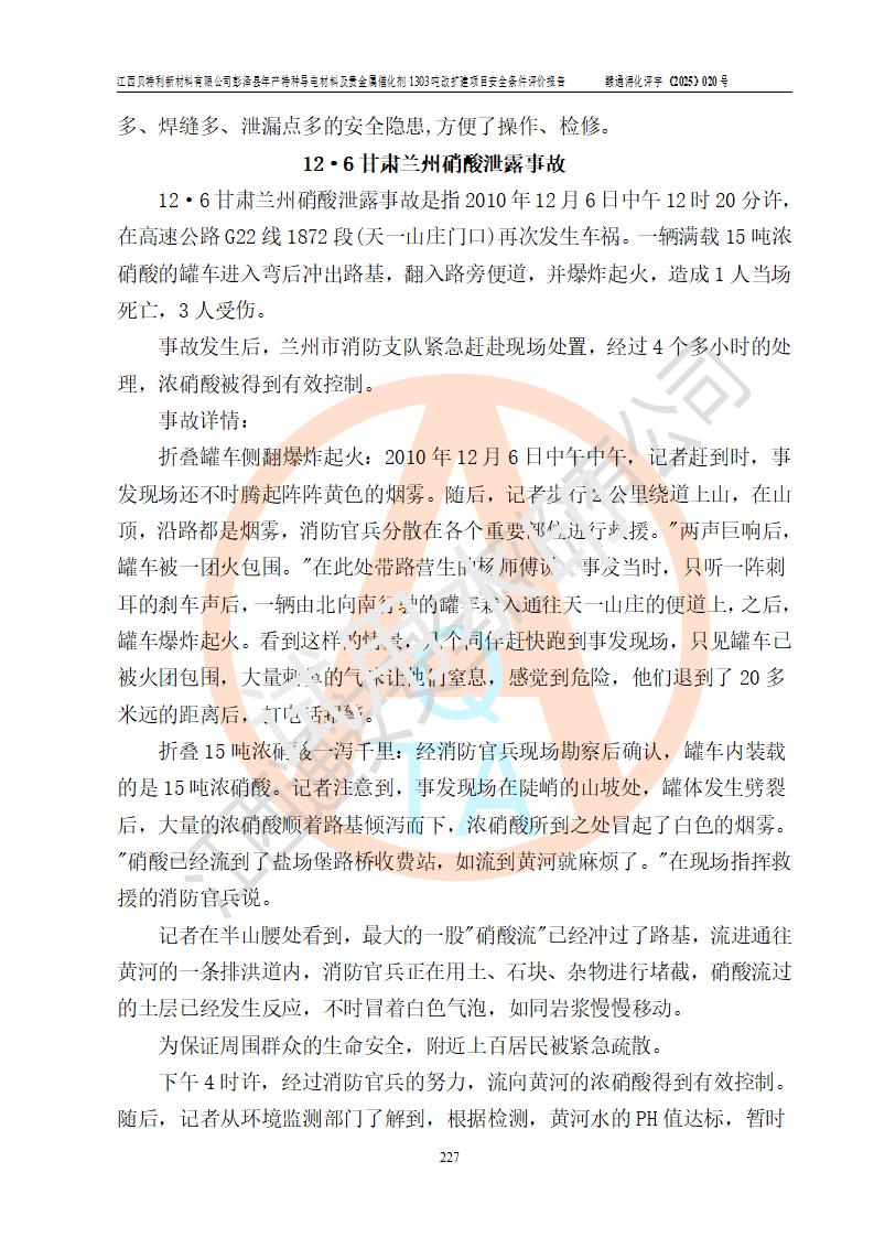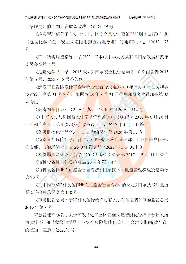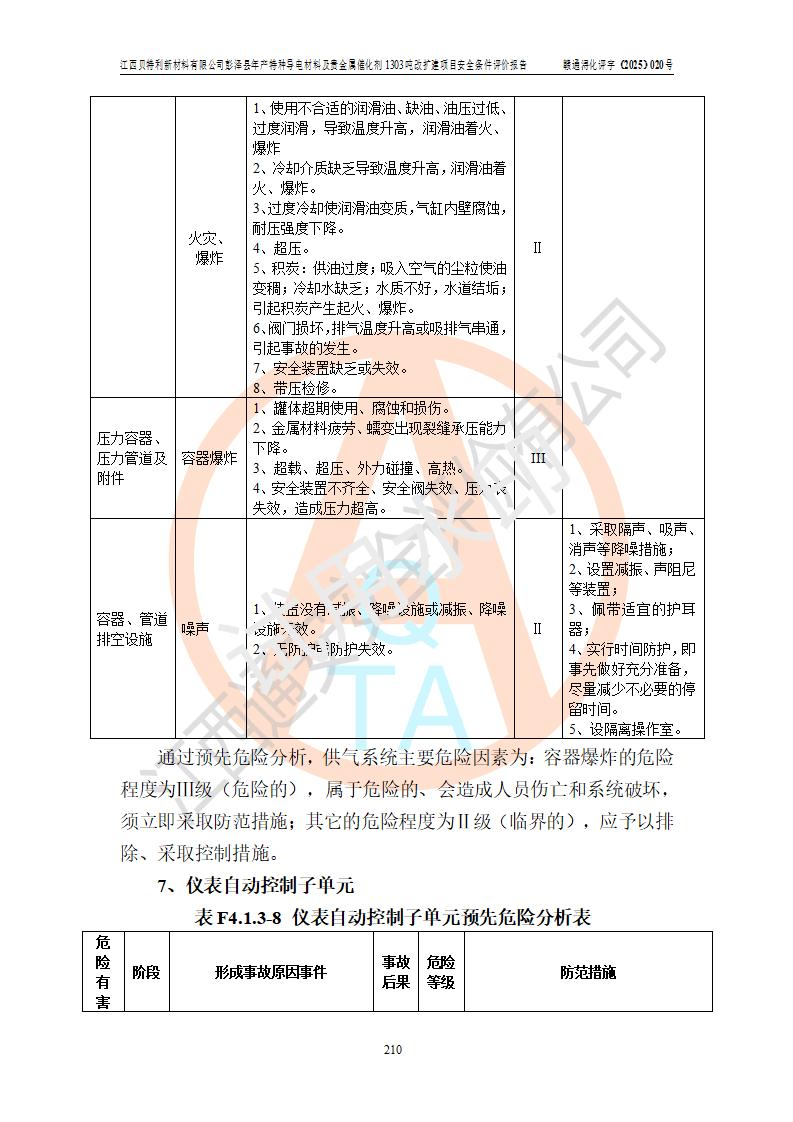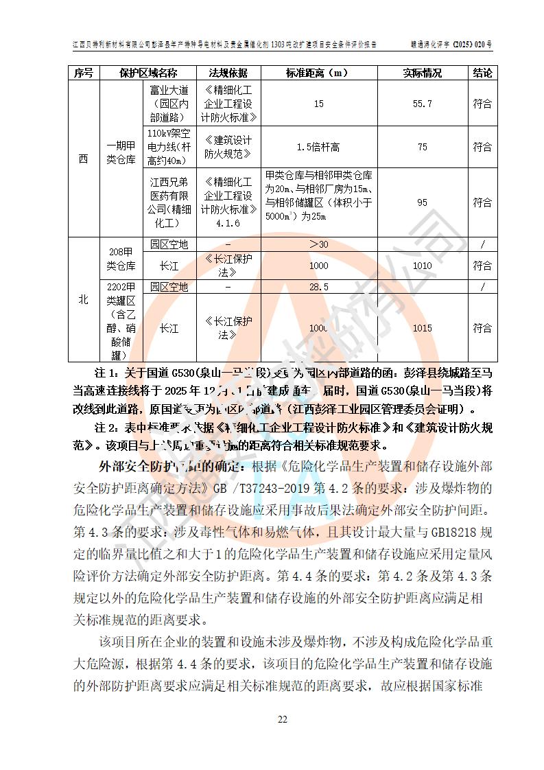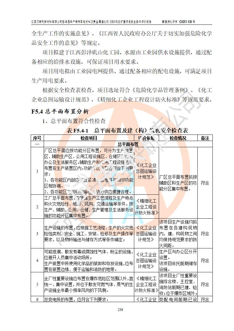 評價結論 | 江西貝特利新材料有限公司江西貝特利彭澤縣年產特種導電材料及貴金屬催化劑 1303噸改擴建項目的選址、總體布局、周邊環(huán)境、自然環(huán)境能滿足建設安全條件:項目選擇的工藝過程及設備設施的安全可靠性能達到**法規(guī)、標準規(guī)定要求。 項目存在的危險有害因素可控,在落實本評價報告提出的有關安全對策措施后,其危險有害程度能達到可以接受的程度,項目建設能夠實現(xiàn)安全運行的目標。 | |||||