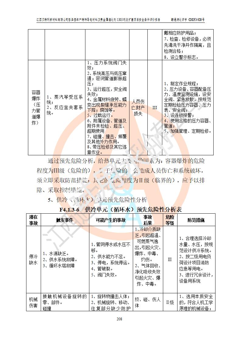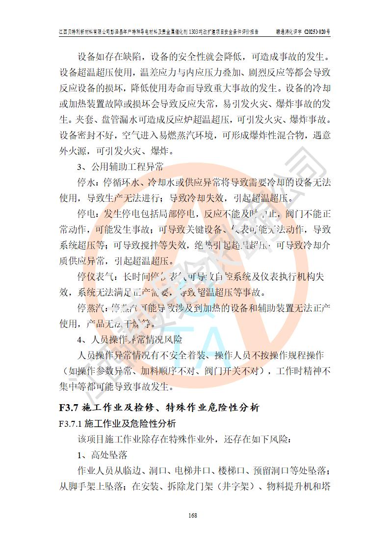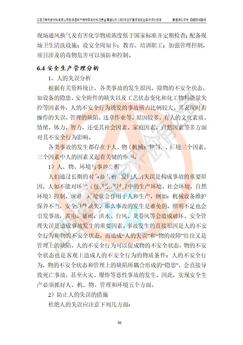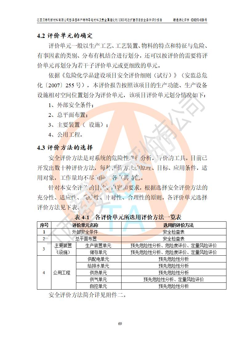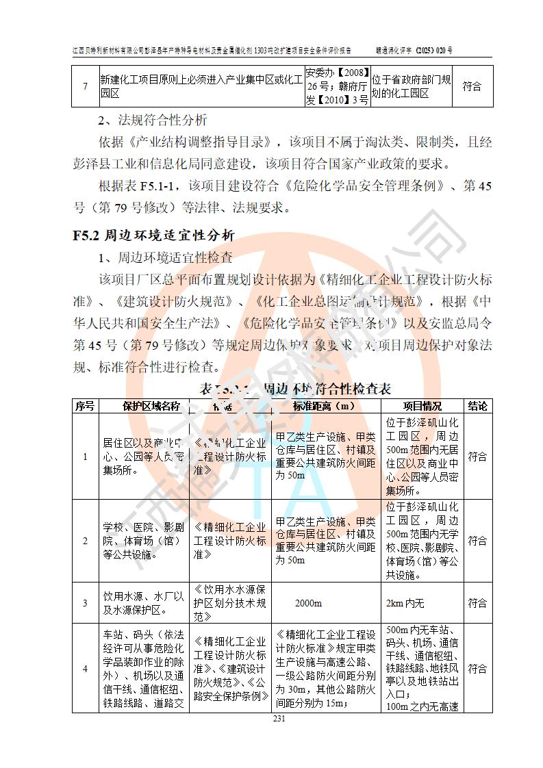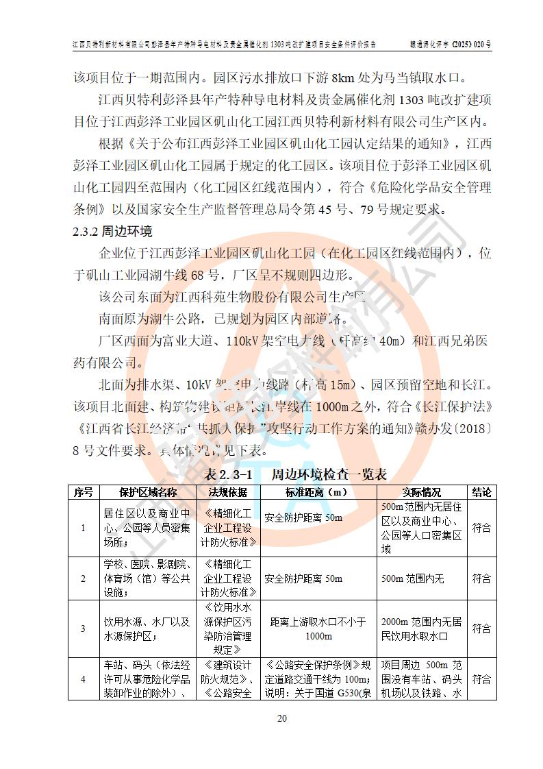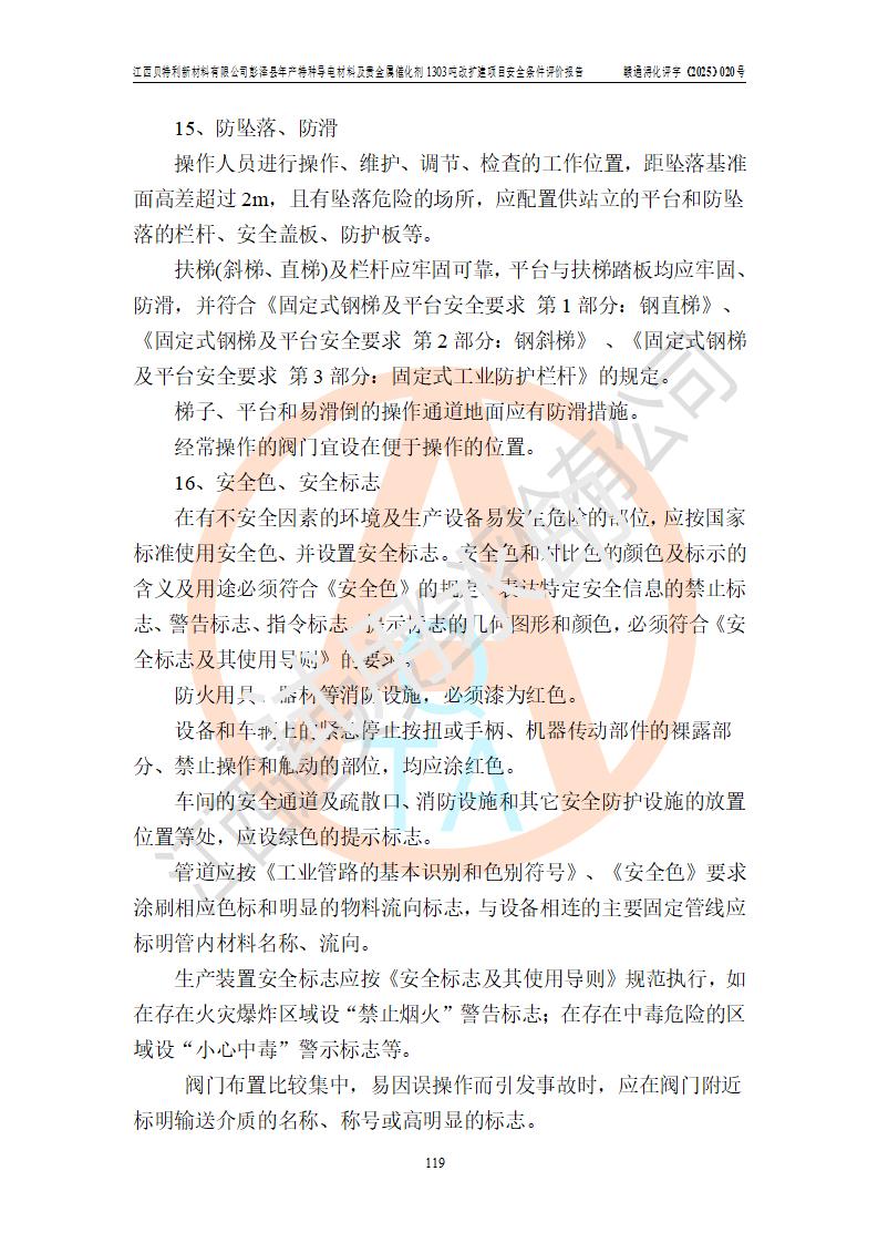 評價結論 | 江西貝特利新材料有限公司江西貝特利彭澤縣年產特種導電材料及貴金屬催化劑 1303噸改擴建項目的選址、總體布局、周邊環(huán)境、自然環(huán)境能滿足建設安全條件:項目選擇的工藝過程及設備設施的安全可靠性能達到**法規(guī)、標準規(guī)定要求。 項目存在的危險有害因素可控,在落實本評價報告提出的有關安全對策措施后,其危險有害程度能達到可以接受的程度,項目建設能夠實現(xiàn)安全運行的目標。 | |||||
