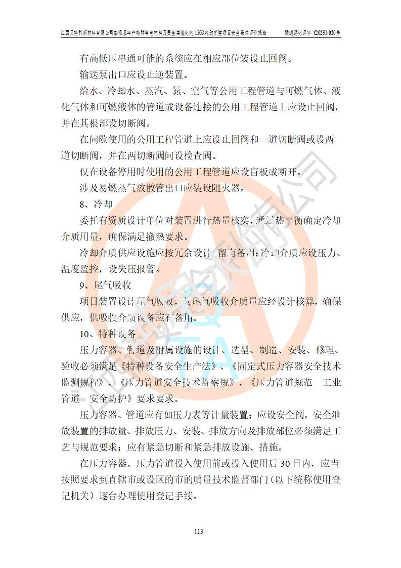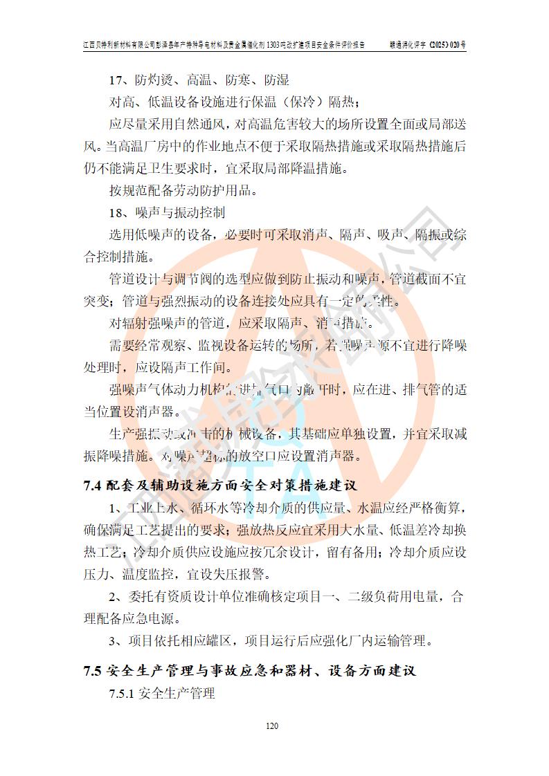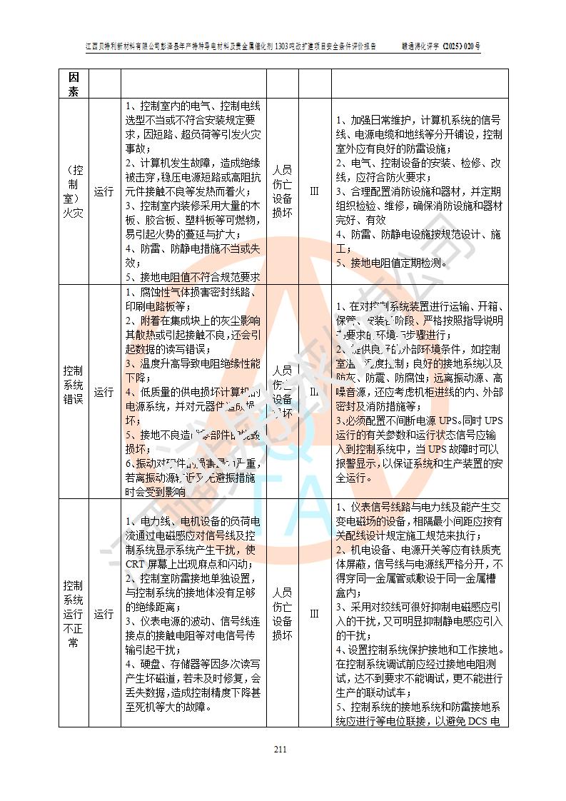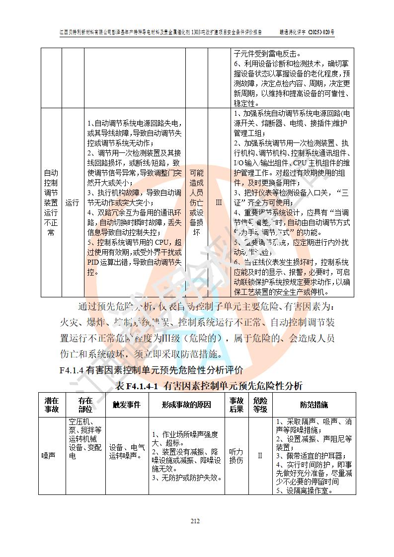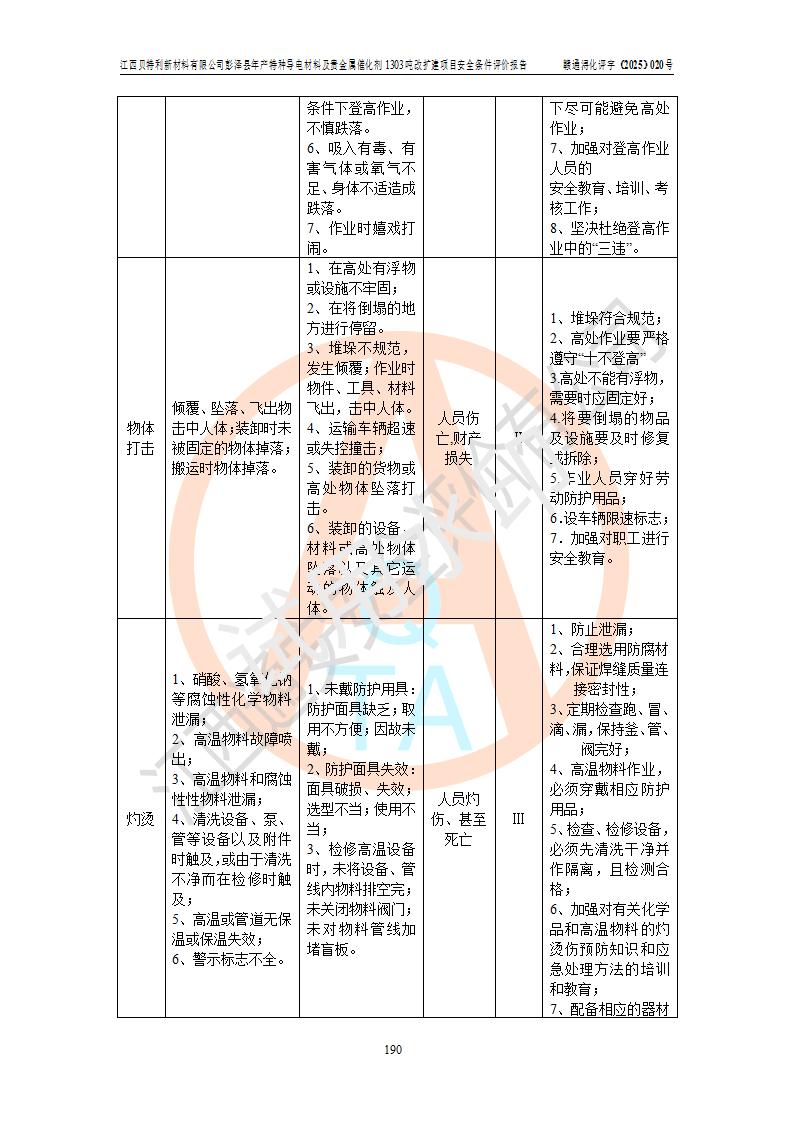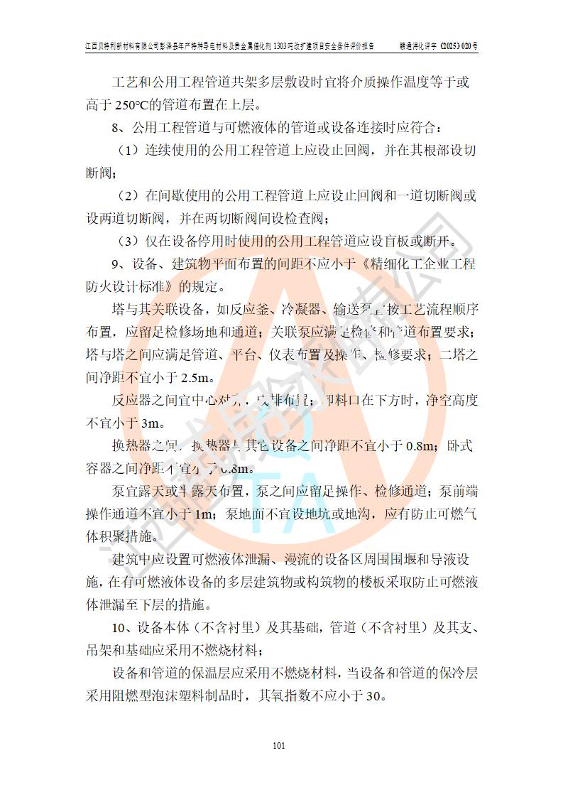 評價結論 | 江西貝特利新材料有限公司江西貝特利彭澤縣年產特種導電材料及貴金屬催化劑 1303噸改擴建項目的選址、總體布局、周邊環(huán)境、自然環(huán)境能滿足建設安全條件:項目選擇的工藝過程及設備設施的安全可靠性能達到**法規(guī)、標準規(guī)定要求。 項目存在的危險有害因素可控,在落實本評價報告提出的有關安全對策措施后,其危險有害程度能達到可以接受的程度,項目建設能夠實現(xiàn)安全運行的目標。 | |||||