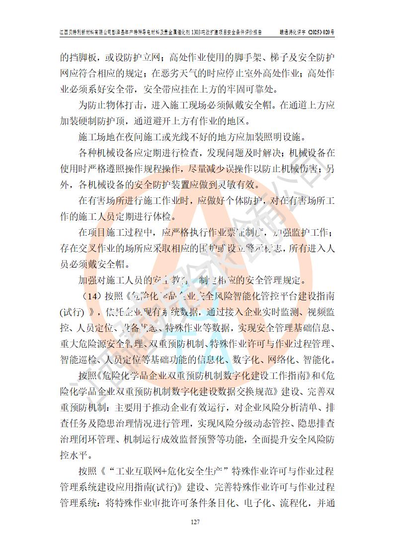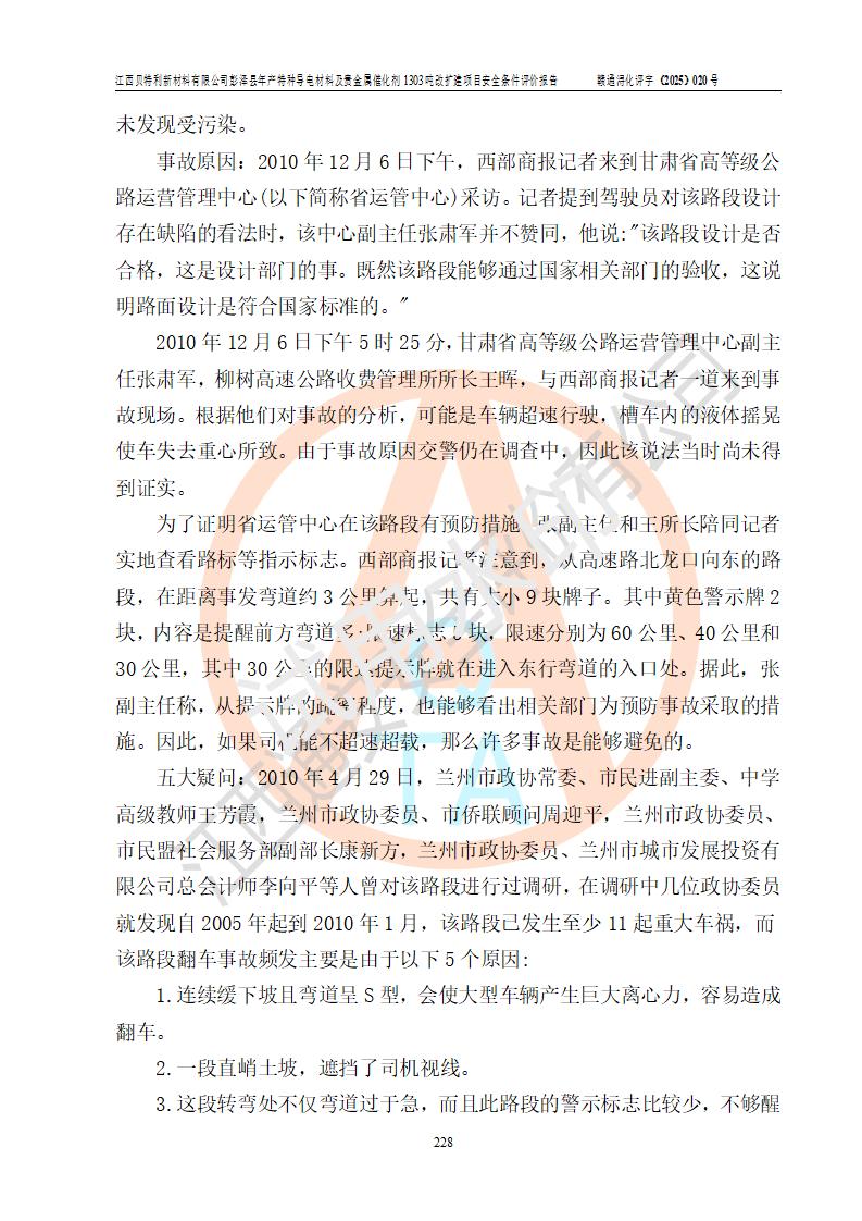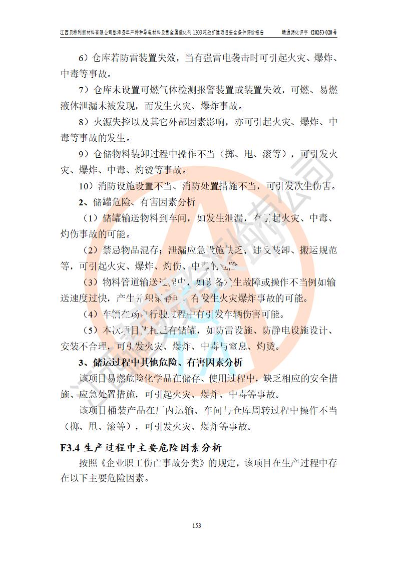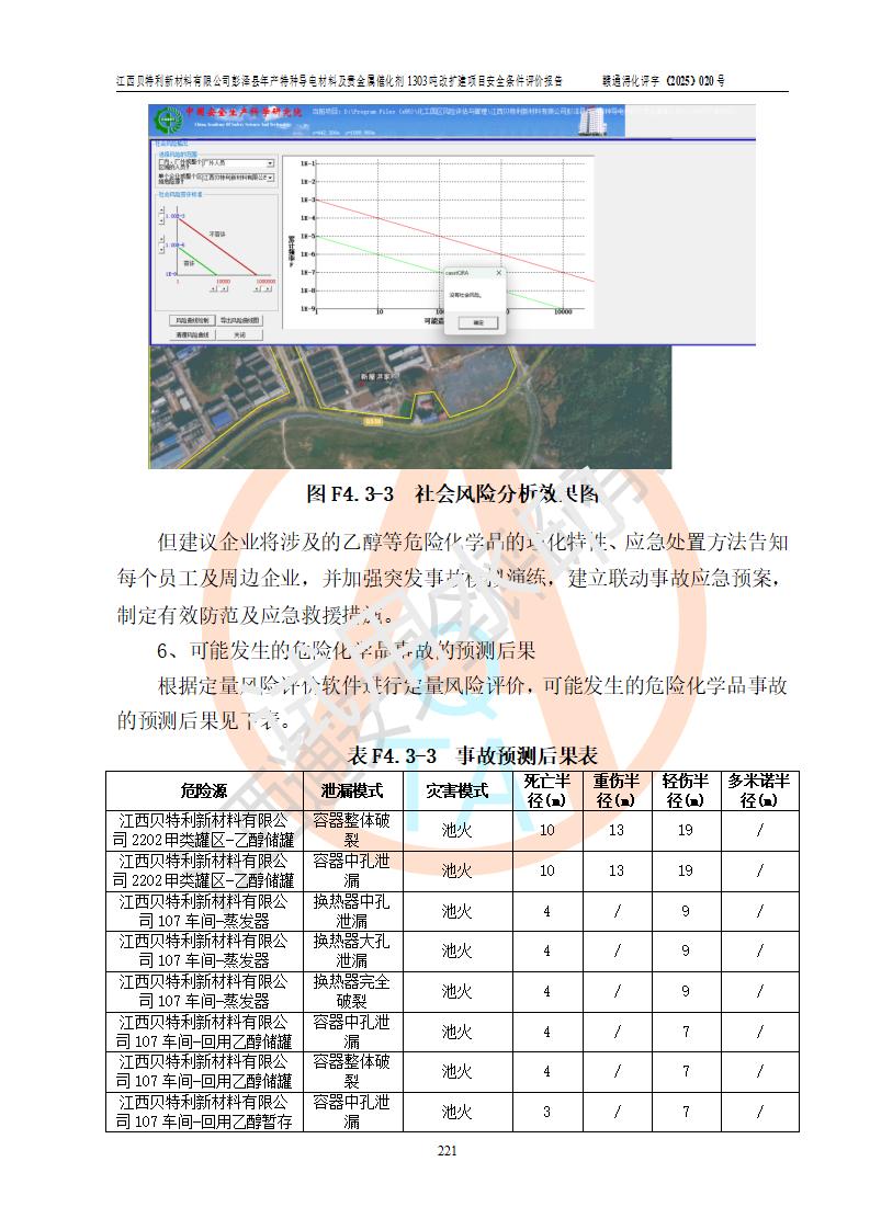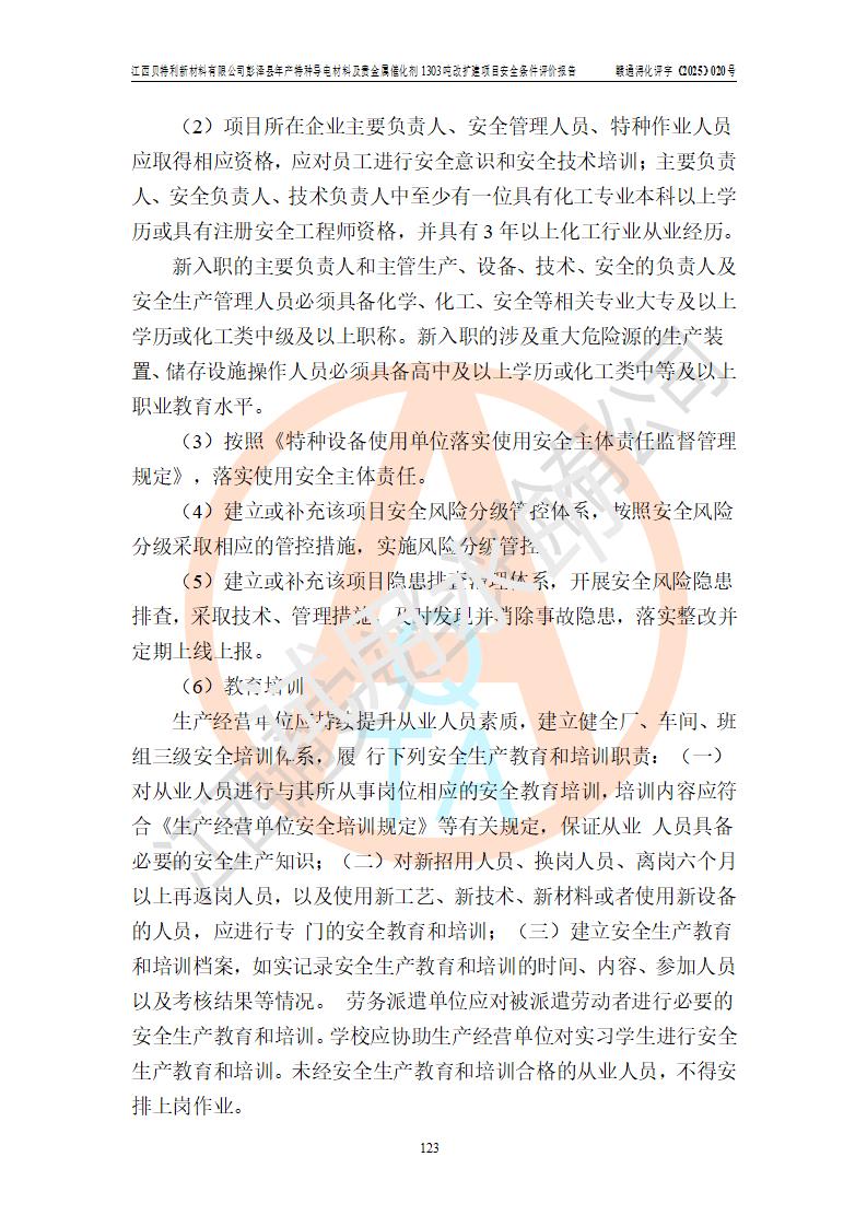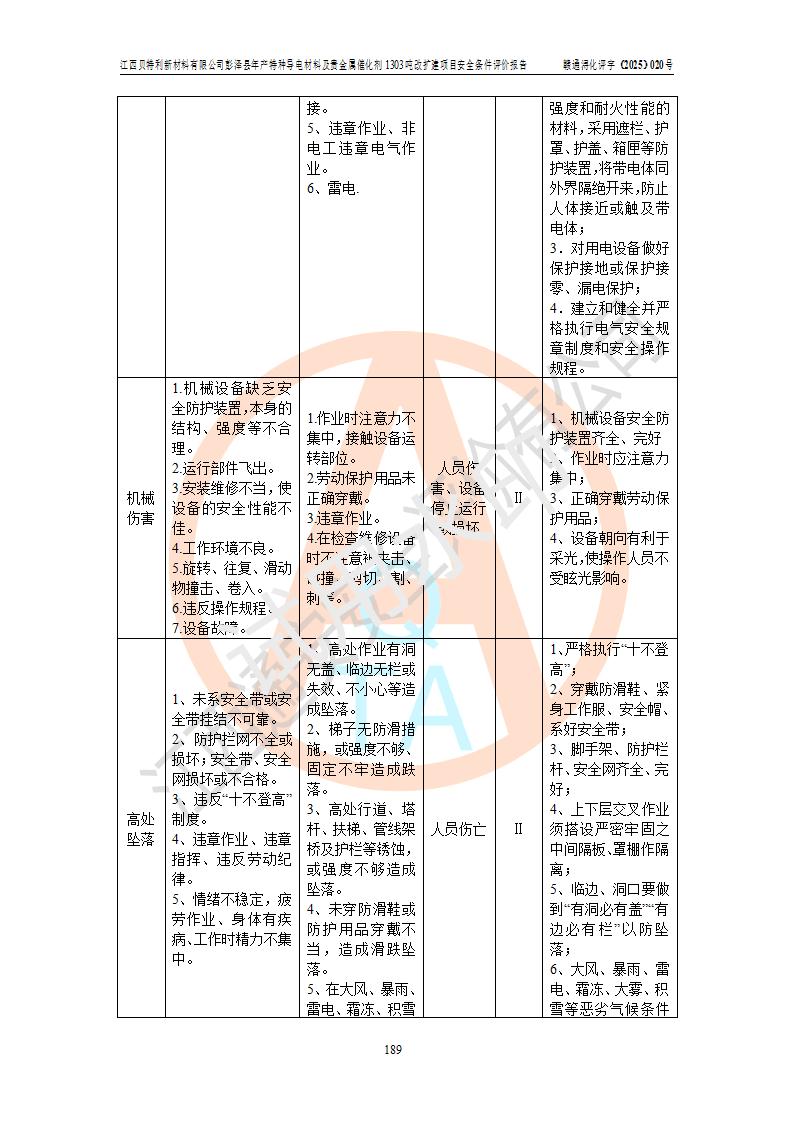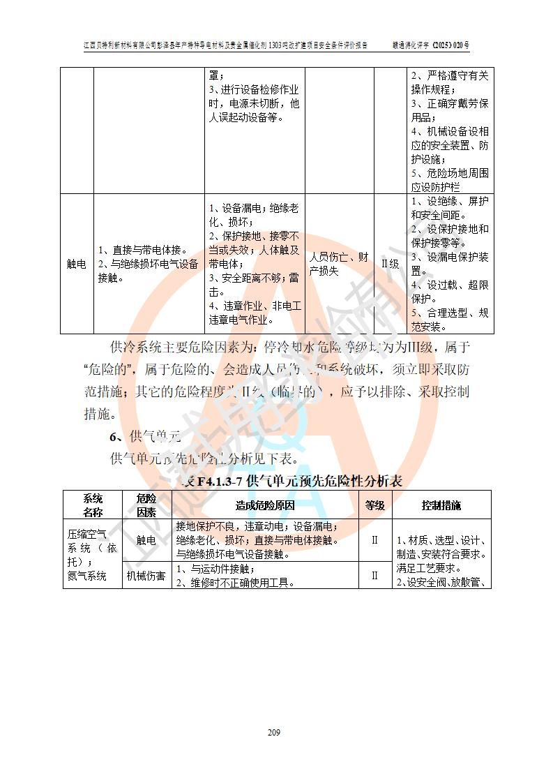 評價結論 | 江西貝特利新材料有限公司江西貝特利彭澤縣年產特種導電材料及貴金屬催化劑 1303噸改擴建項目的選址、總體布局、周邊環(huán)境、自然環(huán)境能滿足建設安全條件:項目選擇的工藝過程及設備設施的安全可靠性能達到**法規(guī)、標準規(guī)定要求。 項目存在的危險有害因素可控,在落實本評價報告提出的有關安全對策措施后,其危險有害程度能達到可以接受的程度,項目建設能夠實現(xiàn)安全運行的目標。 | |||||