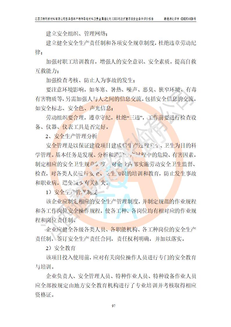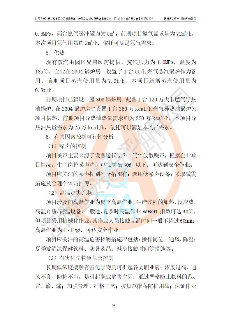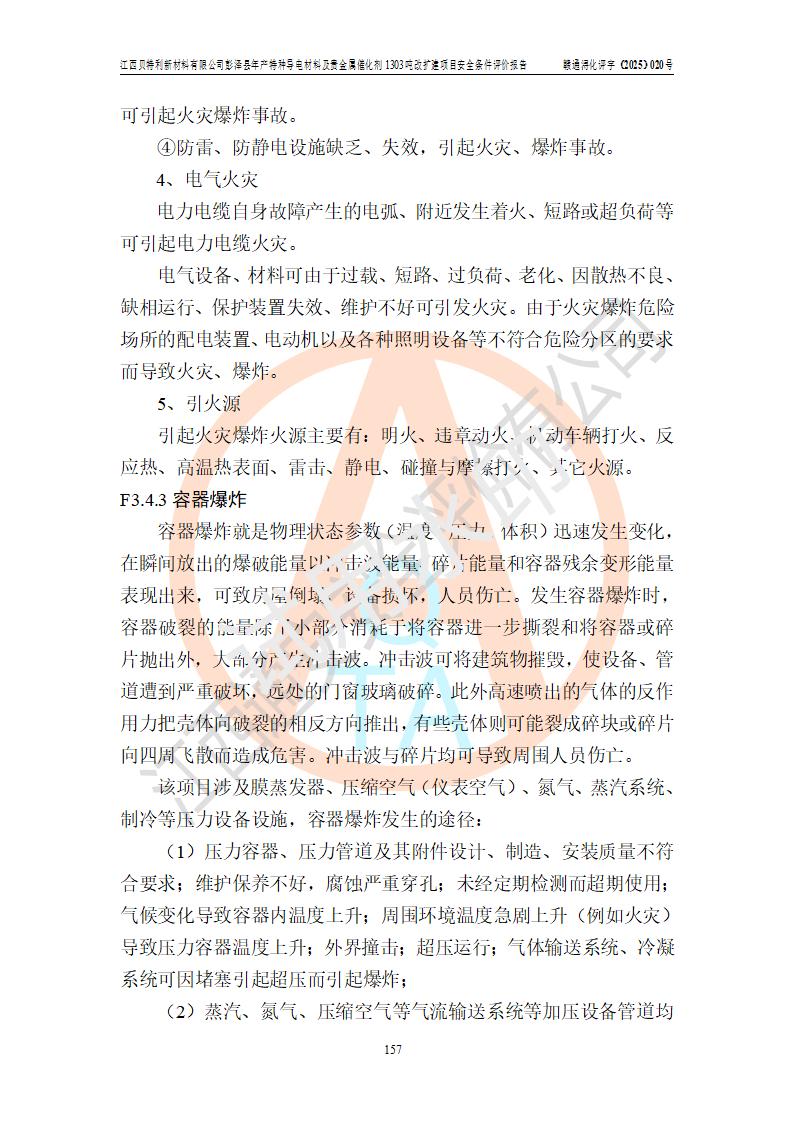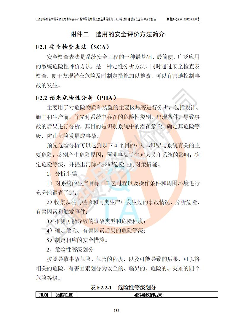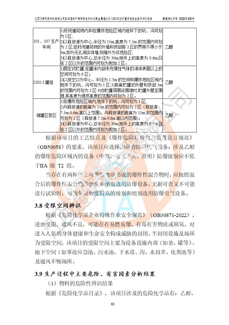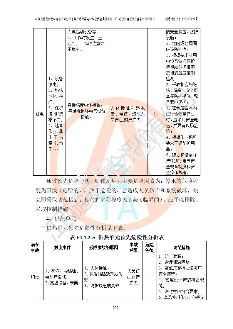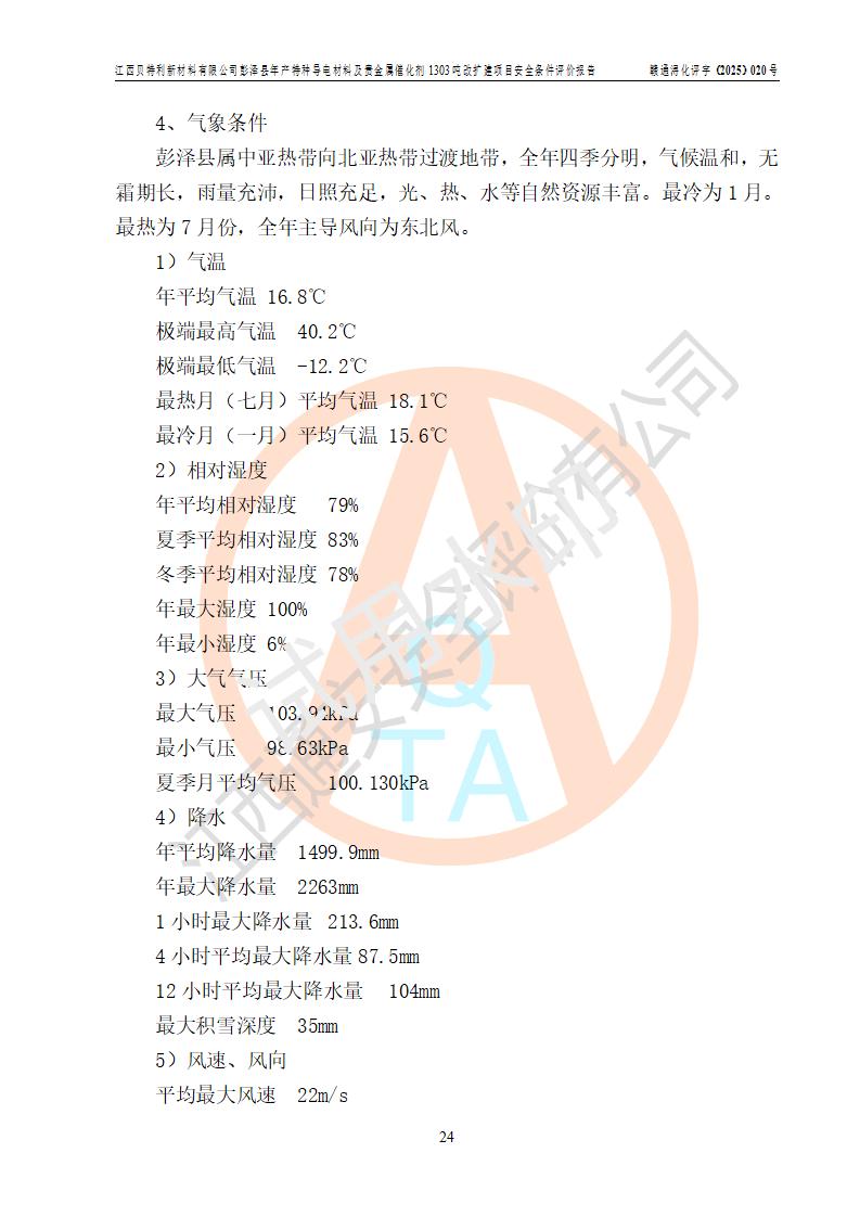 評價結論 | 江西貝特利新材料有限公司江西貝特利彭澤縣年產特種導電材料及貴金屬催化劑 1303噸改擴建項目的選址、總體布局、周邊環(huán)境、自然環(huán)境能滿足建設安全條件:項目選擇的工藝過程及設備設施的安全可靠性能達到**法規(guī)、標準規(guī)定要求。 項目存在的危險有害因素可控,在落實本評價報告提出的有關安全對策措施后,其危險有害程度能達到可以接受的程度,項目建設能夠實現(xiàn)安全運行的目標。 | |||||