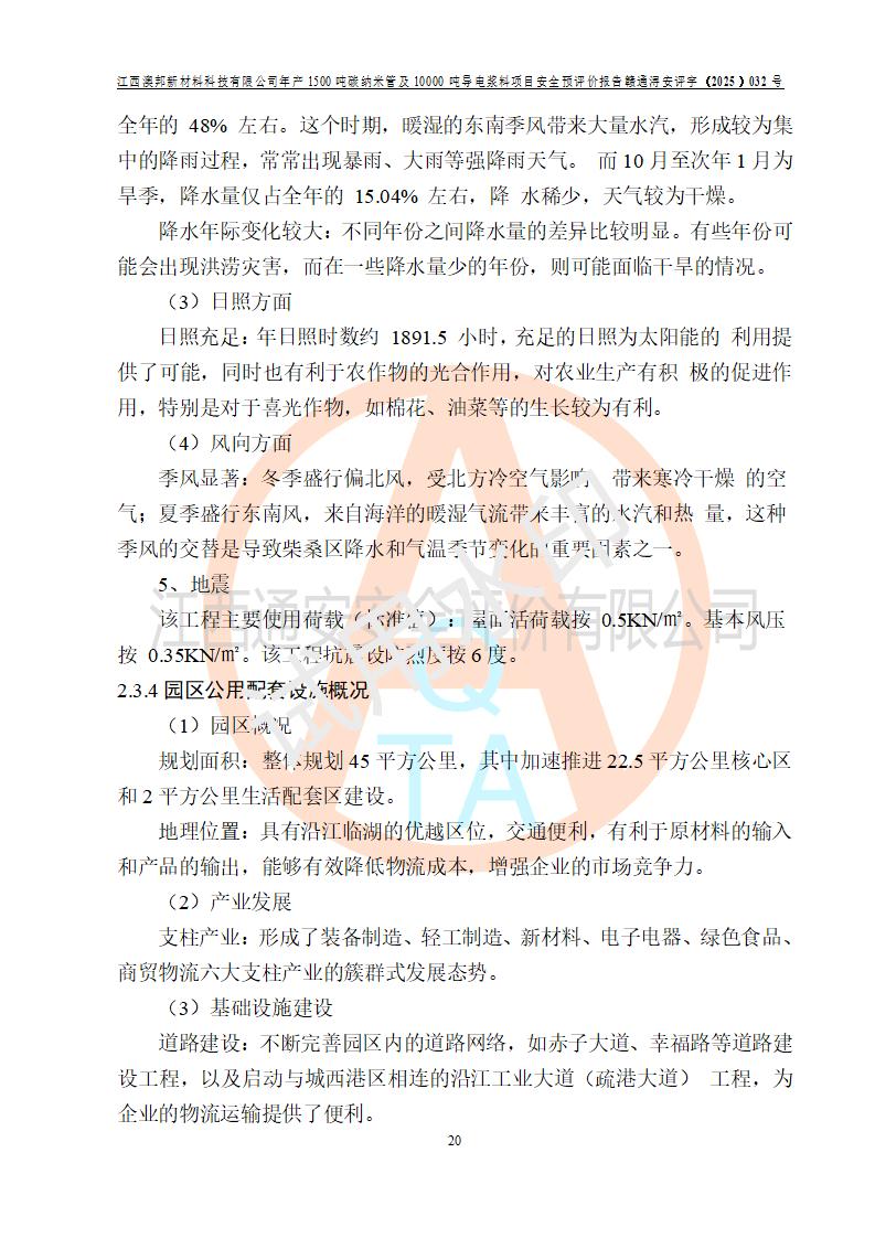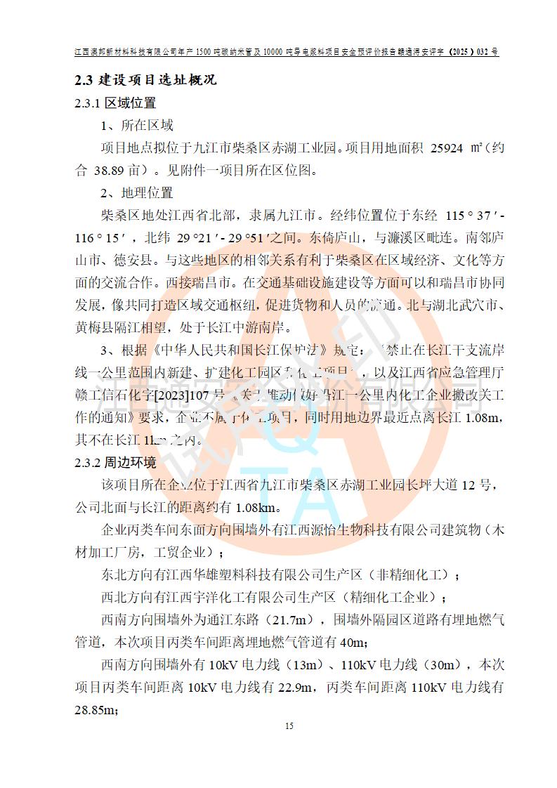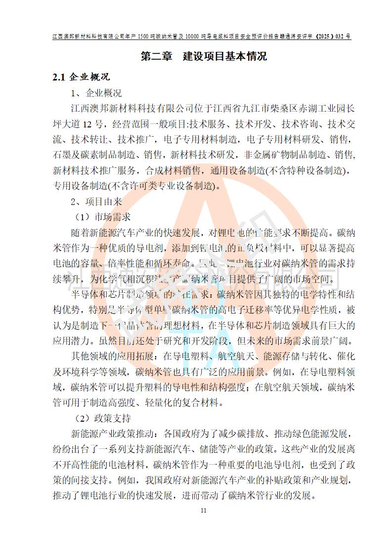 項目簡介 | 項目名稱:年產(chǎn)1500噸碳納米管及10000噸導電漿料項目 建設單位:江西澳邦新材料科技有限公司 建設地點:江西省九江市柴桑區(qū)赤湖工業(yè)園長坪大道12號 建設性質:新建 企業(yè)性質: 有限責任公司 占地面積:項目以租賃模式租賃九江鐵豐木業(yè)有限公司現(xiàn)有用地面積約25924m2(約合38.89畝),用地性質為工業(yè)用地。 項目總投資:15000萬元 | |||||