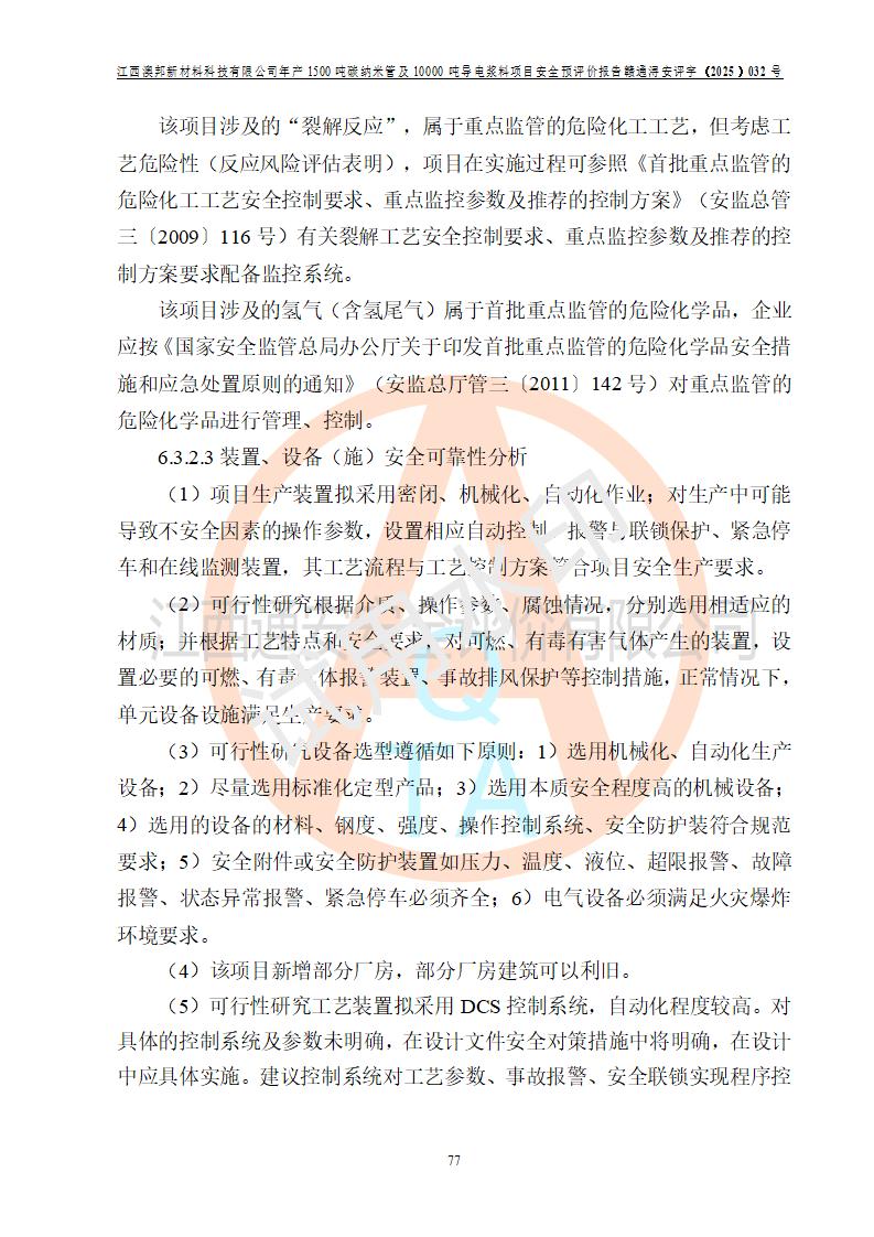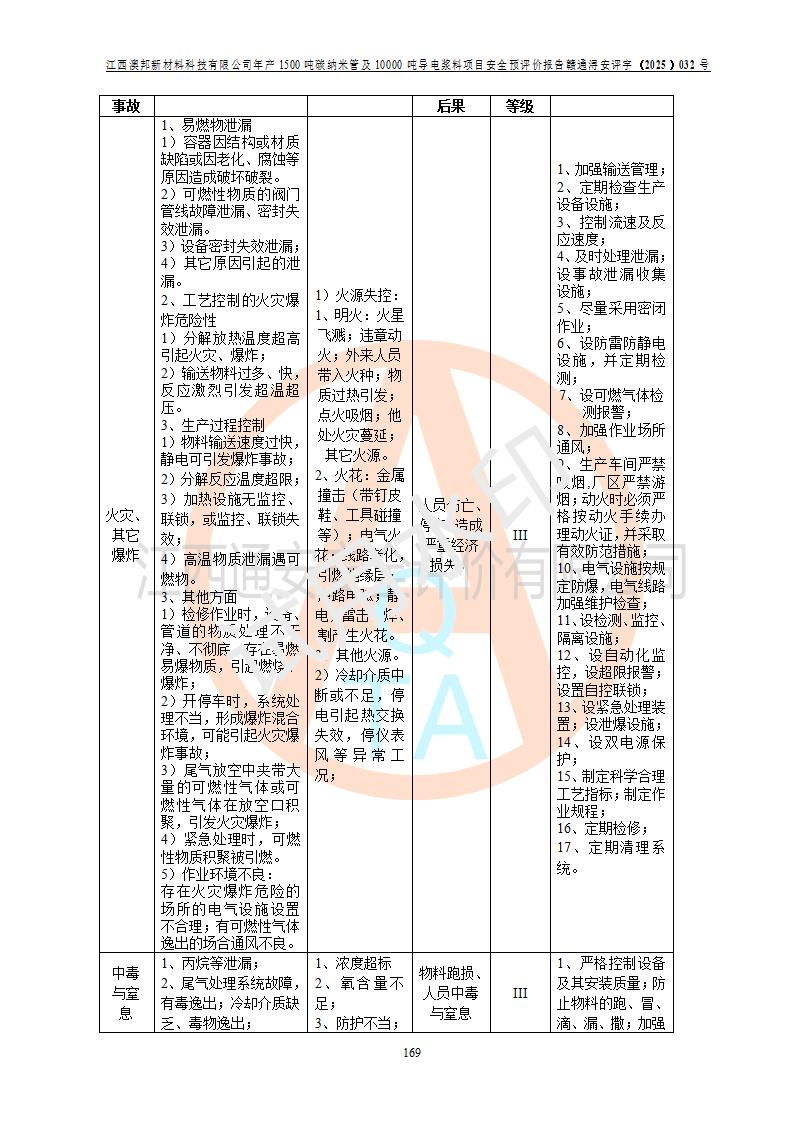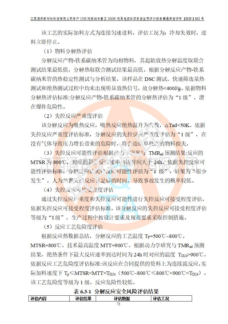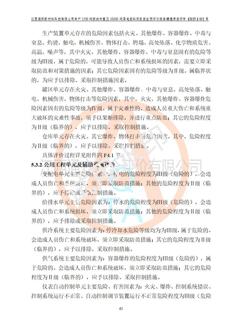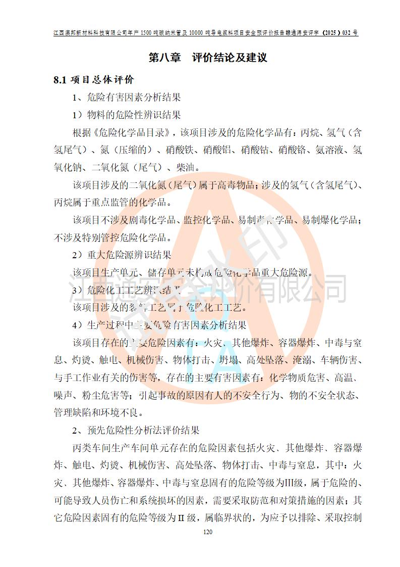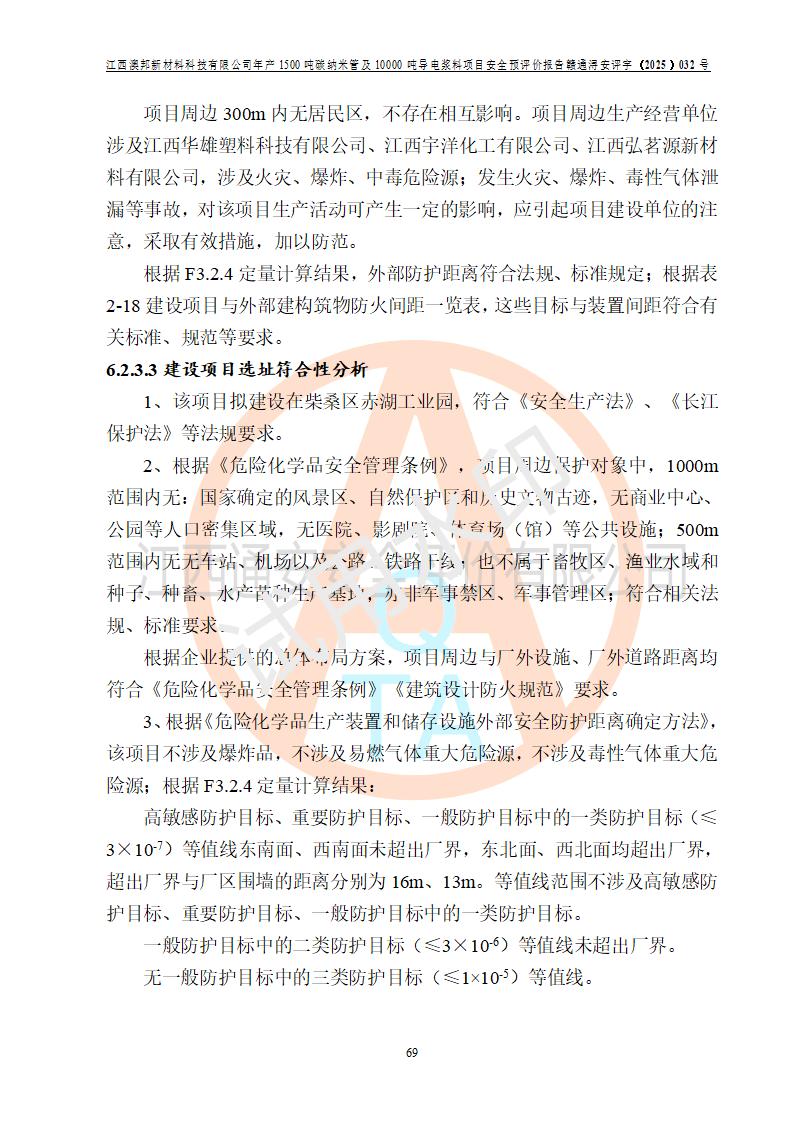 評價結論 | 江西澳邦新材料科技有限公司年產(chǎn) 1500 噸碳納米管及10000噸導電漿料項目的選址、總體布局、周邊環(huán)境、自然環(huán)境能滿足建設安全條件;項目選擇的工藝過程及設備設施的安全可靠性能達到**法規(guī)、標準規(guī)定要求。 項目存在的危險有害因素可控,在落實本評價報告提出的有關安全對策措施后,其危險有害程度能達到可以接受的程度,項目建設能夠實現(xiàn)安全運行的目標。 | |||||