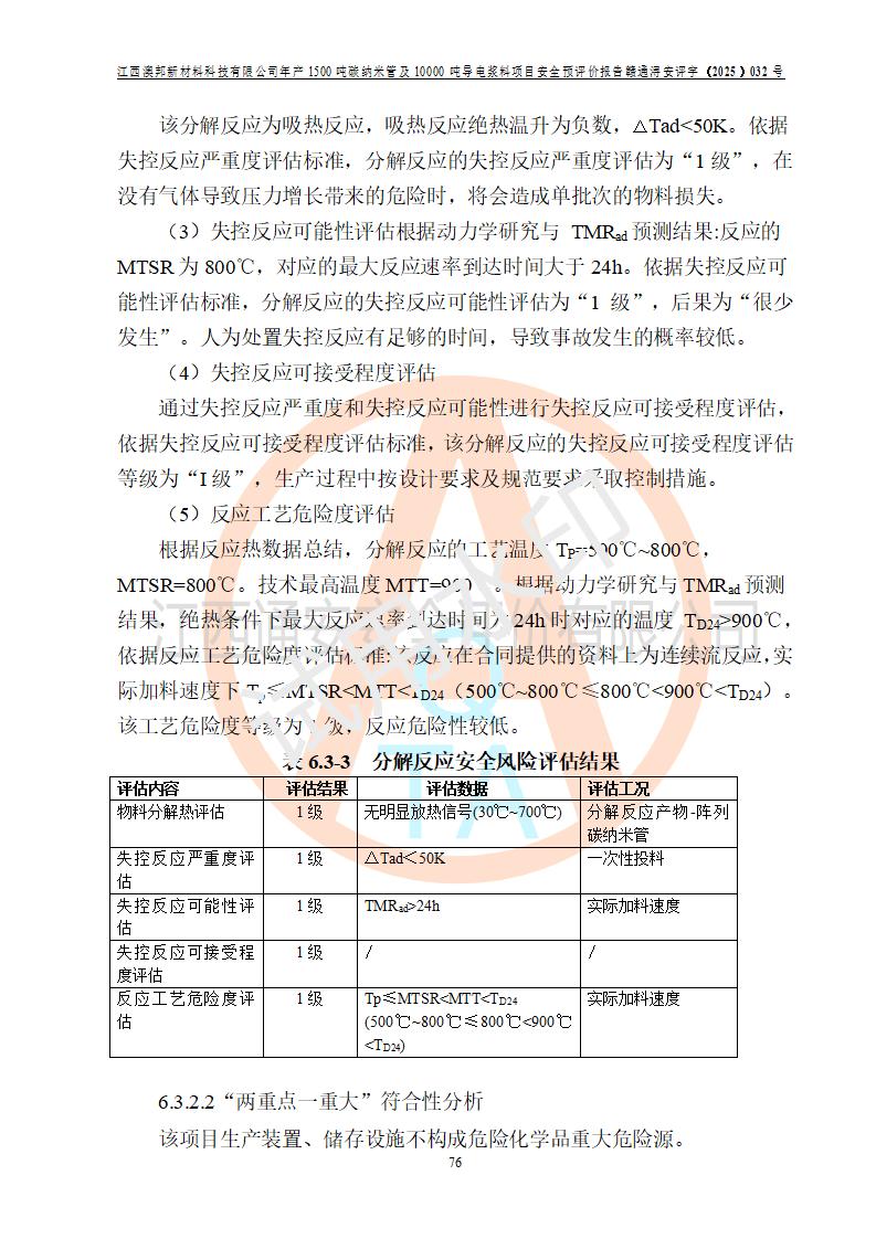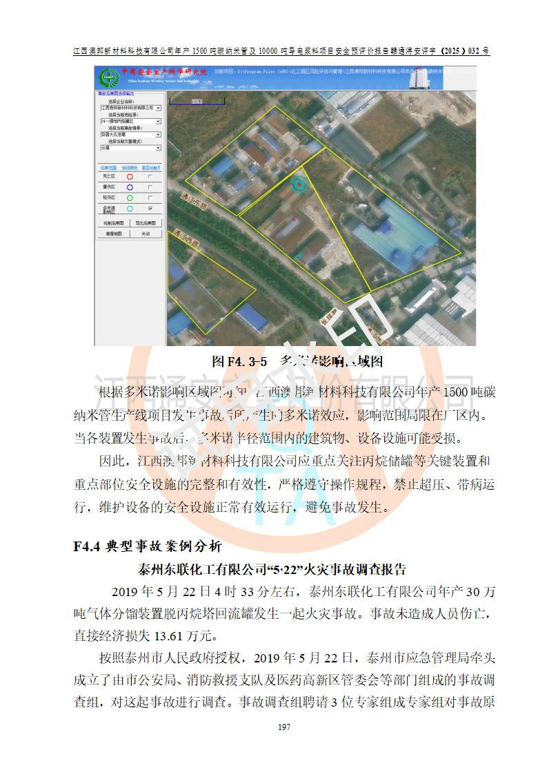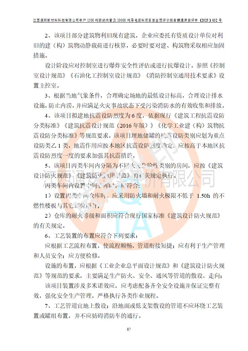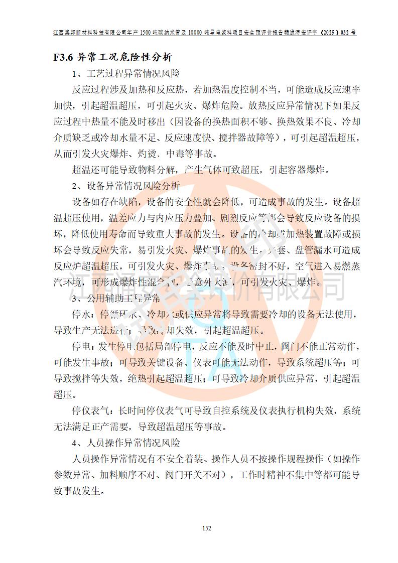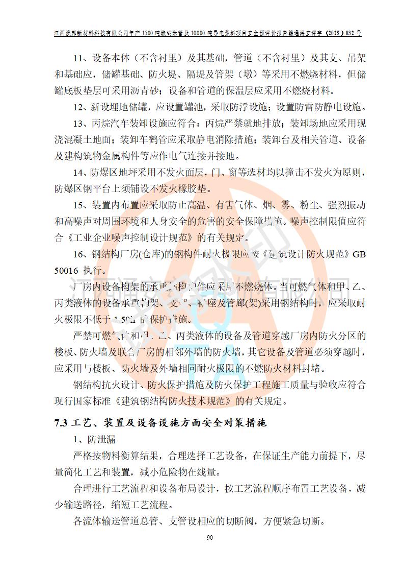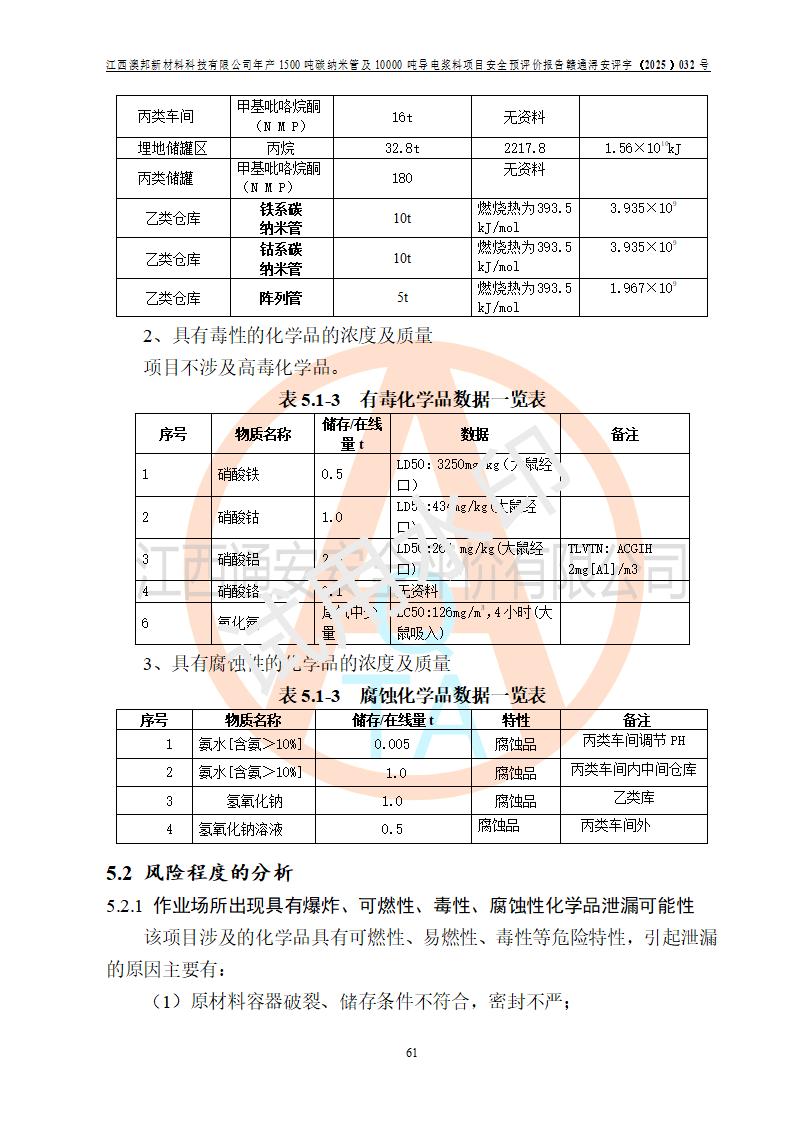 評價結論 | 江西澳邦新材料科技有限公司年產(chǎn) 1500 噸碳納米管及10000噸導電漿料項目的選址、總體布局、周邊環(huán)境、自然環(huán)境能滿足建設安全條件;項目選擇的工藝過程及設備設施的安全可靠性能達到**法規(guī)、標準規(guī)定要求。 項目存在的危險有害因素可控,在落實本評價報告提出的有關安全對策措施后,其危險有害程度能達到可以接受的程度,項目建設能夠實現(xiàn)安全運行的目標。 | |||||