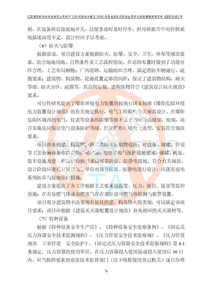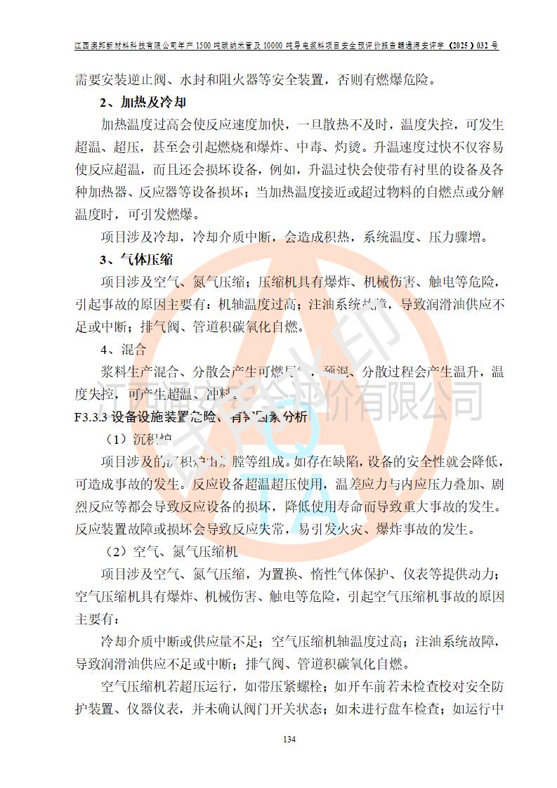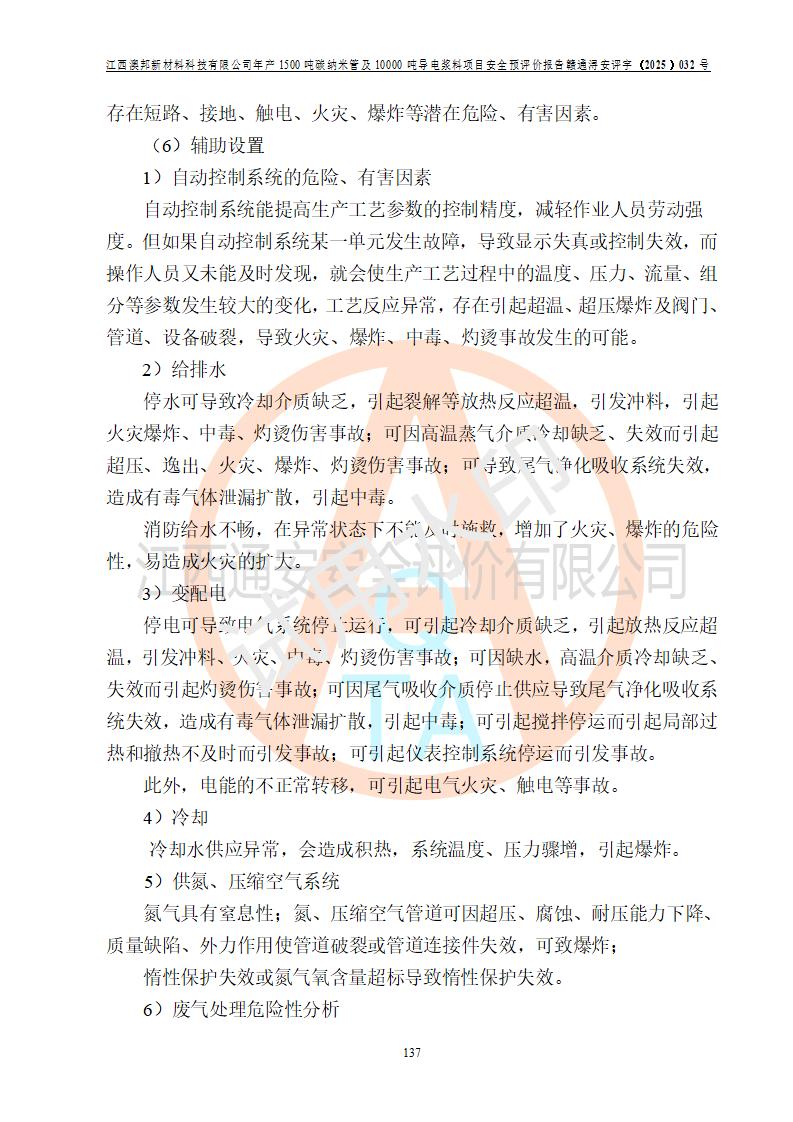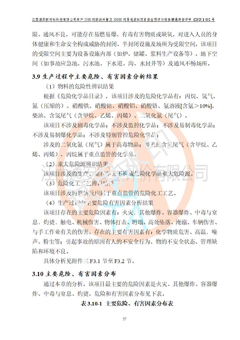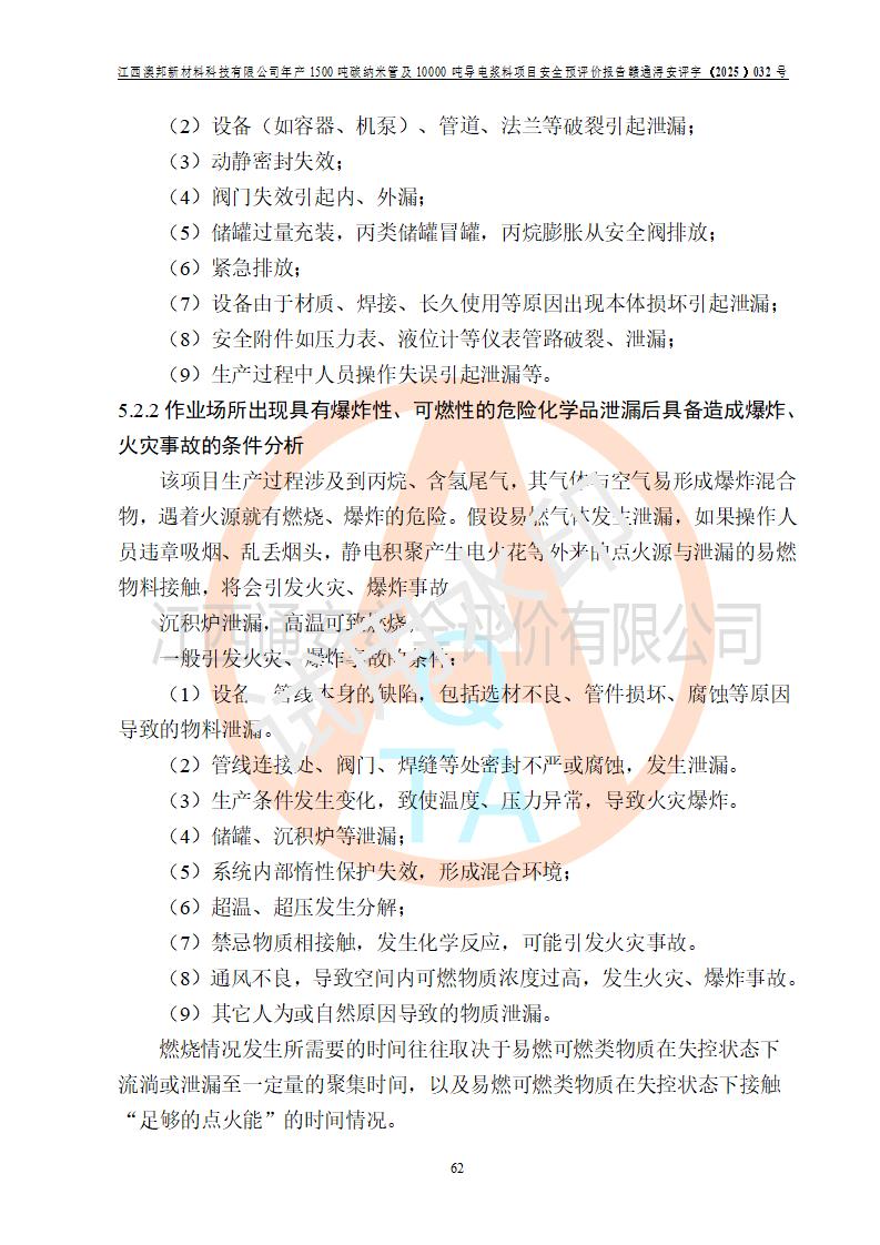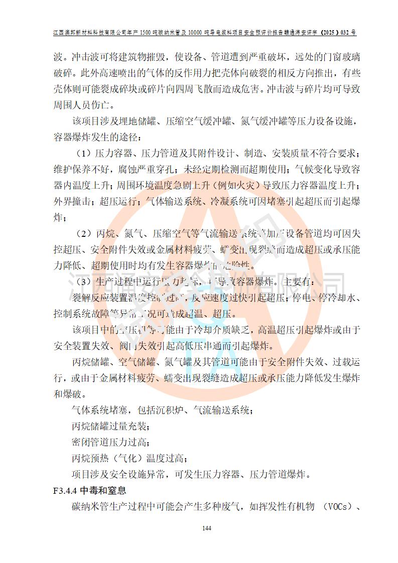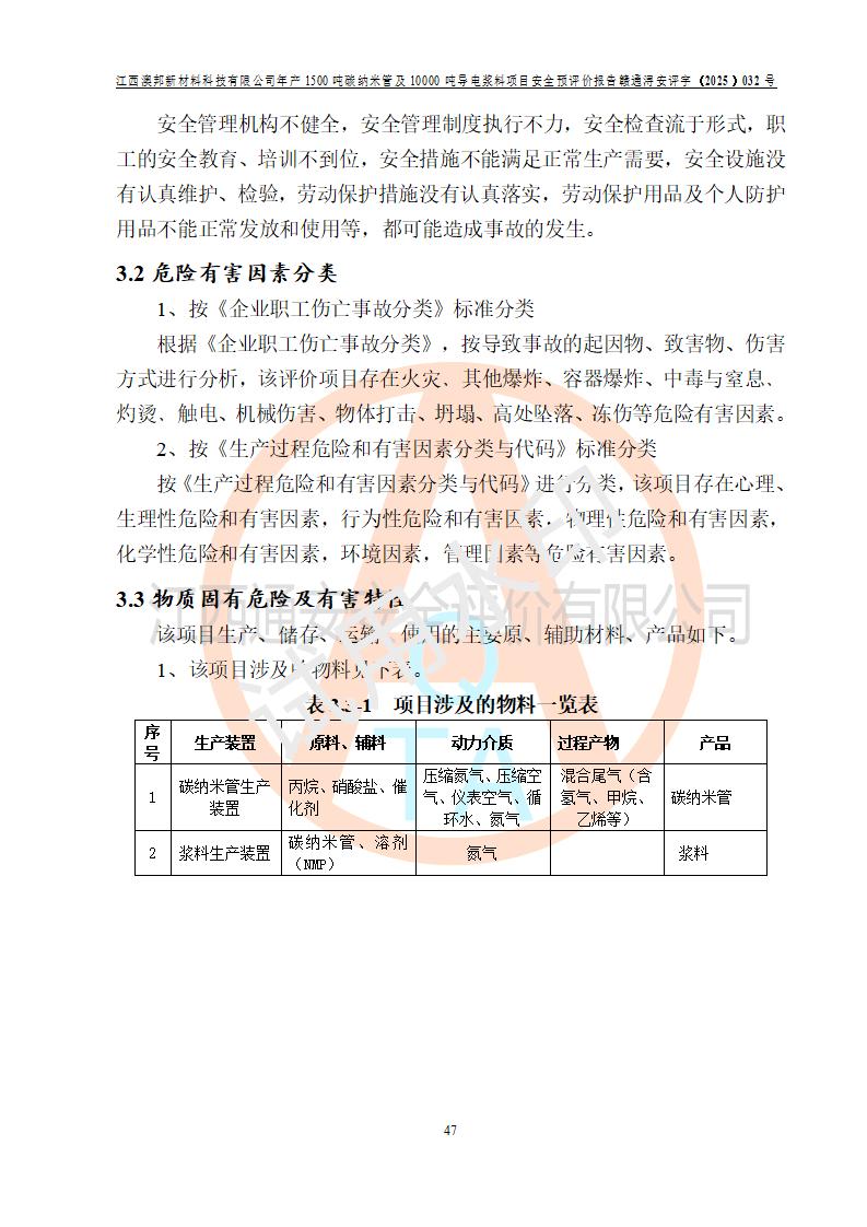 評價結論 | 江西澳邦新材料科技有限公司年產(chǎn) 1500 噸碳納米管及10000噸導電漿料項目的選址、總體布局、周邊環(huán)境、自然環(huán)境能滿足建設安全條件;項目選擇的工藝過程及設備設施的安全可靠性能達到**法規(guī)、標準規(guī)定要求。 項目存在的危險有害因素可控,在落實本評價報告提出的有關安全對策措施后,其危險有害程度能達到可以接受的程度,項目建設能夠實現(xiàn)安全運行的目標。 | |||||