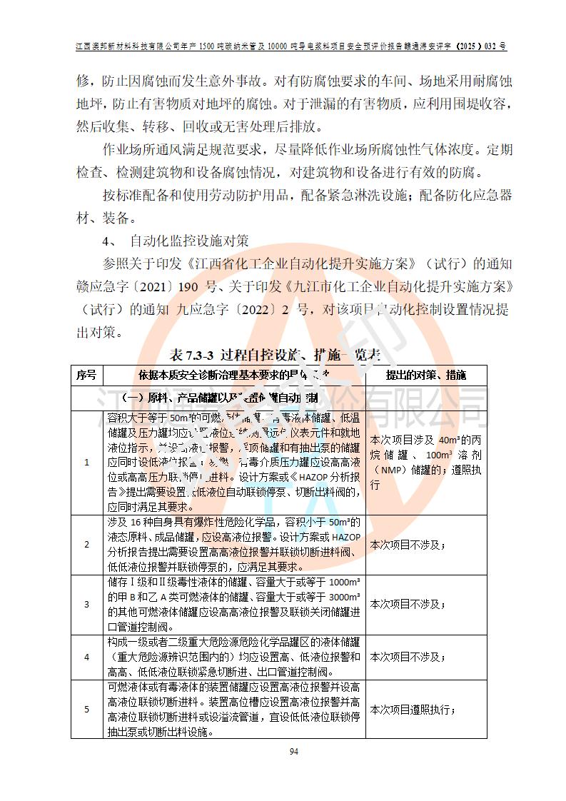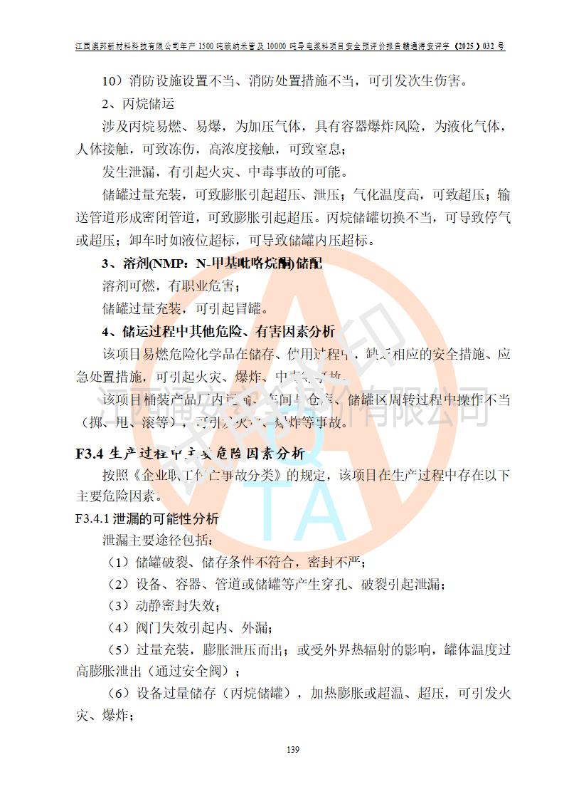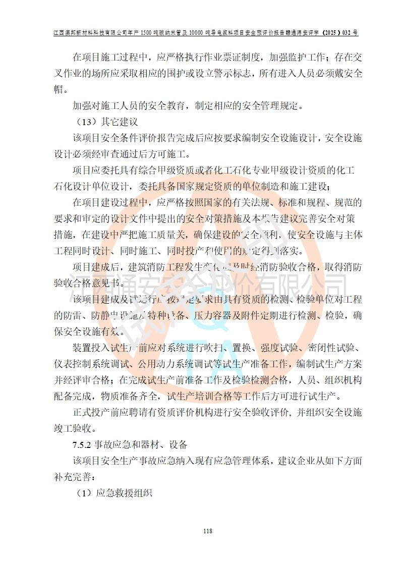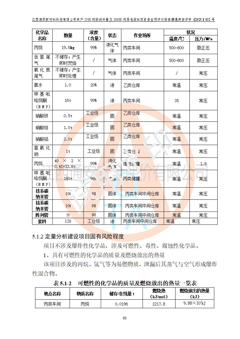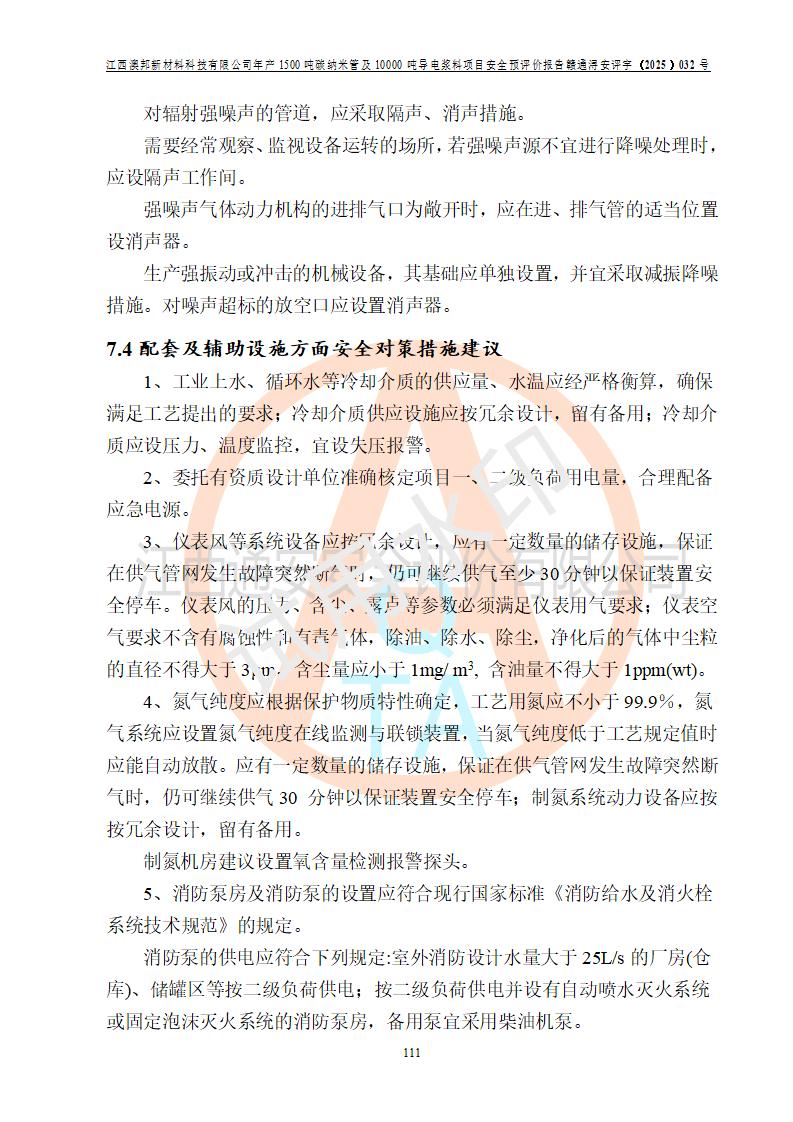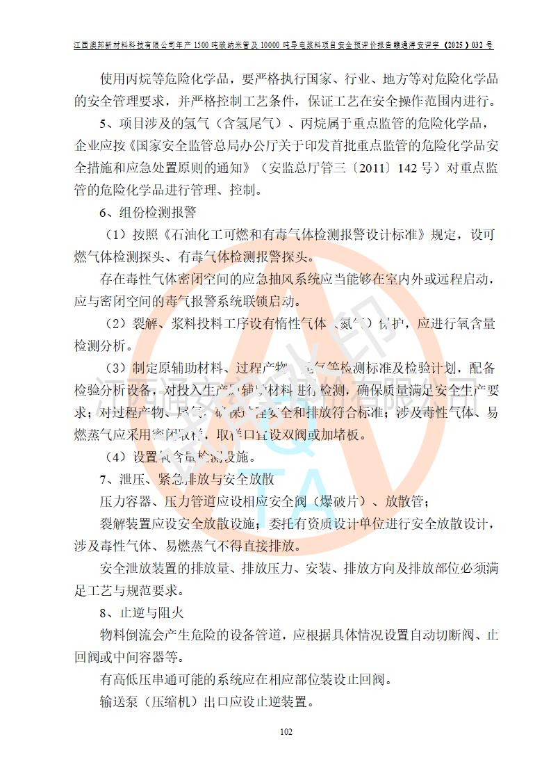 評價結論 | 江西澳邦新材料科技有限公司年產(chǎn) 1500 噸碳納米管及10000噸導電漿料項目的選址、總體布局、周邊環(huán)境、自然環(huán)境能滿足建設安全條件;項目選擇的工藝過程及設備設施的安全可靠性能達到**法規(guī)、標準規(guī)定要求。 項目存在的危險有害因素可控,在落實本評價報告提出的有關安全對策措施后,其危險有害程度能達到可以接受的程度,項目建設能夠實現(xiàn)安全運行的目標。 | |||||