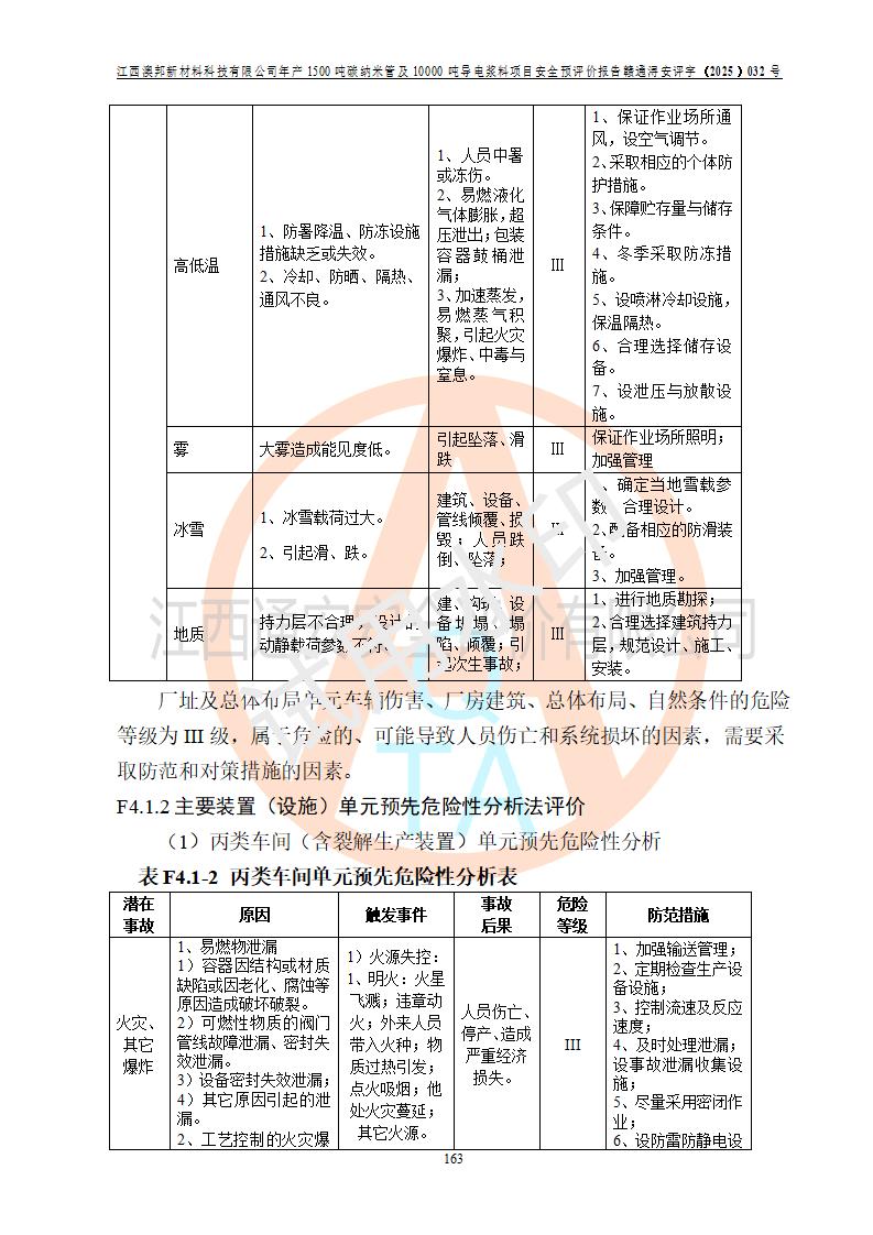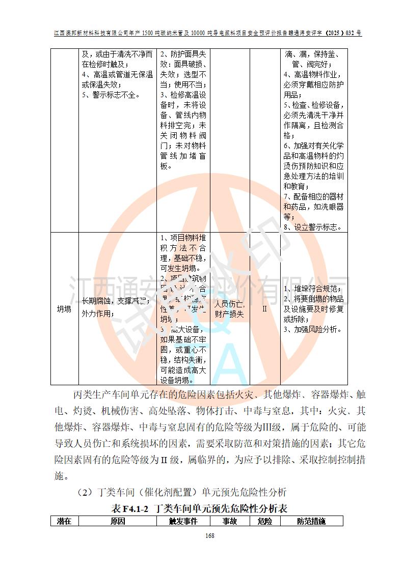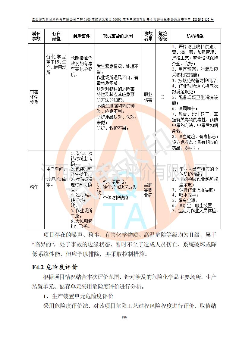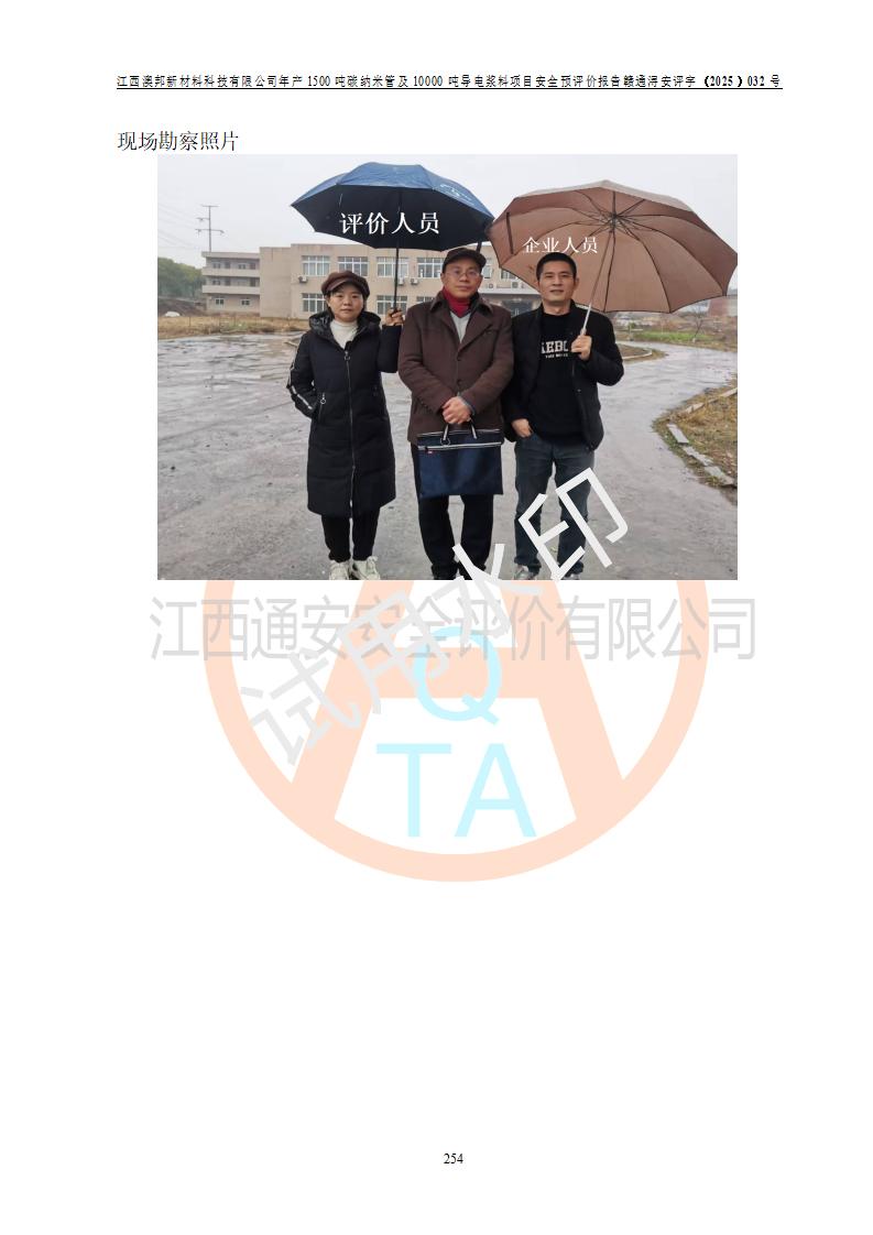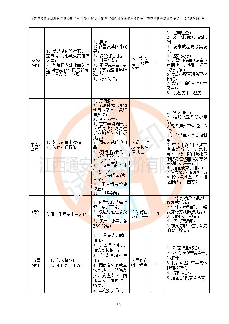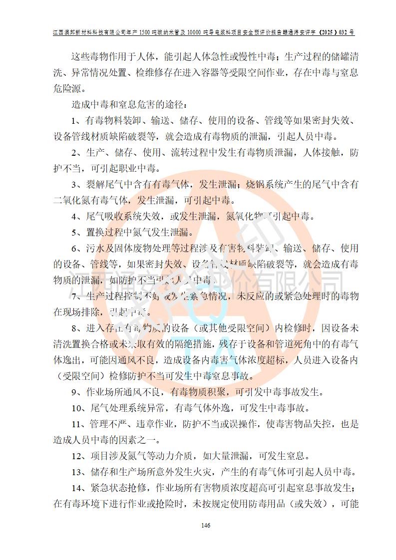 評價結論 | 江西澳邦新材料科技有限公司年產(chǎn) 1500 噸碳納米管及10000噸導電漿料項目的選址、總體布局、周邊環(huán)境、自然環(huán)境能滿足建設安全條件;項目選擇的工藝過程及設備設施的安全可靠性能達到**法規(guī)、標準規(guī)定要求。 項目存在的危險有害因素可控,在落實本評價報告提出的有關安全對策措施后,其危險有害程度能達到可以接受的程度,項目建設能夠實現(xiàn)安全運行的目標。 | |||||