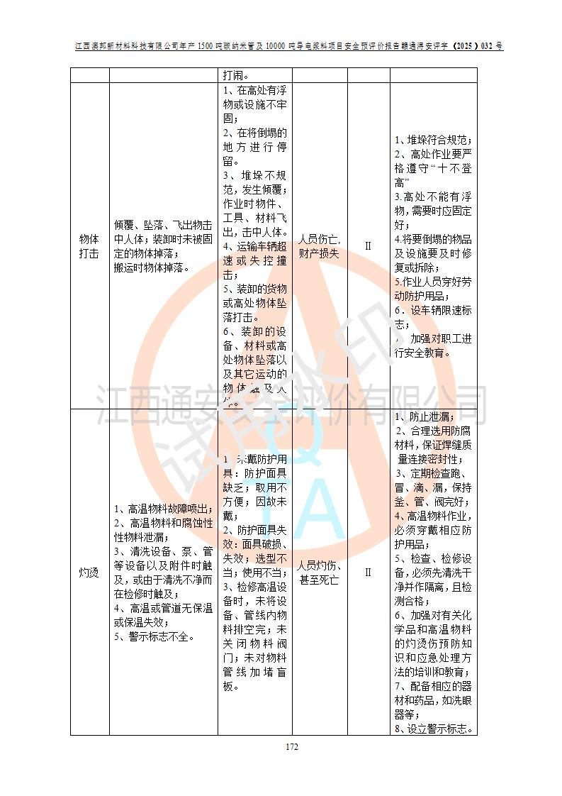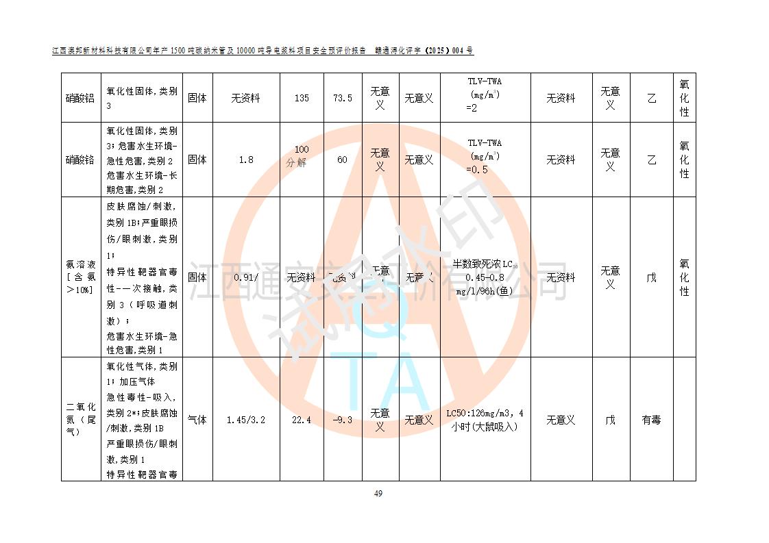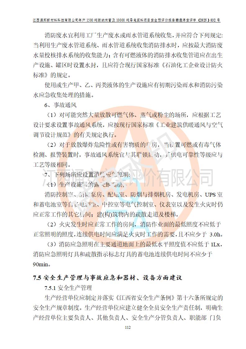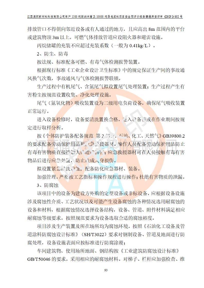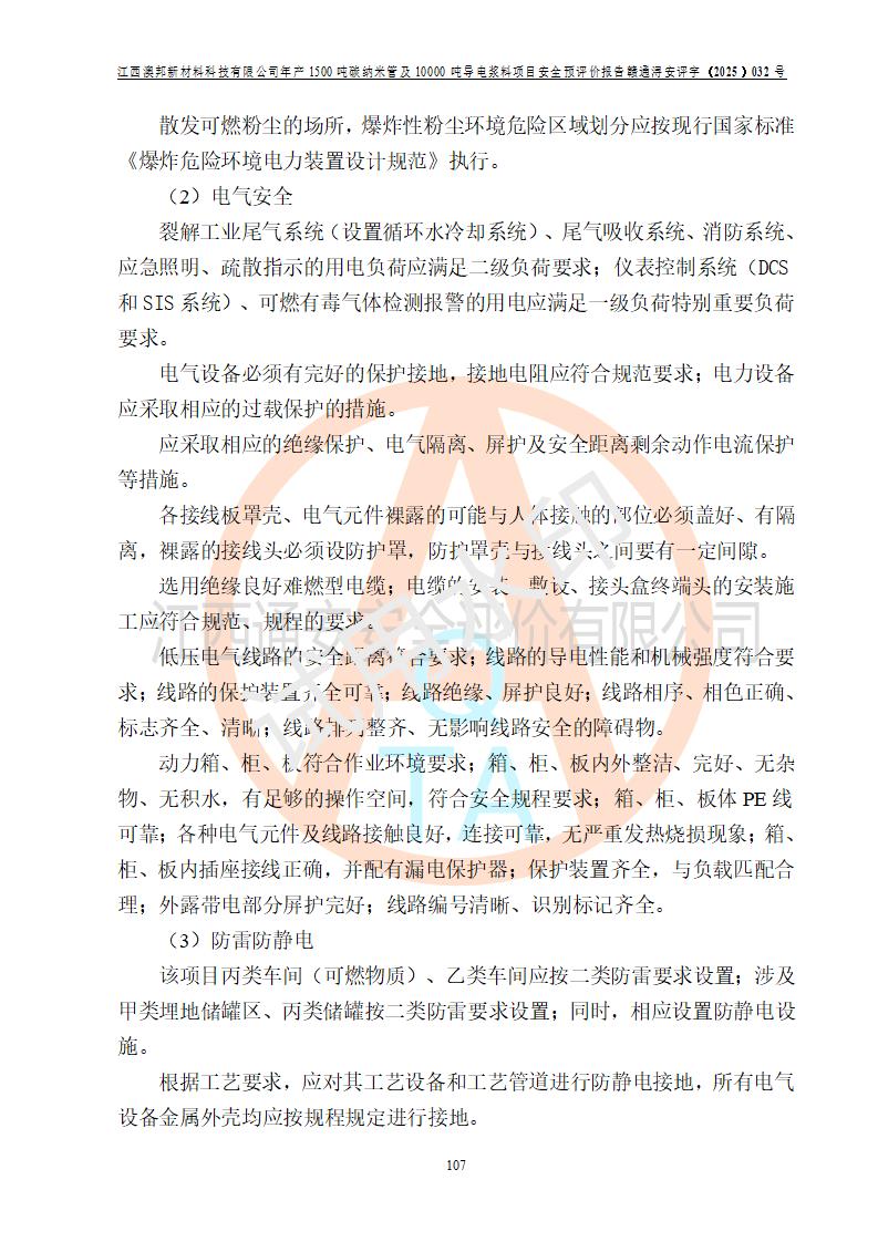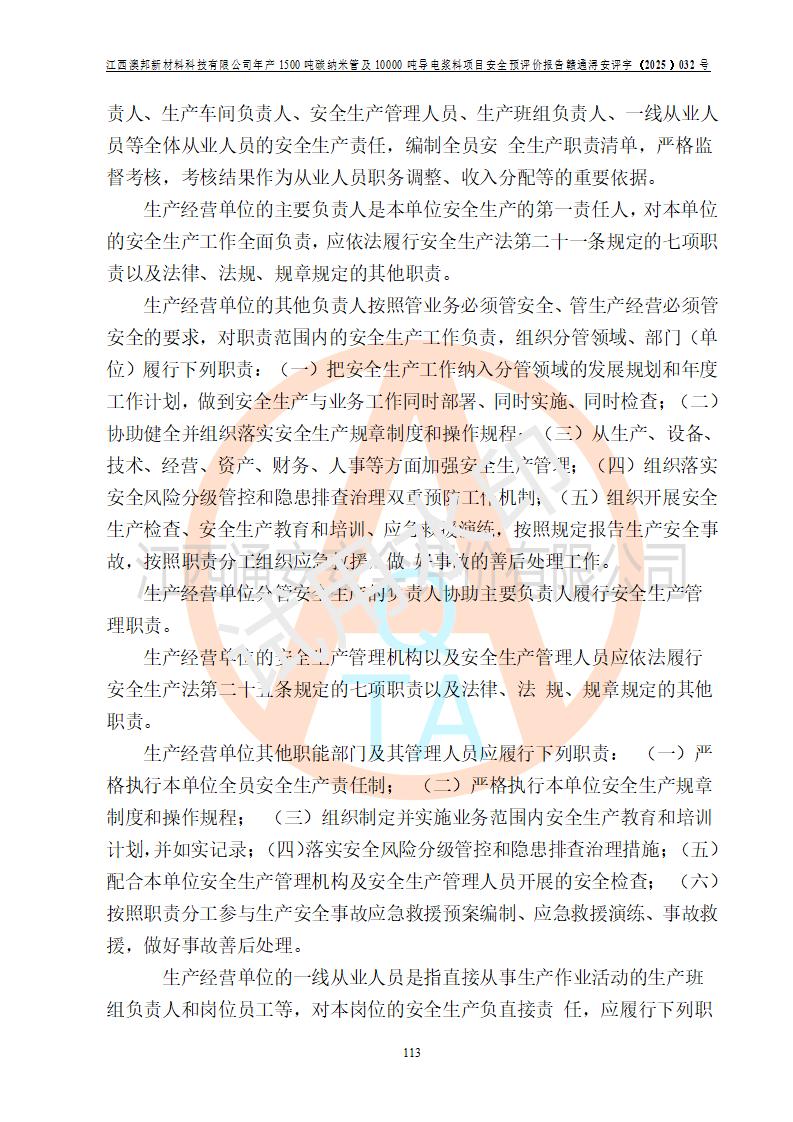 評價結論 | 江西澳邦新材料科技有限公司年產(chǎn) 1500 噸碳納米管及10000噸導電漿料項目的選址、總體布局、周邊環(huán)境、自然環(huán)境能滿足建設安全條件;項目選擇的工藝過程及設備設施的安全可靠性能達到**法規(guī)、標準規(guī)定要求。 項目存在的危險有害因素可控,在落實本評價報告提出的有關安全對策措施后,其危險有害程度能達到可以接受的程度,項目建設能夠實現(xiàn)安全運行的目標。 | |||||