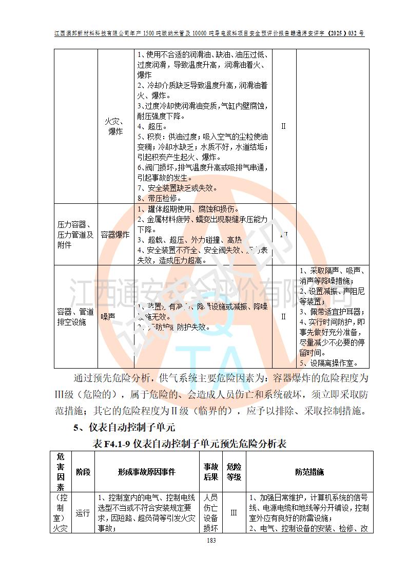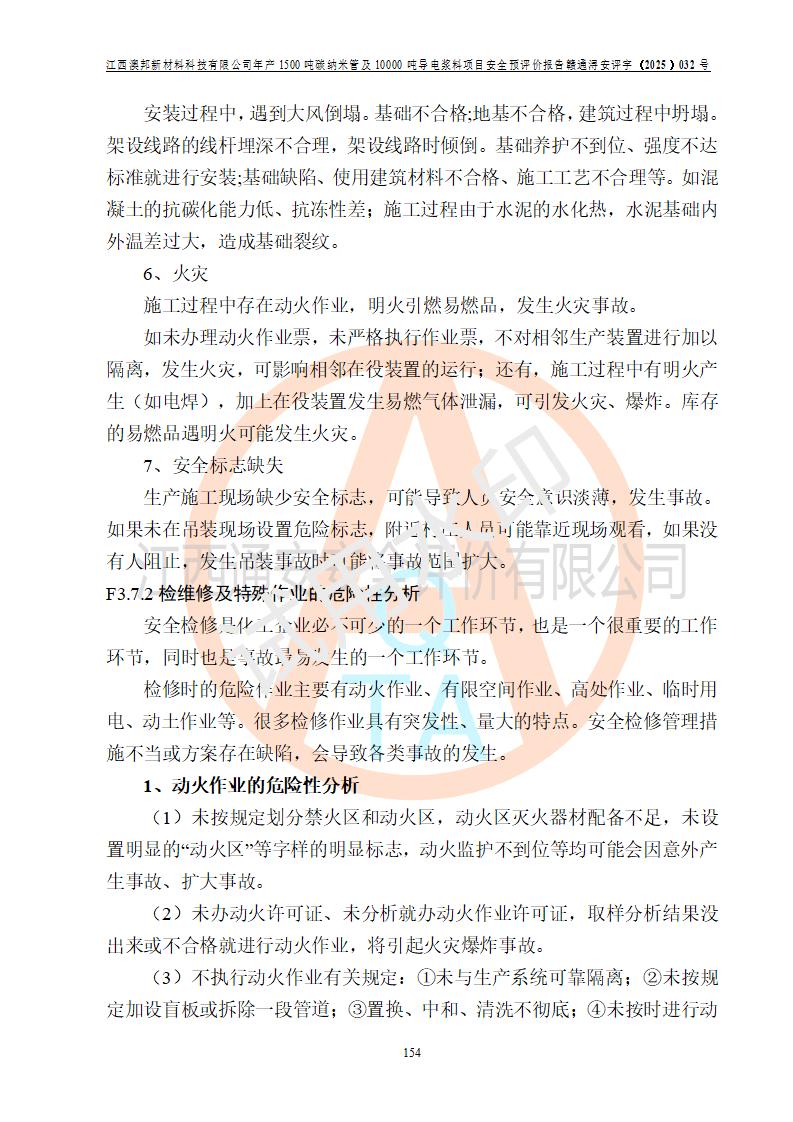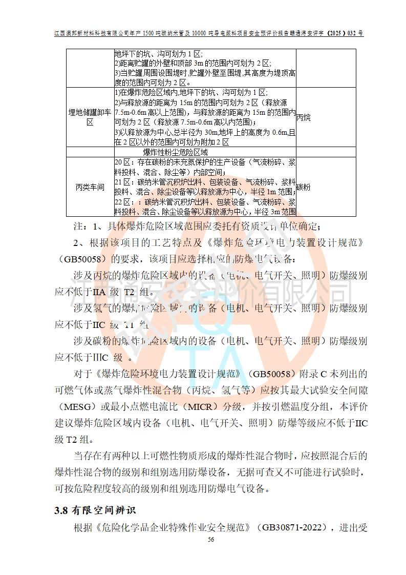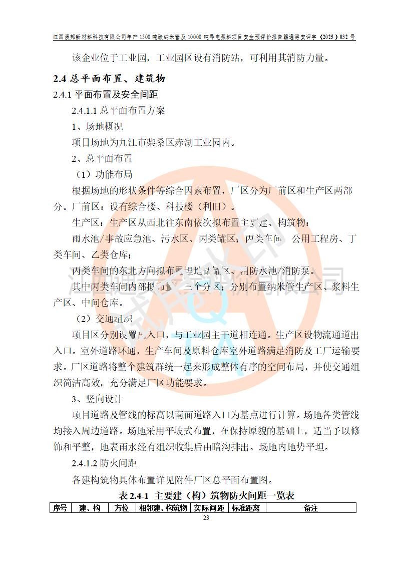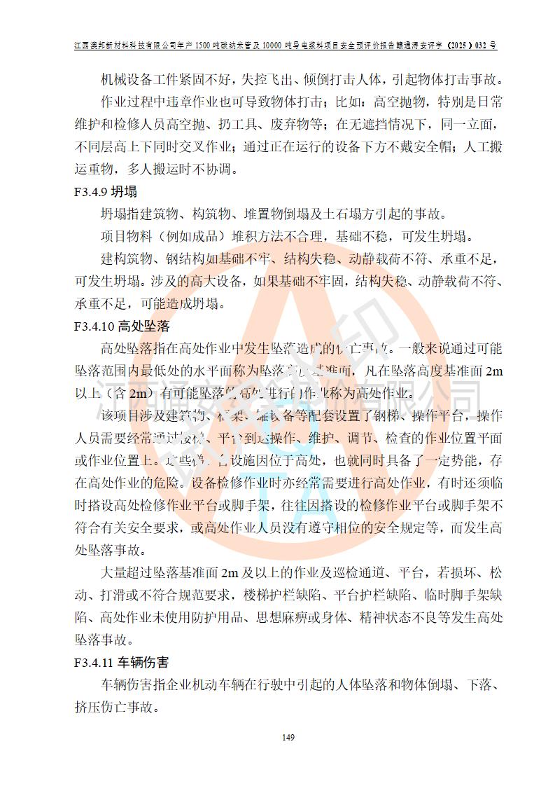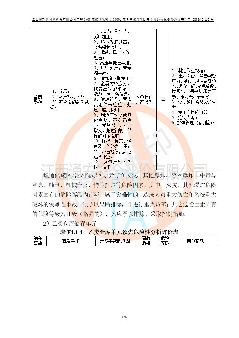 評價結論 | 江西澳邦新材料科技有限公司年產(chǎn) 1500 噸碳納米管及10000噸導電漿料項目的選址、總體布局、周邊環(huán)境、自然環(huán)境能滿足建設安全條件;項目選擇的工藝過程及設備設施的安全可靠性能達到**法規(guī)、標準規(guī)定要求。 項目存在的危險有害因素可控,在落實本評價報告提出的有關安全對策措施后,其危險有害程度能達到可以接受的程度,項目建設能夠實現(xiàn)安全運行的目標。 | |||||