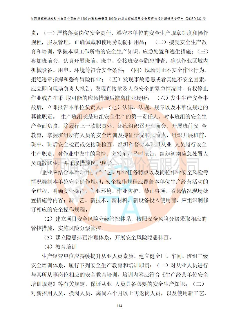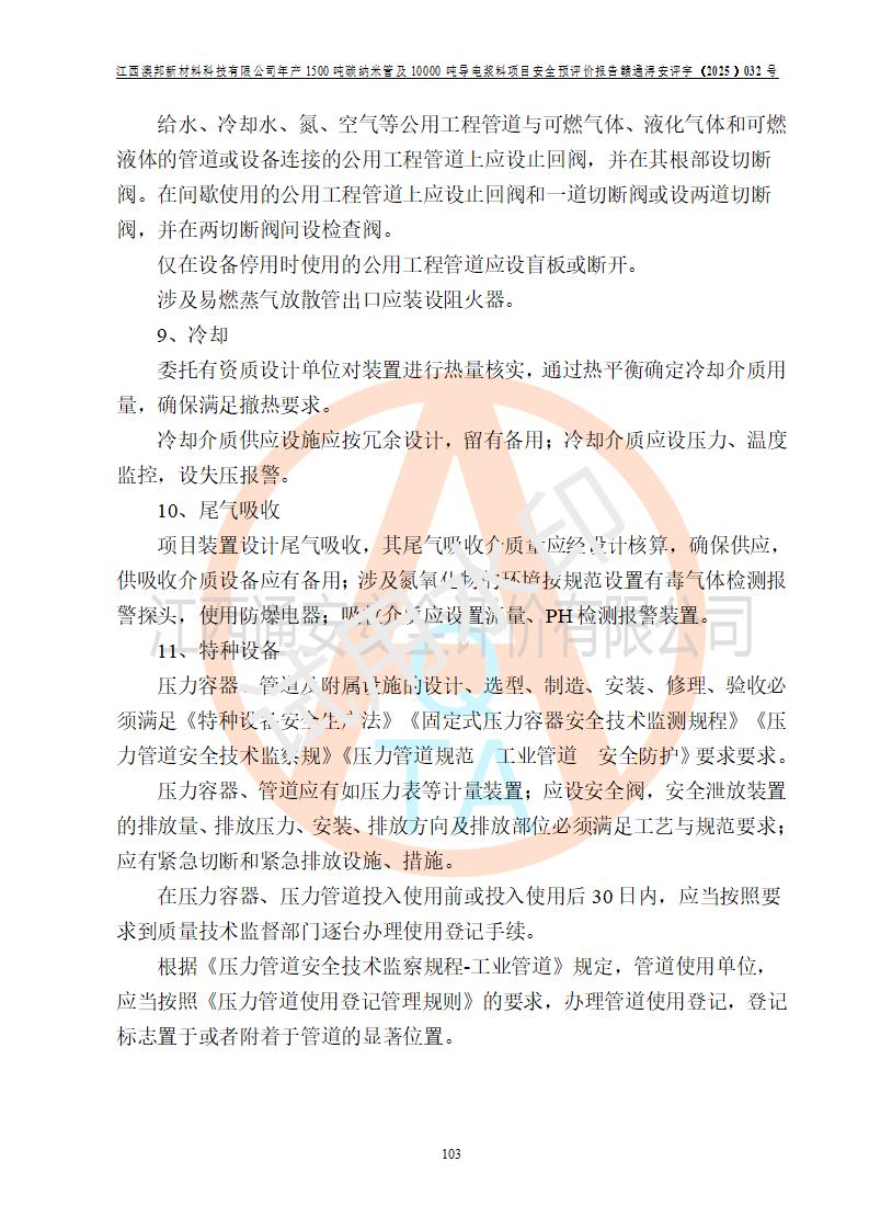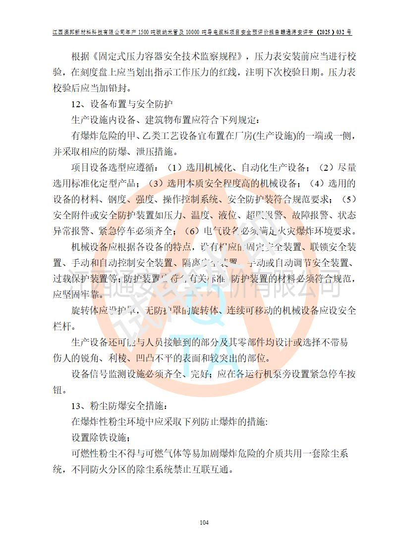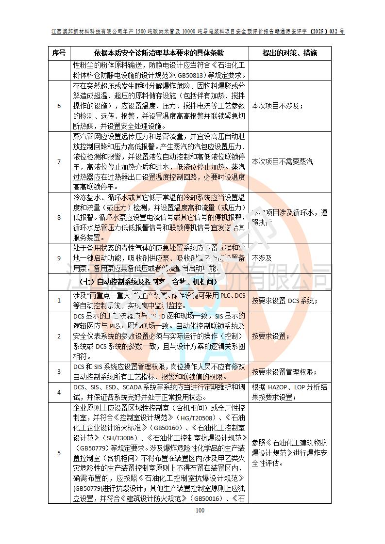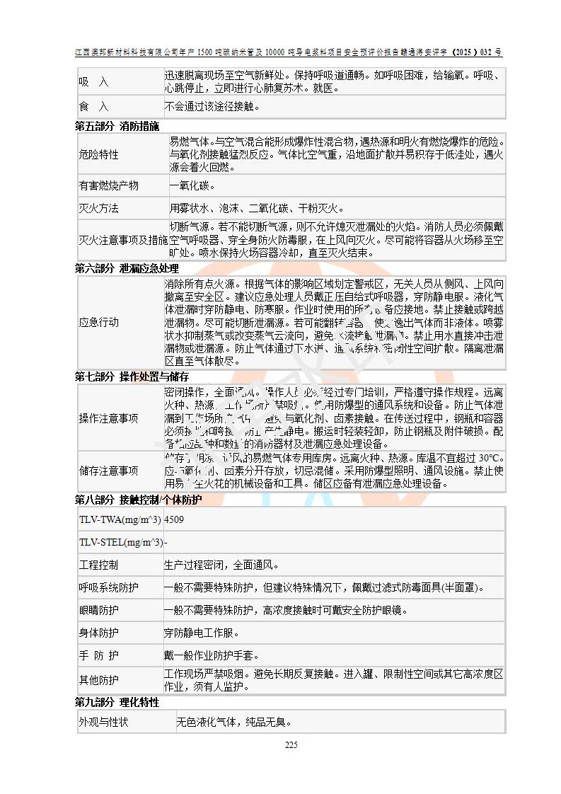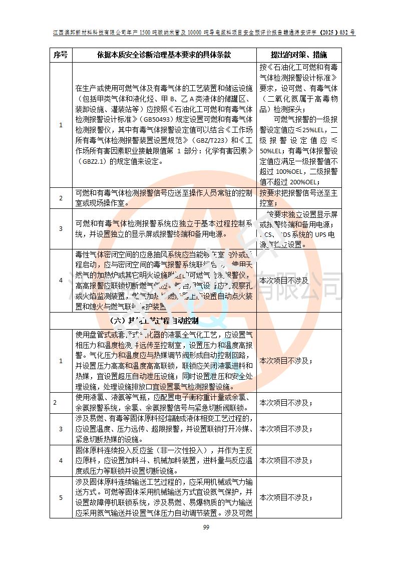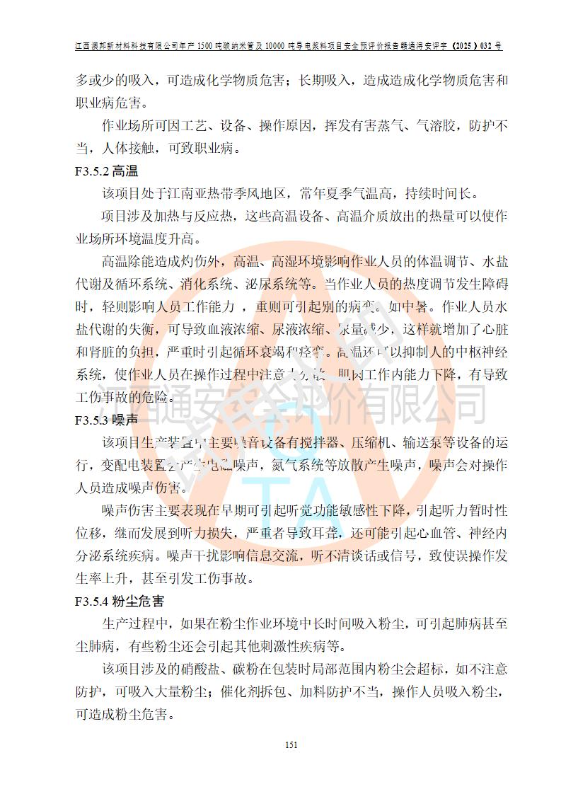 評價結論 | 江西澳邦新材料科技有限公司年產(chǎn) 1500 噸碳納米管及10000噸導電漿料項目的選址、總體布局、周邊環(huán)境、自然環(huán)境能滿足建設安全條件;項目選擇的工藝過程及設備設施的安全可靠性能達到**法規(guī)、標準規(guī)定要求。 項目存在的危險有害因素可控,在落實本評價報告提出的有關安全對策措施后,其危險有害程度能達到可以接受的程度,項目建設能夠實現(xiàn)安全運行的目標。 | |||||