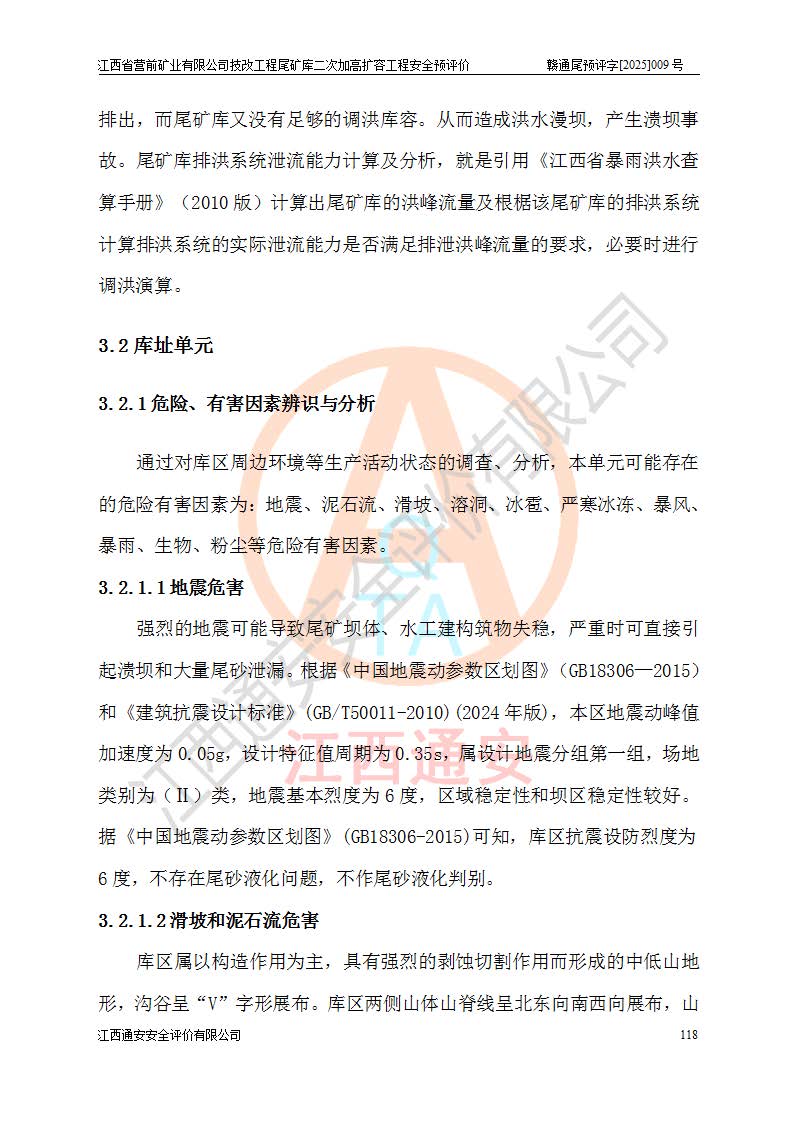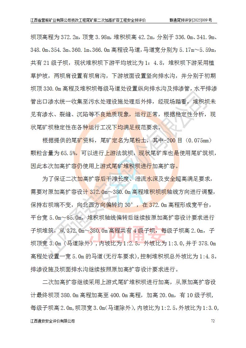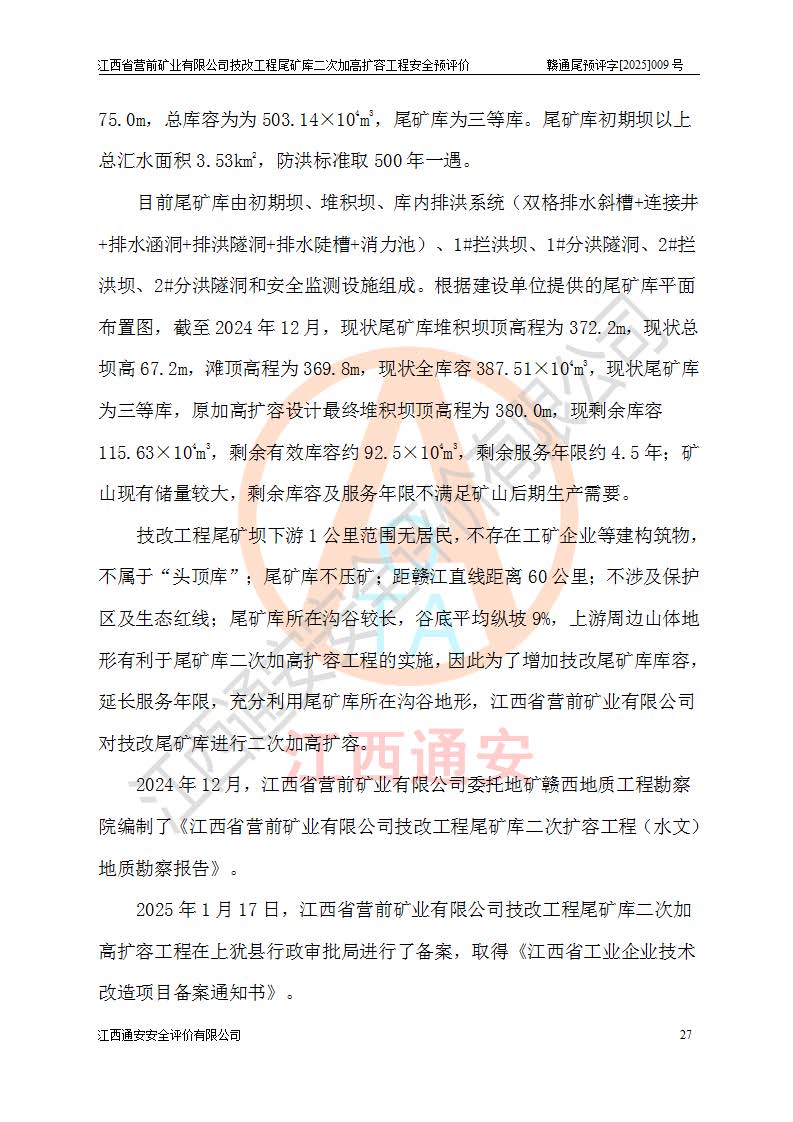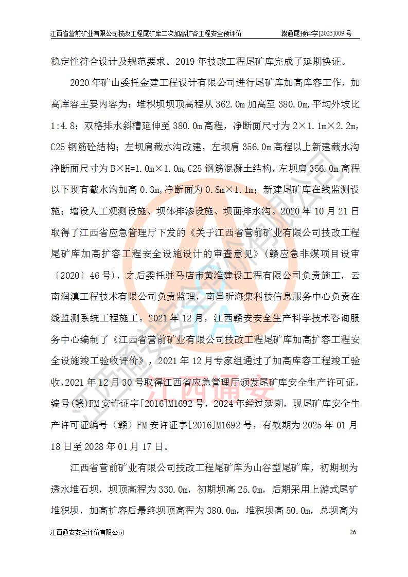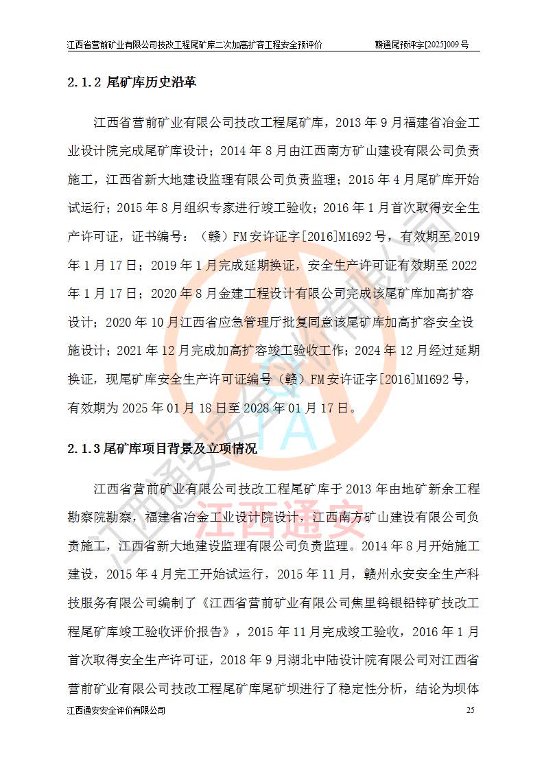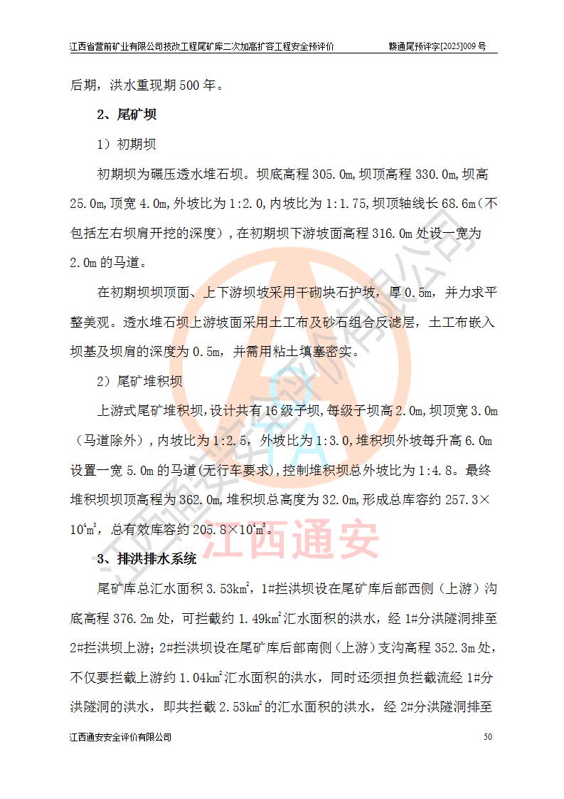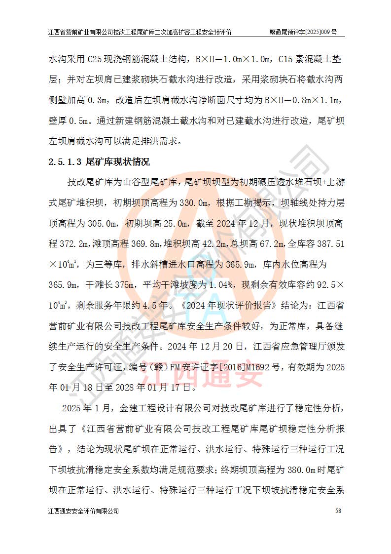 江西省營前礦業(yè)有限公司于2003年12月16日成立,位于贛州市上猶縣營前鎮(zhèn)焦里村境內(nèi),公司注冊資本10000萬元,法定**人陳雅博,礦區(qū)地理坐標(biāo):東經(jīng)114°18′30″~114°19′00″,北緯25°52′35″~25°53′47″。公司經(jīng)營范圍包括:鉛礦、鋅、鎢、銀地下開采、銷售。 江西省營前礦業(yè)有限公司技改工程尾礦庫位于焦里鎢銀鉛鋅礦區(qū),處于上猶縣水巖鄉(xiāng)井子村坑尾自然村境內(nèi),為山谷型尾礦庫。 江西省營前礦業(yè)有限公司技改工程尾礦庫于2013年由福建省冶金工業(yè)設(shè)計院設(shè)計,2014年8月開始施工建設(shè),2015年4月竣工開始試運(yùn)行,2015年11月完成竣工驗收,2016年1月首次取得安全生產(chǎn)許可證,2019年1月完成延期換證,2020年8月委托金建工程設(shè)計有限公司進(jìn)行尾礦庫加高擴(kuò)容工作,2020年10月21日取得了江西省應(yīng)急管理廳下發(fā)的《關(guān)于江西省營前礦業(yè)有限公司技改工程尾礦庫加高擴(kuò)容工程安全設(shè)施設(shè)計的審查意見》(贛應(yīng)急非煤項目設(shè)審〔2020〕46號),之后委托駐馬店市黃淮建設(shè)工程有限公司負(fù)責(zé)施工,云南潤滇工程技術(shù)有限公司負(fù)責(zé)監(jiān)理,2021年12月完成加高擴(kuò)容竣工驗收工作,經(jīng)過延期,現(xiàn)尾礦庫安全生產(chǎn)許可證編號(贛)FM安許證字[2016]M1692號,**期為2025年01月18日至2028年01月17日。 江西省營前礦業(yè)有限公司技改工程尾礦庫為山谷型尾礦庫,初期壩為透水堆石壩,壩頂高程為330.0m,初期壩高25.0m,后期采用上游式尾礦堆積壩,加高擴(kuò)容后*終壩頂高程為380.0m,堆積壩高50.0m,總壩高為75.0m,總庫容為為503.14×104m3,尾礦庫為三等庫。尾礦庫初期壩以上總匯水面積3.53km2,防洪標(biāo)準(zhǔn)取500年一遇。 目前尾礦庫由初期壩、堆積壩、庫內(nèi)排洪系統(tǒng)(雙格排水斜槽+連接井+排水涵洞+排洪隧洞+排水陡槽+消力池)、1#攔洪壩、1#分洪隧洞、2#攔洪壩、2#分洪隧洞和安全監(jiān)測設(shè)施組成。根據(jù)建設(shè)單位提供的尾礦庫平面布置圖,截至2024年12月,現(xiàn)狀尾礦庫堆積壩頂高程為372.2m,現(xiàn)狀總壩高67.2m,灘頂高程為369.8m,現(xiàn)狀全庫容387.51×104m3,現(xiàn)狀尾礦庫為三等庫,原加高擴(kuò)容設(shè)計*終堆積壩頂高程為380.0m,現(xiàn)剩余庫容115.63×104m3,剩余**庫容約92.5×104m3,剩余服務(wù)年限約4.5年;礦山現(xiàn)有儲量較大,剩余庫容及服務(wù)年限不滿足礦山后期生產(chǎn)需要。 技改工程尾礦庫尾礦壩下游1**范圍無居民,不存在工礦企業(yè)等建構(gòu)筑物,不屬于“頭頂庫”;尾礦庫不壓礦;距贛江直線距離60**;不涉及保護(hù)區(qū)及生態(tài)紅線;尾礦庫所在溝谷較長,谷底平均縱坡9%,上游周邊山體地形有利于尾礦庫二次加高擴(kuò)容工程的實施,因此為了增加尾礦庫庫容,延長服務(wù)年限,充分利用尾礦庫所在溝谷地形,江西省營前礦業(yè)有限公司對技改尾礦庫進(jìn)行二次加高擴(kuò)容。 2024年12月,江西省營前礦業(yè)有限公司委托地礦贛西地質(zhì)工程勘察院編制了《江西省營前礦業(yè)有限公司技改工程尾礦庫二次擴(kuò)容工程(水文)地質(zhì)勘察報告》,2025年4月,江西省營前礦業(yè)有限公司委托金建工程設(shè)計有限公司編制了《江西省營前礦業(yè)有限公司技改工程尾礦庫二次加高擴(kuò)容工程可行性研究報告》。 按照非煤礦山建設(shè)項目安全設(shè)施“三同時”的規(guī)定要求,技改工程尾礦庫為二次加高擴(kuò)容工程,**進(jìn)行安全預(yù)評價;江西省營前礦業(yè)有限公司委托我公司承擔(dān)技改工程尾礦庫二次加高擴(kuò)容工程建設(shè)項目的安全預(yù)評價工作。 |