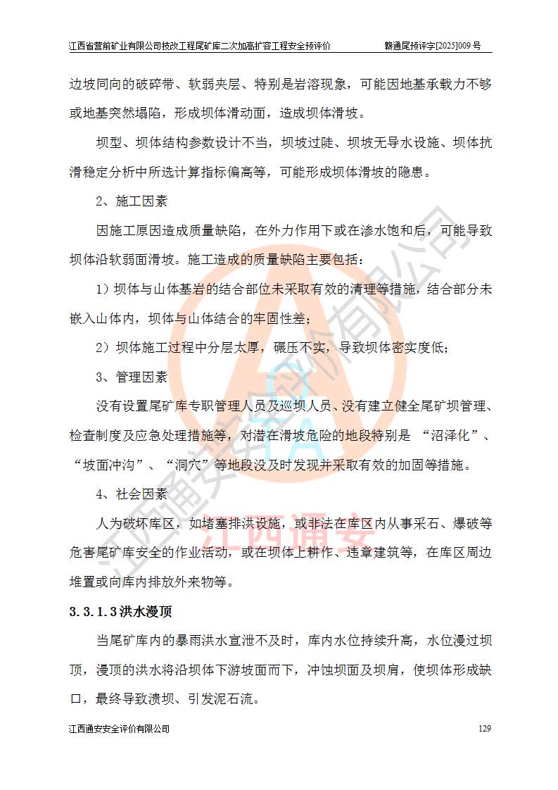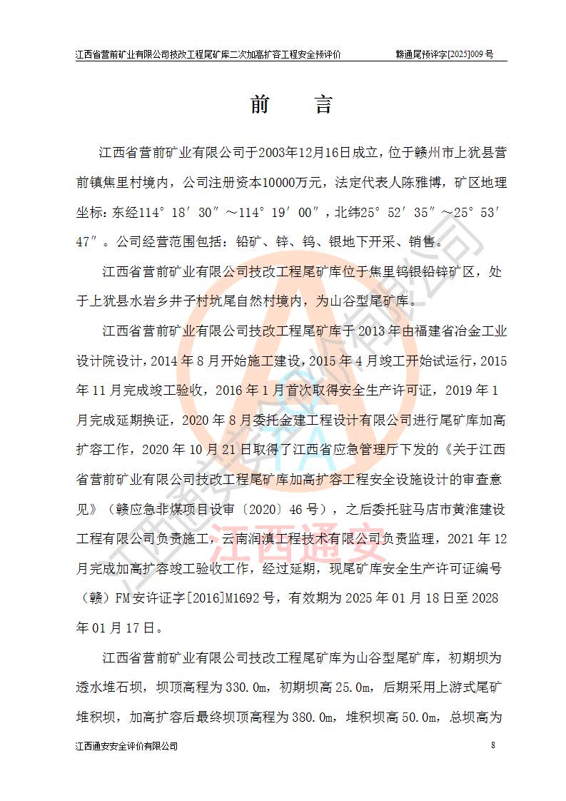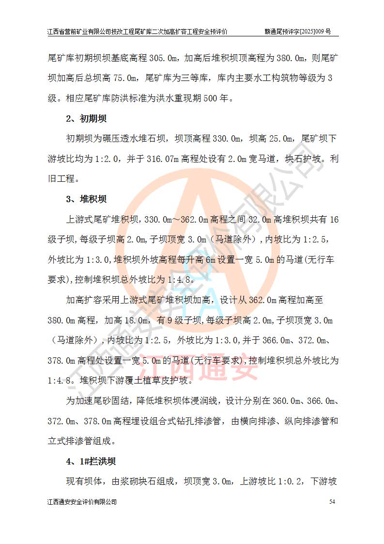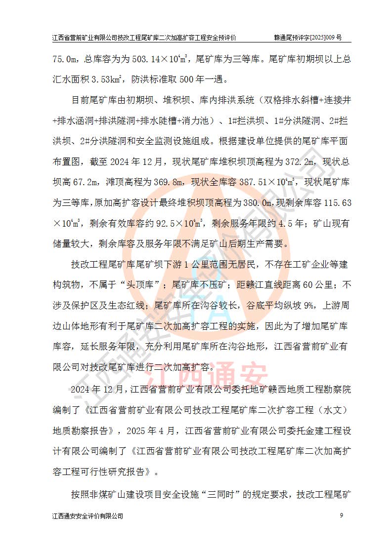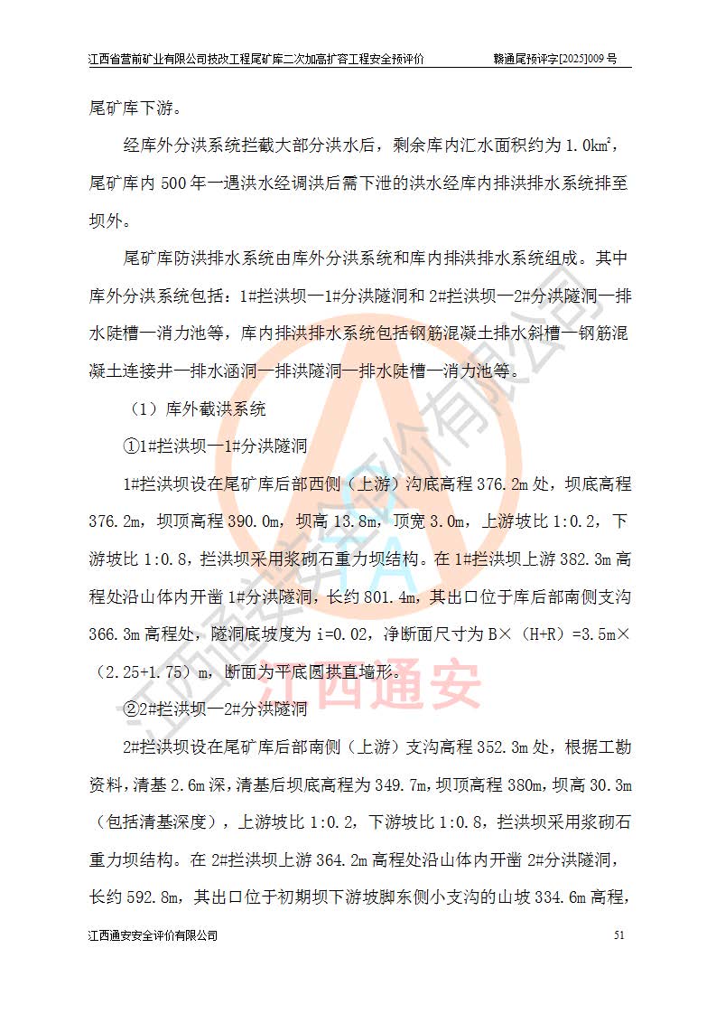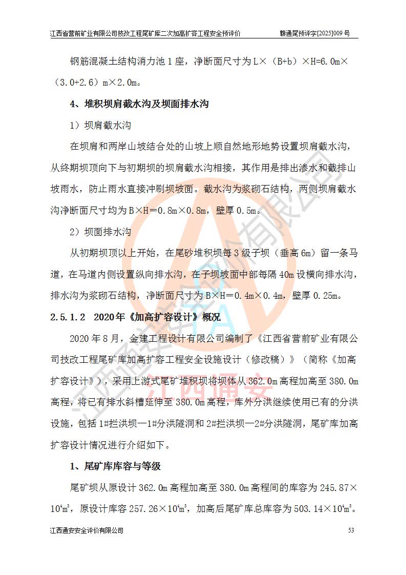 江西省營前礦業(yè)有限公司于2003年12月16日成立,位于贛州市上猶縣營前鎮(zhèn)焦里村境內(nèi),公司注冊資本10000萬元,法定**人陳雅博,礦區(qū)地理坐標(biāo):東經(jīng)114°18′30″~114°19′00″,北緯25°52′35″~25°53′47″。公司經(jīng)營范圍包括:鉛礦、鋅、鎢、銀地下開采、銷售。 江西省營前礦業(yè)有限公司技改工程尾礦庫位于焦里鎢銀鉛鋅礦區(qū),處于上猶縣水巖鄉(xiāng)井子村坑尾自然村境內(nèi),為山谷型尾礦庫。 江西省營前礦業(yè)有限公司技改工程尾礦庫于2013年由福建省冶金工業(yè)設(shè)計院設(shè)計,2014年8月開始施工建設(shè),2015年4月竣工開始試運(yùn)行,2015年11月完成竣工驗收,2016年1月首次取得安全生產(chǎn)許可證,2019年1月完成延期換證,2020年8月委托金建工程設(shè)計有限公司進(jìn)行尾礦庫加高擴(kuò)容工作,2020年10月21日取得了江西省應(yīng)急管理廳下發(fā)的《關(guān)于江西省營前礦業(yè)有限公司技改工程尾礦庫加高擴(kuò)容工程安全設(shè)施設(shè)計的審查意見》(贛應(yīng)急非煤項目設(shè)審〔2020〕46號),之后委托駐馬店市黃淮建設(shè)工程有限公司負(fù)責(zé)施工,云南潤滇工程技術(shù)有限公司負(fù)責(zé)監(jiān)理,2021年12月完成加高擴(kuò)容竣工驗收工作,經(jīng)過延期,現(xiàn)尾礦庫安全生產(chǎn)許可證編號(贛)FM安許證字[2016]M1692號,**期為2025年01月18日至2028年01月17日。 江西省營前礦業(yè)有限公司技改工程尾礦庫為山谷型尾礦庫,初期壩為透水堆石壩,壩頂高程為330.0m,初期壩高25.0m,后期采用上游式尾礦堆積壩,加高擴(kuò)容后*終壩頂高程為380.0m,堆積壩高50.0m,總壩高為75.0m,總庫容為為503.14×104m3,尾礦庫為三等庫。尾礦庫初期壩以上總匯水面積3.53km2,防洪標(biāo)準(zhǔn)取500年一遇。 目前尾礦庫由初期壩、堆積壩、庫內(nèi)排洪系統(tǒng)(雙格排水斜槽+連接井+排水涵洞+排洪隧洞+排水陡槽+消力池)、1#攔洪壩、1#分洪隧洞、2#攔洪壩、2#分洪隧洞和安全監(jiān)測設(shè)施組成。根據(jù)建設(shè)單位提供的尾礦庫平面布置圖,截至2024年12月,現(xiàn)狀尾礦庫堆積壩頂高程為372.2m,現(xiàn)狀總壩高67.2m,灘頂高程為369.8m,現(xiàn)狀全庫容387.51×104m3,現(xiàn)狀尾礦庫為三等庫,原加高擴(kuò)容設(shè)計*終堆積壩頂高程為380.0m,現(xiàn)剩余庫容115.63×104m3,剩余**庫容約92.5×104m3,剩余服務(wù)年限約4.5年;礦山現(xiàn)有儲量較大,剩余庫容及服務(wù)年限不滿足礦山后期生產(chǎn)需要。 技改工程尾礦庫尾礦壩下游1**范圍無居民,不存在工礦企業(yè)等建構(gòu)筑物,不屬于“頭頂庫”;尾礦庫不壓礦;距贛江直線距離60**;不涉及保護(hù)區(qū)及生態(tài)紅線;尾礦庫所在溝谷較長,谷底平均縱坡9%,上游周邊山體地形有利于尾礦庫二次加高擴(kuò)容工程的實施,因此為了增加尾礦庫庫容,延長服務(wù)年限,充分利用尾礦庫所在溝谷地形,江西省營前礦業(yè)有限公司對技改尾礦庫進(jìn)行二次加高擴(kuò)容。 2024年12月,江西省營前礦業(yè)有限公司委托地礦贛西地質(zhì)工程勘察院編制了《江西省營前礦業(yè)有限公司技改工程尾礦庫二次擴(kuò)容工程(水文)地質(zhì)勘察報告》,2025年4月,江西省營前礦業(yè)有限公司委托金建工程設(shè)計有限公司編制了《江西省營前礦業(yè)有限公司技改工程尾礦庫二次加高擴(kuò)容工程可行性研究報告》。 按照非煤礦山建設(shè)項目安全設(shè)施“三同時”的規(guī)定要求,技改工程尾礦庫為二次加高擴(kuò)容工程,**進(jìn)行安全預(yù)評價;江西省營前礦業(yè)有限公司委托我公司承擔(dān)技改工程尾礦庫二次加高擴(kuò)容工程建設(shè)項目的安全預(yù)評價工作。 |
