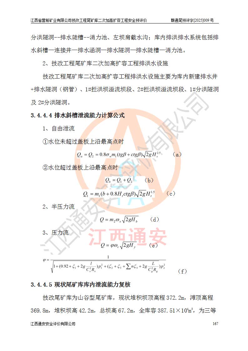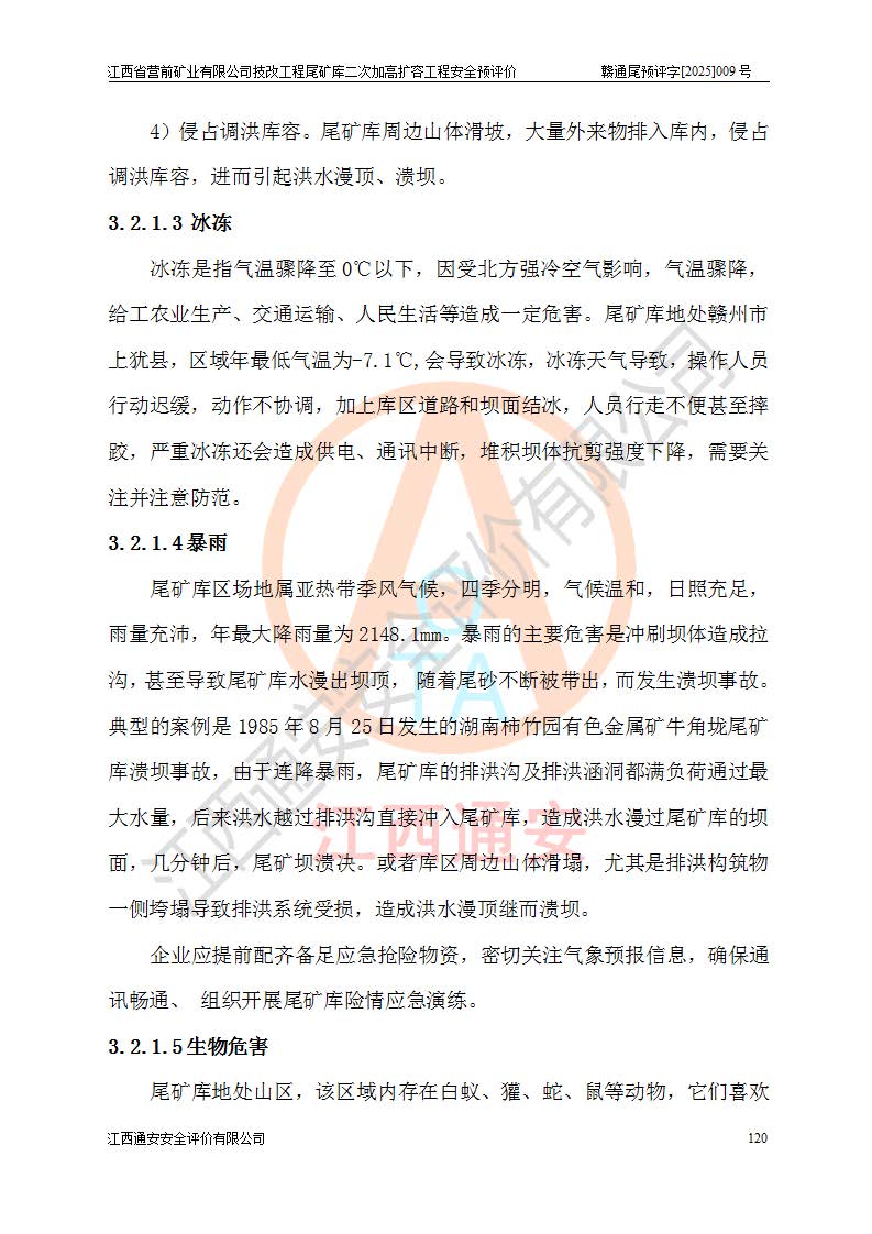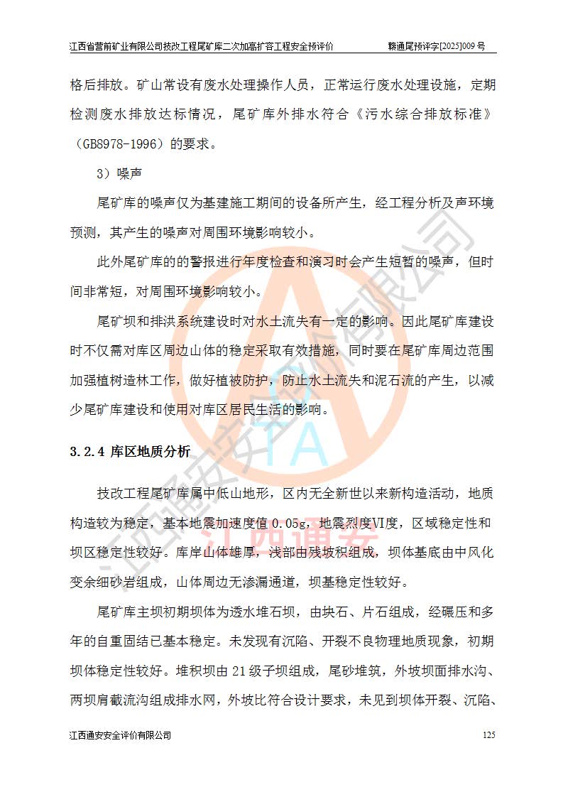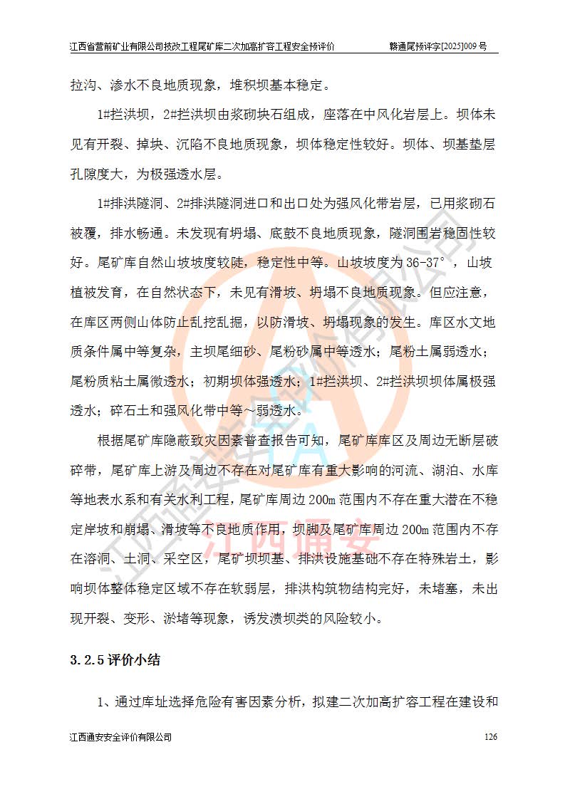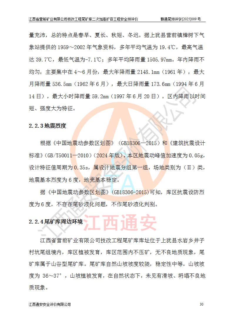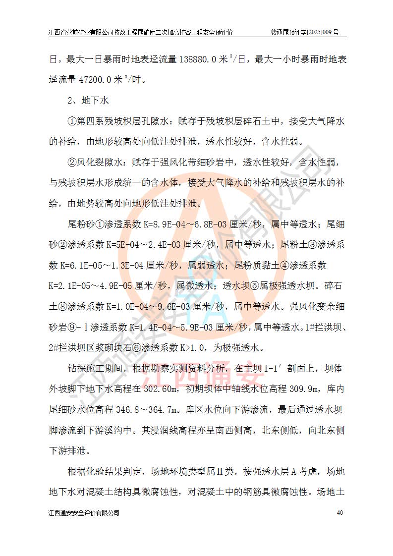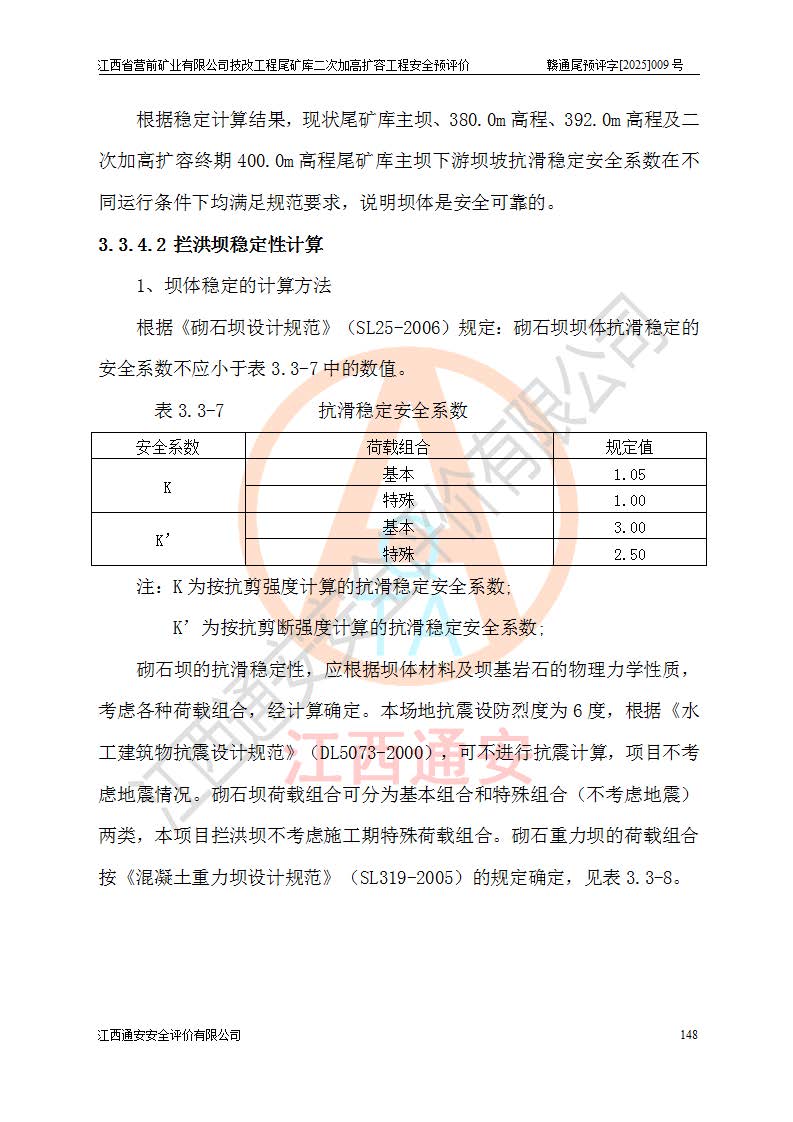 江西省營前礦業(yè)有限公司于2003年12月16日成立,位于贛州市上猶縣營前鎮(zhèn)焦里村境內(nèi),公司注冊資本10000萬元,法定**人陳雅博,礦區(qū)地理坐標(biāo):東經(jīng)114°18′30″~114°19′00″,北緯25°52′35″~25°53′47″。公司經(jīng)營范圍包括:鉛礦、鋅、鎢、銀地下開采、銷售。 江西省營前礦業(yè)有限公司技改工程尾礦庫位于焦里鎢銀鉛鋅礦區(qū),處于上猶縣水巖鄉(xiāng)井子村坑尾自然村境內(nèi),為山谷型尾礦庫。 江西省營前礦業(yè)有限公司技改工程尾礦庫于2013年由福建省冶金工業(yè)設(shè)計院設(shè)計,2014年8月開始施工建設(shè),2015年4月竣工開始試運(yùn)行,2015年11月完成竣工驗收,2016年1月首次取得安全生產(chǎn)許可證,2019年1月完成延期換證,2020年8月委托金建工程設(shè)計有限公司進(jìn)行尾礦庫加高擴(kuò)容工作,2020年10月21日取得了江西省應(yīng)急管理廳下發(fā)的《關(guān)于江西省營前礦業(yè)有限公司技改工程尾礦庫加高擴(kuò)容工程安全設(shè)施設(shè)計的審查意見》(贛應(yīng)急非煤項目設(shè)審〔2020〕46號),之后委托駐馬店市黃淮建設(shè)工程有限公司負(fù)責(zé)施工,云南潤滇工程技術(shù)有限公司負(fù)責(zé)監(jiān)理,2021年12月完成加高擴(kuò)容竣工驗收工作,經(jīng)過延期,現(xiàn)尾礦庫安全生產(chǎn)許可證編號(贛)FM安許證字[2016]M1692號,**期為2025年01月18日至2028年01月17日。 江西省營前礦業(yè)有限公司技改工程尾礦庫為山谷型尾礦庫,初期壩為透水堆石壩,壩頂高程為330.0m,初期壩高25.0m,后期采用上游式尾礦堆積壩,加高擴(kuò)容后*終壩頂高程為380.0m,堆積壩高50.0m,總壩高為75.0m,總庫容為為503.14×104m3,尾礦庫為三等庫。尾礦庫初期壩以上總匯水面積3.53km2,防洪標(biāo)準(zhǔn)取500年一遇。 目前尾礦庫由初期壩、堆積壩、庫內(nèi)排洪系統(tǒng)(雙格排水斜槽+連接井+排水涵洞+排洪隧洞+排水陡槽+消力池)、1#攔洪壩、1#分洪隧洞、2#攔洪壩、2#分洪隧洞和安全監(jiān)測設(shè)施組成。根據(jù)建設(shè)單位提供的尾礦庫平面布置圖,截至2024年12月,現(xiàn)狀尾礦庫堆積壩頂高程為372.2m,現(xiàn)狀總壩高67.2m,灘頂高程為369.8m,現(xiàn)狀全庫容387.51×104m3,現(xiàn)狀尾礦庫為三等庫,原加高擴(kuò)容設(shè)計*終堆積壩頂高程為380.0m,現(xiàn)剩余庫容115.63×104m3,剩余**庫容約92.5×104m3,剩余服務(wù)年限約4.5年;礦山現(xiàn)有儲量較大,剩余庫容及服務(wù)年限不滿足礦山后期生產(chǎn)需要。 技改工程尾礦庫尾礦壩下游1**范圍無居民,不存在工礦企業(yè)等建構(gòu)筑物,不屬于“頭頂庫”;尾礦庫不壓礦;距贛江直線距離60**;不涉及保護(hù)區(qū)及生態(tài)紅線;尾礦庫所在溝谷較長,谷底平均縱坡9%,上游周邊山體地形有利于尾礦庫二次加高擴(kuò)容工程的實施,因此為了增加尾礦庫庫容,延長服務(wù)年限,充分利用尾礦庫所在溝谷地形,江西省營前礦業(yè)有限公司對技改尾礦庫進(jìn)行二次加高擴(kuò)容。 2024年12月,江西省營前礦業(yè)有限公司委托地礦贛西地質(zhì)工程勘察院編制了《江西省營前礦業(yè)有限公司技改工程尾礦庫二次擴(kuò)容工程(水文)地質(zhì)勘察報告》,2025年4月,江西省營前礦業(yè)有限公司委托金建工程設(shè)計有限公司編制了《江西省營前礦業(yè)有限公司技改工程尾礦庫二次加高擴(kuò)容工程可行性研究報告》。 按照非煤礦山建設(shè)項目安全設(shè)施“三同時”的規(guī)定要求,技改工程尾礦庫為二次加高擴(kuò)容工程,**進(jìn)行安全預(yù)評價;江西省營前礦業(yè)有限公司委托我公司承擔(dān)技改工程尾礦庫二次加高擴(kuò)容工程建設(shè)項目的安全預(yù)評價工作。 |