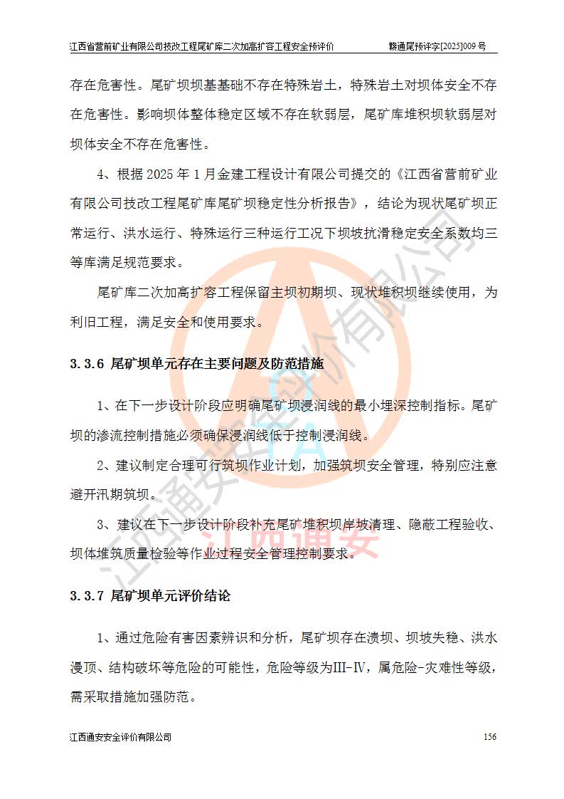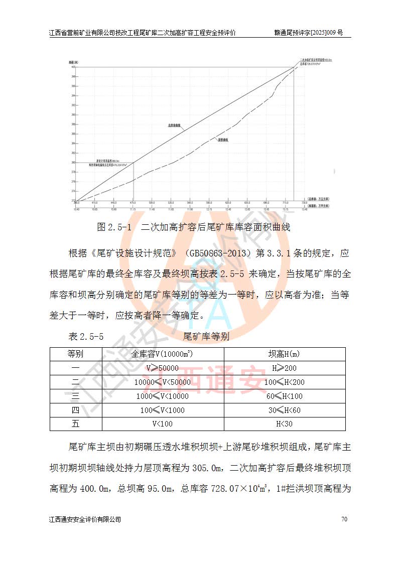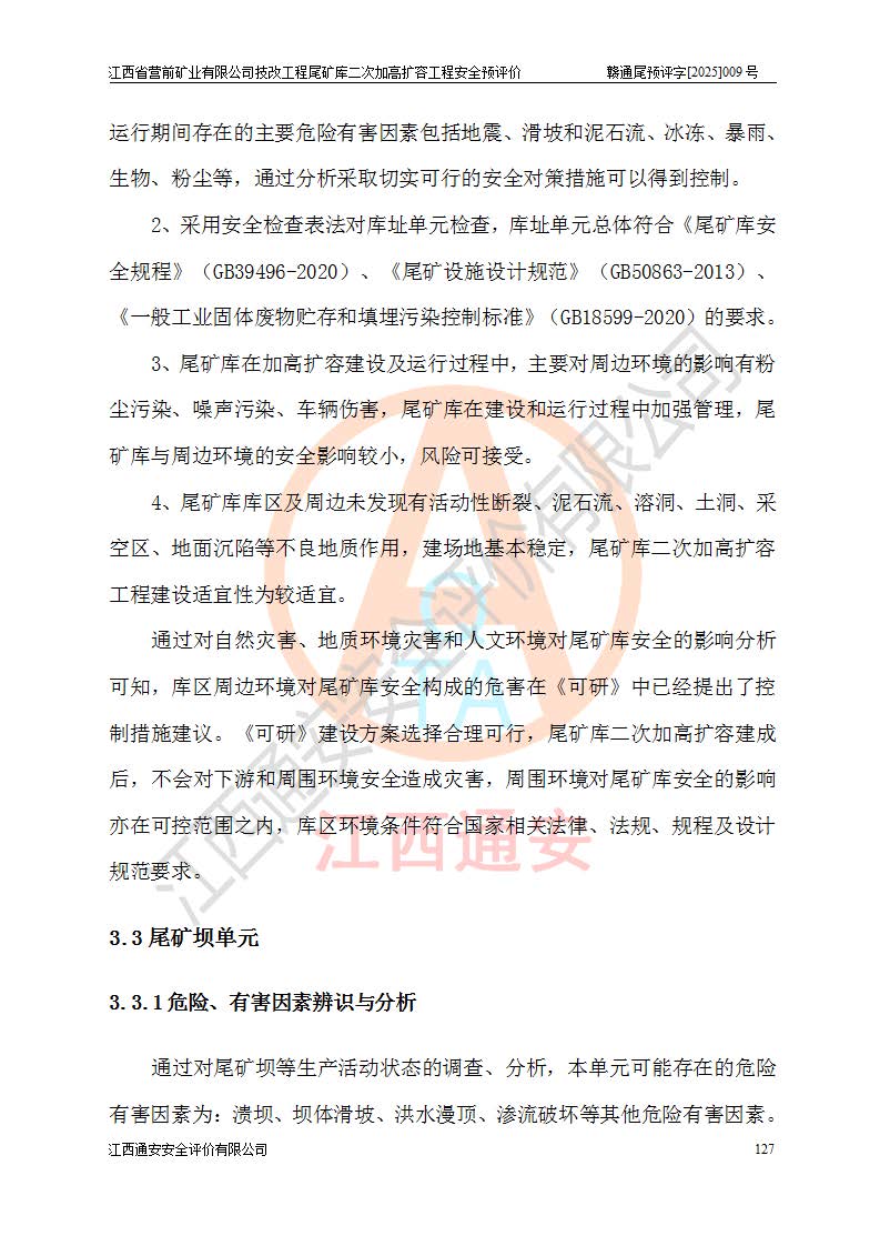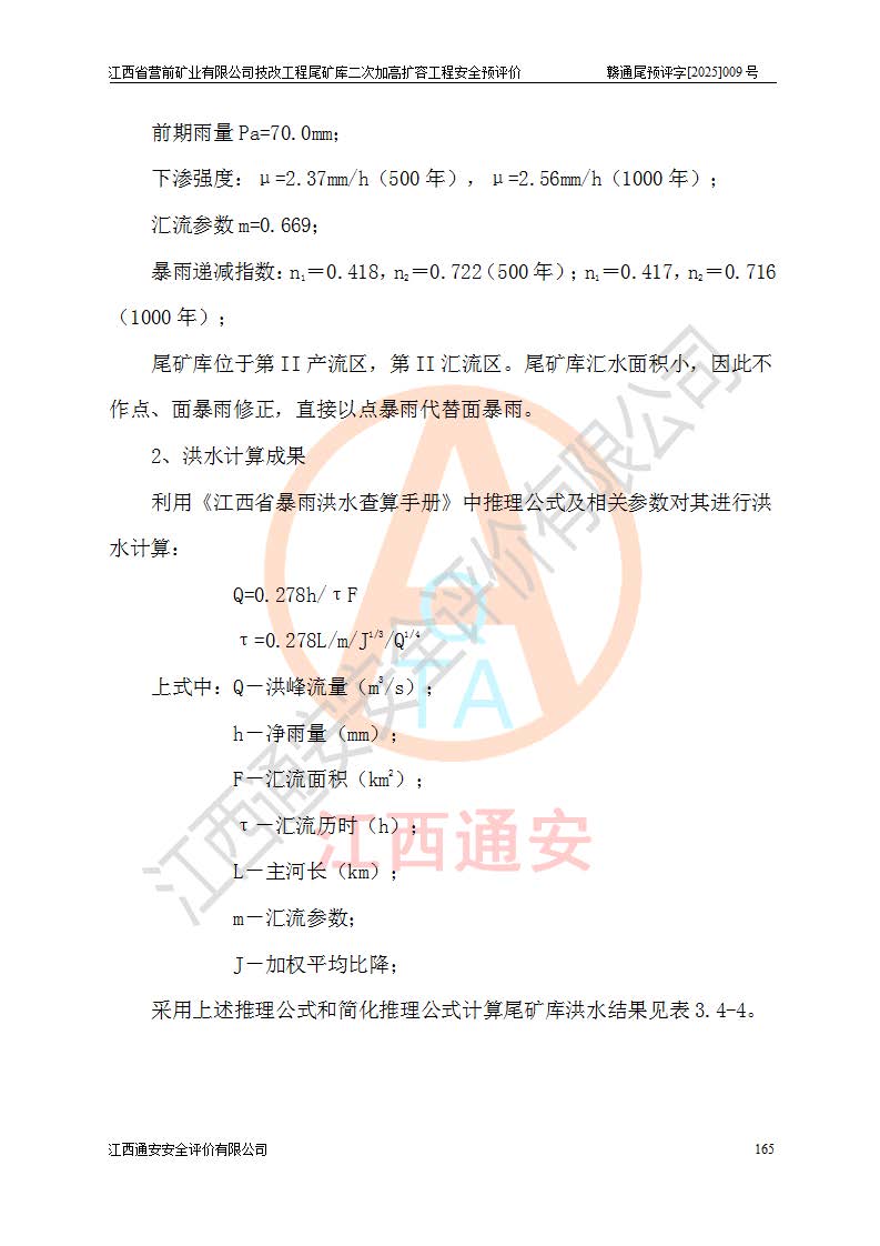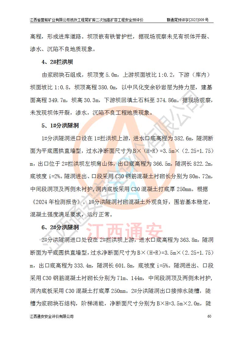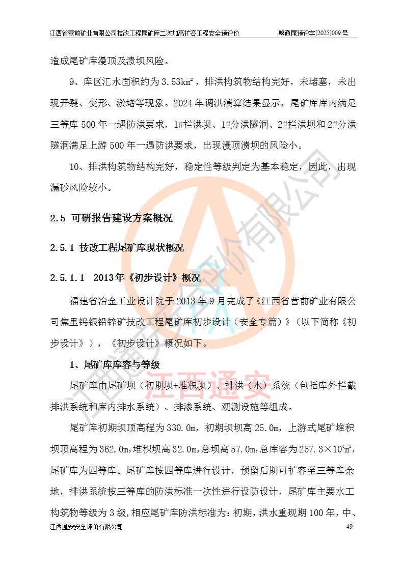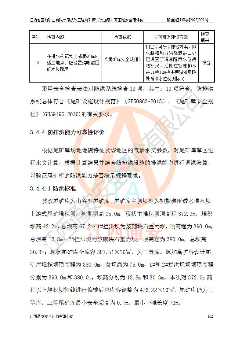 江西省營前礦業(yè)有限公司于2003年12月16日成立,位于贛州市上猶縣營前鎮(zhèn)焦里村境內(nèi),公司注冊資本10000萬元,法定**人陳雅博,礦區(qū)地理坐標(biāo):東經(jīng)114°18′30″~114°19′00″,北緯25°52′35″~25°53′47″。公司經(jīng)營范圍包括:鉛礦、鋅、鎢、銀地下開采、銷售。 江西省營前礦業(yè)有限公司技改工程尾礦庫位于焦里鎢銀鉛鋅礦區(qū),處于上猶縣水巖鄉(xiāng)井子村坑尾自然村境內(nèi),為山谷型尾礦庫。 江西省營前礦業(yè)有限公司技改工程尾礦庫于2013年由福建省冶金工業(yè)設(shè)計院設(shè)計,2014年8月開始施工建設(shè),2015年4月竣工開始試運(yùn)行,2015年11月完成竣工驗收,2016年1月首次取得安全生產(chǎn)許可證,2019年1月完成延期換證,2020年8月委托金建工程設(shè)計有限公司進(jìn)行尾礦庫加高擴(kuò)容工作,2020年10月21日取得了江西省應(yīng)急管理廳下發(fā)的《關(guān)于江西省營前礦業(yè)有限公司技改工程尾礦庫加高擴(kuò)容工程安全設(shè)施設(shè)計的審查意見》(贛應(yīng)急非煤項目設(shè)審〔2020〕46號),之后委托駐馬店市黃淮建設(shè)工程有限公司負(fù)責(zé)施工,云南潤滇工程技術(shù)有限公司負(fù)責(zé)監(jiān)理,2021年12月完成加高擴(kuò)容竣工驗收工作,經(jīng)過延期,現(xiàn)尾礦庫安全生產(chǎn)許可證編號(贛)FM安許證字[2016]M1692號,**期為2025年01月18日至2028年01月17日。 江西省營前礦業(yè)有限公司技改工程尾礦庫為山谷型尾礦庫,初期壩為透水堆石壩,壩頂高程為330.0m,初期壩高25.0m,后期采用上游式尾礦堆積壩,加高擴(kuò)容后*終壩頂高程為380.0m,堆積壩高50.0m,總壩高為75.0m,總庫容為為503.14×104m3,尾礦庫為三等庫。尾礦庫初期壩以上總匯水面積3.53km2,防洪標(biāo)準(zhǔn)取500年一遇。 目前尾礦庫由初期壩、堆積壩、庫內(nèi)排洪系統(tǒng)(雙格排水斜槽+連接井+排水涵洞+排洪隧洞+排水陡槽+消力池)、1#攔洪壩、1#分洪隧洞、2#攔洪壩、2#分洪隧洞和安全監(jiān)測設(shè)施組成。根據(jù)建設(shè)單位提供的尾礦庫平面布置圖,截至2024年12月,現(xiàn)狀尾礦庫堆積壩頂高程為372.2m,現(xiàn)狀總壩高67.2m,灘頂高程為369.8m,現(xiàn)狀全庫容387.51×104m3,現(xiàn)狀尾礦庫為三等庫,原加高擴(kuò)容設(shè)計*終堆積壩頂高程為380.0m,現(xiàn)剩余庫容115.63×104m3,剩余**庫容約92.5×104m3,剩余服務(wù)年限約4.5年;礦山現(xiàn)有儲量較大,剩余庫容及服務(wù)年限不滿足礦山后期生產(chǎn)需要。 技改工程尾礦庫尾礦壩下游1**范圍無居民,不存在工礦企業(yè)等建構(gòu)筑物,不屬于“頭頂庫”;尾礦庫不壓礦;距贛江直線距離60**;不涉及保護(hù)區(qū)及生態(tài)紅線;尾礦庫所在溝谷較長,谷底平均縱坡9%,上游周邊山體地形有利于尾礦庫二次加高擴(kuò)容工程的實施,因此為了增加尾礦庫庫容,延長服務(wù)年限,充分利用尾礦庫所在溝谷地形,江西省營前礦業(yè)有限公司對技改尾礦庫進(jìn)行二次加高擴(kuò)容。 2024年12月,江西省營前礦業(yè)有限公司委托地礦贛西地質(zhì)工程勘察院編制了《江西省營前礦業(yè)有限公司技改工程尾礦庫二次擴(kuò)容工程(水文)地質(zhì)勘察報告》,2025年4月,江西省營前礦業(yè)有限公司委托金建工程設(shè)計有限公司編制了《江西省營前礦業(yè)有限公司技改工程尾礦庫二次加高擴(kuò)容工程可行性研究報告》。 按照非煤礦山建設(shè)項目安全設(shè)施“三同時”的規(guī)定要求,技改工程尾礦庫為二次加高擴(kuò)容工程,**進(jìn)行安全預(yù)評價;江西省營前礦業(yè)有限公司委托我公司承擔(dān)技改工程尾礦庫二次加高擴(kuò)容工程建設(shè)項目的安全預(yù)評價工作。 |