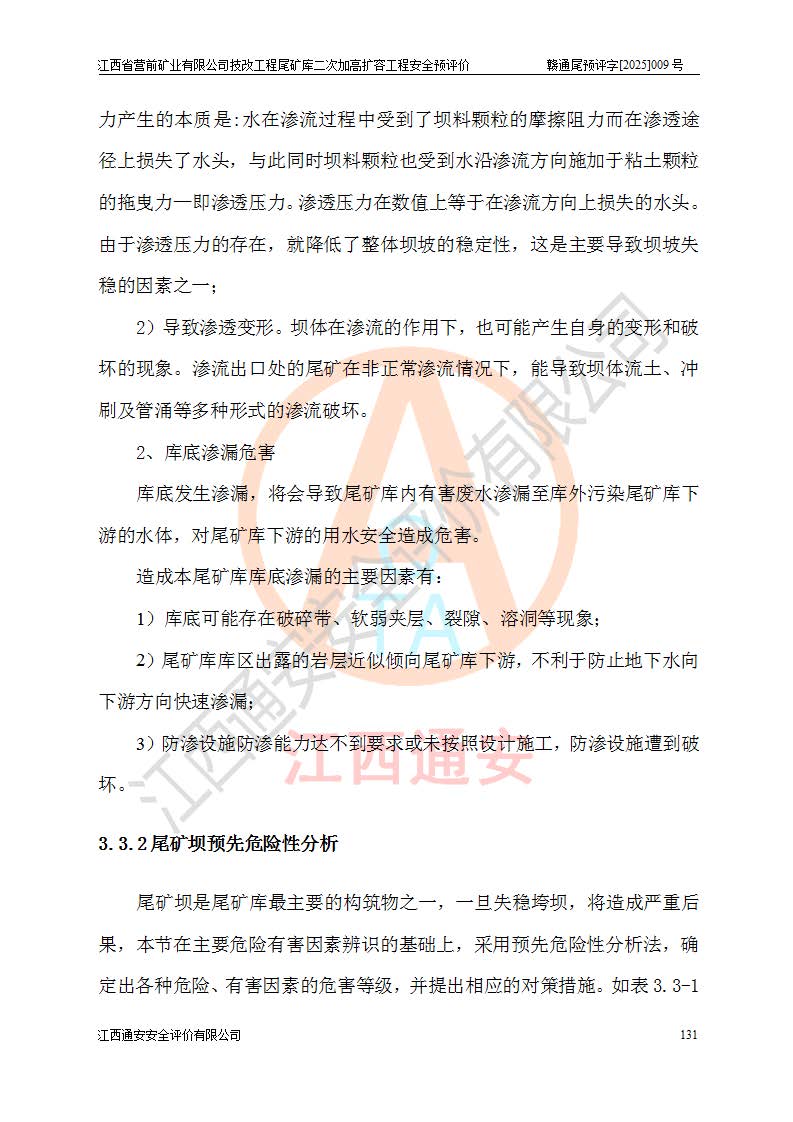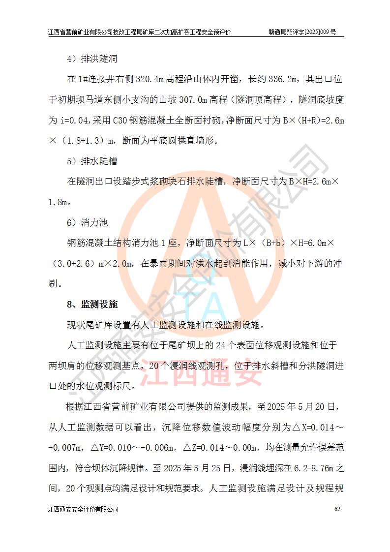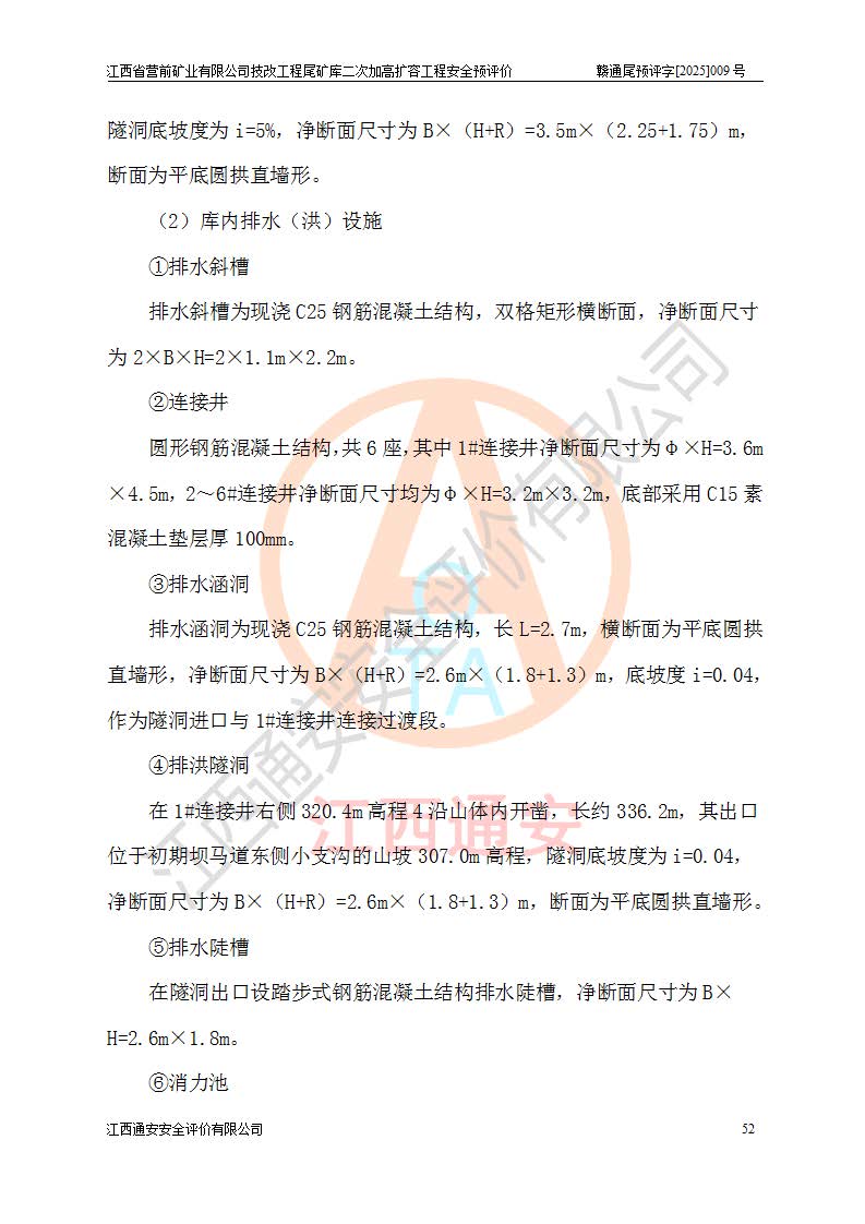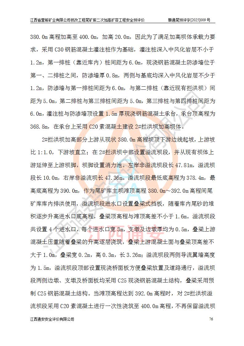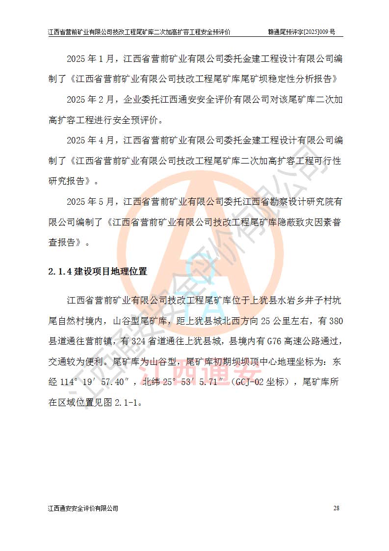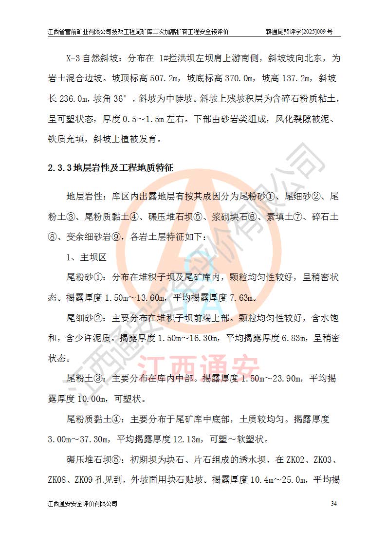 江西省營前礦業(yè)有限公司于2003年12月16日成立,位于贛州市上猶縣營前鎮(zhèn)焦里村境內(nèi),公司注冊資本10000萬元,法定**人陳雅博,礦區(qū)地理坐標(biāo):東經(jīng)114°18′30″~114°19′00″,北緯25°52′35″~25°53′47″。公司經(jīng)營范圍包括:鉛礦、鋅、鎢、銀地下開采、銷售。 江西省營前礦業(yè)有限公司技改工程尾礦庫位于焦里鎢銀鉛鋅礦區(qū),處于上猶縣水巖鄉(xiāng)井子村坑尾自然村境內(nèi),為山谷型尾礦庫。 江西省營前礦業(yè)有限公司技改工程尾礦庫于2013年由福建省冶金工業(yè)設(shè)計院設(shè)計,2014年8月開始施工建設(shè),2015年4月竣工開始試運(yùn)行,2015年11月完成竣工驗收,2016年1月首次取得安全生產(chǎn)許可證,2019年1月完成延期換證,2020年8月委托金建工程設(shè)計有限公司進(jìn)行尾礦庫加高擴(kuò)容工作,2020年10月21日取得了江西省應(yīng)急管理廳下發(fā)的《關(guān)于江西省營前礦業(yè)有限公司技改工程尾礦庫加高擴(kuò)容工程安全設(shè)施設(shè)計的審查意見》(贛應(yīng)急非煤項目設(shè)審〔2020〕46號),之后委托駐馬店市黃淮建設(shè)工程有限公司負(fù)責(zé)施工,云南潤滇工程技術(shù)有限公司負(fù)責(zé)監(jiān)理,2021年12月完成加高擴(kuò)容竣工驗收工作,經(jīng)過延期,現(xiàn)尾礦庫安全生產(chǎn)許可證編號(贛)FM安許證字[2016]M1692號,**期為2025年01月18日至2028年01月17日。 江西省營前礦業(yè)有限公司技改工程尾礦庫為山谷型尾礦庫,初期壩為透水堆石壩,壩頂高程為330.0m,初期壩高25.0m,后期采用上游式尾礦堆積壩,加高擴(kuò)容后*終壩頂高程為380.0m,堆積壩高50.0m,總壩高為75.0m,總庫容為為503.14×104m3,尾礦庫為三等庫。尾礦庫初期壩以上總匯水面積3.53km2,防洪標(biāo)準(zhǔn)取500年一遇。 目前尾礦庫由初期壩、堆積壩、庫內(nèi)排洪系統(tǒng)(雙格排水斜槽+連接井+排水涵洞+排洪隧洞+排水陡槽+消力池)、1#攔洪壩、1#分洪隧洞、2#攔洪壩、2#分洪隧洞和安全監(jiān)測設(shè)施組成。根據(jù)建設(shè)單位提供的尾礦庫平面布置圖,截至2024年12月,現(xiàn)狀尾礦庫堆積壩頂高程為372.2m,現(xiàn)狀總壩高67.2m,灘頂高程為369.8m,現(xiàn)狀全庫容387.51×104m3,現(xiàn)狀尾礦庫為三等庫,原加高擴(kuò)容設(shè)計*終堆積壩頂高程為380.0m,現(xiàn)剩余庫容115.63×104m3,剩余**庫容約92.5×104m3,剩余服務(wù)年限約4.5年;礦山現(xiàn)有儲量較大,剩余庫容及服務(wù)年限不滿足礦山后期生產(chǎn)需要。 技改工程尾礦庫尾礦壩下游1**范圍無居民,不存在工礦企業(yè)等建構(gòu)筑物,不屬于“頭頂庫”;尾礦庫不壓礦;距贛江直線距離60**;不涉及保護(hù)區(qū)及生態(tài)紅線;尾礦庫所在溝谷較長,谷底平均縱坡9%,上游周邊山體地形有利于尾礦庫二次加高擴(kuò)容工程的實施,因此為了增加尾礦庫庫容,延長服務(wù)年限,充分利用尾礦庫所在溝谷地形,江西省營前礦業(yè)有限公司對技改尾礦庫進(jìn)行二次加高擴(kuò)容。 2024年12月,江西省營前礦業(yè)有限公司委托地礦贛西地質(zhì)工程勘察院編制了《江西省營前礦業(yè)有限公司技改工程尾礦庫二次擴(kuò)容工程(水文)地質(zhì)勘察報告》,2025年4月,江西省營前礦業(yè)有限公司委托金建工程設(shè)計有限公司編制了《江西省營前礦業(yè)有限公司技改工程尾礦庫二次加高擴(kuò)容工程可行性研究報告》。 按照非煤礦山建設(shè)項目安全設(shè)施“三同時”的規(guī)定要求,技改工程尾礦庫為二次加高擴(kuò)容工程,**進(jìn)行安全預(yù)評價;江西省營前礦業(yè)有限公司委托我公司承擔(dān)技改工程尾礦庫二次加高擴(kuò)容工程建設(shè)項目的安全預(yù)評價工作。 |