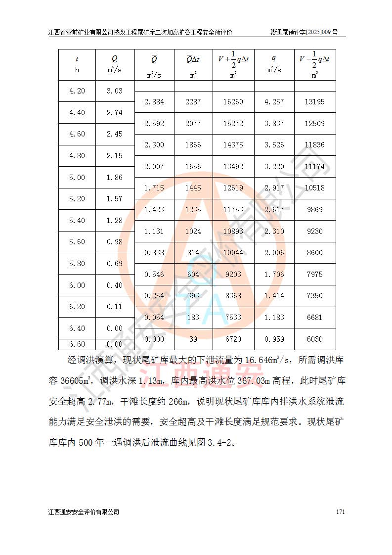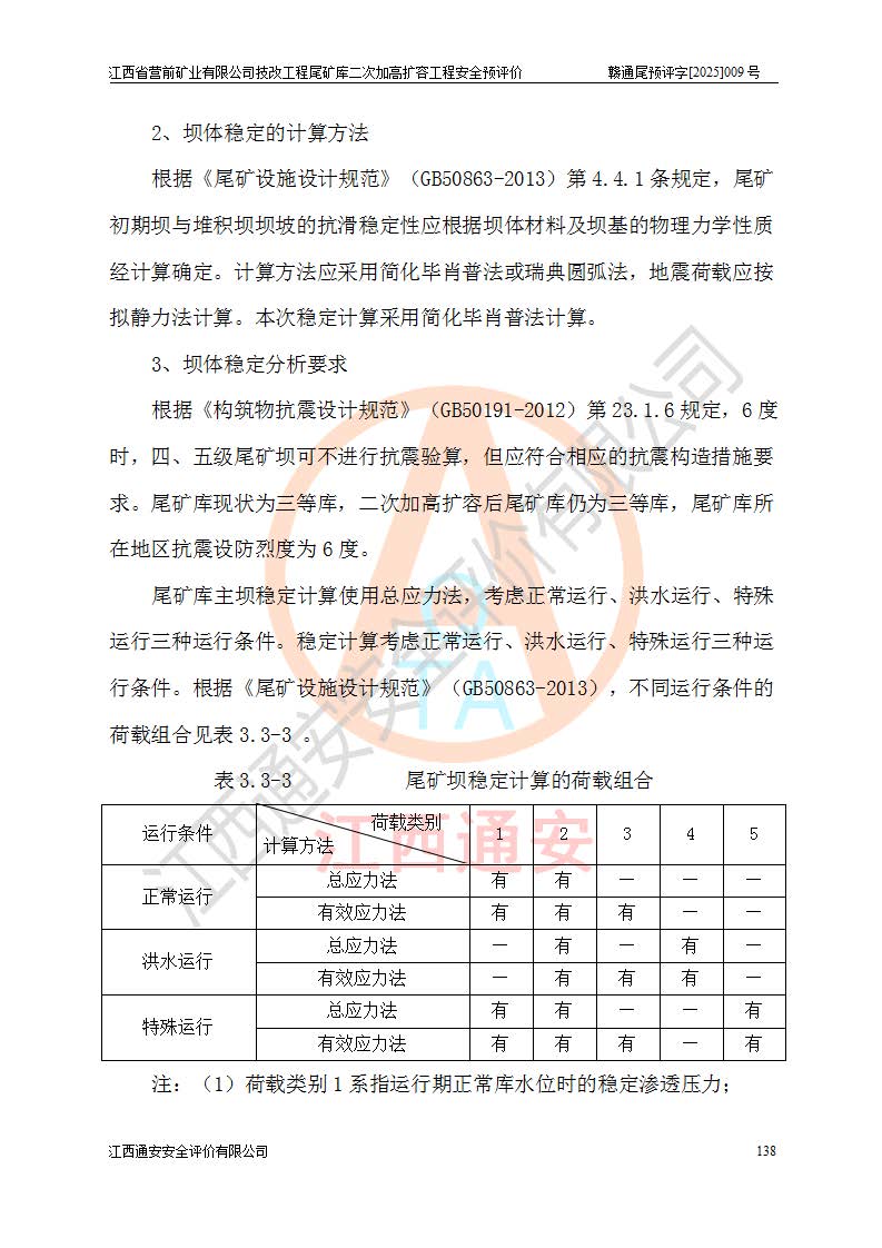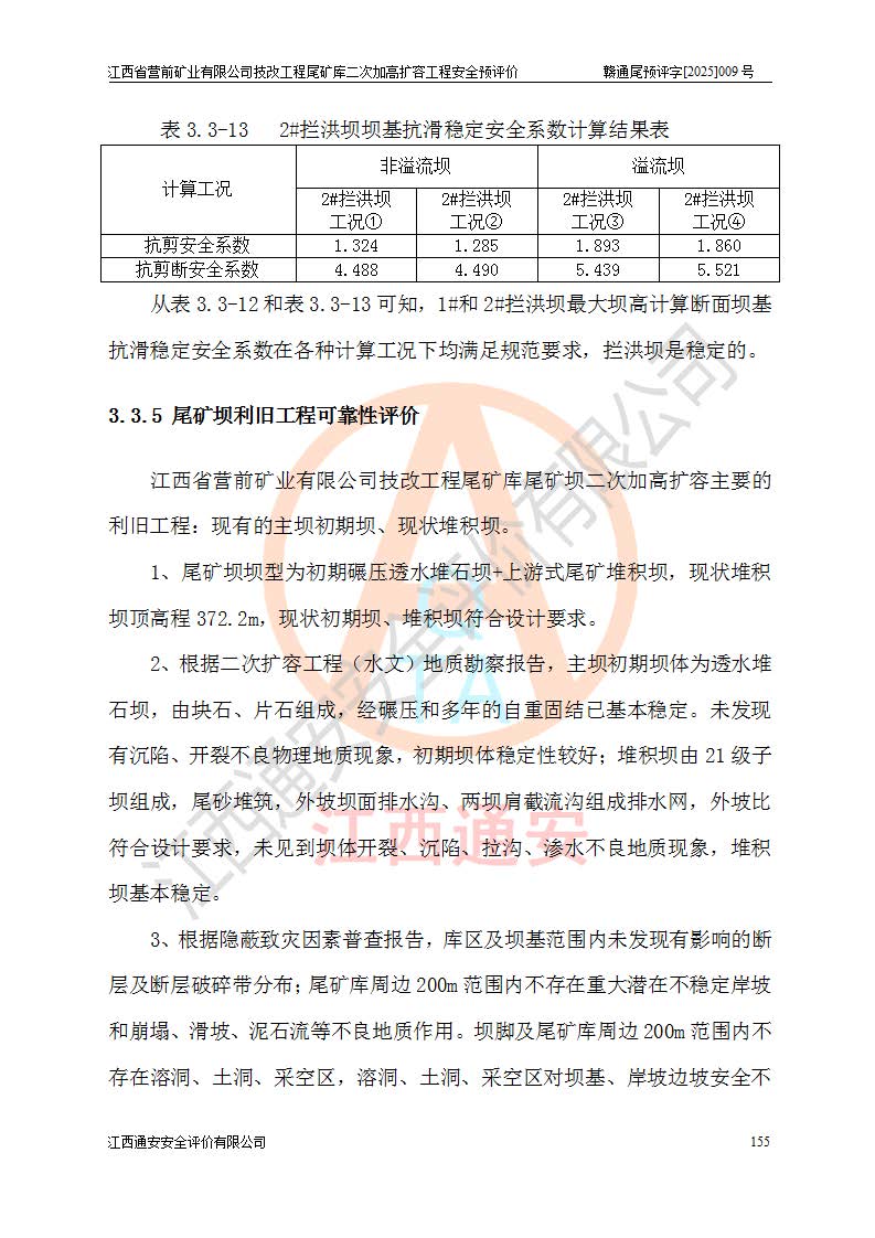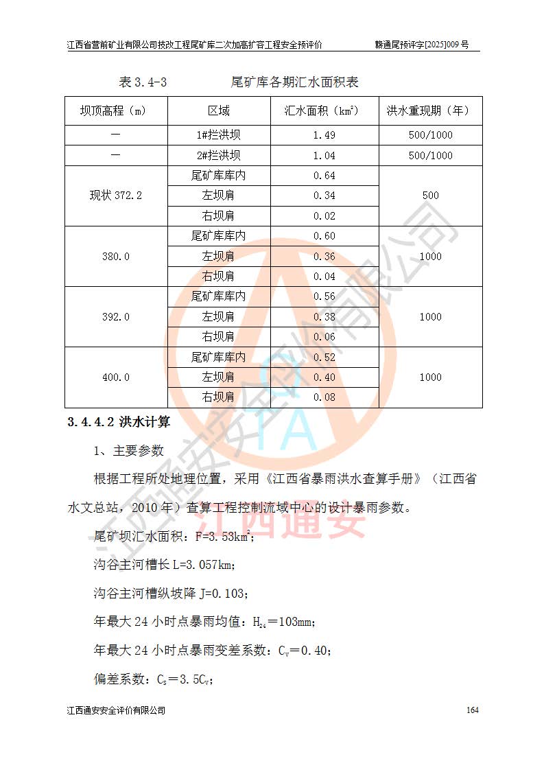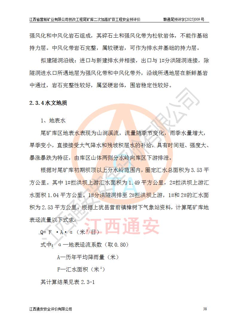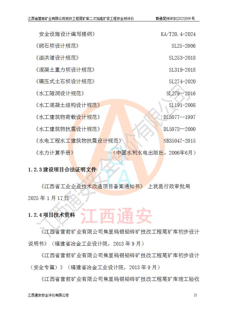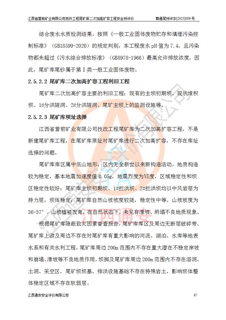 江西省營前礦業(yè)有限公司于2003年12月16日成立,位于贛州市上猶縣營前鎮(zhèn)焦里村境內(nèi),公司注冊資本10000萬元,法定**人陳雅博,礦區(qū)地理坐標(biāo):東經(jīng)114°18′30″~114°19′00″,北緯25°52′35″~25°53′47″。公司經(jīng)營范圍包括:鉛礦、鋅、鎢、銀地下開采、銷售。 江西省營前礦業(yè)有限公司技改工程尾礦庫位于焦里鎢銀鉛鋅礦區(qū),處于上猶縣水巖鄉(xiāng)井子村坑尾自然村境內(nèi),為山谷型尾礦庫。 江西省營前礦業(yè)有限公司技改工程尾礦庫于2013年由福建省冶金工業(yè)設(shè)計院設(shè)計,2014年8月開始施工建設(shè),2015年4月竣工開始試運(yùn)行,2015年11月完成竣工驗收,2016年1月首次取得安全生產(chǎn)許可證,2019年1月完成延期換證,2020年8月委托金建工程設(shè)計有限公司進(jìn)行尾礦庫加高擴(kuò)容工作,2020年10月21日取得了江西省應(yīng)急管理廳下發(fā)的《關(guān)于江西省營前礦業(yè)有限公司技改工程尾礦庫加高擴(kuò)容工程安全設(shè)施設(shè)計的審查意見》(贛應(yīng)急非煤項目設(shè)審〔2020〕46號),之后委托駐馬店市黃淮建設(shè)工程有限公司負(fù)責(zé)施工,云南潤滇工程技術(shù)有限公司負(fù)責(zé)監(jiān)理,2021年12月完成加高擴(kuò)容竣工驗收工作,經(jīng)過延期,現(xiàn)尾礦庫安全生產(chǎn)許可證編號(贛)FM安許證字[2016]M1692號,**期為2025年01月18日至2028年01月17日。 江西省營前礦業(yè)有限公司技改工程尾礦庫為山谷型尾礦庫,初期壩為透水堆石壩,壩頂高程為330.0m,初期壩高25.0m,后期采用上游式尾礦堆積壩,加高擴(kuò)容后*終壩頂高程為380.0m,堆積壩高50.0m,總壩高為75.0m,總庫容為為503.14×104m3,尾礦庫為三等庫。尾礦庫初期壩以上總匯水面積3.53km2,防洪標(biāo)準(zhǔn)取500年一遇。 目前尾礦庫由初期壩、堆積壩、庫內(nèi)排洪系統(tǒng)(雙格排水斜槽+連接井+排水涵洞+排洪隧洞+排水陡槽+消力池)、1#攔洪壩、1#分洪隧洞、2#攔洪壩、2#分洪隧洞和安全監(jiān)測設(shè)施組成。根據(jù)建設(shè)單位提供的尾礦庫平面布置圖,截至2024年12月,現(xiàn)狀尾礦庫堆積壩頂高程為372.2m,現(xiàn)狀總壩高67.2m,灘頂高程為369.8m,現(xiàn)狀全庫容387.51×104m3,現(xiàn)狀尾礦庫為三等庫,原加高擴(kuò)容設(shè)計*終堆積壩頂高程為380.0m,現(xiàn)剩余庫容115.63×104m3,剩余**庫容約92.5×104m3,剩余服務(wù)年限約4.5年;礦山現(xiàn)有儲量較大,剩余庫容及服務(wù)年限不滿足礦山后期生產(chǎn)需要。 技改工程尾礦庫尾礦壩下游1**范圍無居民,不存在工礦企業(yè)等建構(gòu)筑物,不屬于“頭頂庫”;尾礦庫不壓礦;距贛江直線距離60**;不涉及保護(hù)區(qū)及生態(tài)紅線;尾礦庫所在溝谷較長,谷底平均縱坡9%,上游周邊山體地形有利于尾礦庫二次加高擴(kuò)容工程的實施,因此為了增加尾礦庫庫容,延長服務(wù)年限,充分利用尾礦庫所在溝谷地形,江西省營前礦業(yè)有限公司對技改尾礦庫進(jìn)行二次加高擴(kuò)容。 2024年12月,江西省營前礦業(yè)有限公司委托地礦贛西地質(zhì)工程勘察院編制了《江西省營前礦業(yè)有限公司技改工程尾礦庫二次擴(kuò)容工程(水文)地質(zhì)勘察報告》,2025年4月,江西省營前礦業(yè)有限公司委托金建工程設(shè)計有限公司編制了《江西省營前礦業(yè)有限公司技改工程尾礦庫二次加高擴(kuò)容工程可行性研究報告》。 按照非煤礦山建設(shè)項目安全設(shè)施“三同時”的規(guī)定要求,技改工程尾礦庫為二次加高擴(kuò)容工程,**進(jìn)行安全預(yù)評價;江西省營前礦業(yè)有限公司委托我公司承擔(dān)技改工程尾礦庫二次加高擴(kuò)容工程建設(shè)項目的安全預(yù)評價工作。 |