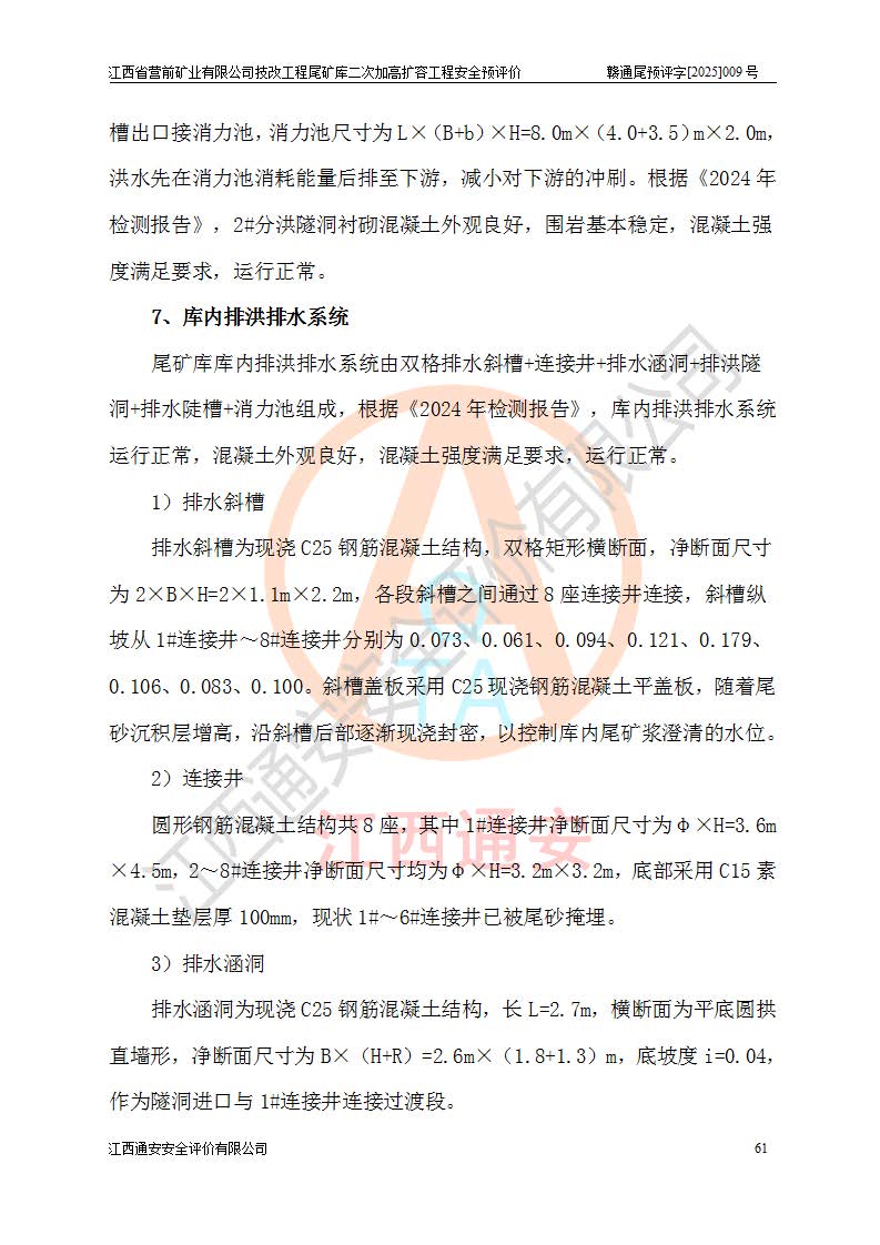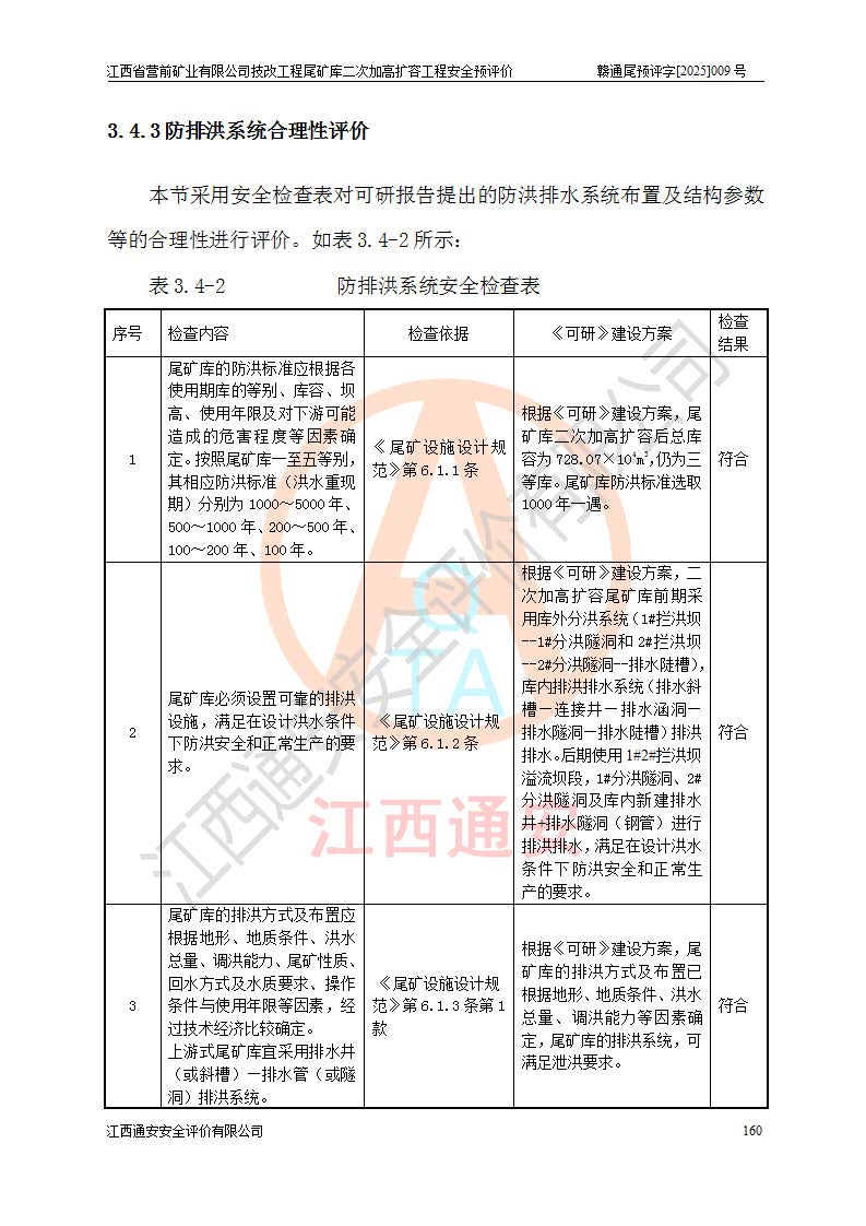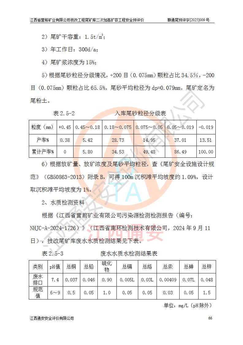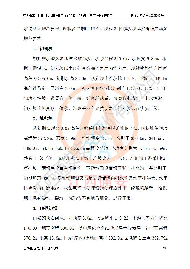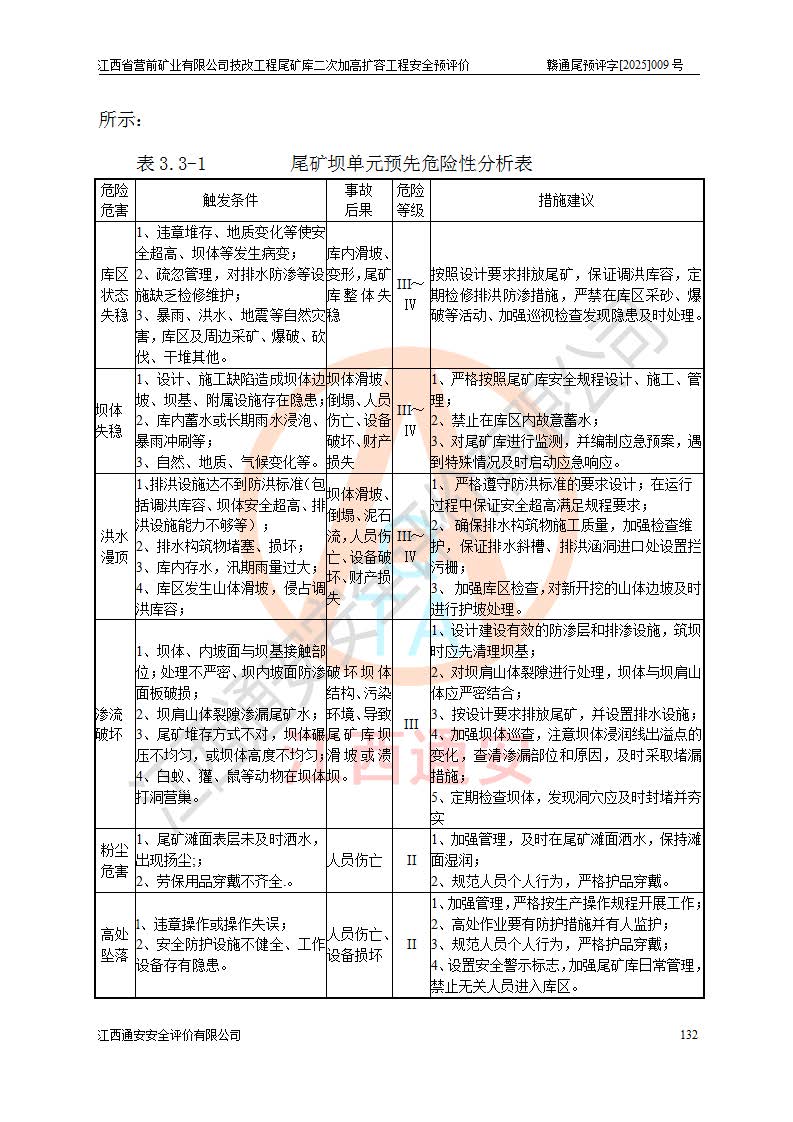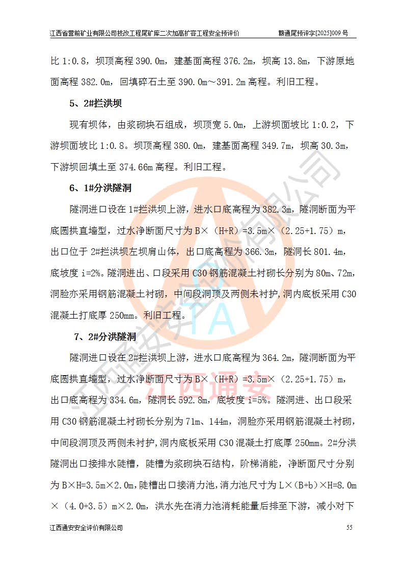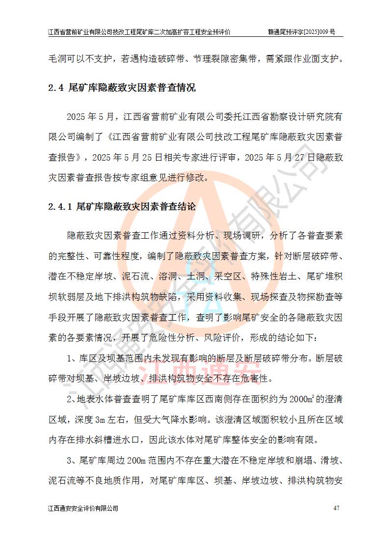 江西省營前礦業(yè)有限公司于2003年12月16日成立,位于贛州市上猶縣營前鎮(zhèn)焦里村境內(nèi),公司注冊資本10000萬元,法定**人陳雅博,礦區(qū)地理坐標(biāo):東經(jīng)114°18′30″~114°19′00″,北緯25°52′35″~25°53′47″。公司經(jīng)營范圍包括:鉛礦、鋅、鎢、銀地下開采、銷售。 江西省營前礦業(yè)有限公司技改工程尾礦庫位于焦里鎢銀鉛鋅礦區(qū),處于上猶縣水巖鄉(xiāng)井子村坑尾自然村境內(nèi),為山谷型尾礦庫。 江西省營前礦業(yè)有限公司技改工程尾礦庫于2013年由福建省冶金工業(yè)設(shè)計院設(shè)計,2014年8月開始施工建設(shè),2015年4月竣工開始試運(yùn)行,2015年11月完成竣工驗收,2016年1月首次取得安全生產(chǎn)許可證,2019年1月完成延期換證,2020年8月委托金建工程設(shè)計有限公司進(jìn)行尾礦庫加高擴(kuò)容工作,2020年10月21日取得了江西省應(yīng)急管理廳下發(fā)的《關(guān)于江西省營前礦業(yè)有限公司技改工程尾礦庫加高擴(kuò)容工程安全設(shè)施設(shè)計的審查意見》(贛應(yīng)急非煤項目設(shè)審〔2020〕46號),之后委托駐馬店市黃淮建設(shè)工程有限公司負(fù)責(zé)施工,云南潤滇工程技術(shù)有限公司負(fù)責(zé)監(jiān)理,2021年12月完成加高擴(kuò)容竣工驗收工作,經(jīng)過延期,現(xiàn)尾礦庫安全生產(chǎn)許可證編號(贛)FM安許證字[2016]M1692號,**期為2025年01月18日至2028年01月17日。 江西省營前礦業(yè)有限公司技改工程尾礦庫為山谷型尾礦庫,初期壩為透水堆石壩,壩頂高程為330.0m,初期壩高25.0m,后期采用上游式尾礦堆積壩,加高擴(kuò)容后*終壩頂高程為380.0m,堆積壩高50.0m,總壩高為75.0m,總庫容為為503.14×104m3,尾礦庫為三等庫。尾礦庫初期壩以上總匯水面積3.53km2,防洪標(biāo)準(zhǔn)取500年一遇。 目前尾礦庫由初期壩、堆積壩、庫內(nèi)排洪系統(tǒng)(雙格排水斜槽+連接井+排水涵洞+排洪隧洞+排水陡槽+消力池)、1#攔洪壩、1#分洪隧洞、2#攔洪壩、2#分洪隧洞和安全監(jiān)測設(shè)施組成。根據(jù)建設(shè)單位提供的尾礦庫平面布置圖,截至2024年12月,現(xiàn)狀尾礦庫堆積壩頂高程為372.2m,現(xiàn)狀總壩高67.2m,灘頂高程為369.8m,現(xiàn)狀全庫容387.51×104m3,現(xiàn)狀尾礦庫為三等庫,原加高擴(kuò)容設(shè)計*終堆積壩頂高程為380.0m,現(xiàn)剩余庫容115.63×104m3,剩余**庫容約92.5×104m3,剩余服務(wù)年限約4.5年;礦山現(xiàn)有儲量較大,剩余庫容及服務(wù)年限不滿足礦山后期生產(chǎn)需要。 技改工程尾礦庫尾礦壩下游1**范圍無居民,不存在工礦企業(yè)等建構(gòu)筑物,不屬于“頭頂庫”;尾礦庫不壓礦;距贛江直線距離60**;不涉及保護(hù)區(qū)及生態(tài)紅線;尾礦庫所在溝谷較長,谷底平均縱坡9%,上游周邊山體地形有利于尾礦庫二次加高擴(kuò)容工程的實施,因此為了增加尾礦庫庫容,延長服務(wù)年限,充分利用尾礦庫所在溝谷地形,江西省營前礦業(yè)有限公司對技改尾礦庫進(jìn)行二次加高擴(kuò)容。 2024年12月,江西省營前礦業(yè)有限公司委托地礦贛西地質(zhì)工程勘察院編制了《江西省營前礦業(yè)有限公司技改工程尾礦庫二次擴(kuò)容工程(水文)地質(zhì)勘察報告》,2025年4月,江西省營前礦業(yè)有限公司委托金建工程設(shè)計有限公司編制了《江西省營前礦業(yè)有限公司技改工程尾礦庫二次加高擴(kuò)容工程可行性研究報告》。 按照非煤礦山建設(shè)項目安全設(shè)施“三同時”的規(guī)定要求,技改工程尾礦庫為二次加高擴(kuò)容工程,**進(jìn)行安全預(yù)評價;江西省營前礦業(yè)有限公司委托我公司承擔(dān)技改工程尾礦庫二次加高擴(kuò)容工程建設(shè)項目的安全預(yù)評價工作。 |