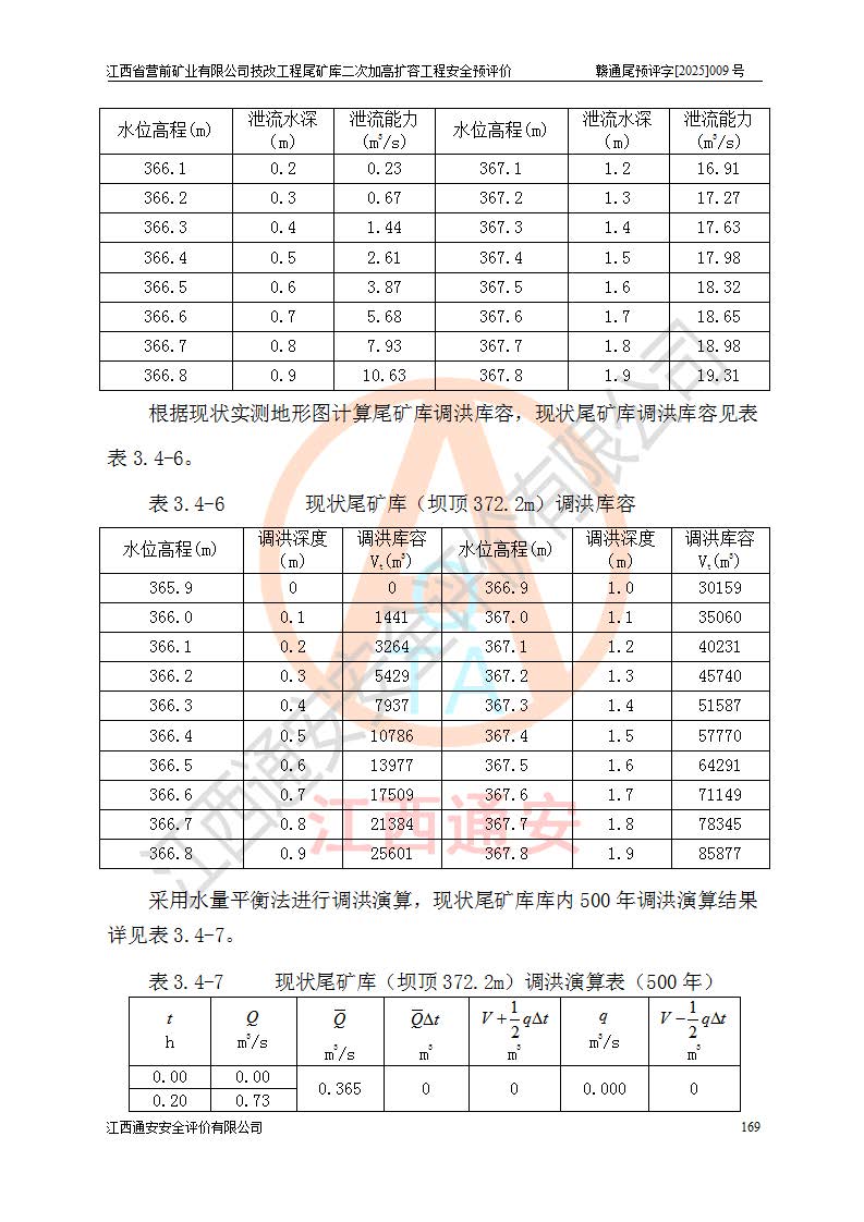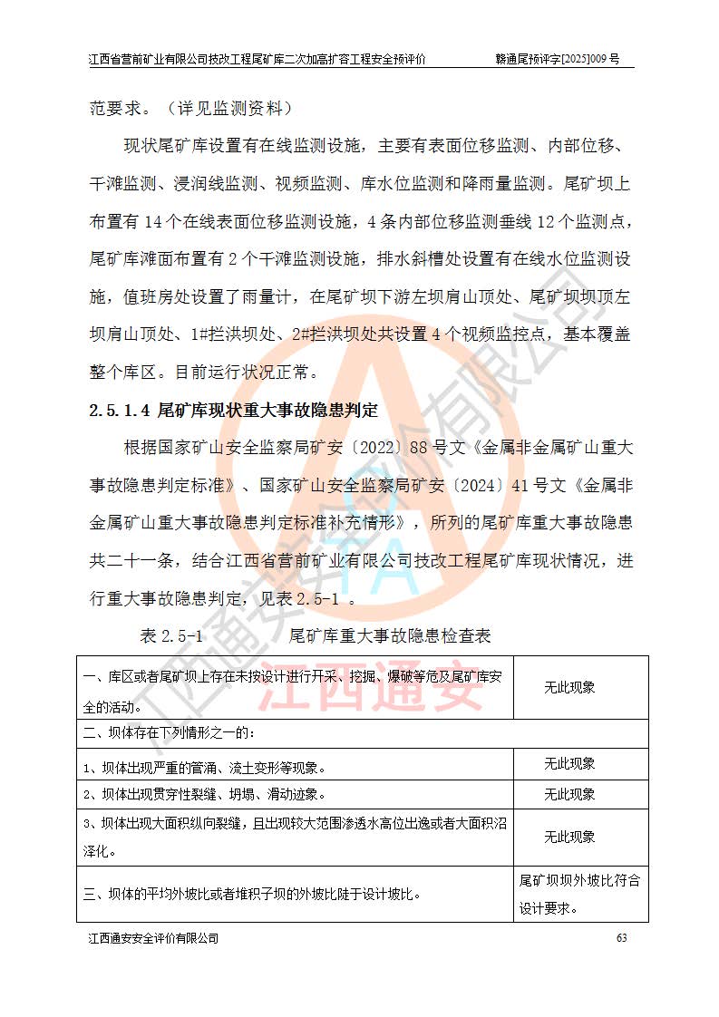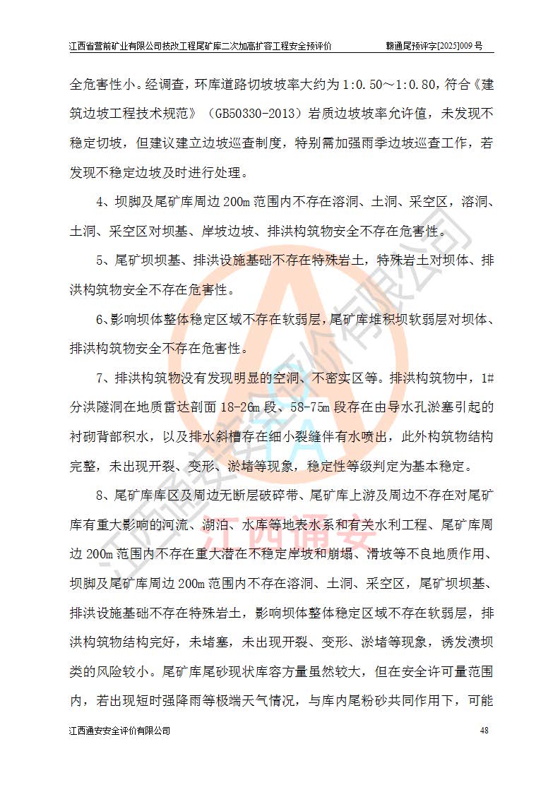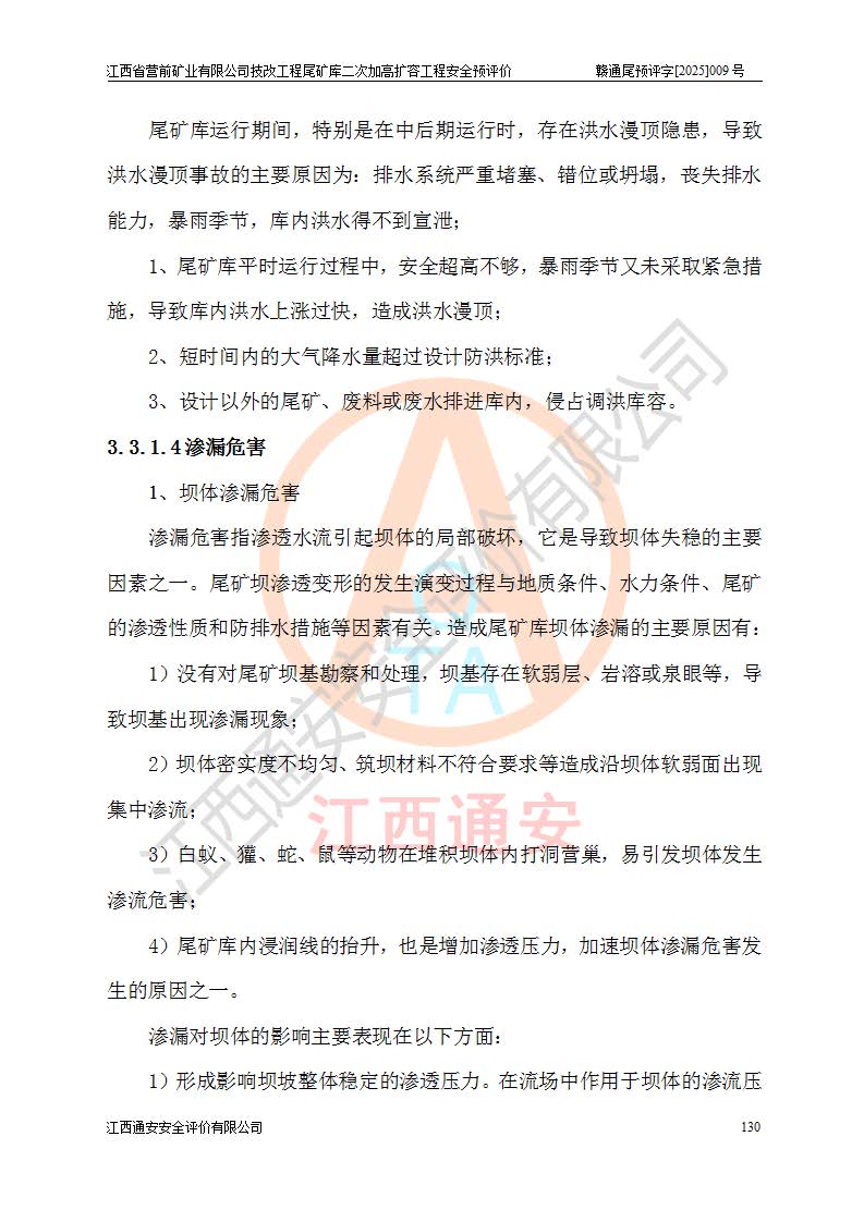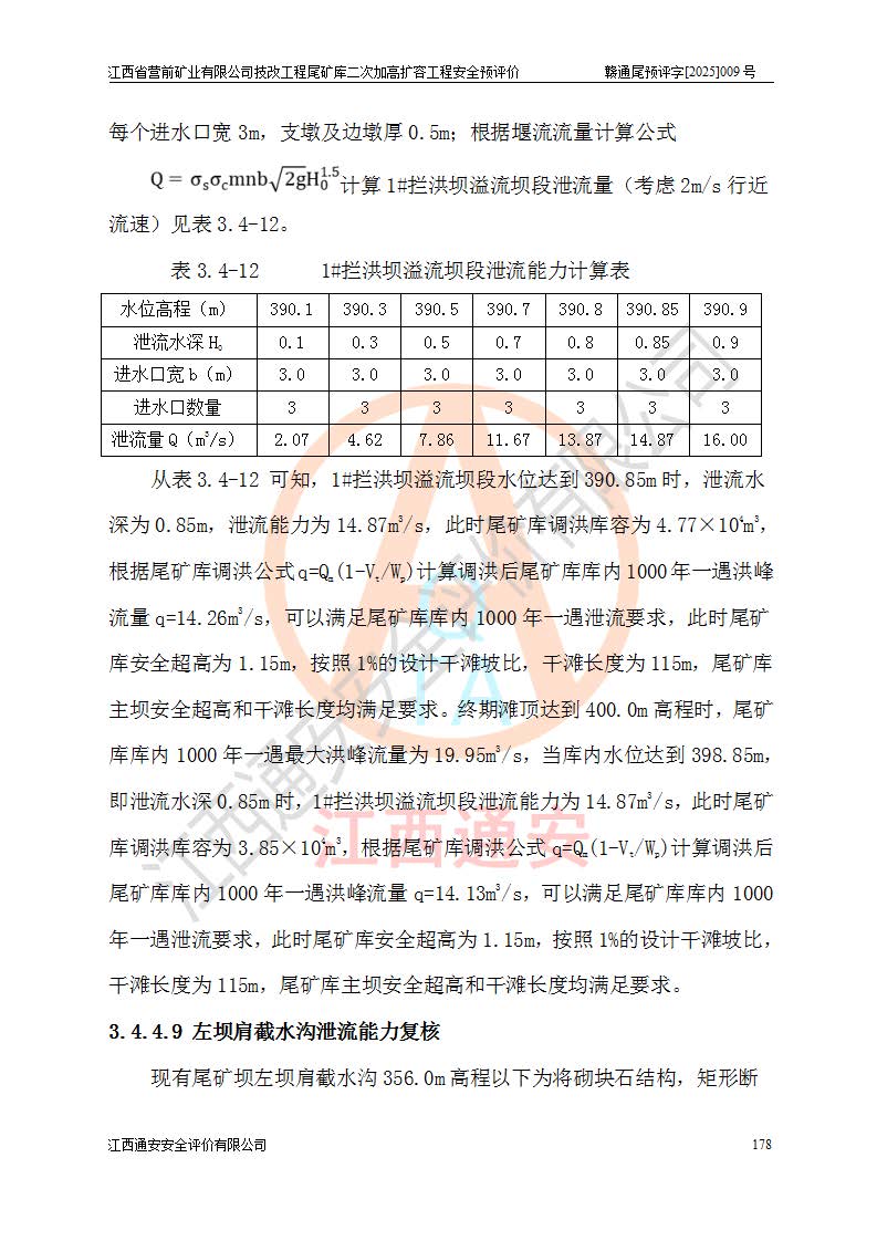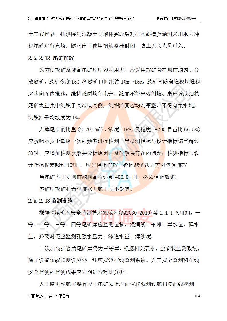 江西省營前礦業(yè)有限公司于2003年12月16日成立,位于贛州市上猶縣營前鎮(zhèn)焦里村境內(nèi),公司注冊資本10000萬元,法定**人陳雅博,礦區(qū)地理坐標(biāo):東經(jīng)114°18′30″~114°19′00″,北緯25°52′35″~25°53′47″。公司經(jīng)營范圍包括:鉛礦、鋅、鎢、銀地下開采、銷售。 江西省營前礦業(yè)有限公司技改工程尾礦庫位于焦里鎢銀鉛鋅礦區(qū),處于上猶縣水巖鄉(xiāng)井子村坑尾自然村境內(nèi),為山谷型尾礦庫。 江西省營前礦業(yè)有限公司技改工程尾礦庫于2013年由福建省冶金工業(yè)設(shè)計院設(shè)計,2014年8月開始施工建設(shè),2015年4月竣工開始試運(yùn)行,2015年11月完成竣工驗收,2016年1月首次取得安全生產(chǎn)許可證,2019年1月完成延期換證,2020年8月委托金建工程設(shè)計有限公司進(jìn)行尾礦庫加高擴(kuò)容工作,2020年10月21日取得了江西省應(yīng)急管理廳下發(fā)的《關(guān)于江西省營前礦業(yè)有限公司技改工程尾礦庫加高擴(kuò)容工程安全設(shè)施設(shè)計的審查意見》(贛應(yīng)急非煤項目設(shè)審〔2020〕46號),之后委托駐馬店市黃淮建設(shè)工程有限公司負(fù)責(zé)施工,云南潤滇工程技術(shù)有限公司負(fù)責(zé)監(jiān)理,2021年12月完成加高擴(kuò)容竣工驗收工作,經(jīng)過延期,現(xiàn)尾礦庫安全生產(chǎn)許可證編號(贛)FM安許證字[2016]M1692號,**期為2025年01月18日至2028年01月17日。 江西省營前礦業(yè)有限公司技改工程尾礦庫為山谷型尾礦庫,初期壩為透水堆石壩,壩頂高程為330.0m,初期壩高25.0m,后期采用上游式尾礦堆積壩,加高擴(kuò)容后*終壩頂高程為380.0m,堆積壩高50.0m,總壩高為75.0m,總庫容為為503.14×104m3,尾礦庫為三等庫。尾礦庫初期壩以上總匯水面積3.53km2,防洪標(biāo)準(zhǔn)取500年一遇。 目前尾礦庫由初期壩、堆積壩、庫內(nèi)排洪系統(tǒng)(雙格排水斜槽+連接井+排水涵洞+排洪隧洞+排水陡槽+消力池)、1#攔洪壩、1#分洪隧洞、2#攔洪壩、2#分洪隧洞和安全監(jiān)測設(shè)施組成。根據(jù)建設(shè)單位提供的尾礦庫平面布置圖,截至2024年12月,現(xiàn)狀尾礦庫堆積壩頂高程為372.2m,現(xiàn)狀總壩高67.2m,灘頂高程為369.8m,現(xiàn)狀全庫容387.51×104m3,現(xiàn)狀尾礦庫為三等庫,原加高擴(kuò)容設(shè)計*終堆積壩頂高程為380.0m,現(xiàn)剩余庫容115.63×104m3,剩余**庫容約92.5×104m3,剩余服務(wù)年限約4.5年;礦山現(xiàn)有儲量較大,剩余庫容及服務(wù)年限不滿足礦山后期生產(chǎn)需要。 技改工程尾礦庫尾礦壩下游1**范圍無居民,不存在工礦企業(yè)等建構(gòu)筑物,不屬于“頭頂庫”;尾礦庫不壓礦;距贛江直線距離60**;不涉及保護(hù)區(qū)及生態(tài)紅線;尾礦庫所在溝谷較長,谷底平均縱坡9%,上游周邊山體地形有利于尾礦庫二次加高擴(kuò)容工程的實施,因此為了增加尾礦庫庫容,延長服務(wù)年限,充分利用尾礦庫所在溝谷地形,江西省營前礦業(yè)有限公司對技改尾礦庫進(jìn)行二次加高擴(kuò)容。 2024年12月,江西省營前礦業(yè)有限公司委托地礦贛西地質(zhì)工程勘察院編制了《江西省營前礦業(yè)有限公司技改工程尾礦庫二次擴(kuò)容工程(水文)地質(zhì)勘察報告》,2025年4月,江西省營前礦業(yè)有限公司委托金建工程設(shè)計有限公司編制了《江西省營前礦業(yè)有限公司技改工程尾礦庫二次加高擴(kuò)容工程可行性研究報告》。 按照非煤礦山建設(shè)項目安全設(shè)施“三同時”的規(guī)定要求,技改工程尾礦庫為二次加高擴(kuò)容工程,**進(jìn)行安全預(yù)評價;江西省營前礦業(yè)有限公司委托我公司承擔(dān)技改工程尾礦庫二次加高擴(kuò)容工程建設(shè)項目的安全預(yù)評價工作。 |