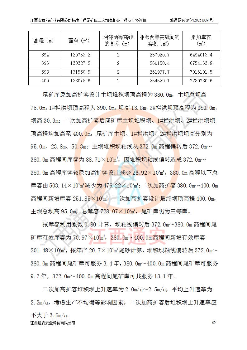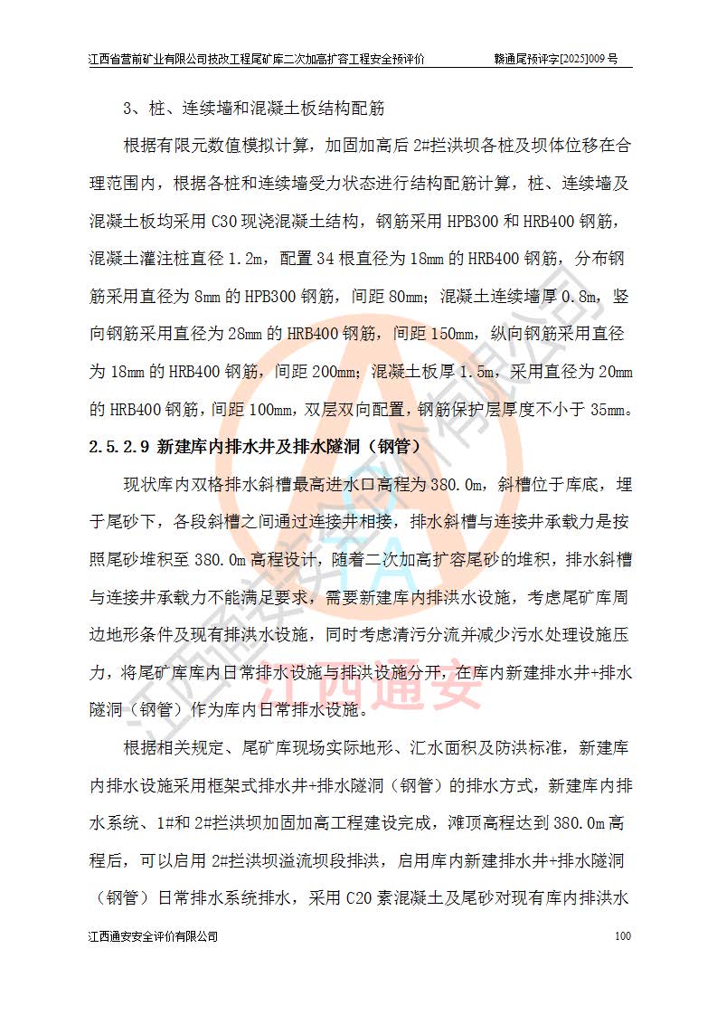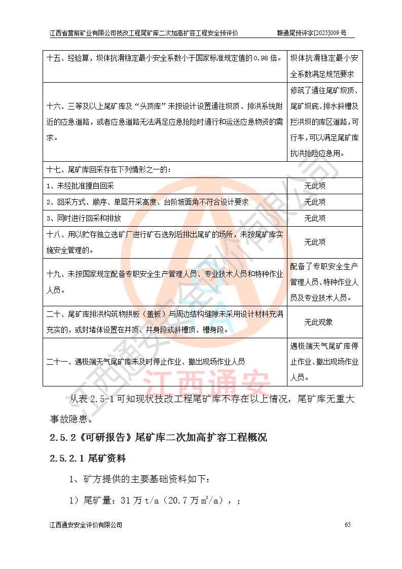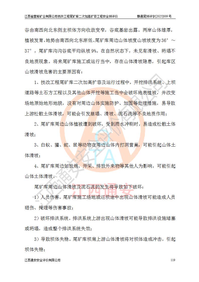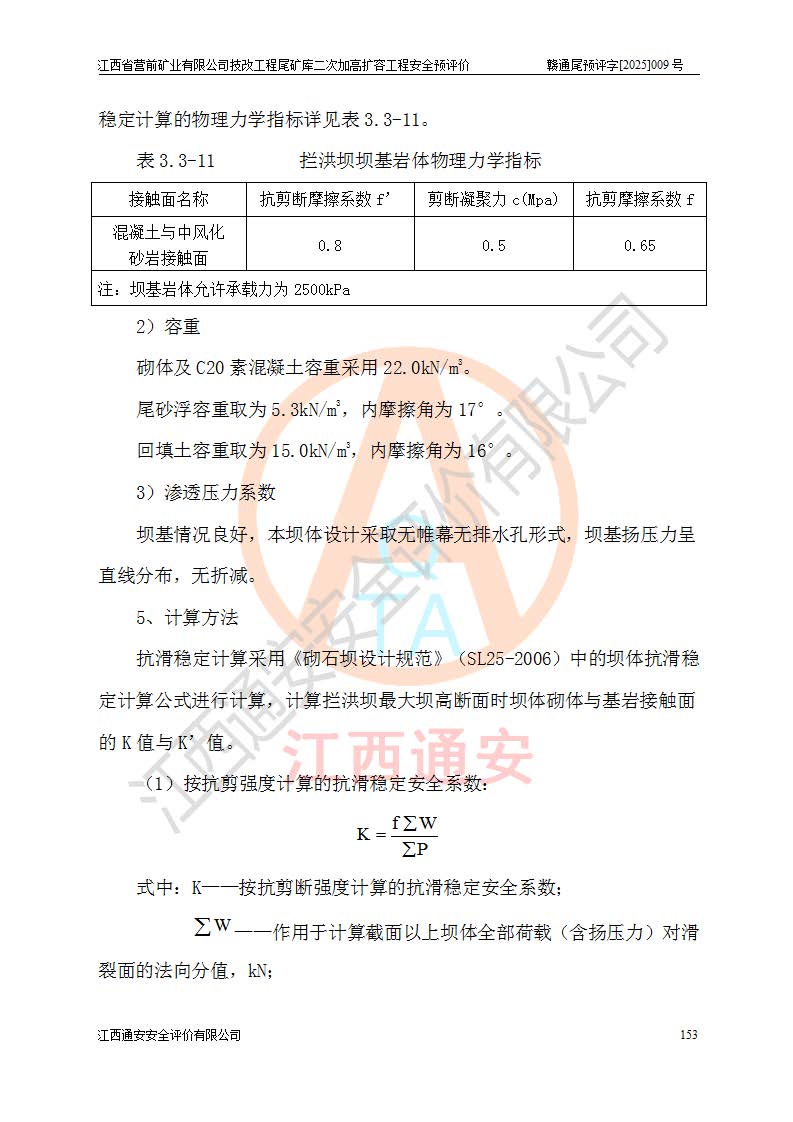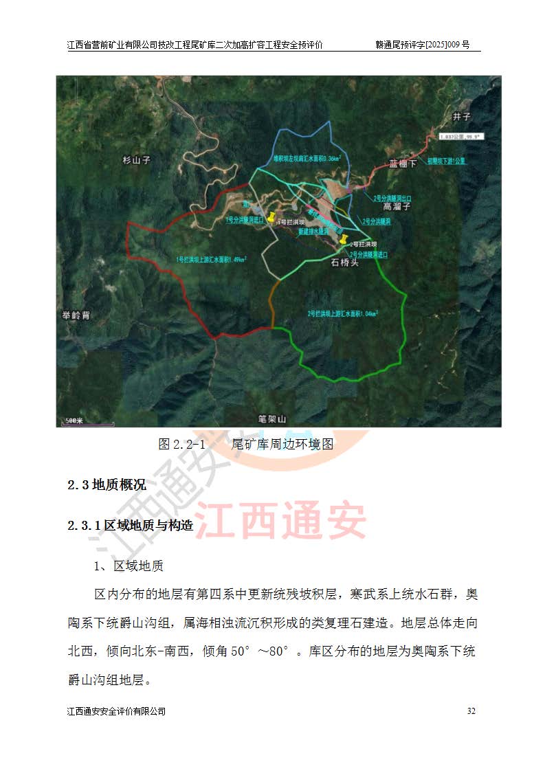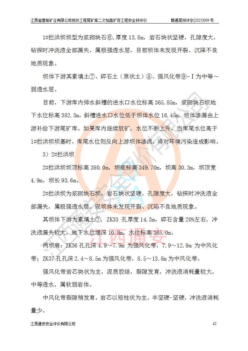 江西省營前礦業(yè)有限公司于2003年12月16日成立,位于贛州市上猶縣營前鎮(zhèn)焦里村境內(nèi),公司注冊資本10000萬元,法定**人陳雅博,礦區(qū)地理坐標(biāo):東經(jīng)114°18′30″~114°19′00″,北緯25°52′35″~25°53′47″。公司經(jīng)營范圍包括:鉛礦、鋅、鎢、銀地下開采、銷售。 江西省營前礦業(yè)有限公司技改工程尾礦庫位于焦里鎢銀鉛鋅礦區(qū),處于上猶縣水巖鄉(xiāng)井子村坑尾自然村境內(nèi),為山谷型尾礦庫。 江西省營前礦業(yè)有限公司技改工程尾礦庫于2013年由福建省冶金工業(yè)設(shè)計院設(shè)計,2014年8月開始施工建設(shè),2015年4月竣工開始試運(yùn)行,2015年11月完成竣工驗收,2016年1月首次取得安全生產(chǎn)許可證,2019年1月完成延期換證,2020年8月委托金建工程設(shè)計有限公司進(jìn)行尾礦庫加高擴(kuò)容工作,2020年10月21日取得了江西省應(yīng)急管理廳下發(fā)的《關(guān)于江西省營前礦業(yè)有限公司技改工程尾礦庫加高擴(kuò)容工程安全設(shè)施設(shè)計的審查意見》(贛應(yīng)急非煤項目設(shè)審〔2020〕46號),之后委托駐馬店市黃淮建設(shè)工程有限公司負(fù)責(zé)施工,云南潤滇工程技術(shù)有限公司負(fù)責(zé)監(jiān)理,2021年12月完成加高擴(kuò)容竣工驗收工作,經(jīng)過延期,現(xiàn)尾礦庫安全生產(chǎn)許可證編號(贛)FM安許證字[2016]M1692號,**期為2025年01月18日至2028年01月17日。 江西省營前礦業(yè)有限公司技改工程尾礦庫為山谷型尾礦庫,初期壩為透水堆石壩,壩頂高程為330.0m,初期壩高25.0m,后期采用上游式尾礦堆積壩,加高擴(kuò)容后*終壩頂高程為380.0m,堆積壩高50.0m,總壩高為75.0m,總庫容為為503.14×104m3,尾礦庫為三等庫。尾礦庫初期壩以上總匯水面積3.53km2,防洪標(biāo)準(zhǔn)取500年一遇。 目前尾礦庫由初期壩、堆積壩、庫內(nèi)排洪系統(tǒng)(雙格排水斜槽+連接井+排水涵洞+排洪隧洞+排水陡槽+消力池)、1#攔洪壩、1#分洪隧洞、2#攔洪壩、2#分洪隧洞和安全監(jiān)測設(shè)施組成。根據(jù)建設(shè)單位提供的尾礦庫平面布置圖,截至2024年12月,現(xiàn)狀尾礦庫堆積壩頂高程為372.2m,現(xiàn)狀總壩高67.2m,灘頂高程為369.8m,現(xiàn)狀全庫容387.51×104m3,現(xiàn)狀尾礦庫為三等庫,原加高擴(kuò)容設(shè)計*終堆積壩頂高程為380.0m,現(xiàn)剩余庫容115.63×104m3,剩余**庫容約92.5×104m3,剩余服務(wù)年限約4.5年;礦山現(xiàn)有儲量較大,剩余庫容及服務(wù)年限不滿足礦山后期生產(chǎn)需要。 技改工程尾礦庫尾礦壩下游1**范圍無居民,不存在工礦企業(yè)等建構(gòu)筑物,不屬于“頭頂庫”;尾礦庫不壓礦;距贛江直線距離60**;不涉及保護(hù)區(qū)及生態(tài)紅線;尾礦庫所在溝谷較長,谷底平均縱坡9%,上游周邊山體地形有利于尾礦庫二次加高擴(kuò)容工程的實施,因此為了增加尾礦庫庫容,延長服務(wù)年限,充分利用尾礦庫所在溝谷地形,江西省營前礦業(yè)有限公司對技改尾礦庫進(jìn)行二次加高擴(kuò)容。 2024年12月,江西省營前礦業(yè)有限公司委托地礦贛西地質(zhì)工程勘察院編制了《江西省營前礦業(yè)有限公司技改工程尾礦庫二次擴(kuò)容工程(水文)地質(zhì)勘察報告》,2025年4月,江西省營前礦業(yè)有限公司委托金建工程設(shè)計有限公司編制了《江西省營前礦業(yè)有限公司技改工程尾礦庫二次加高擴(kuò)容工程可行性研究報告》。 按照非煤礦山建設(shè)項目安全設(shè)施“三同時”的規(guī)定要求,技改工程尾礦庫為二次加高擴(kuò)容工程,**進(jìn)行安全預(yù)評價;江西省營前礦業(yè)有限公司委托我公司承擔(dān)技改工程尾礦庫二次加高擴(kuò)容工程建設(shè)項目的安全預(yù)評價工作。 |