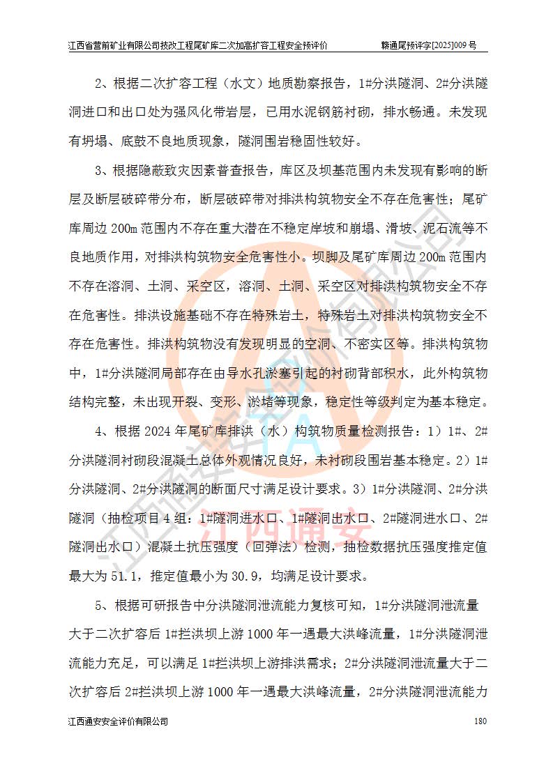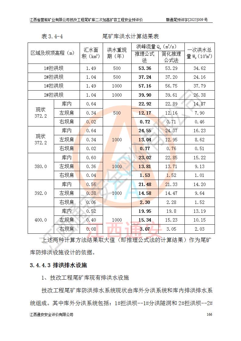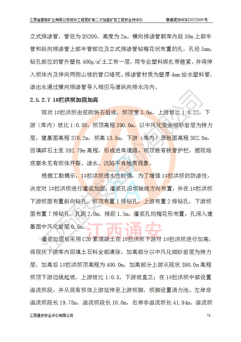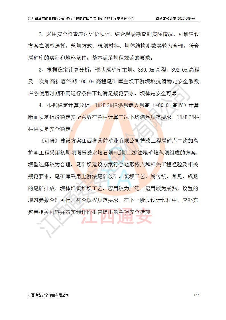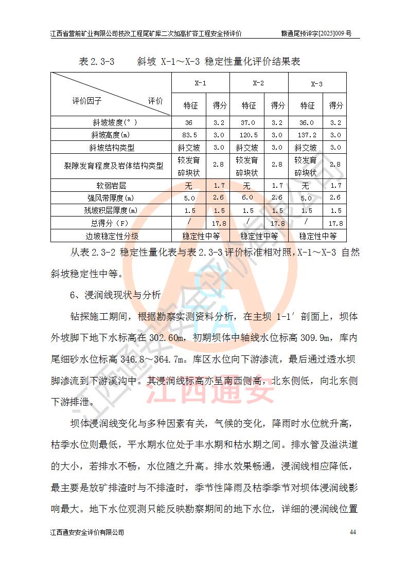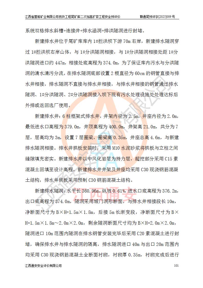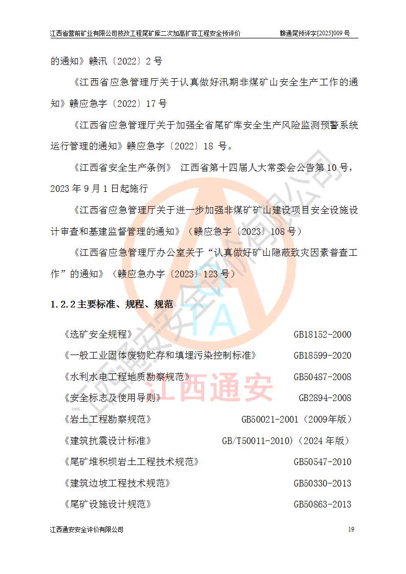江西省營前礦業(yè)有限公司于2003年12月16日成立,位于贛州市上猶縣營前鎮(zhèn)焦里村境內(nèi),公司注冊資本10000萬元,法定**人陳雅博,礦區(qū)地理坐標(biāo):東經(jīng)114°18′30″~114°19′00″,北緯25°52′35″~25°53′47″。公司經(jīng)營范圍包括:鉛礦、鋅、鎢、銀地下開采、銷售。 江西省營前礦業(yè)有限公司技改工程尾礦庫位于焦里鎢銀鉛鋅礦區(qū),處于上猶縣水巖鄉(xiāng)井子村坑尾自然村境內(nèi),為山谷型尾礦庫。 江西省營前礦業(yè)有限公司技改工程尾礦庫于2013年由福建省冶金工業(yè)設(shè)計院設(shè)計,2014年8月開始施工建設(shè),2015年4月竣工開始試運(yùn)行,2015年11月完成竣工驗收,2016年1月首次取得安全生產(chǎn)許可證,2019年1月完成延期換證,2020年8月委托金建工程設(shè)計有限公司進(jìn)行尾礦庫加高擴(kuò)容工作,2020年10月21日取得了江西省應(yīng)急管理廳下發(fā)的《關(guān)于江西省營前礦業(yè)有限公司技改工程尾礦庫加高擴(kuò)容工程安全設(shè)施設(shè)計的審查意見》(贛應(yīng)急非煤項目設(shè)審〔2020〕46號),之后委托駐馬店市黃淮建設(shè)工程有限公司負(fù)責(zé)施工,云南潤滇工程技術(shù)有限公司負(fù)責(zé)監(jiān)理,2021年12月完成加高擴(kuò)容竣工驗收工作,經(jīng)過延期,現(xiàn)尾礦庫安全生產(chǎn)許可證編號(贛)FM安許證字[2016]M1692號,**期為2025年01月18日至2028年01月17日。 江西省營前礦業(yè)有限公司技改工程尾礦庫為山谷型尾礦庫,初期壩為透水堆石壩,壩頂高程為330.0m,初期壩高25.0m,后期采用上游式尾礦堆積壩,加高擴(kuò)容后*終壩頂高程為380.0m,堆積壩高50.0m,總壩高為75.0m,總庫容為為503.14×104m3,尾礦庫為三等庫。尾礦庫初期壩以上總匯水面積3.53km2,防洪標(biāo)準(zhǔn)取500年一遇。 目前尾礦庫由初期壩、堆積壩、庫內(nèi)排洪系統(tǒng)(雙格排水斜槽+連接井+排水涵洞+排洪隧洞+排水陡槽+消力池)、1#攔洪壩、1#分洪隧洞、2#攔洪壩、2#分洪隧洞和安全監(jiān)測設(shè)施組成。根據(jù)建設(shè)單位提供的尾礦庫平面布置圖,截至2024年12月,現(xiàn)狀尾礦庫堆積壩頂高程為372.2m,現(xiàn)狀總壩高67.2m,灘頂高程為369.8m,現(xiàn)狀全庫容387.51×104m3,現(xiàn)狀尾礦庫為三等庫,原加高擴(kuò)容設(shè)計*終堆積壩頂高程為380.0m,現(xiàn)剩余庫容115.63×104m3,剩余**庫容約92.5×104m3,剩余服務(wù)年限約4.5年;礦山現(xiàn)有儲量較大,剩余庫容及服務(wù)年限不滿足礦山后期生產(chǎn)需要。 技改工程尾礦庫尾礦壩下游1**范圍無居民,不存在工礦企業(yè)等建構(gòu)筑物,不屬于“頭頂庫”;尾礦庫不壓礦;距贛江直線距離60**;不涉及保護(hù)區(qū)及生態(tài)紅線;尾礦庫所在溝谷較長,谷底平均縱坡9%,上游周邊山體地形有利于尾礦庫二次加高擴(kuò)容工程的實施,因此為了增加尾礦庫庫容,延長服務(wù)年限,充分利用尾礦庫所在溝谷地形,江西省營前礦業(yè)有限公司對技改尾礦庫進(jìn)行二次加高擴(kuò)容。 2024年12月,江西省營前礦業(yè)有限公司委托地礦贛西地質(zhì)工程勘察院編制了《江西省營前礦業(yè)有限公司技改工程尾礦庫二次擴(kuò)容工程(水文)地質(zhì)勘察報告》,2025年4月,江西省營前礦業(yè)有限公司委托金建工程設(shè)計有限公司編制了《江西省營前礦業(yè)有限公司技改工程尾礦庫二次加高擴(kuò)容工程可行性研究報告》。 按照非煤礦山建設(shè)項目安全設(shè)施“三同時”的規(guī)定要求,技改工程尾礦庫為二次加高擴(kuò)容工程,**進(jìn)行安全預(yù)評價;江西省營前礦業(yè)有限公司委托我公司承擔(dān)技改工程尾礦庫二次加高擴(kuò)容工程建設(shè)項目的安全預(yù)評價工作。 |