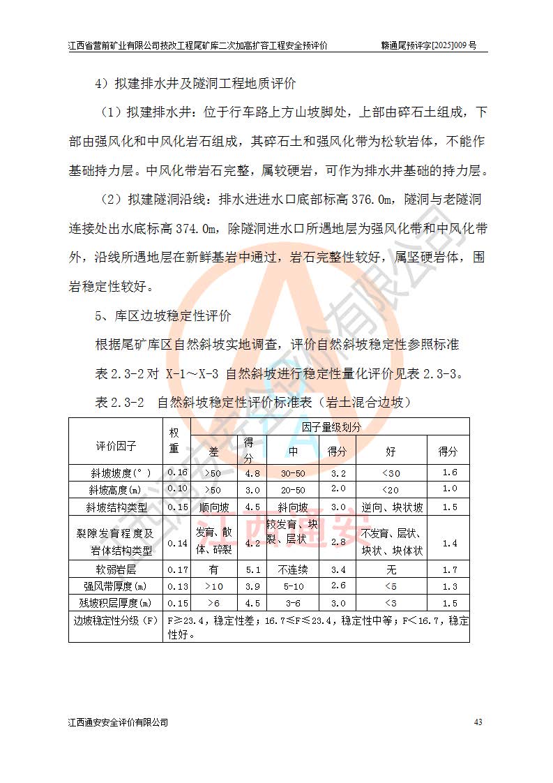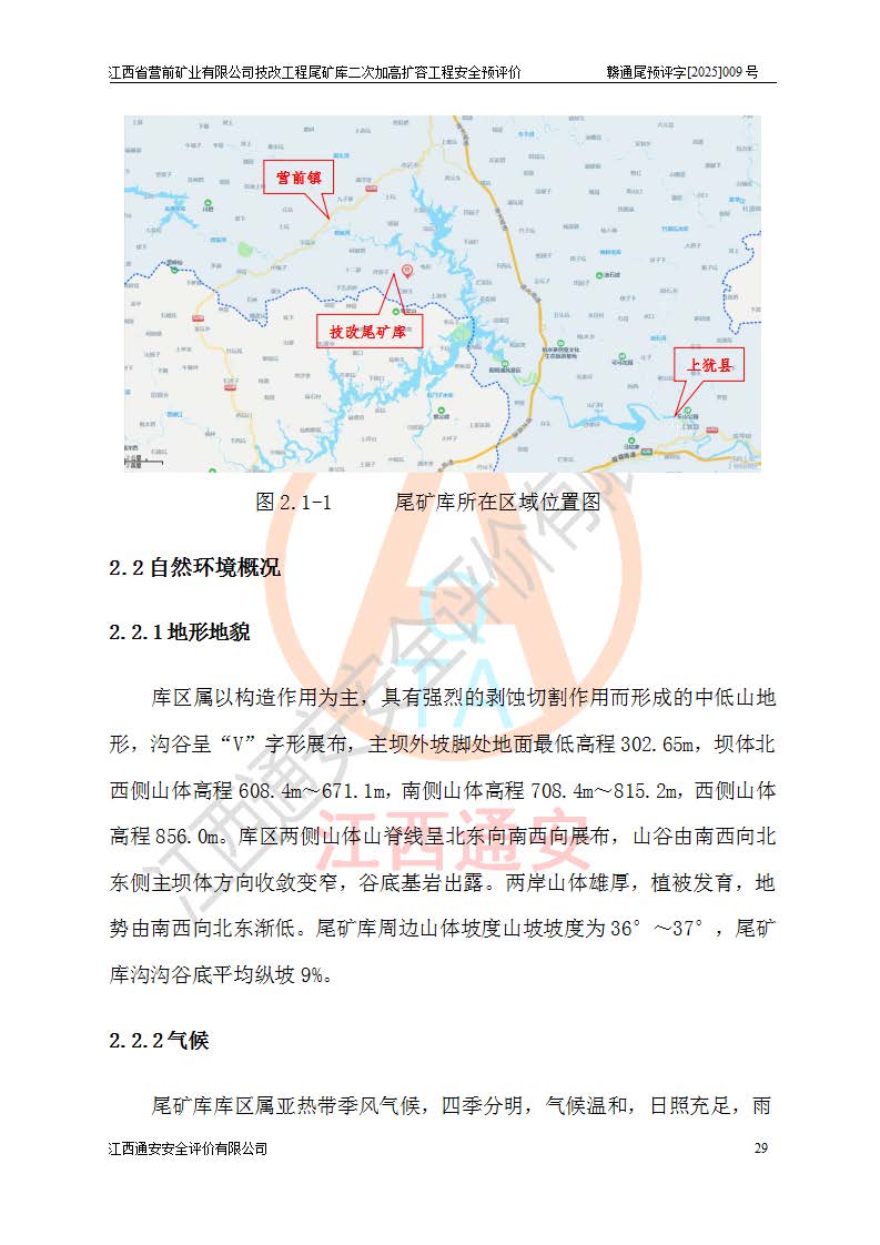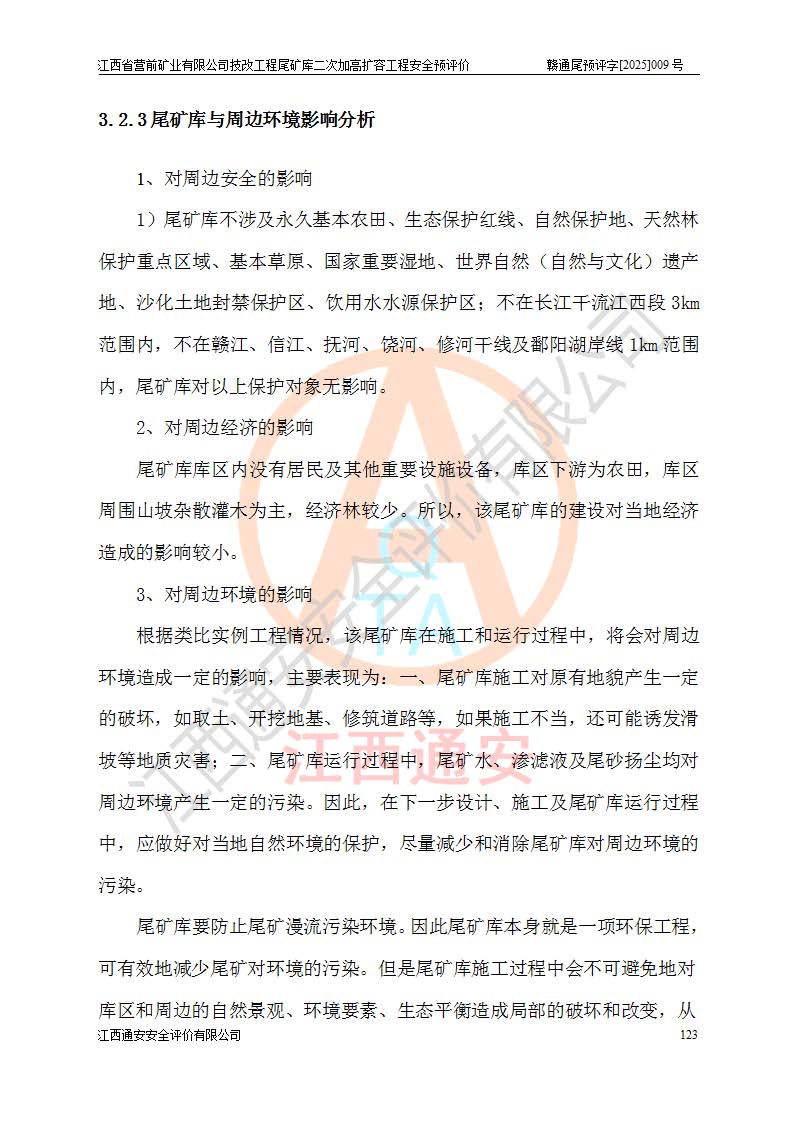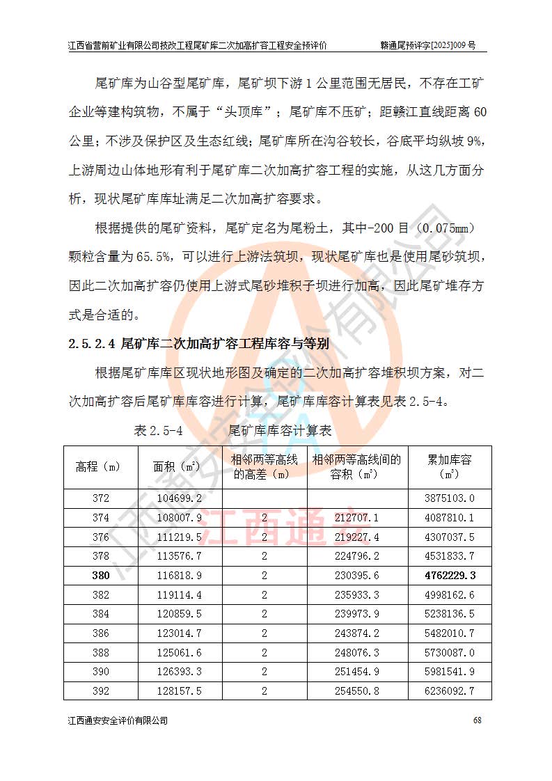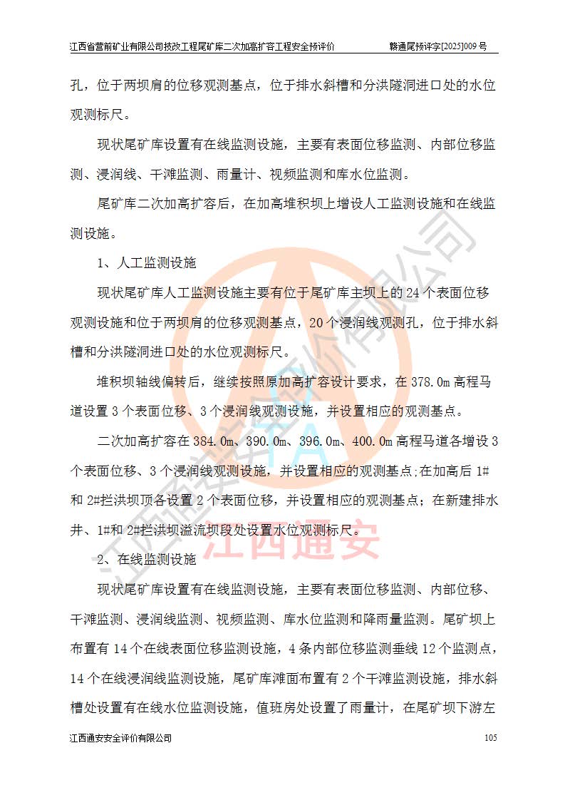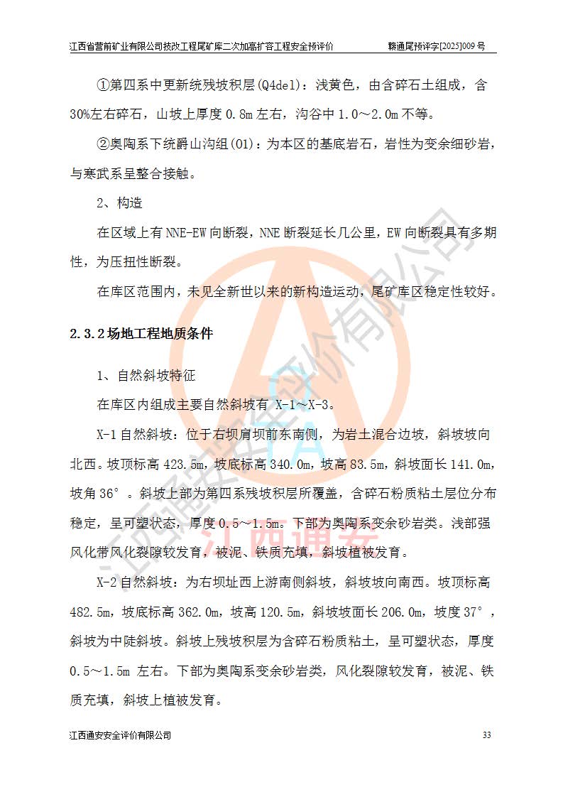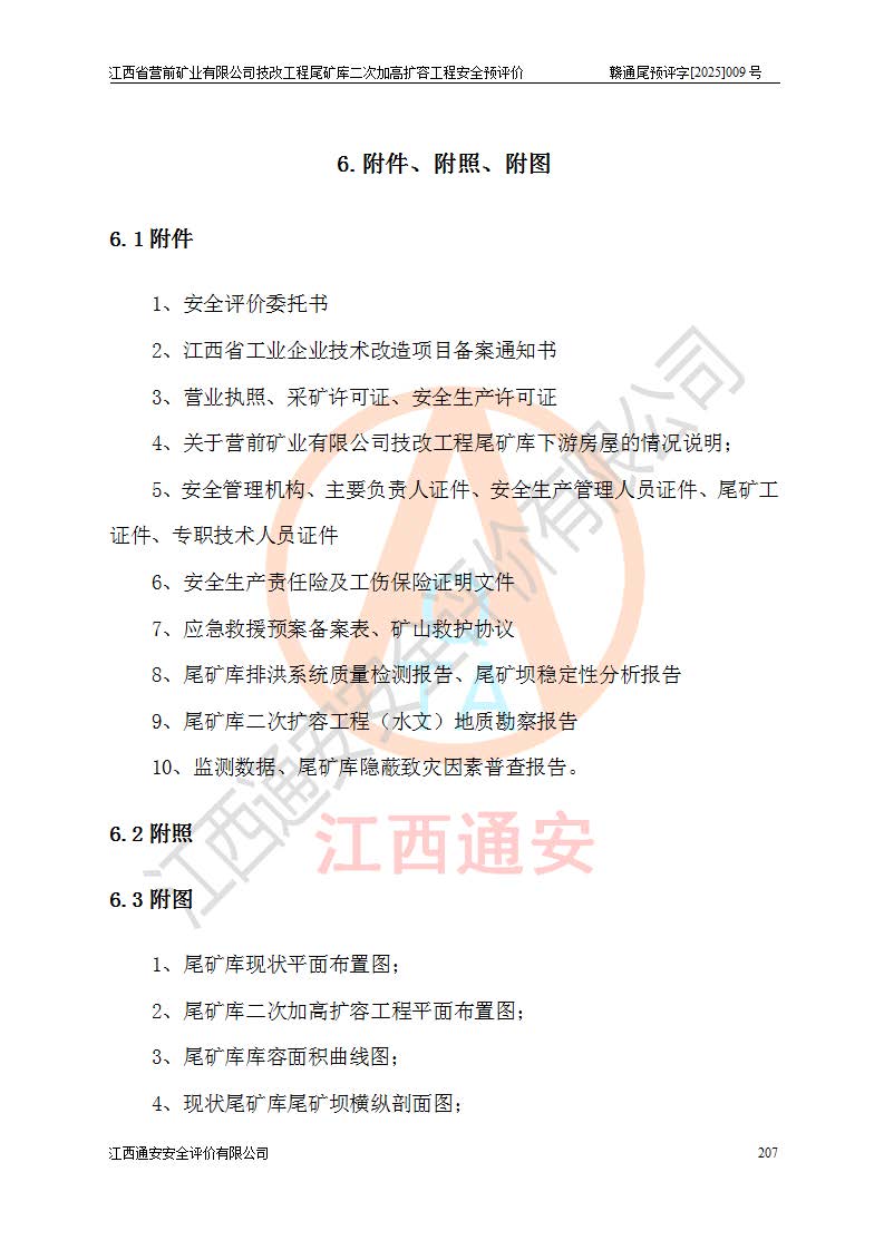 江西省營前礦業(yè)有限公司于2003年12月16日成立,位于贛州市上猶縣營前鎮(zhèn)焦里村境內(nèi),公司注冊資本10000萬元,法定**人陳雅博,礦區(qū)地理坐標(biāo):東經(jīng)114°18′30″~114°19′00″,北緯25°52′35″~25°53′47″。公司經(jīng)營范圍包括:鉛礦、鋅、鎢、銀地下開采、銷售。 江西省營前礦業(yè)有限公司技改工程尾礦庫位于焦里鎢銀鉛鋅礦區(qū),處于上猶縣水巖鄉(xiāng)井子村坑尾自然村境內(nèi),為山谷型尾礦庫。 江西省營前礦業(yè)有限公司技改工程尾礦庫于2013年由福建省冶金工業(yè)設(shè)計院設(shè)計,2014年8月開始施工建設(shè),2015年4月竣工開始試運(yùn)行,2015年11月完成竣工驗收,2016年1月首次取得安全生產(chǎn)許可證,2019年1月完成延期換證,2020年8月委托金建工程設(shè)計有限公司進(jìn)行尾礦庫加高擴(kuò)容工作,2020年10月21日取得了江西省應(yīng)急管理廳下發(fā)的《關(guān)于江西省營前礦業(yè)有限公司技改工程尾礦庫加高擴(kuò)容工程安全設(shè)施設(shè)計的審查意見》(贛應(yīng)急非煤項目設(shè)審〔2020〕46號),之后委托駐馬店市黃淮建設(shè)工程有限公司負(fù)責(zé)施工,云南潤滇工程技術(shù)有限公司負(fù)責(zé)監(jiān)理,2021年12月完成加高擴(kuò)容竣工驗收工作,經(jīng)過延期,現(xiàn)尾礦庫安全生產(chǎn)許可證編號(贛)FM安許證字[2016]M1692號,**期為2025年01月18日至2028年01月17日。 江西省營前礦業(yè)有限公司技改工程尾礦庫為山谷型尾礦庫,初期壩為透水堆石壩,壩頂高程為330.0m,初期壩高25.0m,后期采用上游式尾礦堆積壩,加高擴(kuò)容后*終壩頂高程為380.0m,堆積壩高50.0m,總壩高為75.0m,總庫容為為503.14×104m3,尾礦庫為三等庫。尾礦庫初期壩以上總匯水面積3.53km2,防洪標(biāo)準(zhǔn)取500年一遇。 目前尾礦庫由初期壩、堆積壩、庫內(nèi)排洪系統(tǒng)(雙格排水斜槽+連接井+排水涵洞+排洪隧洞+排水陡槽+消力池)、1#攔洪壩、1#分洪隧洞、2#攔洪壩、2#分洪隧洞和安全監(jiān)測設(shè)施組成。根據(jù)建設(shè)單位提供的尾礦庫平面布置圖,截至2024年12月,現(xiàn)狀尾礦庫堆積壩頂高程為372.2m,現(xiàn)狀總壩高67.2m,灘頂高程為369.8m,現(xiàn)狀全庫容387.51×104m3,現(xiàn)狀尾礦庫為三等庫,原加高擴(kuò)容設(shè)計*終堆積壩頂高程為380.0m,現(xiàn)剩余庫容115.63×104m3,剩余**庫容約92.5×104m3,剩余服務(wù)年限約4.5年;礦山現(xiàn)有儲量較大,剩余庫容及服務(wù)年限不滿足礦山后期生產(chǎn)需要。 技改工程尾礦庫尾礦壩下游1**范圍無居民,不存在工礦企業(yè)等建構(gòu)筑物,不屬于“頭頂庫”;尾礦庫不壓礦;距贛江直線距離60**;不涉及保護(hù)區(qū)及生態(tài)紅線;尾礦庫所在溝谷較長,谷底平均縱坡9%,上游周邊山體地形有利于尾礦庫二次加高擴(kuò)容工程的實施,因此為了增加尾礦庫庫容,延長服務(wù)年限,充分利用尾礦庫所在溝谷地形,江西省營前礦業(yè)有限公司對技改尾礦庫進(jìn)行二次加高擴(kuò)容。 2024年12月,江西省營前礦業(yè)有限公司委托地礦贛西地質(zhì)工程勘察院編制了《江西省營前礦業(yè)有限公司技改工程尾礦庫二次擴(kuò)容工程(水文)地質(zhì)勘察報告》,2025年4月,江西省營前礦業(yè)有限公司委托金建工程設(shè)計有限公司編制了《江西省營前礦業(yè)有限公司技改工程尾礦庫二次加高擴(kuò)容工程可行性研究報告》。 按照非煤礦山建設(shè)項目安全設(shè)施“三同時”的規(guī)定要求,技改工程尾礦庫為二次加高擴(kuò)容工程,**進(jìn)行安全預(yù)評價;江西省營前礦業(yè)有限公司委托我公司承擔(dān)技改工程尾礦庫二次加高擴(kuò)容工程建設(shè)項目的安全預(yù)評價工作。 |