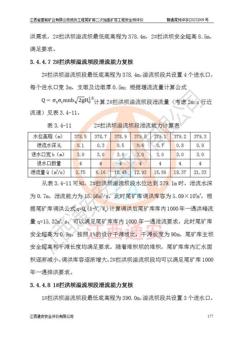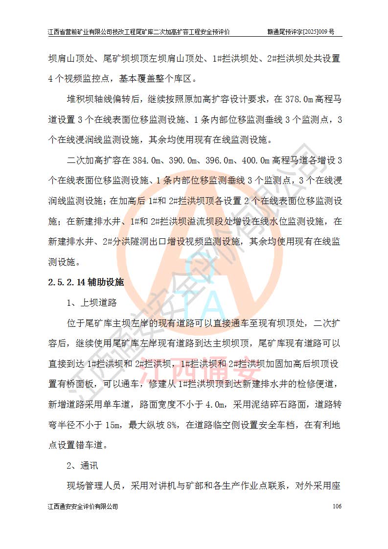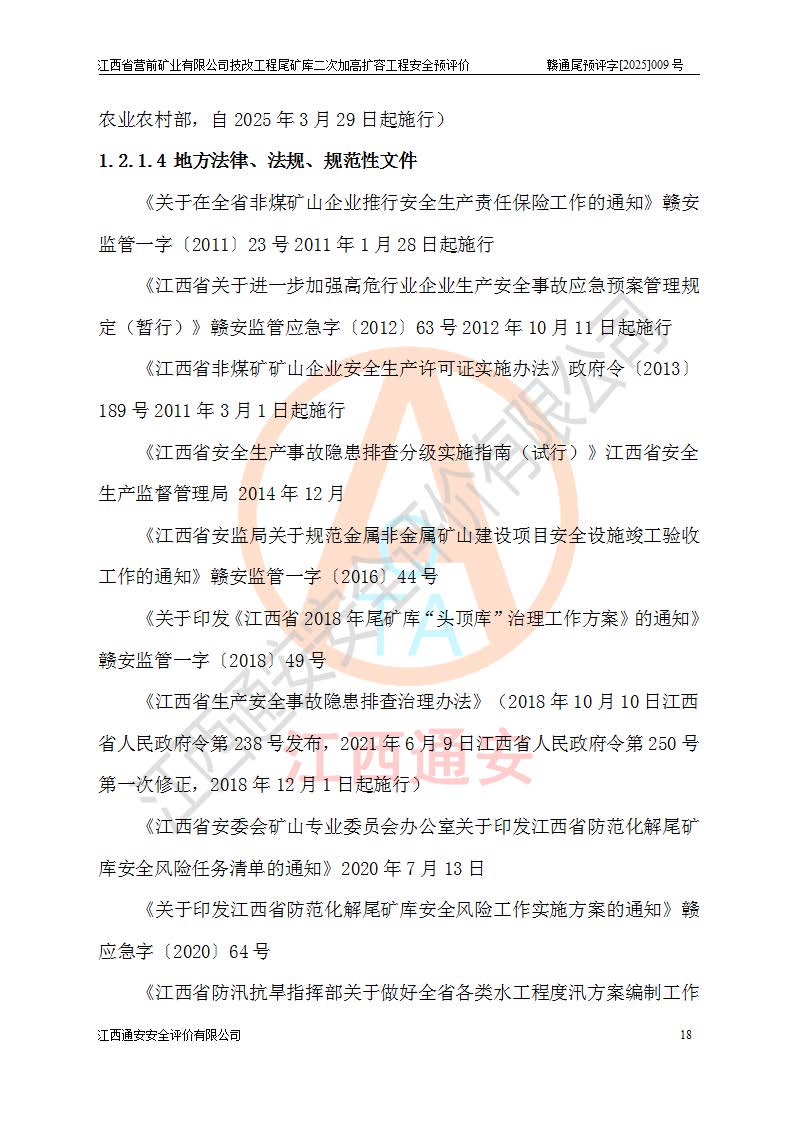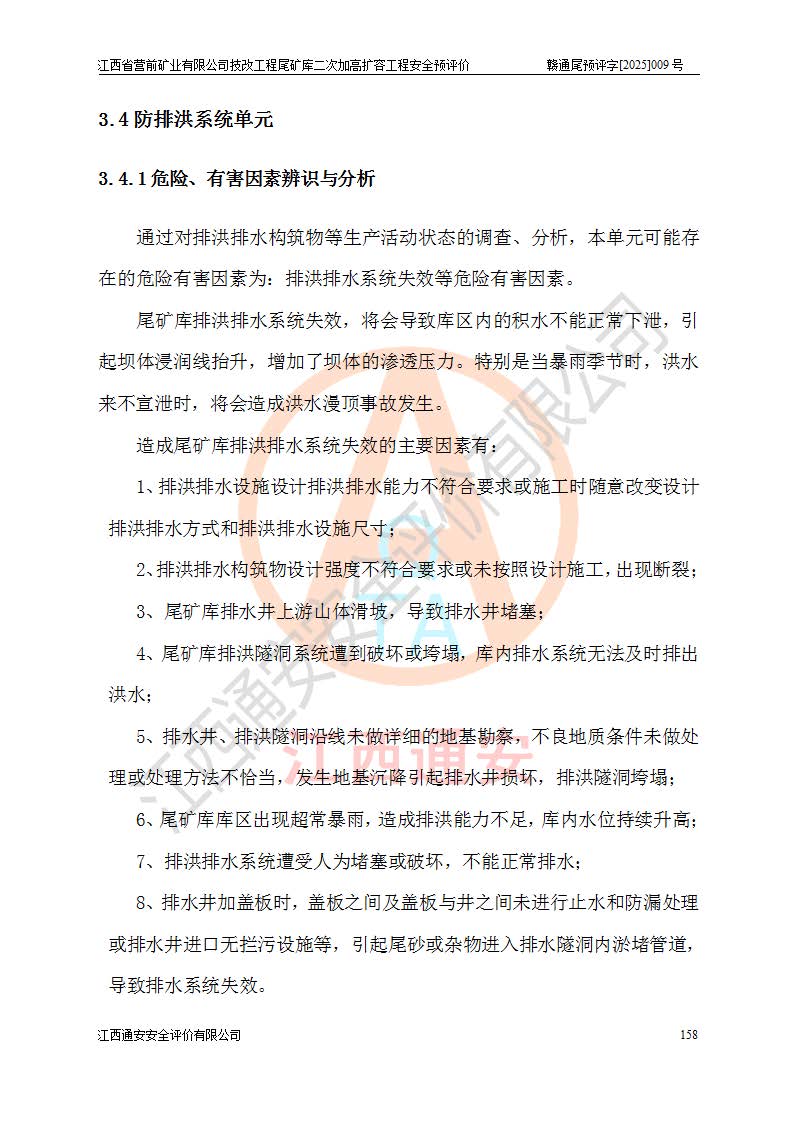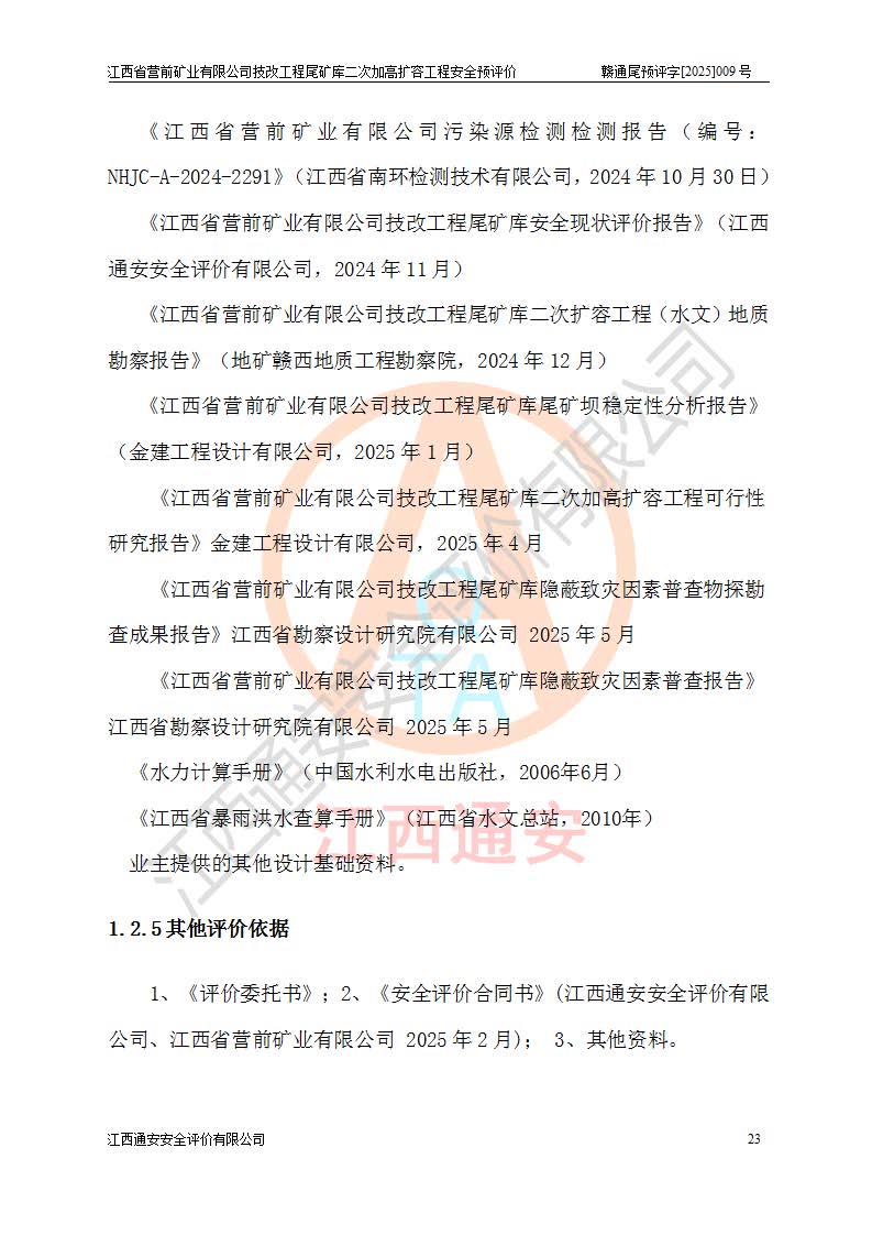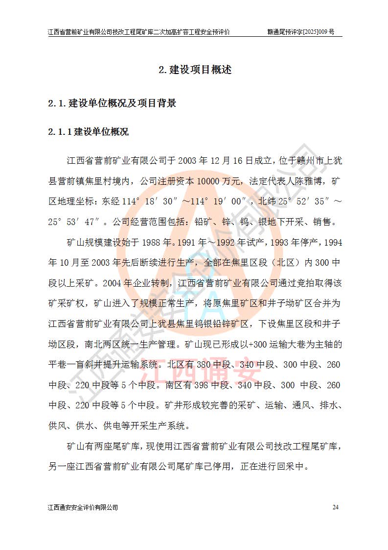江西省營前礦業(yè)有限公司于2003年12月16日成立,位于贛州市上猶縣營前鎮(zhèn)焦里村境內(nèi),公司注冊資本10000萬元,法定**人陳雅博,礦區(qū)地理坐標(biāo):東經(jīng)114°18′30″~114°19′00″,北緯25°52′35″~25°53′47″。公司經(jīng)營范圍包括:鉛礦、鋅、鎢、銀地下開采、銷售。 江西省營前礦業(yè)有限公司技改工程尾礦庫位于焦里鎢銀鉛鋅礦區(qū),處于上猶縣水巖鄉(xiāng)井子村坑尾自然村境內(nèi),為山谷型尾礦庫。 江西省營前礦業(yè)有限公司技改工程尾礦庫于2013年由福建省冶金工業(yè)設(shè)計院設(shè)計,2014年8月開始施工建設(shè),2015年4月竣工開始試運(yùn)行,2015年11月完成竣工驗收,2016年1月首次取得安全生產(chǎn)許可證,2019年1月完成延期換證,2020年8月委托金建工程設(shè)計有限公司進(jìn)行尾礦庫加高擴(kuò)容工作,2020年10月21日取得了江西省應(yīng)急管理廳下發(fā)的《關(guān)于江西省營前礦業(yè)有限公司技改工程尾礦庫加高擴(kuò)容工程安全設(shè)施設(shè)計的審查意見》(贛應(yīng)急非煤項目設(shè)審〔2020〕46號),之后委托駐馬店市黃淮建設(shè)工程有限公司負(fù)責(zé)施工,云南潤滇工程技術(shù)有限公司負(fù)責(zé)監(jiān)理,2021年12月完成加高擴(kuò)容竣工驗收工作,經(jīng)過延期,現(xiàn)尾礦庫安全生產(chǎn)許可證編號(贛)FM安許證字[2016]M1692號,**期為2025年01月18日至2028年01月17日。 江西省營前礦業(yè)有限公司技改工程尾礦庫為山谷型尾礦庫,初期壩為透水堆石壩,壩頂高程為330.0m,初期壩高25.0m,后期采用上游式尾礦堆積壩,加高擴(kuò)容后*終壩頂高程為380.0m,堆積壩高50.0m,總壩高為75.0m,總庫容為為503.14×104m3,尾礦庫為三等庫。尾礦庫初期壩以上總匯水面積3.53km2,防洪標(biāo)準(zhǔn)取500年一遇。 目前尾礦庫由初期壩、堆積壩、庫內(nèi)排洪系統(tǒng)(雙格排水斜槽+連接井+排水涵洞+排洪隧洞+排水陡槽+消力池)、1#攔洪壩、1#分洪隧洞、2#攔洪壩、2#分洪隧洞和安全監(jiān)測設(shè)施組成。根據(jù)建設(shè)單位提供的尾礦庫平面布置圖,截至2024年12月,現(xiàn)狀尾礦庫堆積壩頂高程為372.2m,現(xiàn)狀總壩高67.2m,灘頂高程為369.8m,現(xiàn)狀全庫容387.51×104m3,現(xiàn)狀尾礦庫為三等庫,原加高擴(kuò)容設(shè)計*終堆積壩頂高程為380.0m,現(xiàn)剩余庫容115.63×104m3,剩余**庫容約92.5×104m3,剩余服務(wù)年限約4.5年;礦山現(xiàn)有儲量較大,剩余庫容及服務(wù)年限不滿足礦山后期生產(chǎn)需要。 技改工程尾礦庫尾礦壩下游1**范圍無居民,不存在工礦企業(yè)等建構(gòu)筑物,不屬于“頭頂庫”;尾礦庫不壓礦;距贛江直線距離60**;不涉及保護(hù)區(qū)及生態(tài)紅線;尾礦庫所在溝谷較長,谷底平均縱坡9%,上游周邊山體地形有利于尾礦庫二次加高擴(kuò)容工程的實施,因此為了增加尾礦庫庫容,延長服務(wù)年限,充分利用尾礦庫所在溝谷地形,江西省營前礦業(yè)有限公司對技改尾礦庫進(jìn)行二次加高擴(kuò)容。 2024年12月,江西省營前礦業(yè)有限公司委托地礦贛西地質(zhì)工程勘察院編制了《江西省營前礦業(yè)有限公司技改工程尾礦庫二次擴(kuò)容工程(水文)地質(zhì)勘察報告》,2025年4月,江西省營前礦業(yè)有限公司委托金建工程設(shè)計有限公司編制了《江西省營前礦業(yè)有限公司技改工程尾礦庫二次加高擴(kuò)容工程可行性研究報告》。 按照非煤礦山建設(shè)項目安全設(shè)施“三同時”的規(guī)定要求,技改工程尾礦庫為二次加高擴(kuò)容工程,**進(jìn)行安全預(yù)評價;江西省營前礦業(yè)有限公司委托我公司承擔(dān)技改工程尾礦庫二次加高擴(kuò)容工程建設(shè)項目的安全預(yù)評價工作。 |