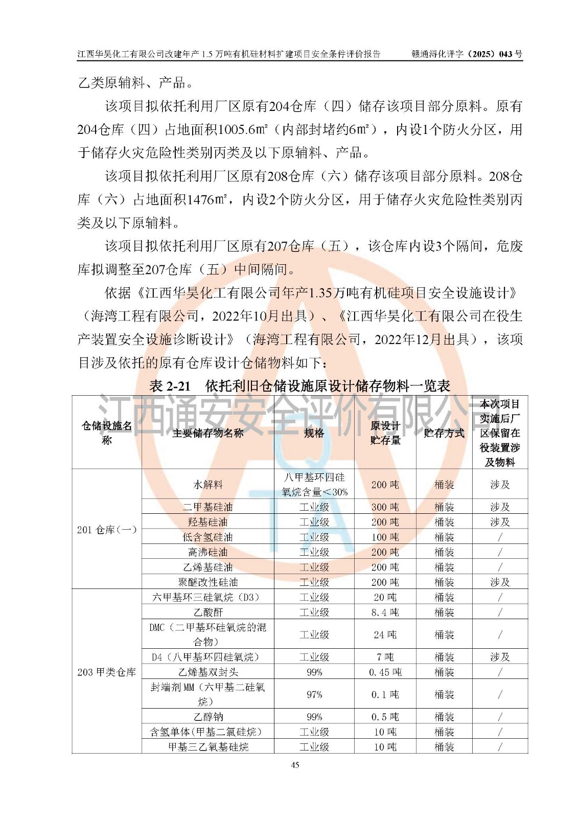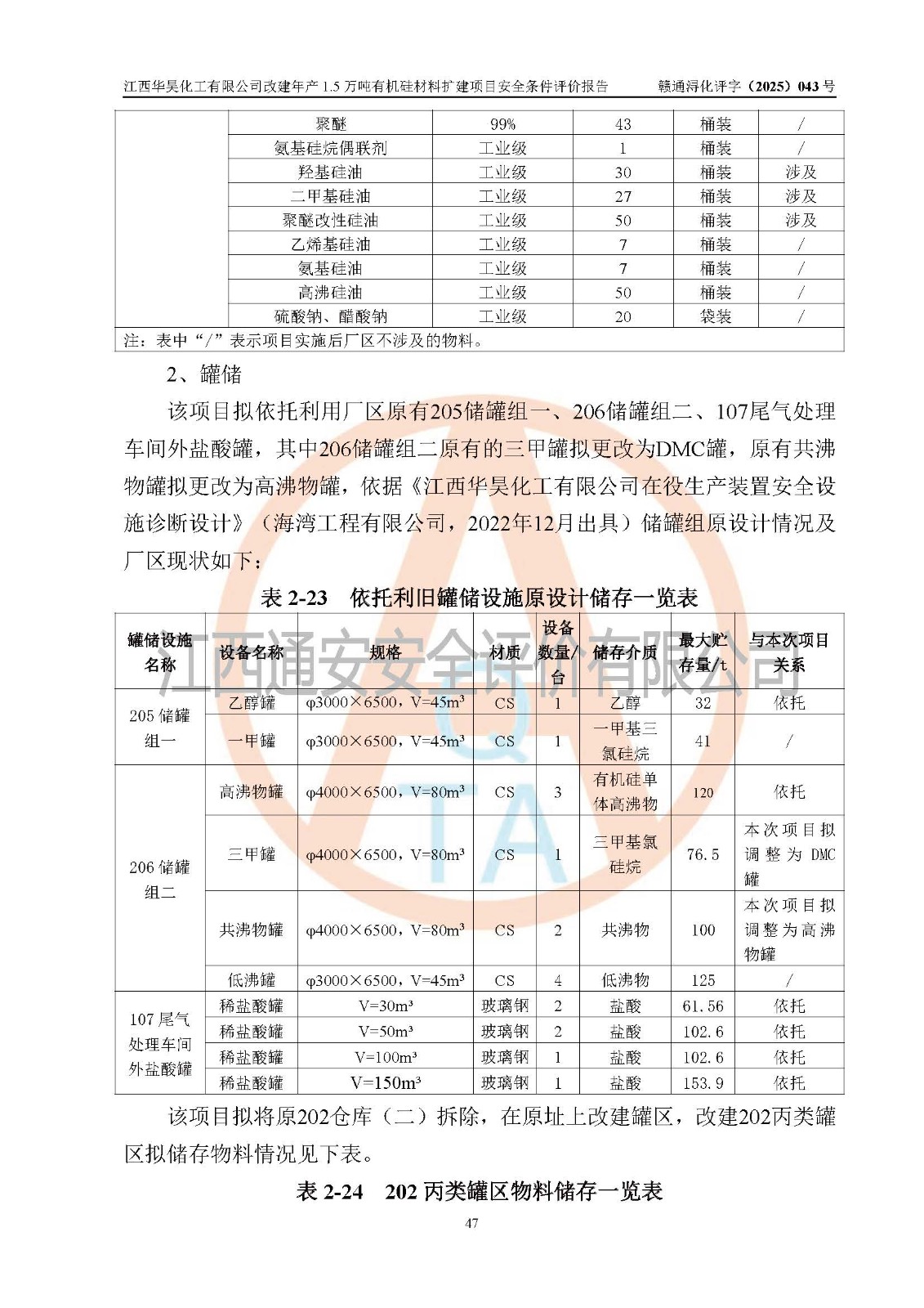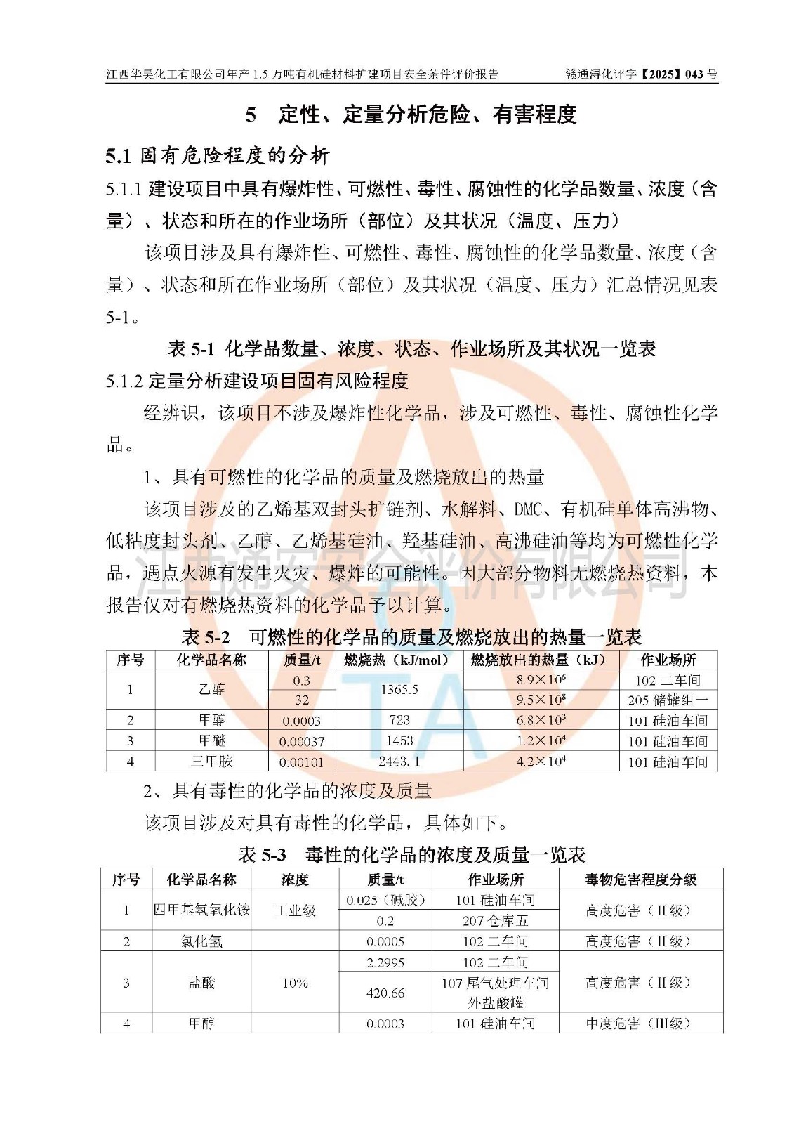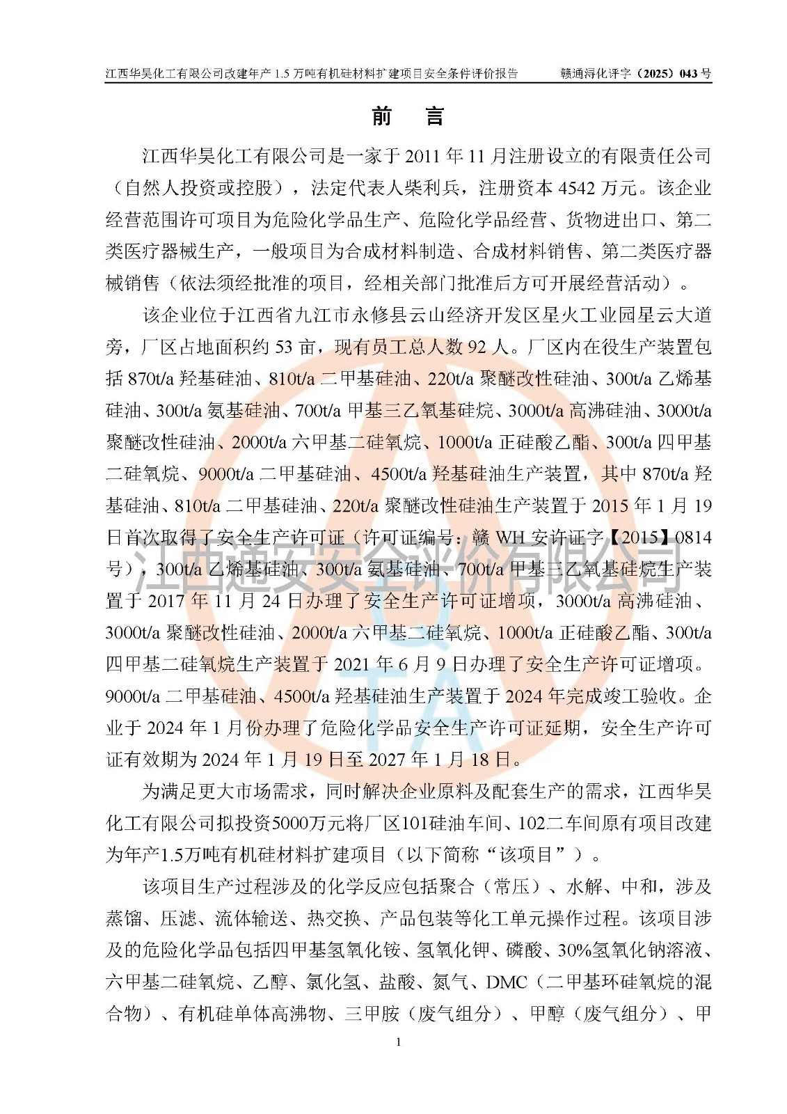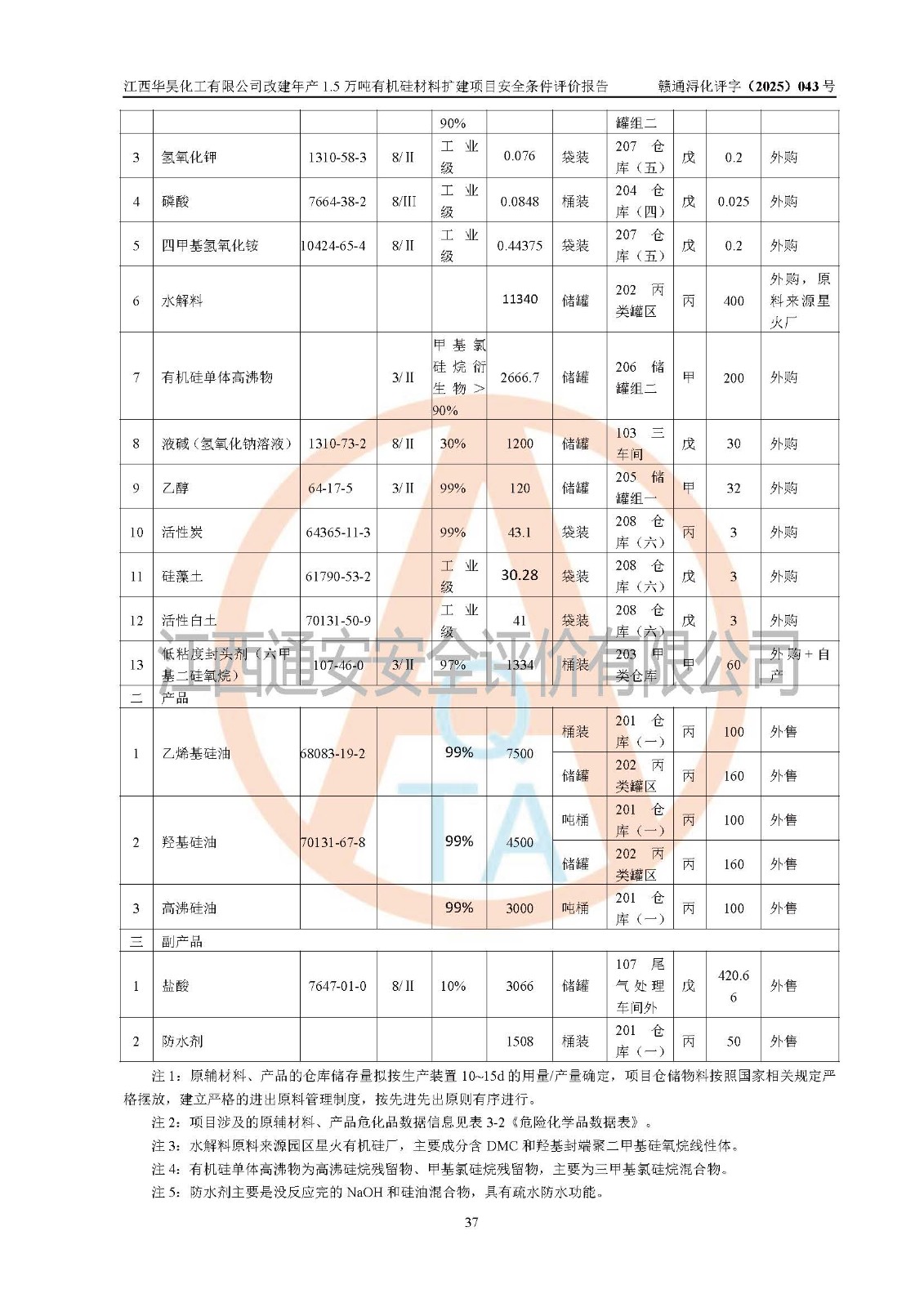 江西華昊化工有限公司是一家于2011年11月注冊成立的有限責任公司(自然人投資或控股),注冊地址位于永修縣云山經(jīng)濟開發(fā)區(qū)星火工業(yè)園星云大道旁,法定**人柴利兵,注冊資本1542萬元,經(jīng)營范圍包括許可項目和一般項目,許可項目為危險化學品生產(chǎn)、危險化學品經(jīng)營、貨物進出口、第二類醫(yī)療器械生產(chǎn),一般項目為合成材料制造(不含危險化學品)、合成材料銷售、第二類醫(yī)療器械銷售。 為滿足更大市場需求,同時解決企業(yè)原料及配套生產(chǎn)的需求,江西華昊化工有限公司擬投資5000萬元將廠區(qū)101硅油車間、102二車間原有項目改建為年產(chǎn)1.5萬噸有機硅材料擴建項目(以下簡稱“該項目”)。 該項目生產(chǎn)過程涉及的化學反應包括聚合(常壓)、水解、中和,涉及蒸餾、壓濾、流體輸送、熱交換、產(chǎn)品包裝等化工單元操作過程。該項目涉及的危險化學品包括四甲基氫氧化銨、氫氧化鉀、磷酸、30%氫氧化鈉溶液、六甲基二硅氧烷、乙醇、氯化氫、鹽酸、氮氣、DMC(二甲基環(huán)硅氧烷的混合物)、有機硅單體高沸物、**胺(廢氣組分)、甲醇(廢氣組分)、甲醚(廢氣組分),其中甲醇、甲醚屬于重點監(jiān)管的危險化學品,鹽酸屬于第三類易制毒化學品,乙醇、甲醇、甲醚屬于特別管控危險化學品,四甲基氫氧化銨、乙醇、**胺、甲醇、甲醚屬于第四類監(jiān)控化學品。該項目不涉及劇毒品、易制爆化學品、高毒物品,不涉及**、二、三類監(jiān)控化學品。 該項目不涉及重點監(jiān)管的典型危險化工工藝,生產(chǎn)單元、儲存單元不構成危險化學品重大危險源。 該項目副產(chǎn)品鹽酸、中間產(chǎn)品低粘度封頭劑(六甲基二硅氧烷)屬于危險化學品,該項目屬于危險化學品生產(chǎn)項目,依據(jù)《危險化學品生產(chǎn)企業(yè)安全生產(chǎn)許可證實施辦法》(**安全生產(chǎn)監(jiān)督管理總局令第41號,第79號、89號修改),項目需要辦理危險化學品安全生產(chǎn)許可證。 |