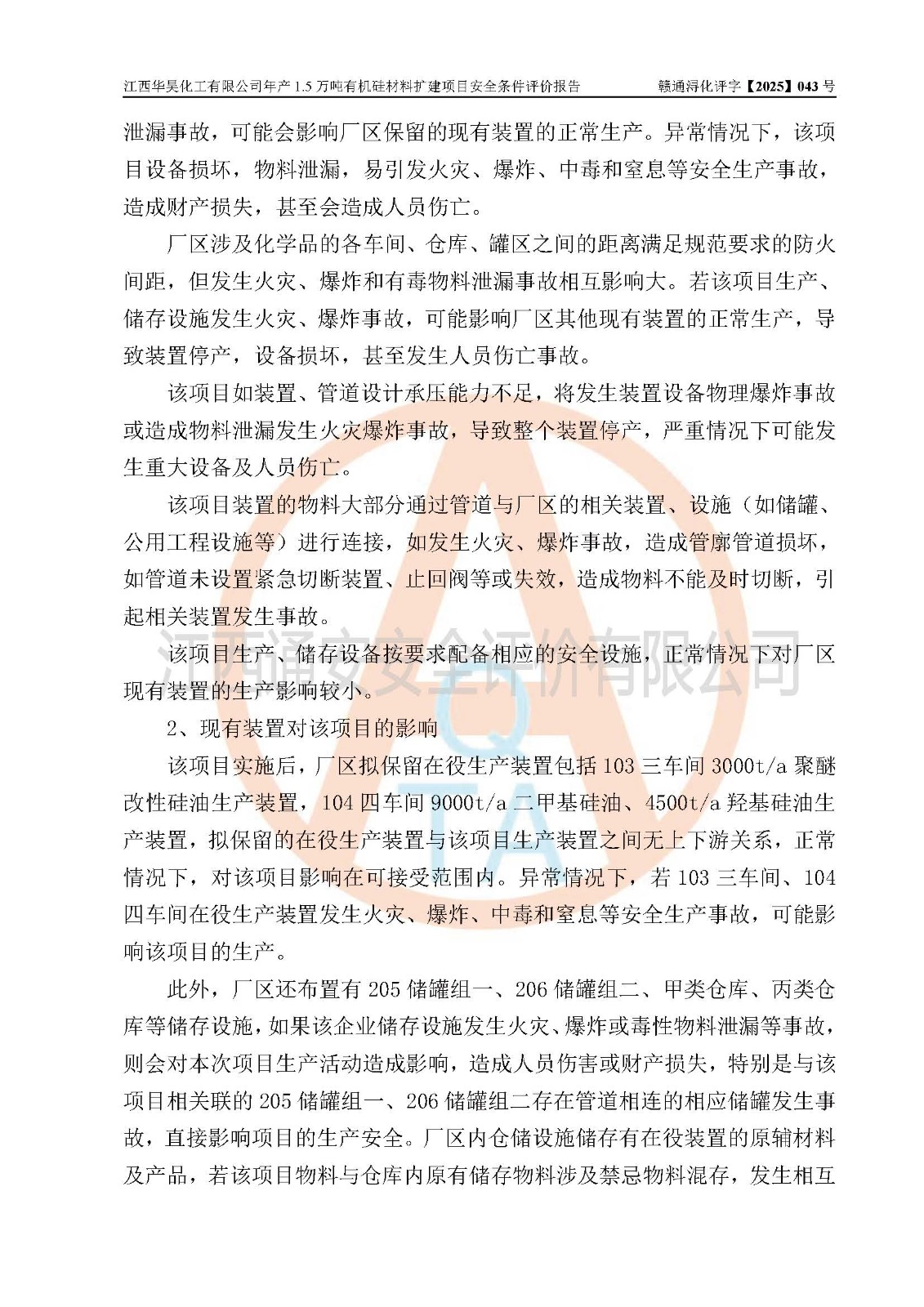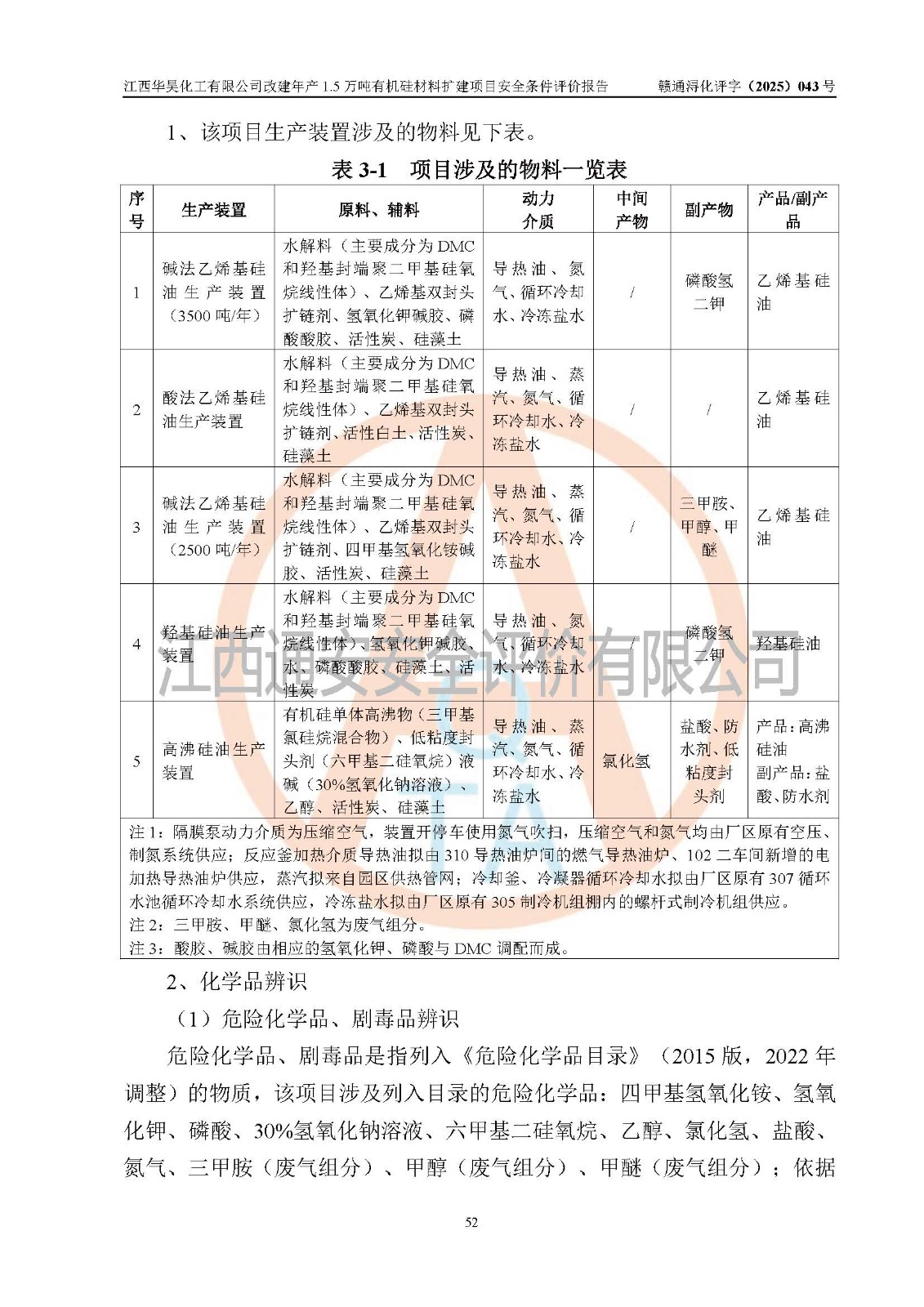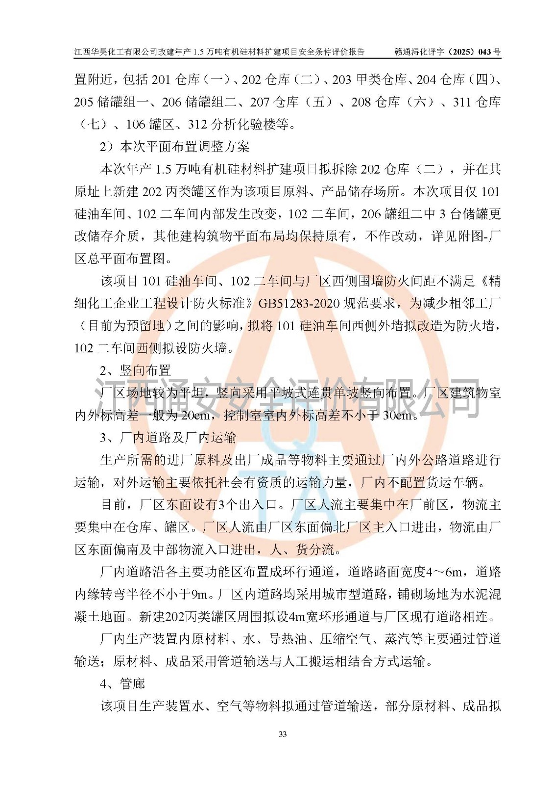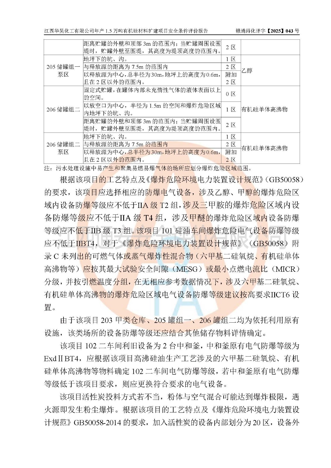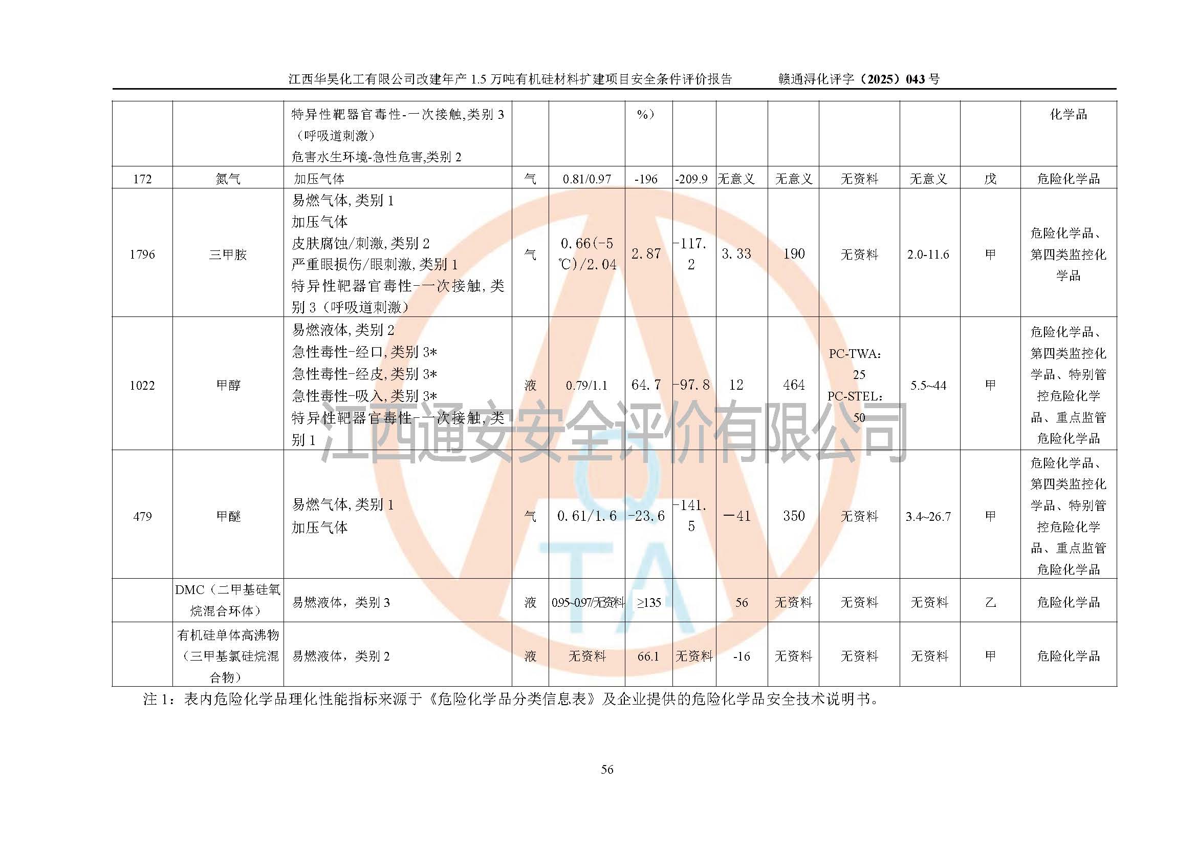 江西華昊化工有限公司是一家于2011年11月注冊成立的有限責任公司(自然人投資或控股),注冊地址位于永修縣云山經(jīng)濟開發(fā)區(qū)星火工業(yè)園星云大道旁,法定**人柴利兵,注冊資本1542萬元,經(jīng)營范圍包括許可項目和一般項目,許可項目為危險化學品生產(chǎn)、危險化學品經(jīng)營、貨物進出口、第二類醫(yī)療器械生產(chǎn),一般項目為合成材料制造(不含危險化學品)、合成材料銷售、第二類醫(yī)療器械銷售。 為滿足更大市場需求,同時解決企業(yè)原料及配套生產(chǎn)的需求,江西華昊化工有限公司擬投資5000萬元將廠區(qū)101硅油車間、102二車間原有項目改建為年產(chǎn)1.5萬噸有機硅材料擴建項目(以下簡稱“該項目”)。 該項目生產(chǎn)過程涉及的化學反應包括聚合(常壓)、水解、中和,涉及蒸餾、壓濾、流體輸送、熱交換、產(chǎn)品包裝等化工單元操作過程。該項目涉及的危險化學品包括四甲基氫氧化銨、氫氧化鉀、磷酸、30%氫氧化鈉溶液、六甲基二硅氧烷、乙醇、氯化氫、鹽酸、氮氣、DMC(二甲基環(huán)硅氧烷的混合物)、有機硅單體高沸物、**胺(廢氣組分)、甲醇(廢氣組分)、甲醚(廢氣組分),其中甲醇、甲醚屬于重點監(jiān)管的危險化學品,鹽酸屬于第三類易制毒化學品,乙醇、甲醇、甲醚屬于特別管控危險化學品,四甲基氫氧化銨、乙醇、**胺、甲醇、甲醚屬于第四類監(jiān)控化學品。該項目不涉及劇毒品、易制爆化學品、高毒物品,不涉及**、二、三類監(jiān)控化學品。 該項目不涉及重點監(jiān)管的典型危險化工工藝,生產(chǎn)單元、儲存單元不構成危險化學品重大危險源。 該項目副產(chǎn)品鹽酸、中間產(chǎn)品低粘度封頭劑(六甲基二硅氧烷)屬于危險化學品,該項目屬于危險化學品生產(chǎn)項目,依據(jù)《危險化學品生產(chǎn)企業(yè)安全生產(chǎn)許可證實施辦法》(**安全生產(chǎn)監(jiān)督管理總局令第41號,第79號、89號修改),項目需要辦理危險化學品安全生產(chǎn)許可證。 |