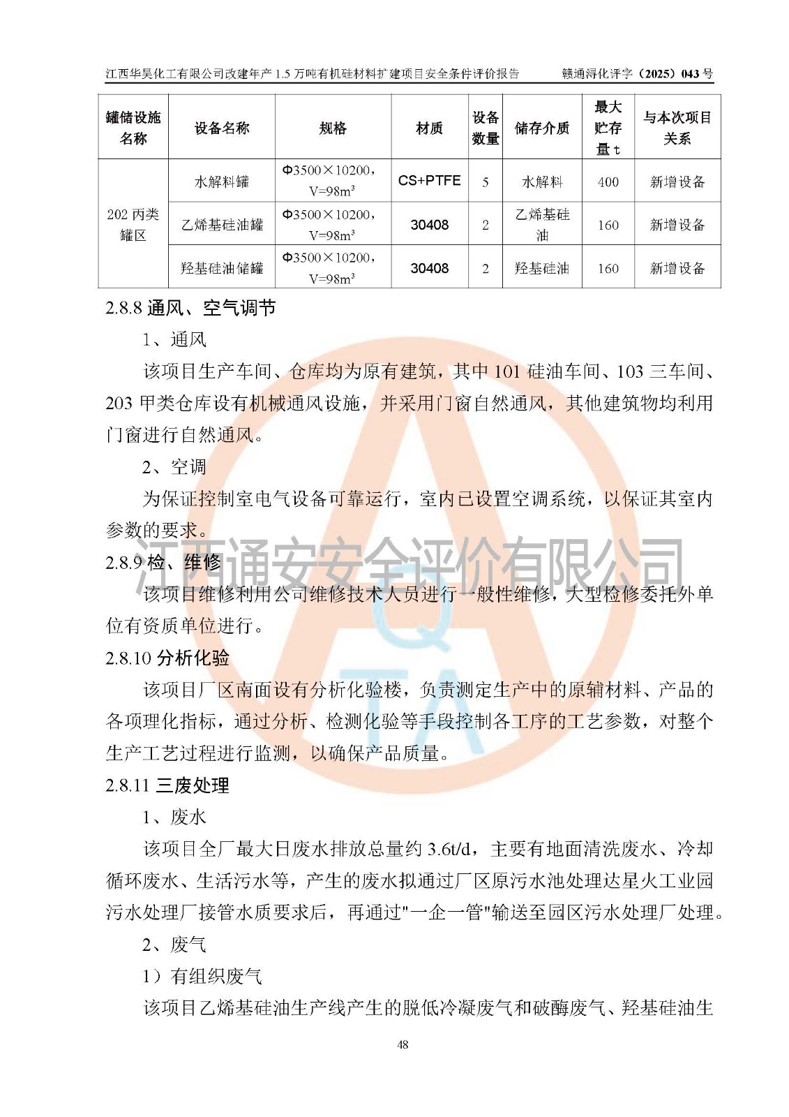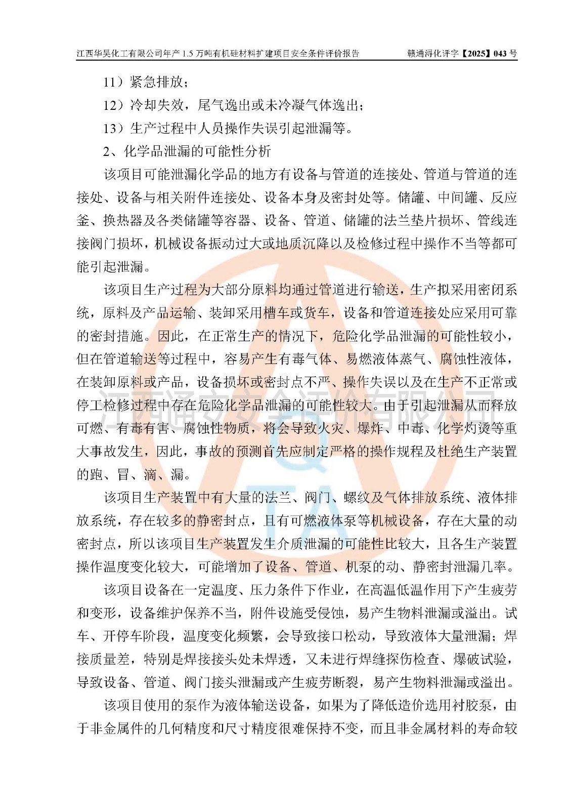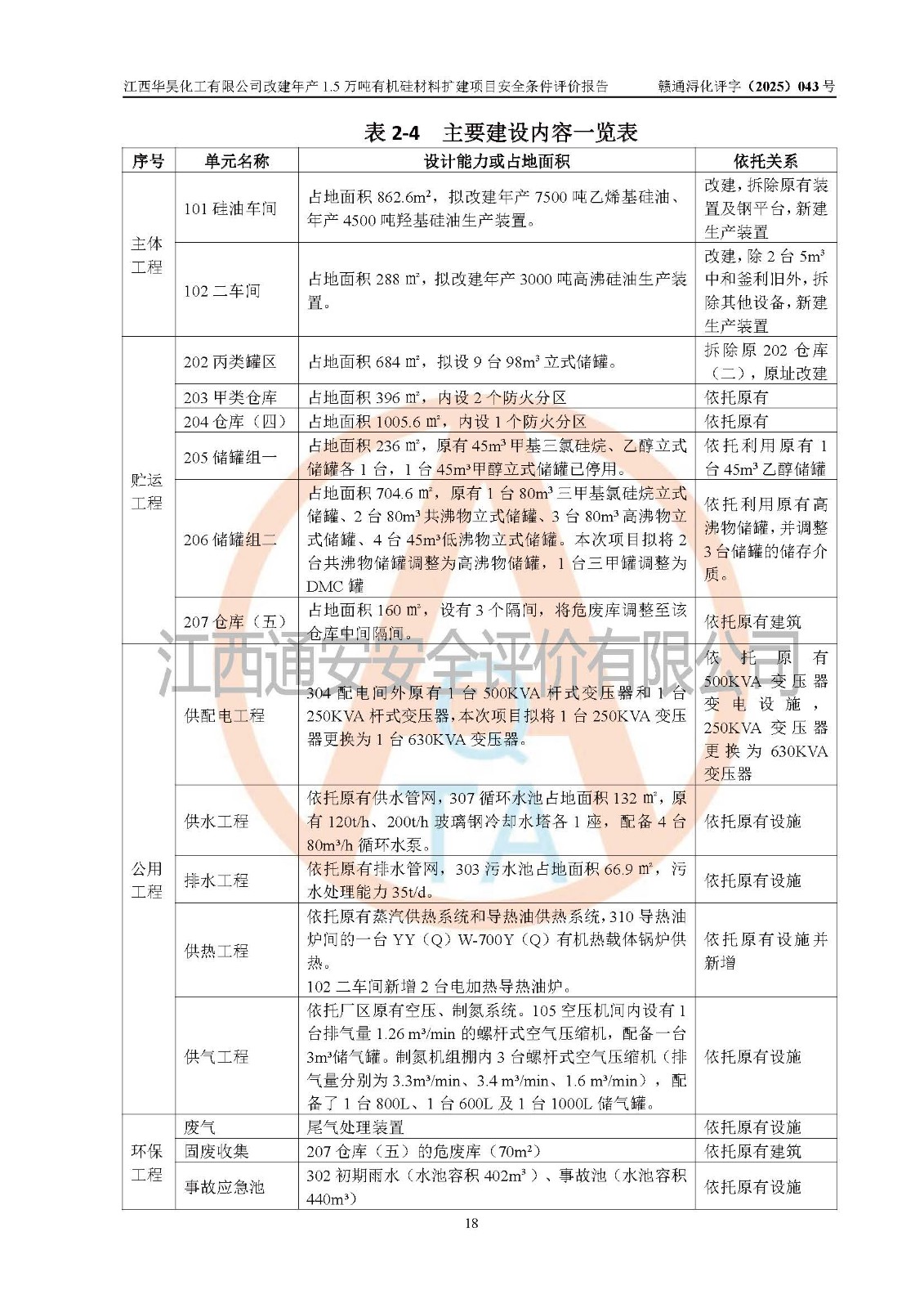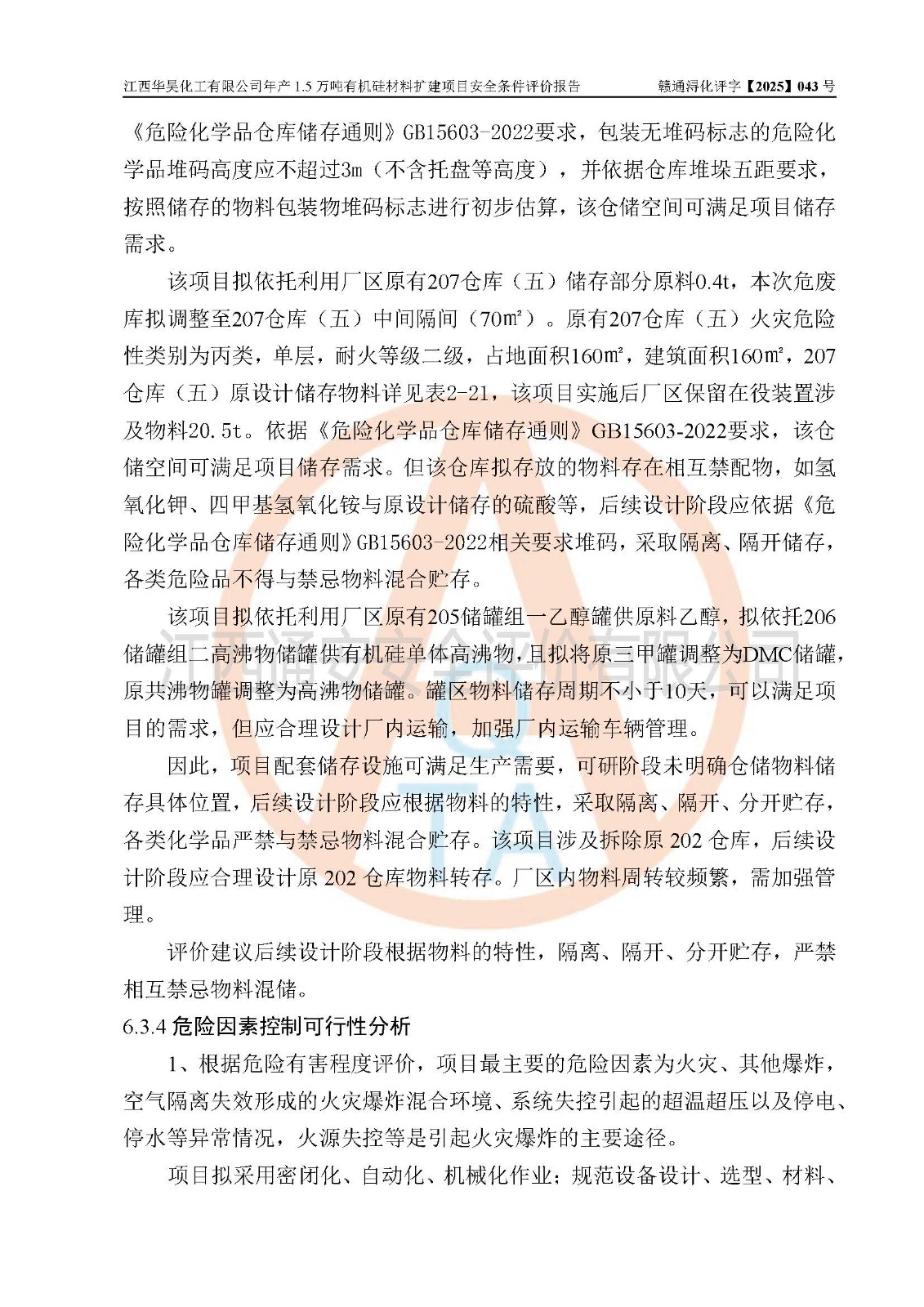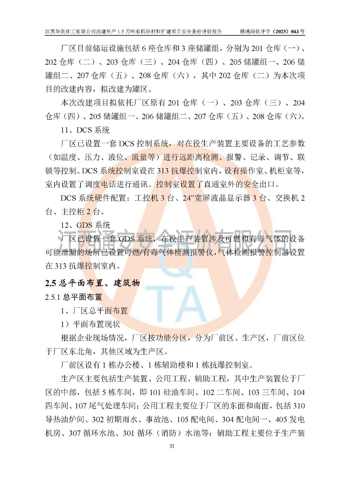江西華昊化工有限公司是一家于2011年11月注冊成立的有限責任公司(自然人投資或控股),注冊地址位于永修縣云山經(jīng)濟開發(fā)區(qū)星火工業(yè)園星云大道旁,法定**人柴利兵,注冊資本1542萬元,經(jīng)營范圍包括許可項目和一般項目,許可項目為危險化學品生產(chǎn)、危險化學品經(jīng)營、貨物進出口、第二類醫(yī)療器械生產(chǎn),一般項目為合成材料制造(不含危險化學品)、合成材料銷售、第二類醫(yī)療器械銷售。 為滿足更大市場需求,同時解決企業(yè)原料及配套生產(chǎn)的需求,江西華昊化工有限公司擬投資5000萬元將廠區(qū)101硅油車間、102二車間原有項目改建為年產(chǎn)1.5萬噸有機硅材料擴建項目(以下簡稱“該項目”)。 該項目生產(chǎn)過程涉及的化學反應包括聚合(常壓)、水解、中和,涉及蒸餾、壓濾、流體輸送、熱交換、產(chǎn)品包裝等化工單元操作過程。該項目涉及的危險化學品包括四甲基氫氧化銨、氫氧化鉀、磷酸、30%氫氧化鈉溶液、六甲基二硅氧烷、乙醇、氯化氫、鹽酸、氮氣、DMC(二甲基環(huán)硅氧烷的混合物)、有機硅單體高沸物、**胺(廢氣組分)、甲醇(廢氣組分)、甲醚(廢氣組分),其中甲醇、甲醚屬于重點監(jiān)管的危險化學品,鹽酸屬于第三類易制毒化學品,乙醇、甲醇、甲醚屬于特別管控危險化學品,四甲基氫氧化銨、乙醇、**胺、甲醇、甲醚屬于第四類監(jiān)控化學品。該項目不涉及劇毒品、易制爆化學品、高毒物品,不涉及**、二、三類監(jiān)控化學品。 該項目不涉及重點監(jiān)管的典型危險化工工藝,生產(chǎn)單元、儲存單元不構成危險化學品重大危險源。 該項目副產(chǎn)品鹽酸、中間產(chǎn)品低粘度封頭劑(六甲基二硅氧烷)屬于危險化學品,該項目屬于危險化學品生產(chǎn)項目,依據(jù)《危險化學品生產(chǎn)企業(yè)安全生產(chǎn)許可證實施辦法》(**安全生產(chǎn)監(jiān)督管理總局令第41號,第79號、89號修改),項目需要辦理危險化學品安全生產(chǎn)許可證。 |