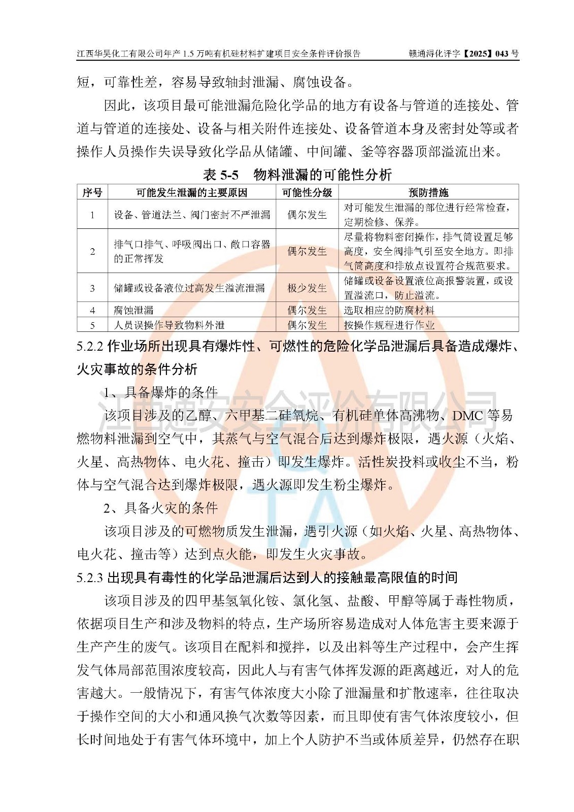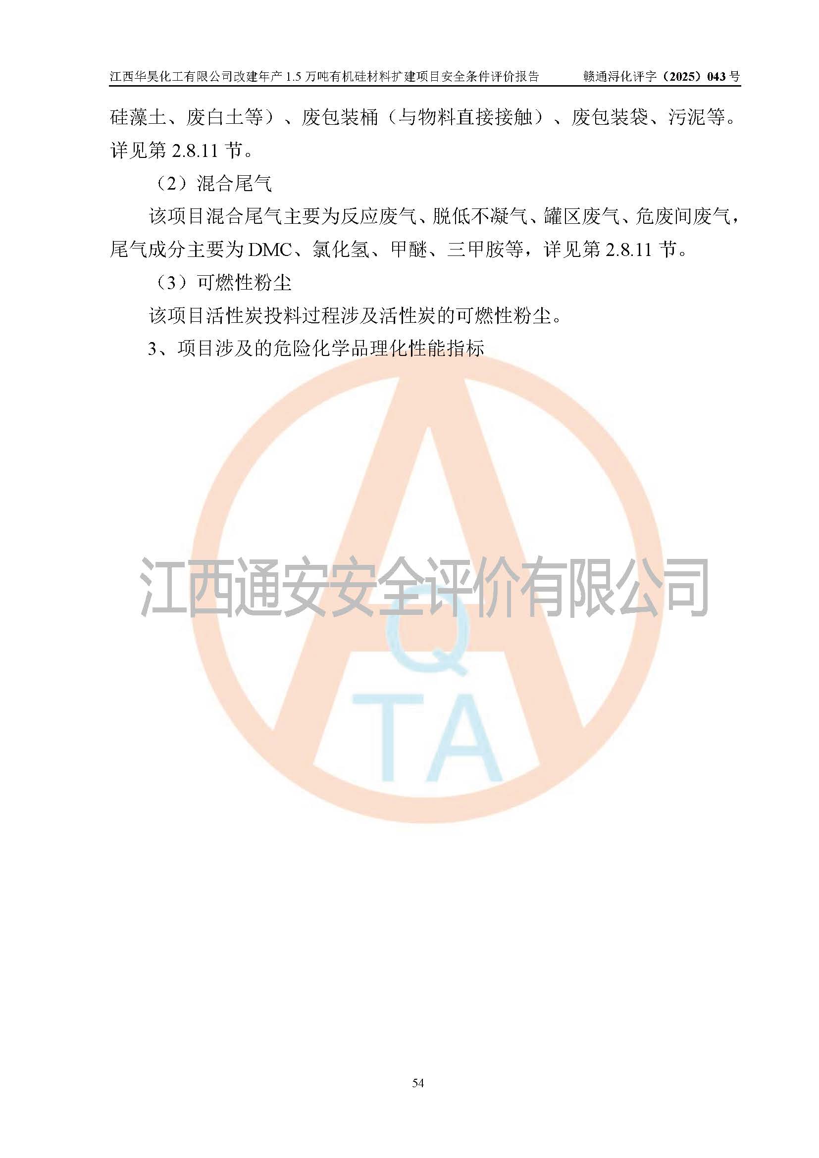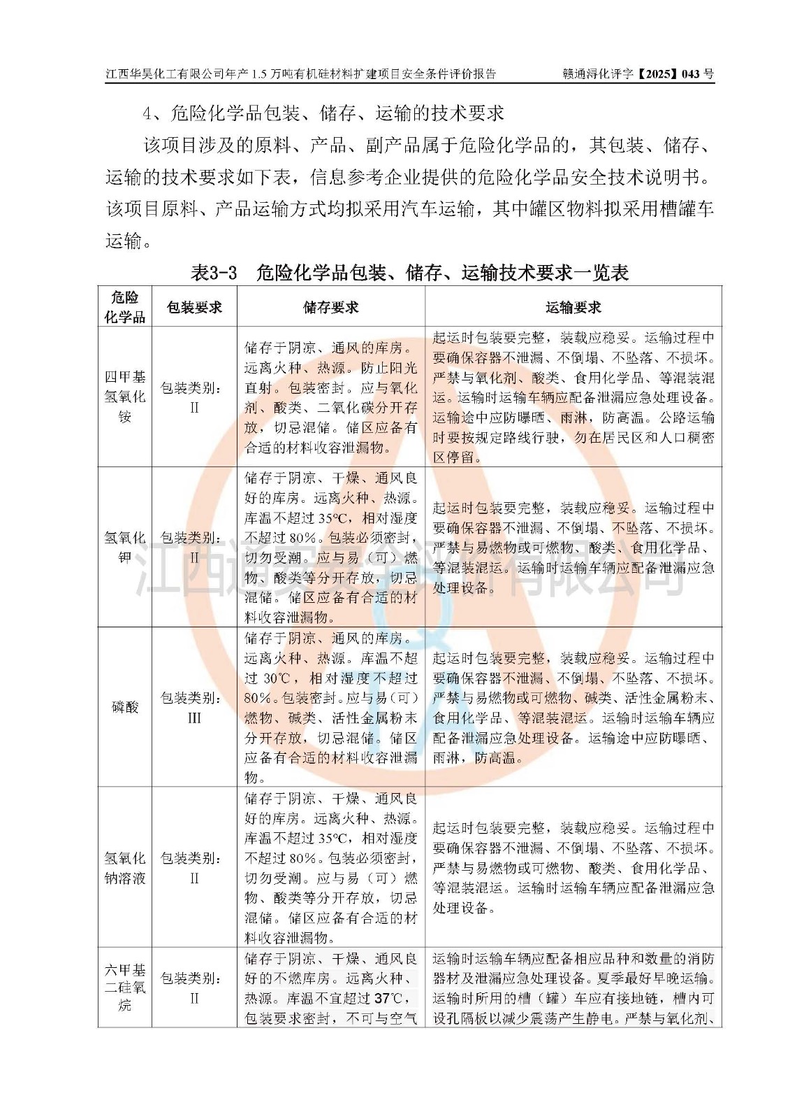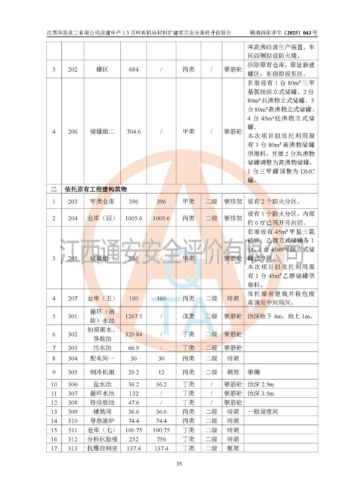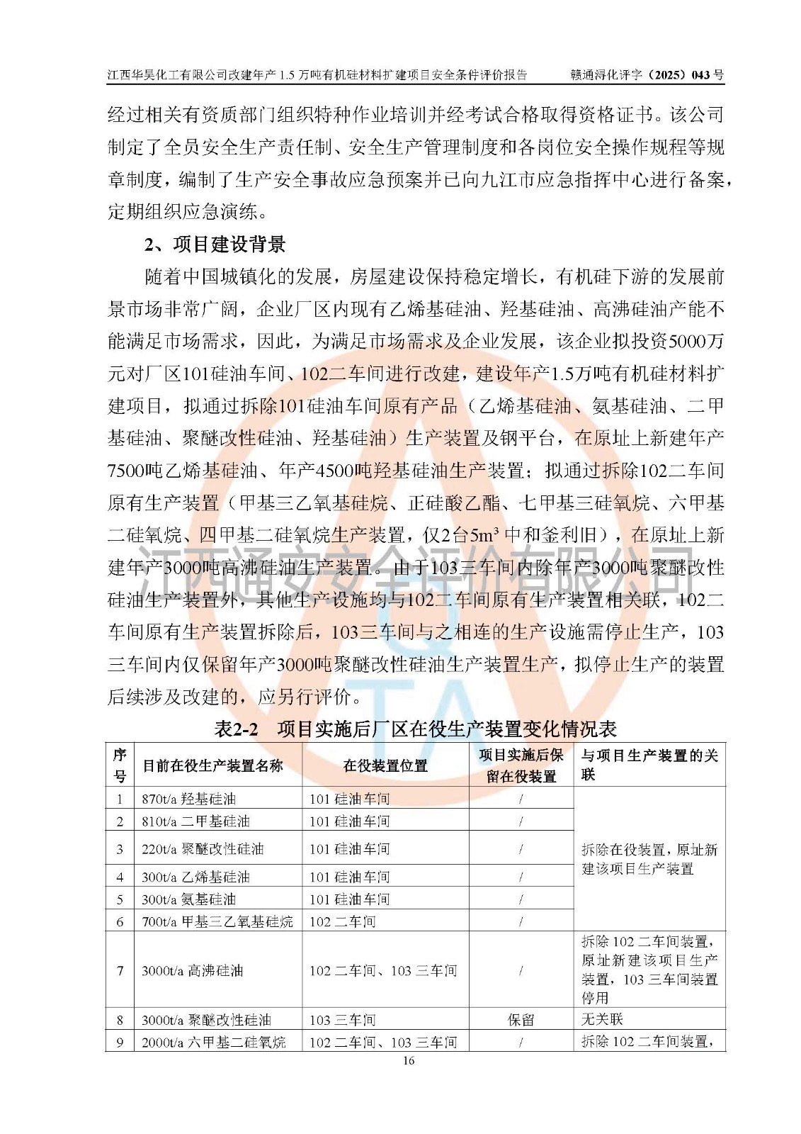 江西華昊化工有限公司是一家于2011年11月注冊成立的有限責任公司(自然人投資或控股),注冊地址位于永修縣云山經(jīng)濟開發(fā)區(qū)星火工業(yè)園星云大道旁,法定**人柴利兵,注冊資本1542萬元,經(jīng)營范圍包括許可項目和一般項目,許可項目為危險化學品生產(chǎn)、危險化學品經(jīng)營、貨物進出口、第二類醫(yī)療器械生產(chǎn),一般項目為合成材料制造(不含危險化學品)、合成材料銷售、第二類醫(yī)療器械銷售。 為滿足更大市場需求,同時解決企業(yè)原料及配套生產(chǎn)的需求,江西華昊化工有限公司擬投資5000萬元將廠區(qū)101硅油車間、102二車間原有項目改建為年產(chǎn)1.5萬噸有機硅材料擴建項目(以下簡稱“該項目”)。 該項目生產(chǎn)過程涉及的化學反應包括聚合(常壓)、水解、中和,涉及蒸餾、壓濾、流體輸送、熱交換、產(chǎn)品包裝等化工單元操作過程。該項目涉及的危險化學品包括四甲基氫氧化銨、氫氧化鉀、磷酸、30%氫氧化鈉溶液、六甲基二硅氧烷、乙醇、氯化氫、鹽酸、氮氣、DMC(二甲基環(huán)硅氧烷的混合物)、有機硅單體高沸物、**胺(廢氣組分)、甲醇(廢氣組分)、甲醚(廢氣組分),其中甲醇、甲醚屬于重點監(jiān)管的危險化學品,鹽酸屬于第三類易制毒化學品,乙醇、甲醇、甲醚屬于特別管控危險化學品,四甲基氫氧化銨、乙醇、**胺、甲醇、甲醚屬于第四類監(jiān)控化學品。該項目不涉及劇毒品、易制爆化學品、高毒物品,不涉及**、二、三類監(jiān)控化學品。 該項目不涉及重點監(jiān)管的典型危險化工工藝,生產(chǎn)單元、儲存單元不構成危險化學品重大危險源。 該項目副產(chǎn)品鹽酸、中間產(chǎn)品低粘度封頭劑(六甲基二硅氧烷)屬于危險化學品,該項目屬于危險化學品生產(chǎn)項目,依據(jù)《危險化學品生產(chǎn)企業(yè)安全生產(chǎn)許可證實施辦法》(**安全生產(chǎn)監(jiān)督管理總局令第41號,第79號、89號修改),項目需要辦理危險化學品安全生產(chǎn)許可證。 |