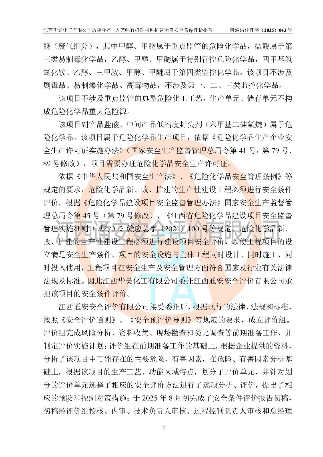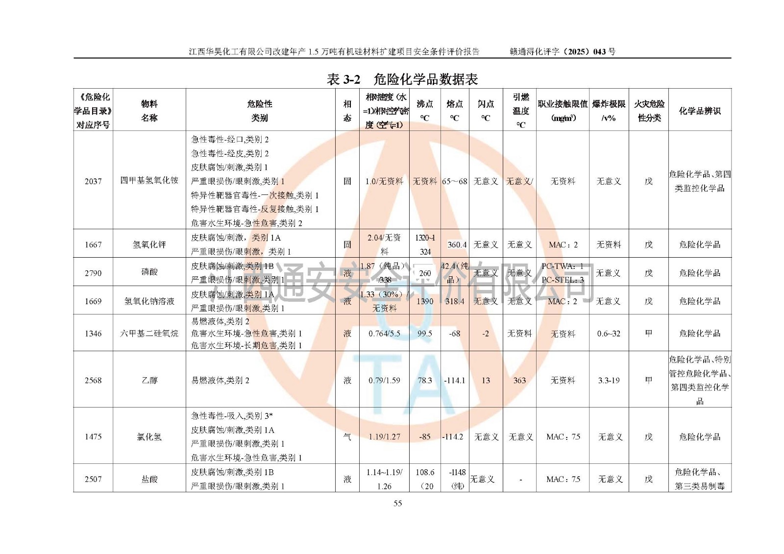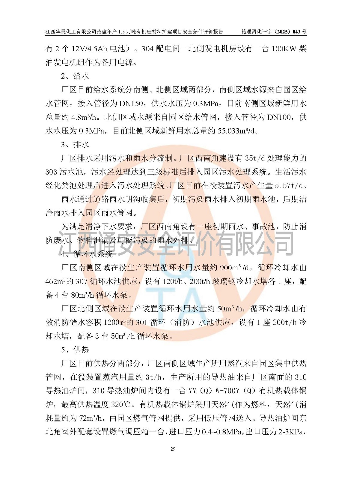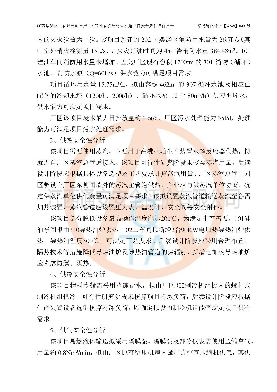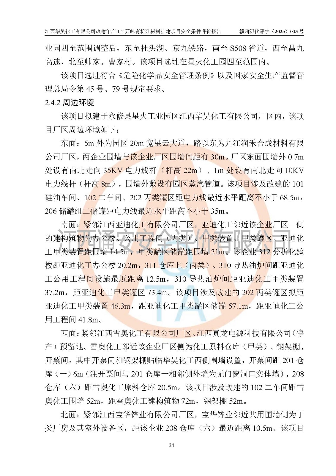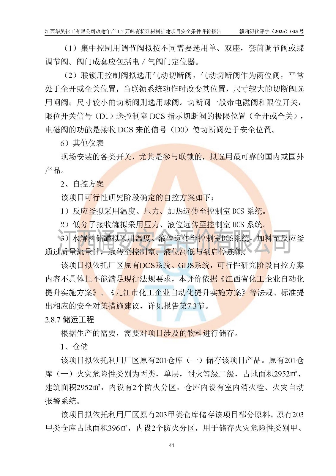 江西華昊化工有限公司是一家于2011年11月注冊成立的有限責任公司(自然人投資或控股),注冊地址位于永修縣云山經(jīng)濟開發(fā)區(qū)星火工業(yè)園星云大道旁,法定**人柴利兵,注冊資本1542萬元,經(jīng)營范圍包括許可項目和一般項目,許可項目為危險化學品生產(chǎn)、危險化學品經(jīng)營、貨物進出口、第二類醫(yī)療器械生產(chǎn),一般項目為合成材料制造(不含危險化學品)、合成材料銷售、第二類醫(yī)療器械銷售。 為滿足更大市場需求,同時解決企業(yè)原料及配套生產(chǎn)的需求,江西華昊化工有限公司擬投資5000萬元將廠區(qū)101硅油車間、102二車間原有項目改建為年產(chǎn)1.5萬噸有機硅材料擴建項目(以下簡稱“該項目”)。 該項目生產(chǎn)過程涉及的化學反應包括聚合(常壓)、水解、中和,涉及蒸餾、壓濾、流體輸送、熱交換、產(chǎn)品包裝等化工單元操作過程。該項目涉及的危險化學品包括四甲基氫氧化銨、氫氧化鉀、磷酸、30%氫氧化鈉溶液、六甲基二硅氧烷、乙醇、氯化氫、鹽酸、氮氣、DMC(二甲基環(huán)硅氧烷的混合物)、有機硅單體高沸物、**胺(廢氣組分)、甲醇(廢氣組分)、甲醚(廢氣組分),其中甲醇、甲醚屬于重點監(jiān)管的危險化學品,鹽酸屬于第三類易制毒化學品,乙醇、甲醇、甲醚屬于特別管控危險化學品,四甲基氫氧化銨、乙醇、**胺、甲醇、甲醚屬于第四類監(jiān)控化學品。該項目不涉及劇毒品、易制爆化學品、高毒物品,不涉及**、二、三類監(jiān)控化學品。 該項目不涉及重點監(jiān)管的典型危險化工工藝,生產(chǎn)單元、儲存單元不構成危險化學品重大危險源。 該項目副產(chǎn)品鹽酸、中間產(chǎn)品低粘度封頭劑(六甲基二硅氧烷)屬于危險化學品,該項目屬于危險化學品生產(chǎn)項目,依據(jù)《危險化學品生產(chǎn)企業(yè)安全生產(chǎn)許可證實施辦法》(**安全生產(chǎn)監(jiān)督管理總局令第41號,第79號、89號修改),項目需要辦理危險化學品安全生產(chǎn)許可證。 |