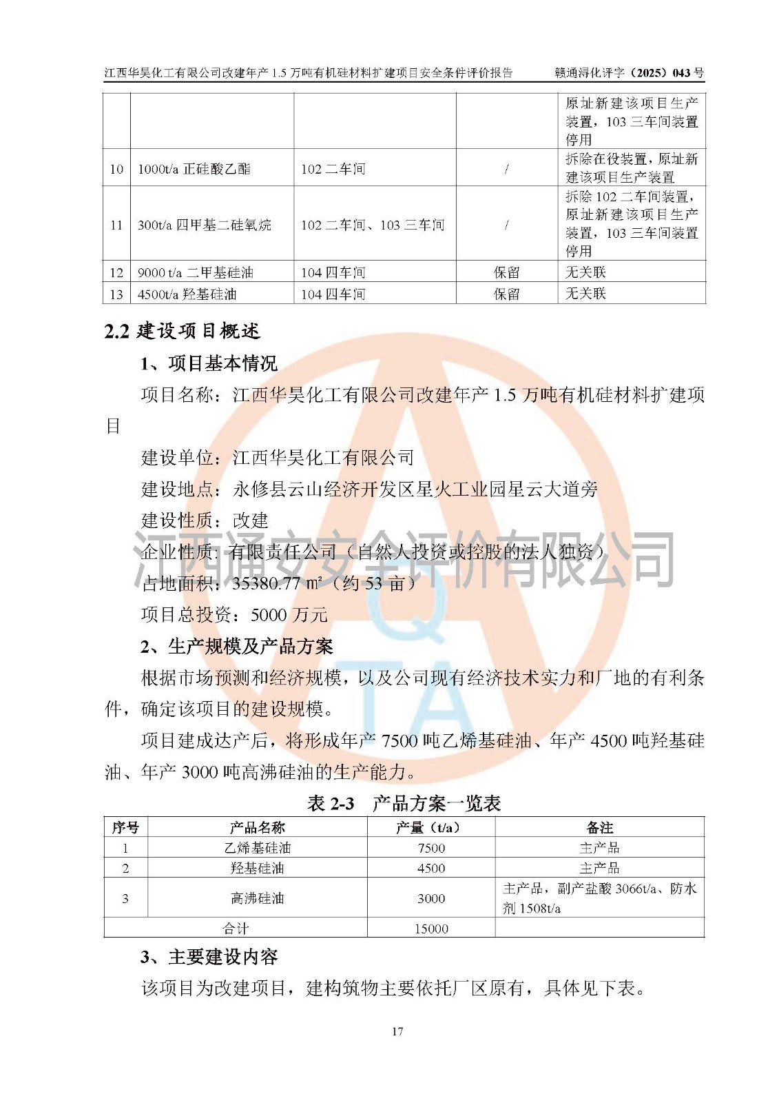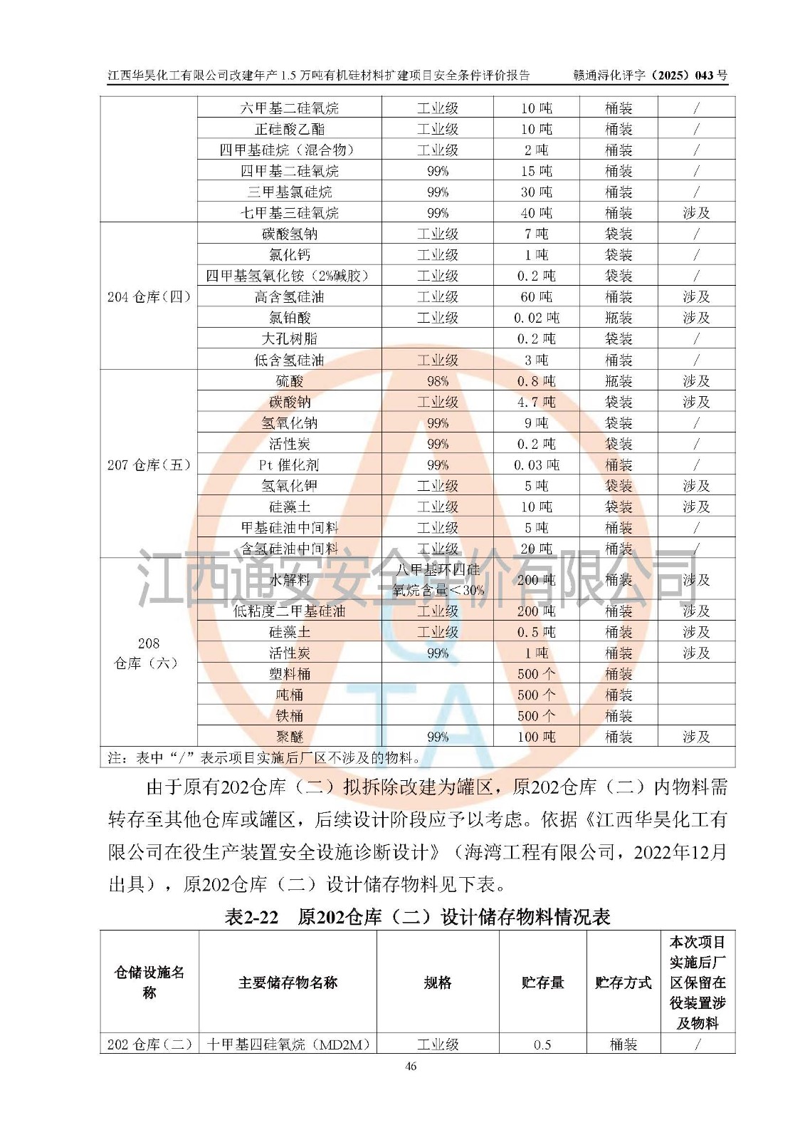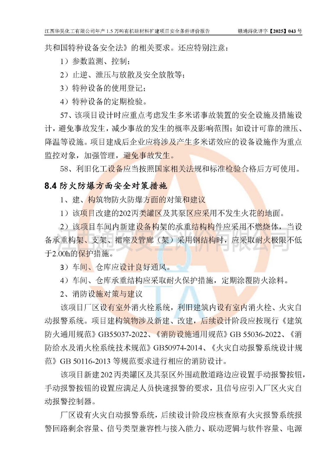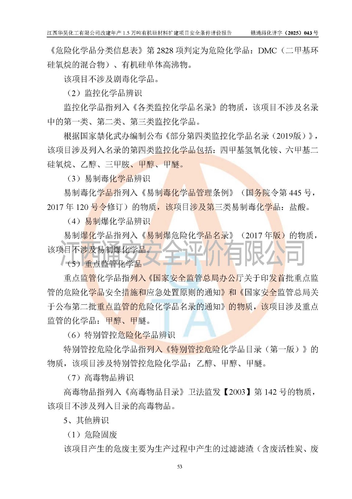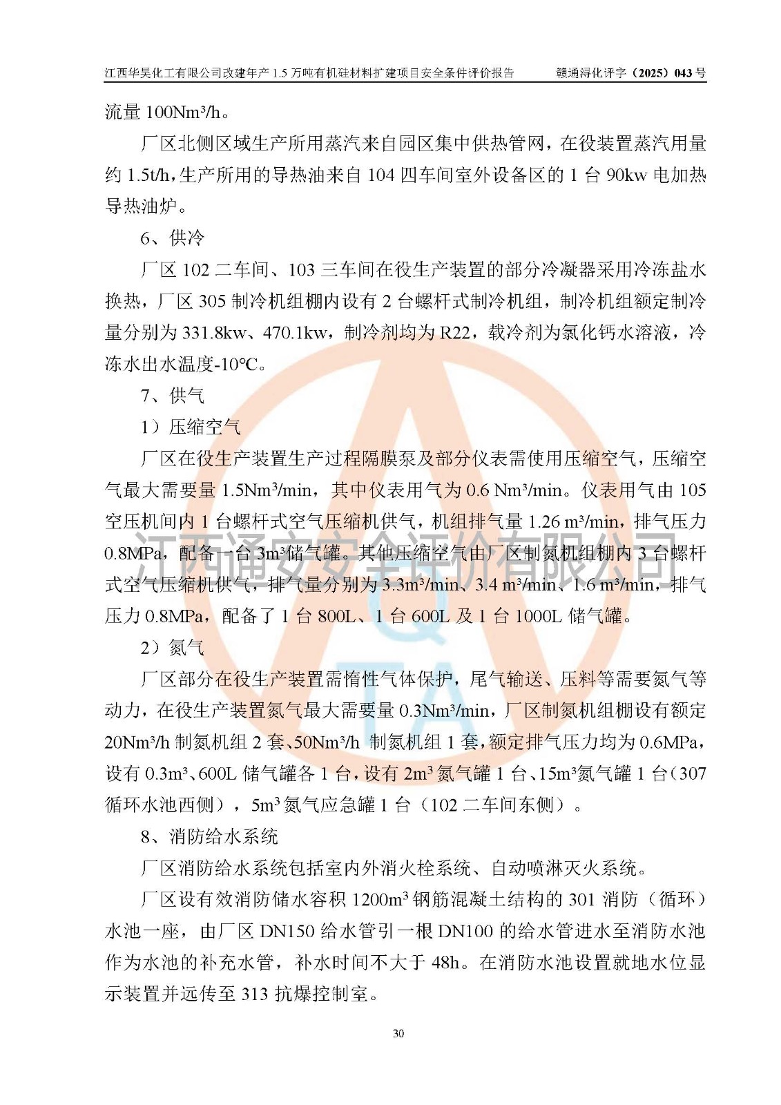 江西華昊化工有限公司是一家于2011年11月注冊成立的有限責任公司(自然人投資或控股),注冊地址位于永修縣云山經(jīng)濟開發(fā)區(qū)星火工業(yè)園星云大道旁,法定**人柴利兵,注冊資本1542萬元,經(jīng)營范圍包括許可項目和一般項目,許可項目為危險化學品生產(chǎn)、危險化學品經(jīng)營、貨物進出口、第二類醫(yī)療器械生產(chǎn),一般項目為合成材料制造(不含危險化學品)、合成材料銷售、第二類醫(yī)療器械銷售。 為滿足更大市場需求,同時解決企業(yè)原料及配套生產(chǎn)的需求,江西華昊化工有限公司擬投資5000萬元將廠區(qū)101硅油車間、102二車間原有項目改建為年產(chǎn)1.5萬噸有機硅材料擴建項目(以下簡稱“該項目”)。 該項目生產(chǎn)過程涉及的化學反應包括聚合(常壓)、水解、中和,涉及蒸餾、壓濾、流體輸送、熱交換、產(chǎn)品包裝等化工單元操作過程。該項目涉及的危險化學品包括四甲基氫氧化銨、氫氧化鉀、磷酸、30%氫氧化鈉溶液、六甲基二硅氧烷、乙醇、氯化氫、鹽酸、氮氣、DMC(二甲基環(huán)硅氧烷的混合物)、有機硅單體高沸物、**胺(廢氣組分)、甲醇(廢氣組分)、甲醚(廢氣組分),其中甲醇、甲醚屬于重點監(jiān)管的危險化學品,鹽酸屬于第三類易制毒化學品,乙醇、甲醇、甲醚屬于特別管控危險化學品,四甲基氫氧化銨、乙醇、**胺、甲醇、甲醚屬于第四類監(jiān)控化學品。該項目不涉及劇毒品、易制爆化學品、高毒物品,不涉及**、二、三類監(jiān)控化學品。 該項目不涉及重點監(jiān)管的典型危險化工工藝,生產(chǎn)單元、儲存單元不構成危險化學品重大危險源。 該項目副產(chǎn)品鹽酸、中間產(chǎn)品低粘度封頭劑(六甲基二硅氧烷)屬于危險化學品,該項目屬于危險化學品生產(chǎn)項目,依據(jù)《危險化學品生產(chǎn)企業(yè)安全生產(chǎn)許可證實施辦法》(**安全生產(chǎn)監(jiān)督管理總局令第41號,第79號、89號修改),項目需要辦理危險化學品安全生產(chǎn)許可證。 |