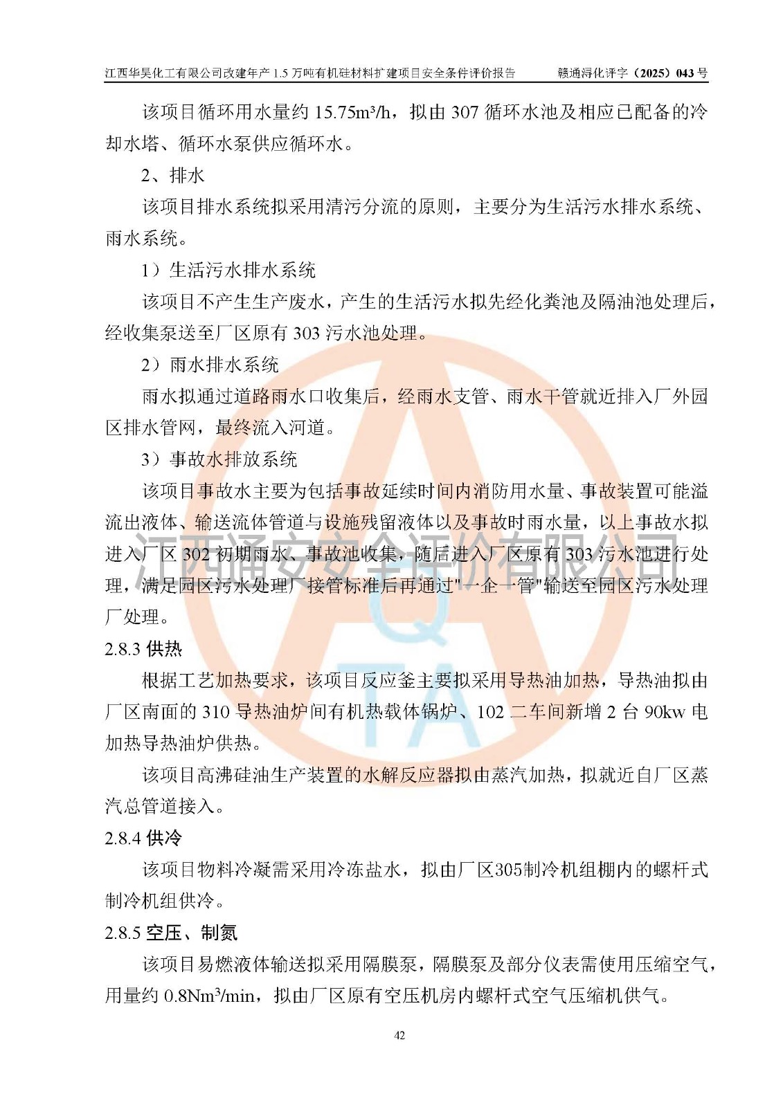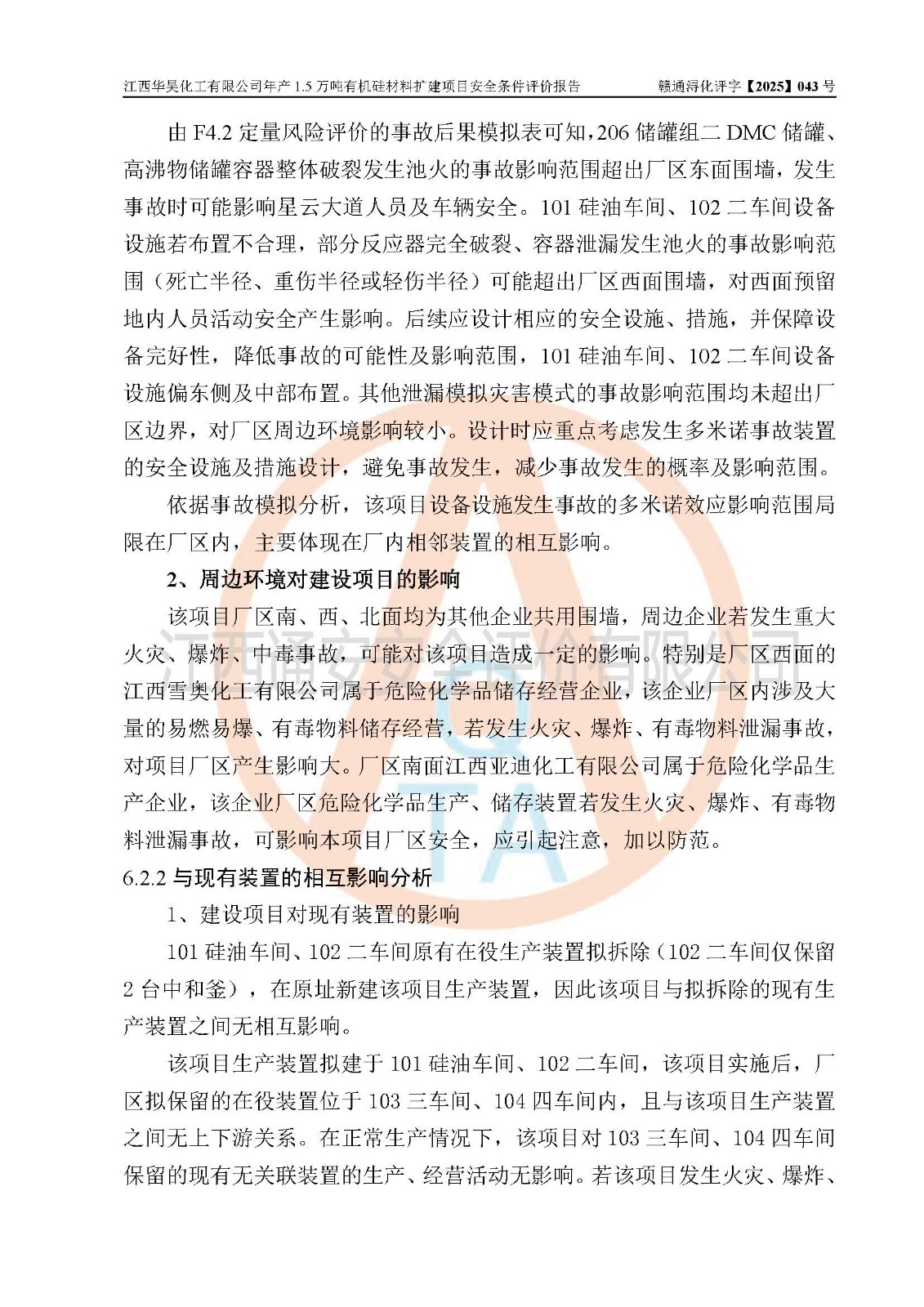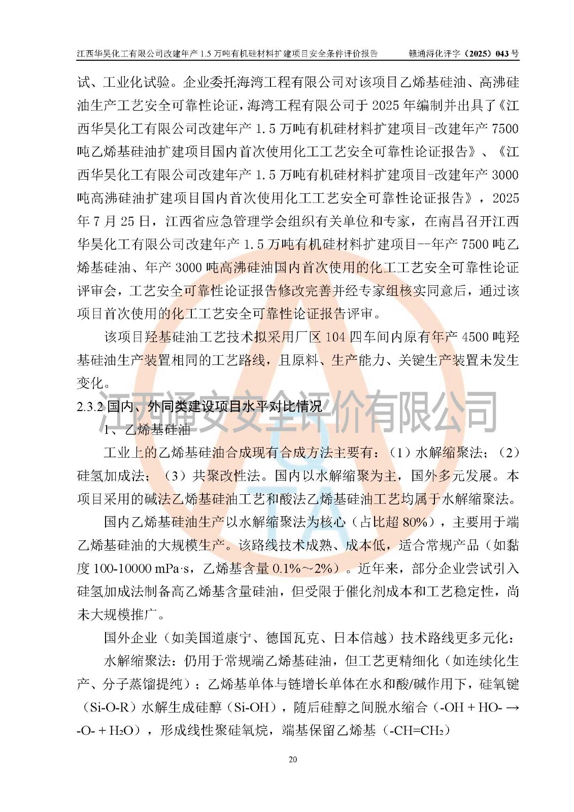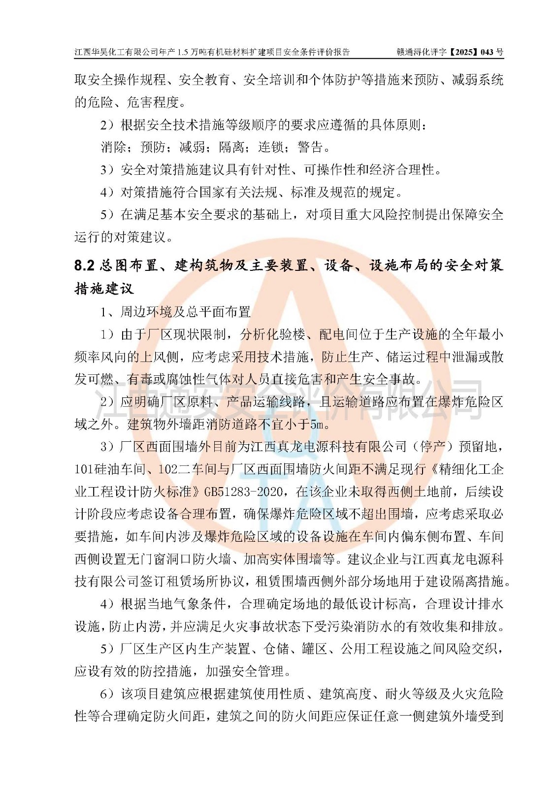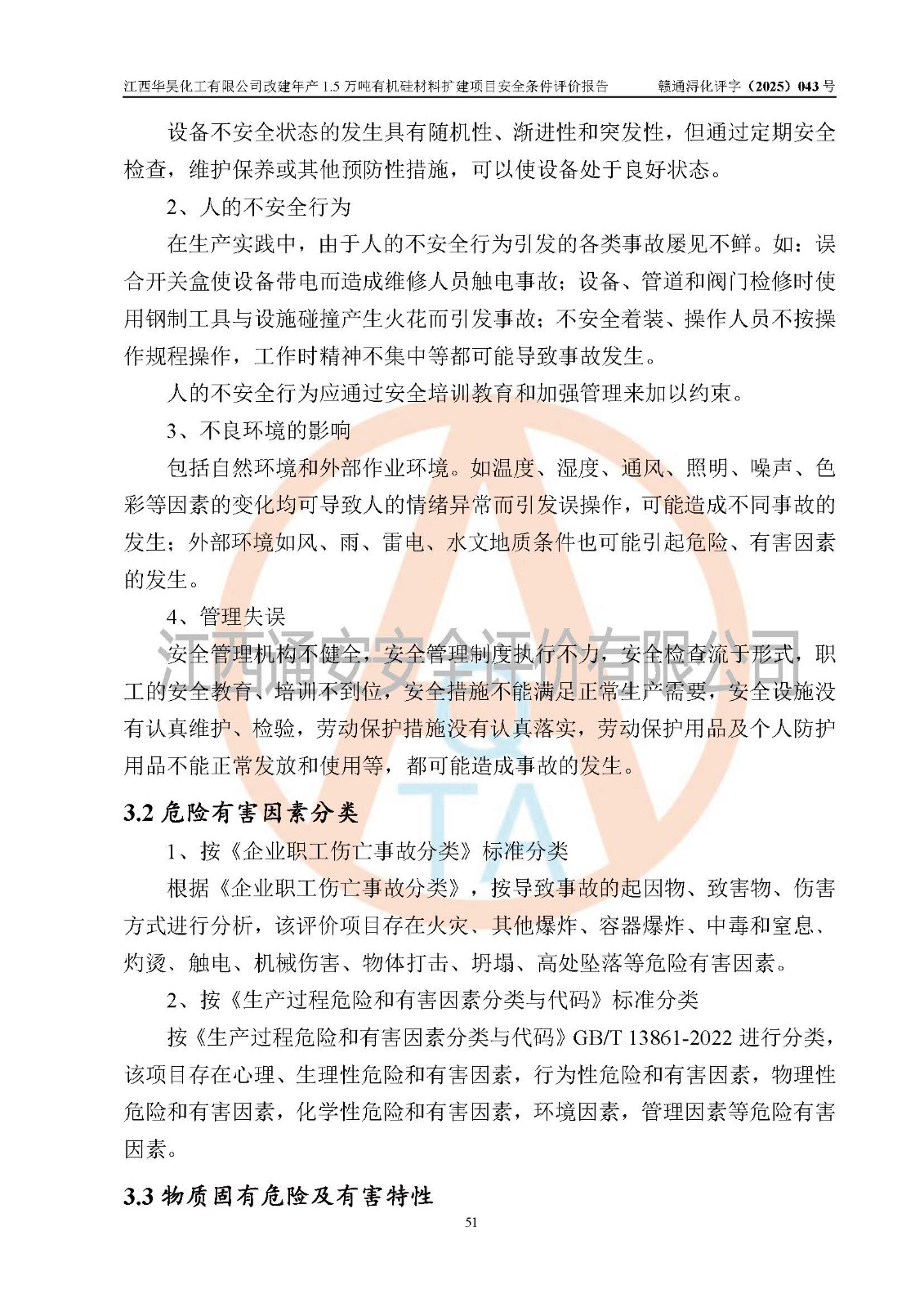 江西華昊化工有限公司是一家于2011年11月注冊成立的有限責任公司(自然人投資或控股),注冊地址位于永修縣云山經(jīng)濟開發(fā)區(qū)星火工業(yè)園星云大道旁,法定**人柴利兵,注冊資本1542萬元,經(jīng)營范圍包括許可項目和一般項目,許可項目為危險化學品生產(chǎn)、危險化學品經(jīng)營、貨物進出口、第二類醫(yī)療器械生產(chǎn),一般項目為合成材料制造(不含危險化學品)、合成材料銷售、第二類醫(yī)療器械銷售。 為滿足更大市場需求,同時解決企業(yè)原料及配套生產(chǎn)的需求,江西華昊化工有限公司擬投資5000萬元將廠區(qū)101硅油車間、102二車間原有項目改建為年產(chǎn)1.5萬噸有機硅材料擴建項目(以下簡稱“該項目”)。 該項目生產(chǎn)過程涉及的化學反應包括聚合(常壓)、水解、中和,涉及蒸餾、壓濾、流體輸送、熱交換、產(chǎn)品包裝等化工單元操作過程。該項目涉及的危險化學品包括四甲基氫氧化銨、氫氧化鉀、磷酸、30%氫氧化鈉溶液、六甲基二硅氧烷、乙醇、氯化氫、鹽酸、氮氣、DMC(二甲基環(huán)硅氧烷的混合物)、有機硅單體高沸物、**胺(廢氣組分)、甲醇(廢氣組分)、甲醚(廢氣組分),其中甲醇、甲醚屬于重點監(jiān)管的危險化學品,鹽酸屬于第三類易制毒化學品,乙醇、甲醇、甲醚屬于特別管控危險化學品,四甲基氫氧化銨、乙醇、**胺、甲醇、甲醚屬于第四類監(jiān)控化學品。該項目不涉及劇毒品、易制爆化學品、高毒物品,不涉及**、二、三類監(jiān)控化學品。 該項目不涉及重點監(jiān)管的典型危險化工工藝,生產(chǎn)單元、儲存單元不構成危險化學品重大危險源。 該項目副產(chǎn)品鹽酸、中間產(chǎn)品低粘度封頭劑(六甲基二硅氧烷)屬于危險化學品,該項目屬于危險化學品生產(chǎn)項目,依據(jù)《危險化學品生產(chǎn)企業(yè)安全生產(chǎn)許可證實施辦法》(**安全生產(chǎn)監(jiān)督管理總局令第41號,第79號、89號修改),項目需要辦理危險化學品安全生產(chǎn)許可證。 |