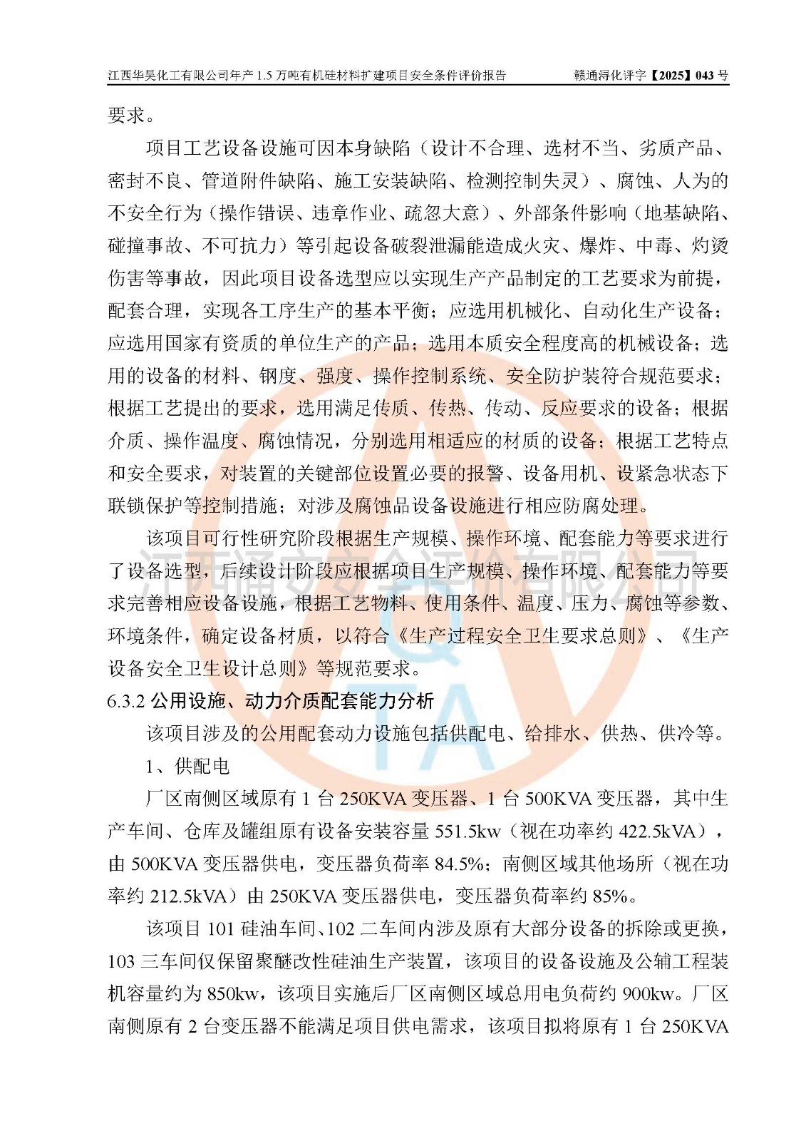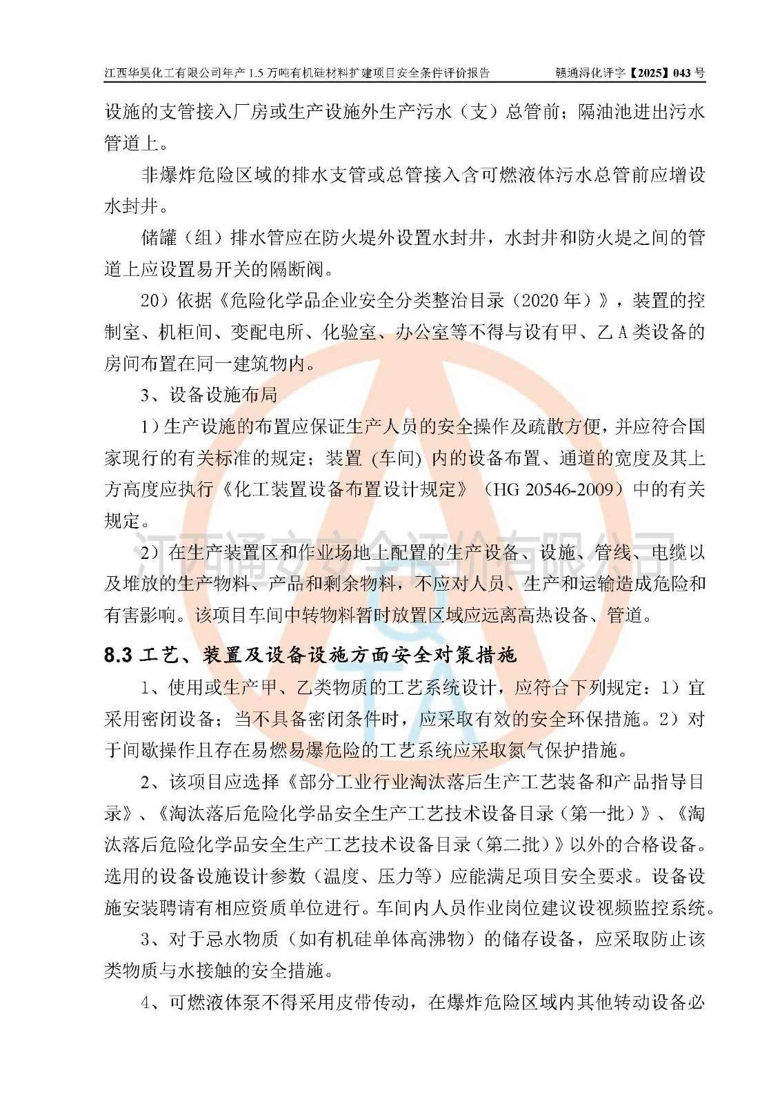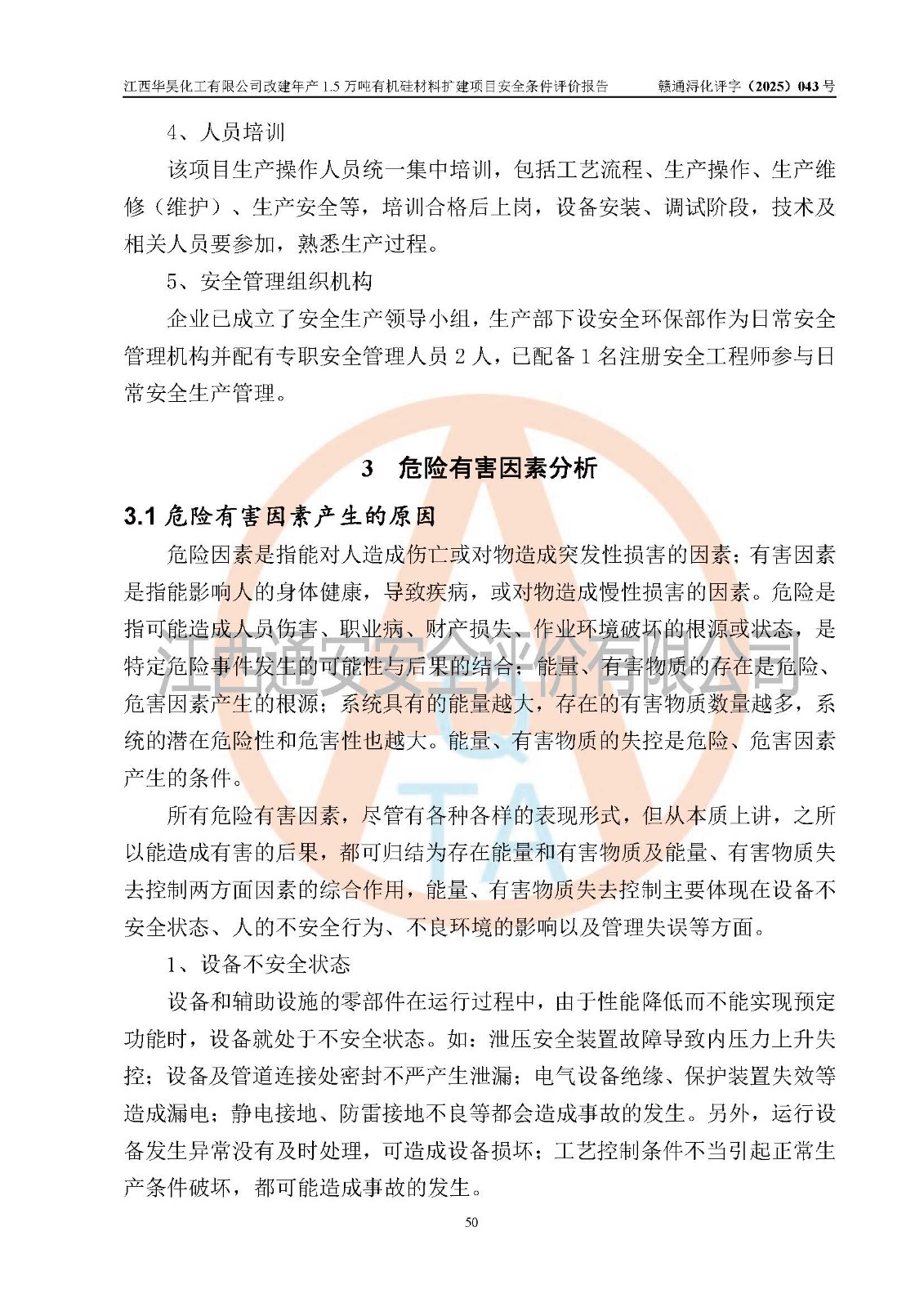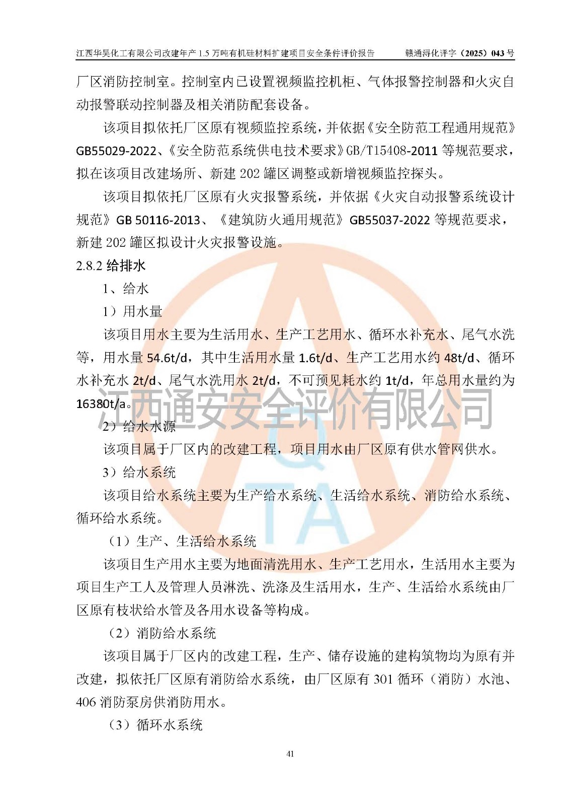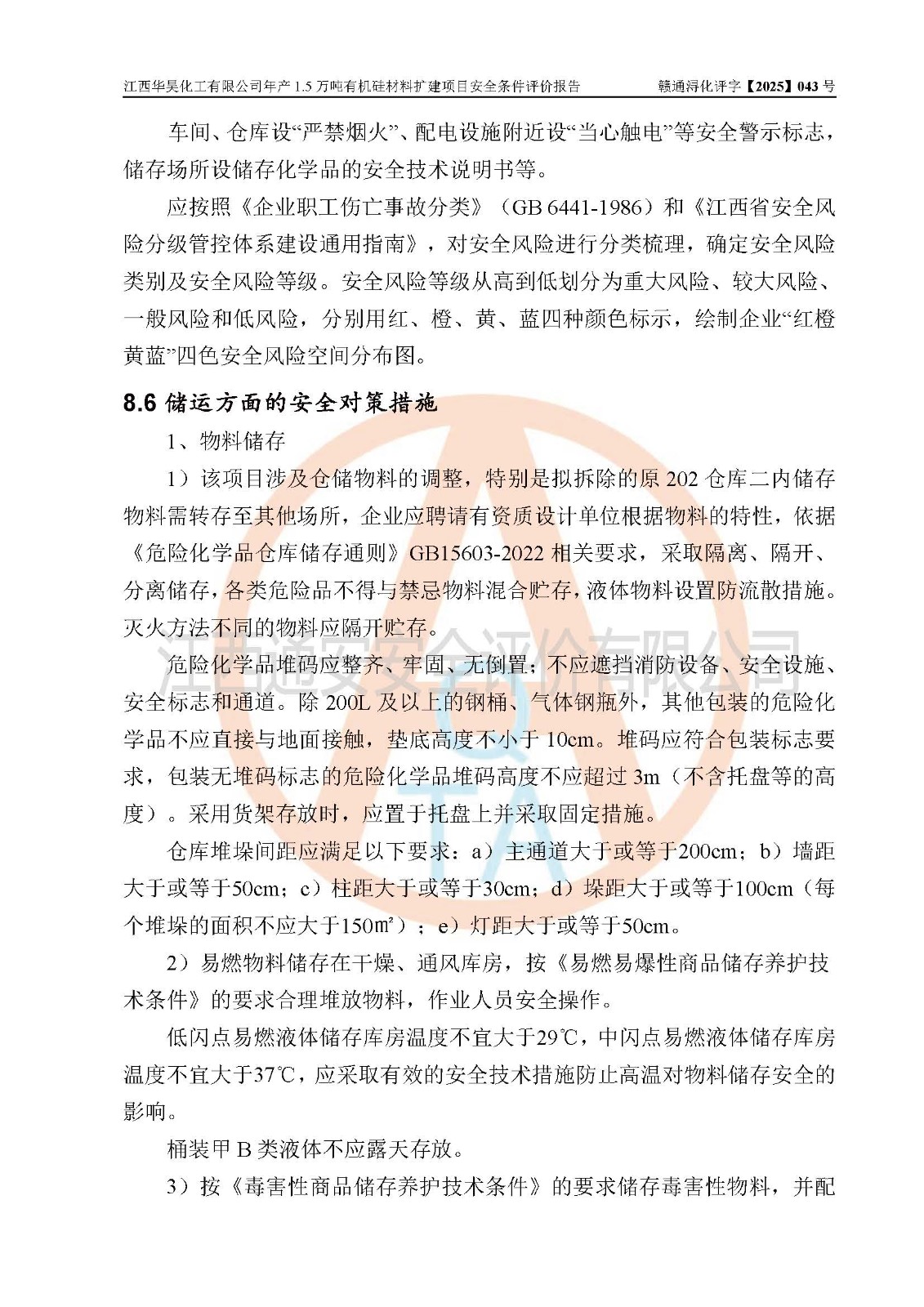 江西華昊化工有限公司是一家于2011年11月注冊成立的有限責任公司(自然人投資或控股),注冊地址位于永修縣云山經(jīng)濟開發(fā)區(qū)星火工業(yè)園星云大道旁,法定**人柴利兵,注冊資本1542萬元,經(jīng)營范圍包括許可項目和一般項目,許可項目為危險化學品生產(chǎn)、危險化學品經(jīng)營、貨物進出口、第二類醫(yī)療器械生產(chǎn),一般項目為合成材料制造(不含危險化學品)、合成材料銷售、第二類醫(yī)療器械銷售。 為滿足更大市場需求,同時解決企業(yè)原料及配套生產(chǎn)的需求,江西華昊化工有限公司擬投資5000萬元將廠區(qū)101硅油車間、102二車間原有項目改建為年產(chǎn)1.5萬噸有機硅材料擴建項目(以下簡稱“該項目”)。 該項目生產(chǎn)過程涉及的化學反應包括聚合(常壓)、水解、中和,涉及蒸餾、壓濾、流體輸送、熱交換、產(chǎn)品包裝等化工單元操作過程。該項目涉及的危險化學品包括四甲基氫氧化銨、氫氧化鉀、磷酸、30%氫氧化鈉溶液、六甲基二硅氧烷、乙醇、氯化氫、鹽酸、氮氣、DMC(二甲基環(huán)硅氧烷的混合物)、有機硅單體高沸物、**胺(廢氣組分)、甲醇(廢氣組分)、甲醚(廢氣組分),其中甲醇、甲醚屬于重點監(jiān)管的危險化學品,鹽酸屬于第三類易制毒化學品,乙醇、甲醇、甲醚屬于特別管控危險化學品,四甲基氫氧化銨、乙醇、**胺、甲醇、甲醚屬于第四類監(jiān)控化學品。該項目不涉及劇毒品、易制爆化學品、高毒物品,不涉及**、二、三類監(jiān)控化學品。 該項目不涉及重點監(jiān)管的典型危險化工工藝,生產(chǎn)單元、儲存單元不構成危險化學品重大危險源。 該項目副產(chǎn)品鹽酸、中間產(chǎn)品低粘度封頭劑(六甲基二硅氧烷)屬于危險化學品,該項目屬于危險化學品生產(chǎn)項目,依據(jù)《危險化學品生產(chǎn)企業(yè)安全生產(chǎn)許可證實施辦法》(**安全生產(chǎn)監(jiān)督管理總局令第41號,第79號、89號修改),項目需要辦理危險化學品安全生產(chǎn)許可證。 |