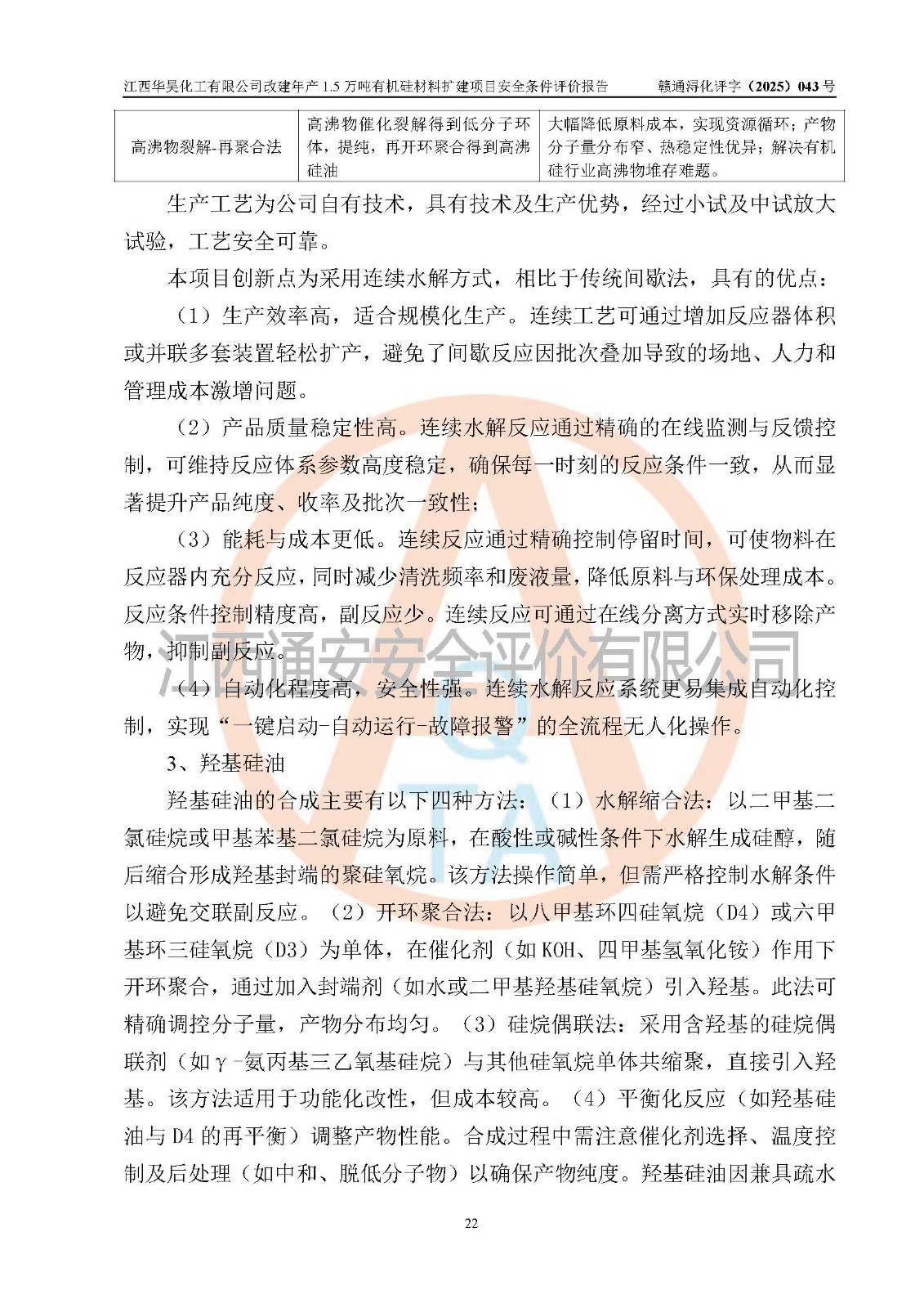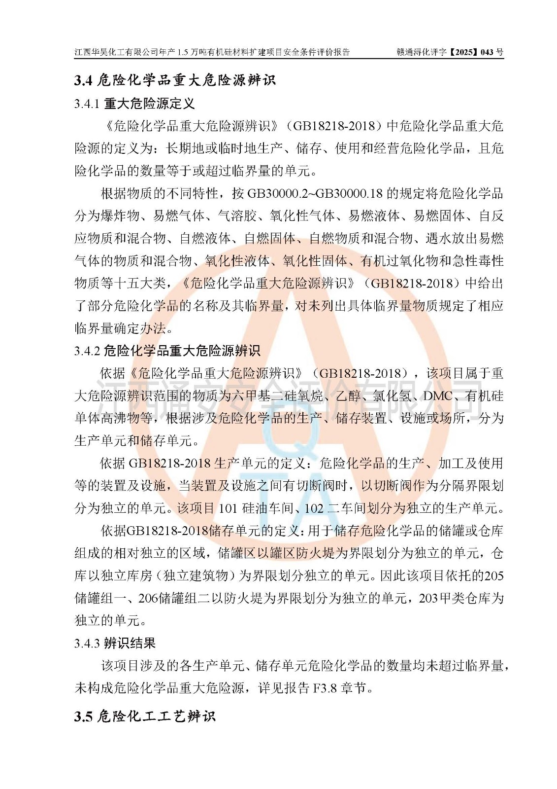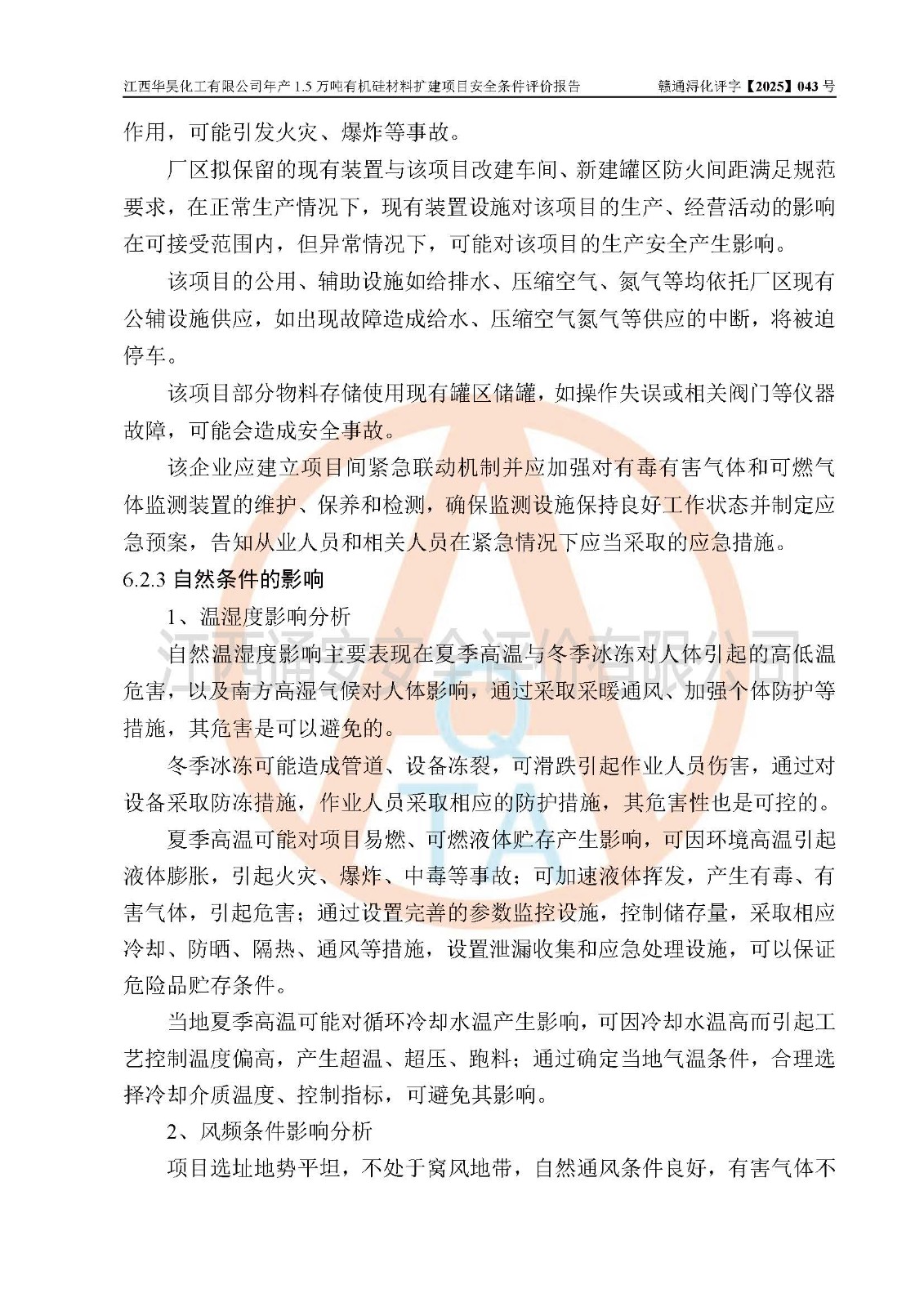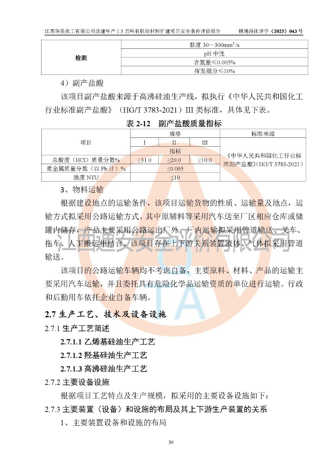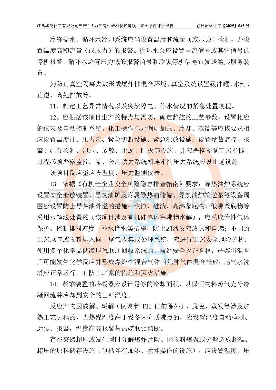 江西華昊化工有限公司是一家于2011年11月注冊成立的有限責任公司(自然人投資或控股),注冊地址位于永修縣云山經(jīng)濟開發(fā)區(qū)星火工業(yè)園星云大道旁,法定**人柴利兵,注冊資本1542萬元,經(jīng)營范圍包括許可項目和一般項目,許可項目為危險化學品生產(chǎn)、危險化學品經(jīng)營、貨物進出口、第二類醫(yī)療器械生產(chǎn),一般項目為合成材料制造(不含危險化學品)、合成材料銷售、第二類醫(yī)療器械銷售。 為滿足更大市場需求,同時解決企業(yè)原料及配套生產(chǎn)的需求,江西華昊化工有限公司擬投資5000萬元將廠區(qū)101硅油車間、102二車間原有項目改建為年產(chǎn)1.5萬噸有機硅材料擴建項目(以下簡稱“該項目”)。 該項目生產(chǎn)過程涉及的化學反應包括聚合(常壓)、水解、中和,涉及蒸餾、壓濾、流體輸送、熱交換、產(chǎn)品包裝等化工單元操作過程。該項目涉及的危險化學品包括四甲基氫氧化銨、氫氧化鉀、磷酸、30%氫氧化鈉溶液、六甲基二硅氧烷、乙醇、氯化氫、鹽酸、氮氣、DMC(二甲基環(huán)硅氧烷的混合物)、有機硅單體高沸物、**胺(廢氣組分)、甲醇(廢氣組分)、甲醚(廢氣組分),其中甲醇、甲醚屬于重點監(jiān)管的危險化學品,鹽酸屬于第三類易制毒化學品,乙醇、甲醇、甲醚屬于特別管控危險化學品,四甲基氫氧化銨、乙醇、**胺、甲醇、甲醚屬于第四類監(jiān)控化學品。該項目不涉及劇毒品、易制爆化學品、高毒物品,不涉及**、二、三類監(jiān)控化學品。 該項目不涉及重點監(jiān)管的典型危險化工工藝,生產(chǎn)單元、儲存單元不構成危險化學品重大危險源。 該項目副產(chǎn)品鹽酸、中間產(chǎn)品低粘度封頭劑(六甲基二硅氧烷)屬于危險化學品,該項目屬于危險化學品生產(chǎn)項目,依據(jù)《危險化學品生產(chǎn)企業(yè)安全生產(chǎn)許可證實施辦法》(**安全生產(chǎn)監(jiān)督管理總局令第41號,第79號、89號修改),項目需要辦理危險化學品安全生產(chǎn)許可證。 |
