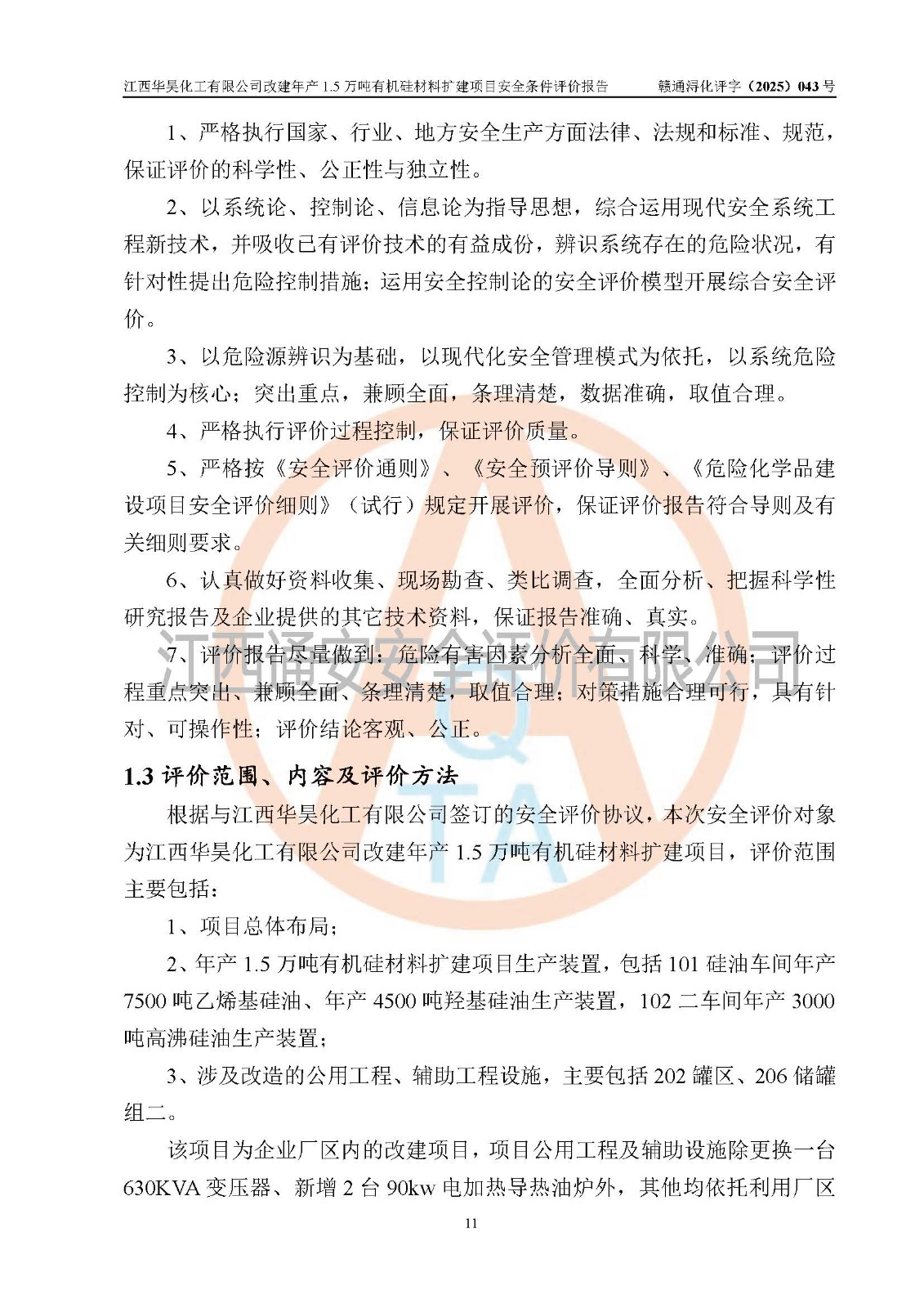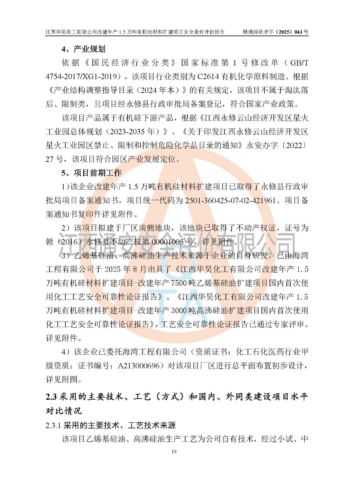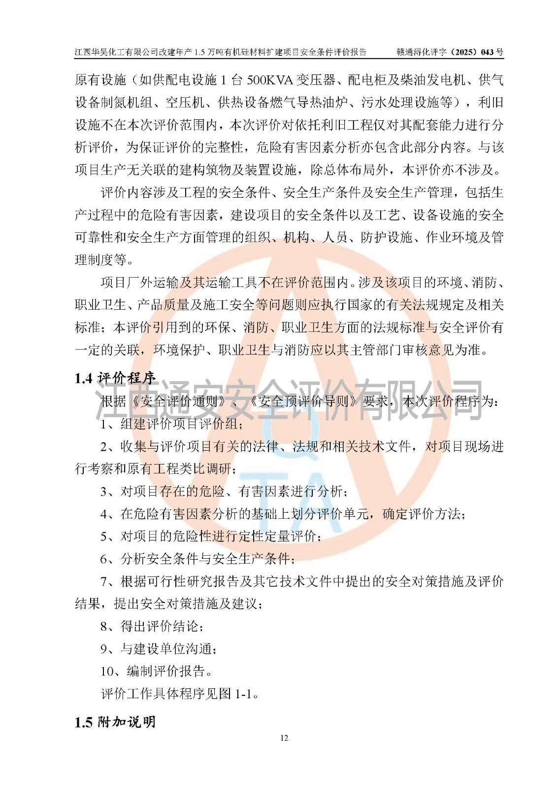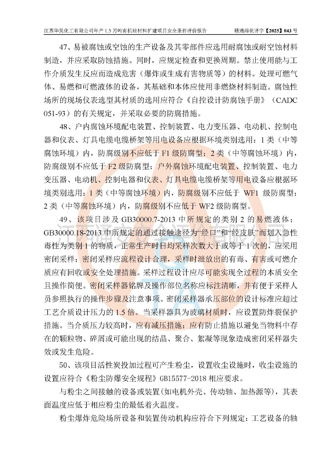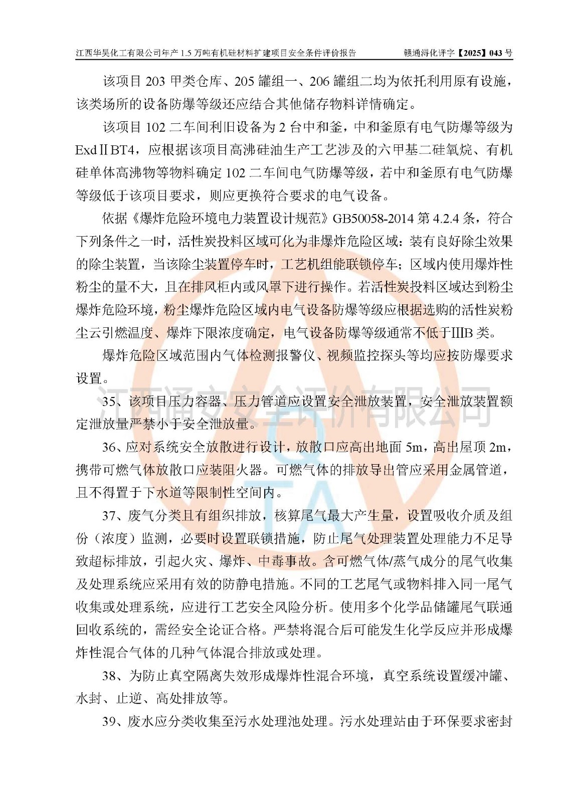 江西華昊化工有限公司是一家于2011年11月注冊成立的有限責任公司(自然人投資或控股),注冊地址位于永修縣云山經(jīng)濟開發(fā)區(qū)星火工業(yè)園星云大道旁,法定**人柴利兵,注冊資本1542萬元,經(jīng)營范圍包括許可項目和一般項目,許可項目為危險化學品生產(chǎn)、危險化學品經(jīng)營、貨物進出口、第二類醫(yī)療器械生產(chǎn),一般項目為合成材料制造(不含危險化學品)、合成材料銷售、第二類醫(yī)療器械銷售。 為滿足更大市場需求,同時解決企業(yè)原料及配套生產(chǎn)的需求,江西華昊化工有限公司擬投資5000萬元將廠區(qū)101硅油車間、102二車間原有項目改建為年產(chǎn)1.5萬噸有機硅材料擴建項目(以下簡稱“該項目”)。 該項目生產(chǎn)過程涉及的化學反應包括聚合(常壓)、水解、中和,涉及蒸餾、壓濾、流體輸送、熱交換、產(chǎn)品包裝等化工單元操作過程。該項目涉及的危險化學品包括四甲基氫氧化銨、氫氧化鉀、磷酸、30%氫氧化鈉溶液、六甲基二硅氧烷、乙醇、氯化氫、鹽酸、氮氣、DMC(二甲基環(huán)硅氧烷的混合物)、有機硅單體高沸物、**胺(廢氣組分)、甲醇(廢氣組分)、甲醚(廢氣組分),其中甲醇、甲醚屬于重點監(jiān)管的危險化學品,鹽酸屬于第三類易制毒化學品,乙醇、甲醇、甲醚屬于特別管控危險化學品,四甲基氫氧化銨、乙醇、**胺、甲醇、甲醚屬于第四類監(jiān)控化學品。該項目不涉及劇毒品、易制爆化學品、高毒物品,不涉及**、二、三類監(jiān)控化學品。 該項目不涉及重點監(jiān)管的典型危險化工工藝,生產(chǎn)單元、儲存單元不構成危險化學品重大危險源。 該項目副產(chǎn)品鹽酸、中間產(chǎn)品低粘度封頭劑(六甲基二硅氧烷)屬于危險化學品,該項目屬于危險化學品生產(chǎn)項目,依據(jù)《危險化學品生產(chǎn)企業(yè)安全生產(chǎn)許可證實施辦法》(**安全生產(chǎn)監(jiān)督管理總局令第41號,第79號、89號修改),項目需要辦理危險化學品安全生產(chǎn)許可證。 |