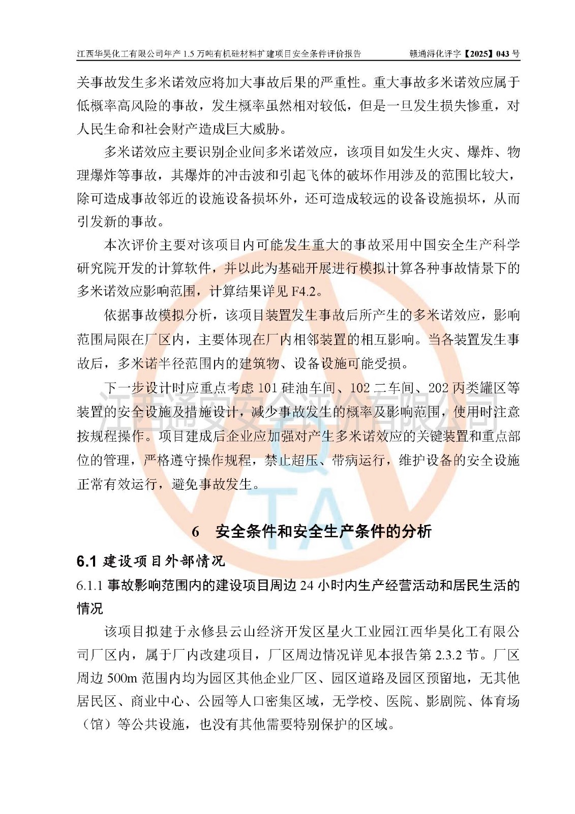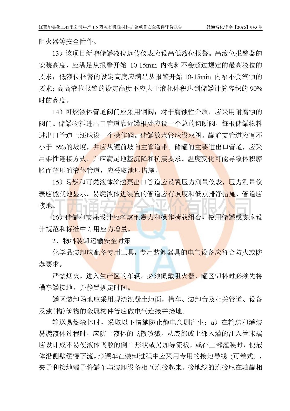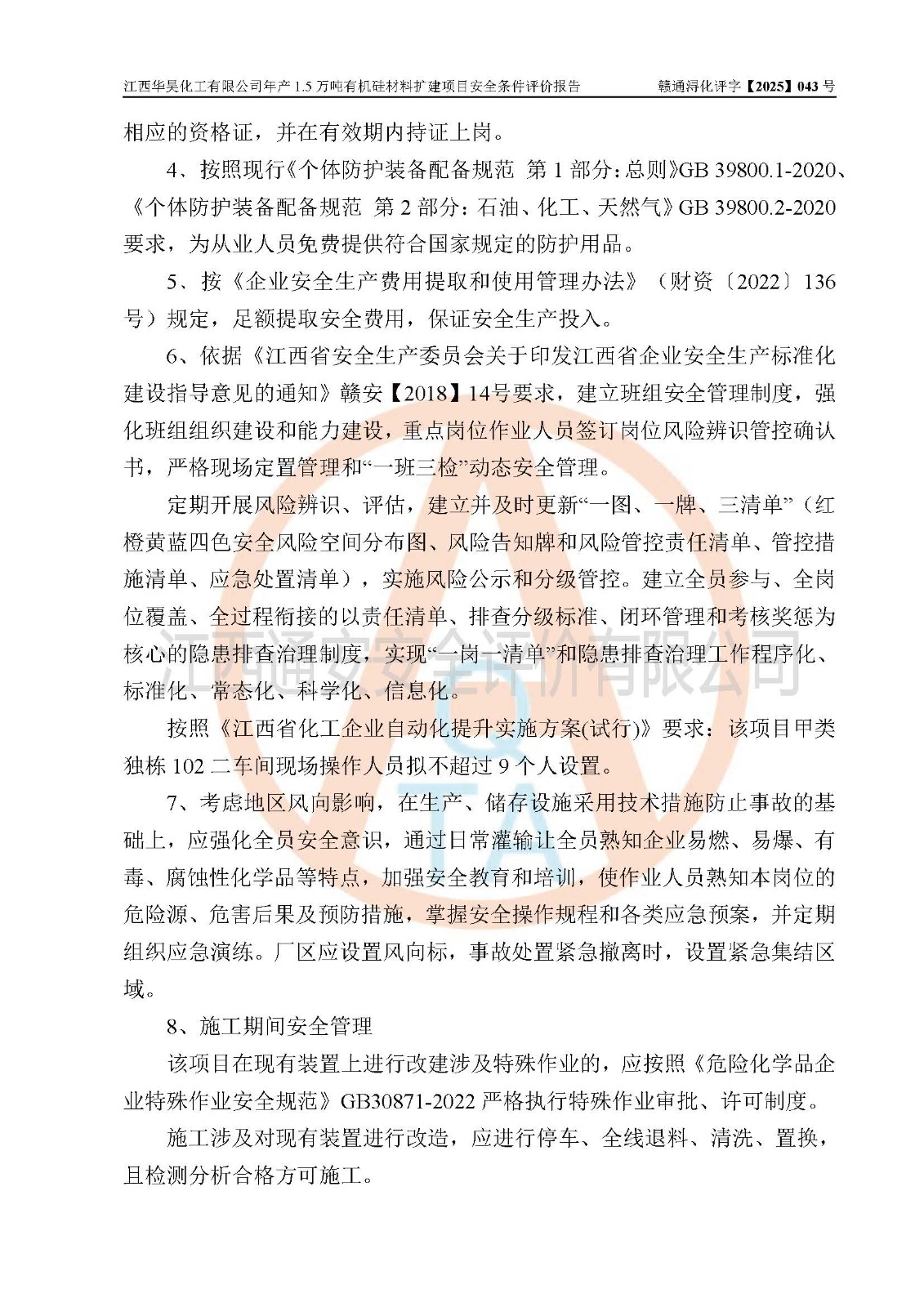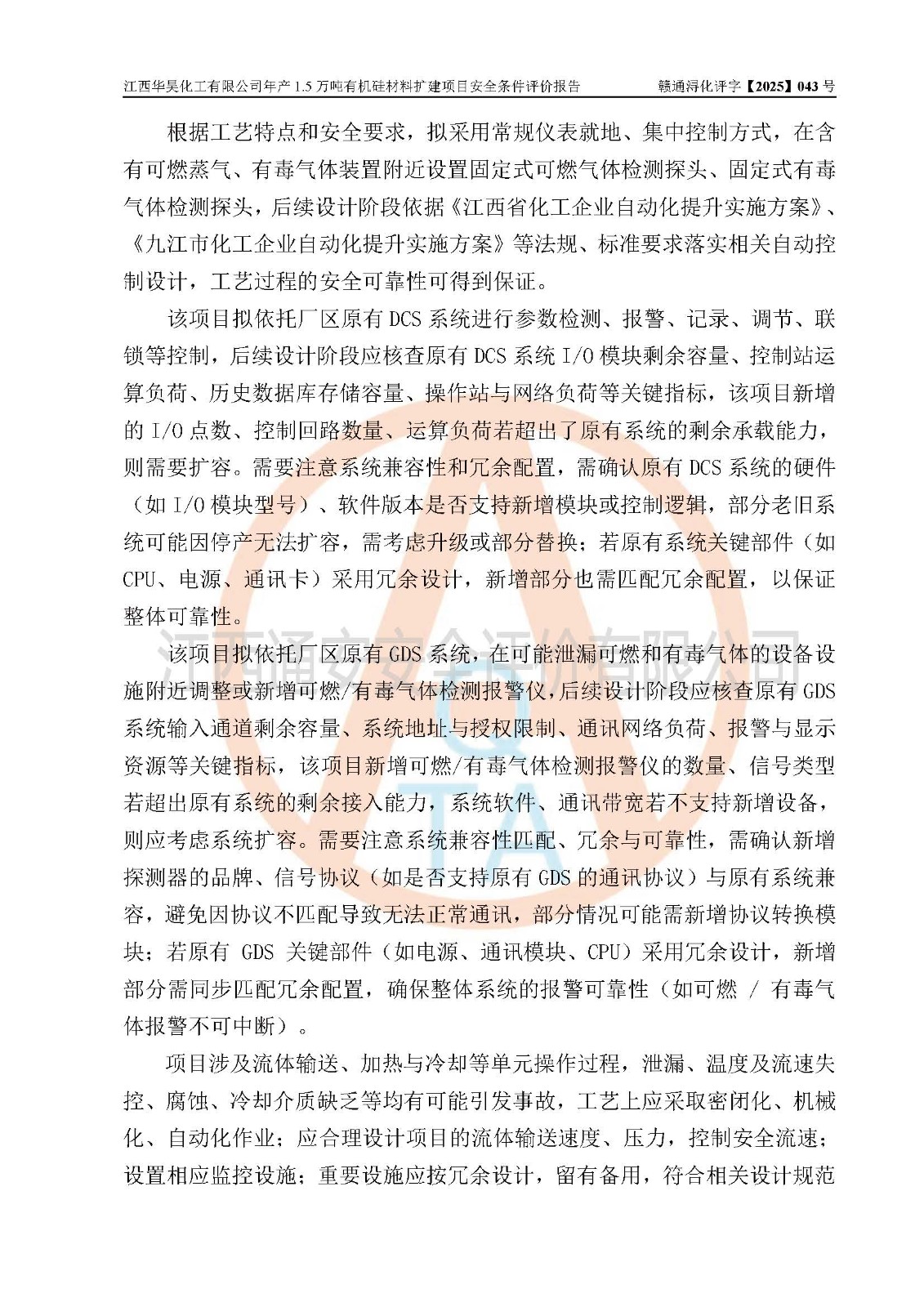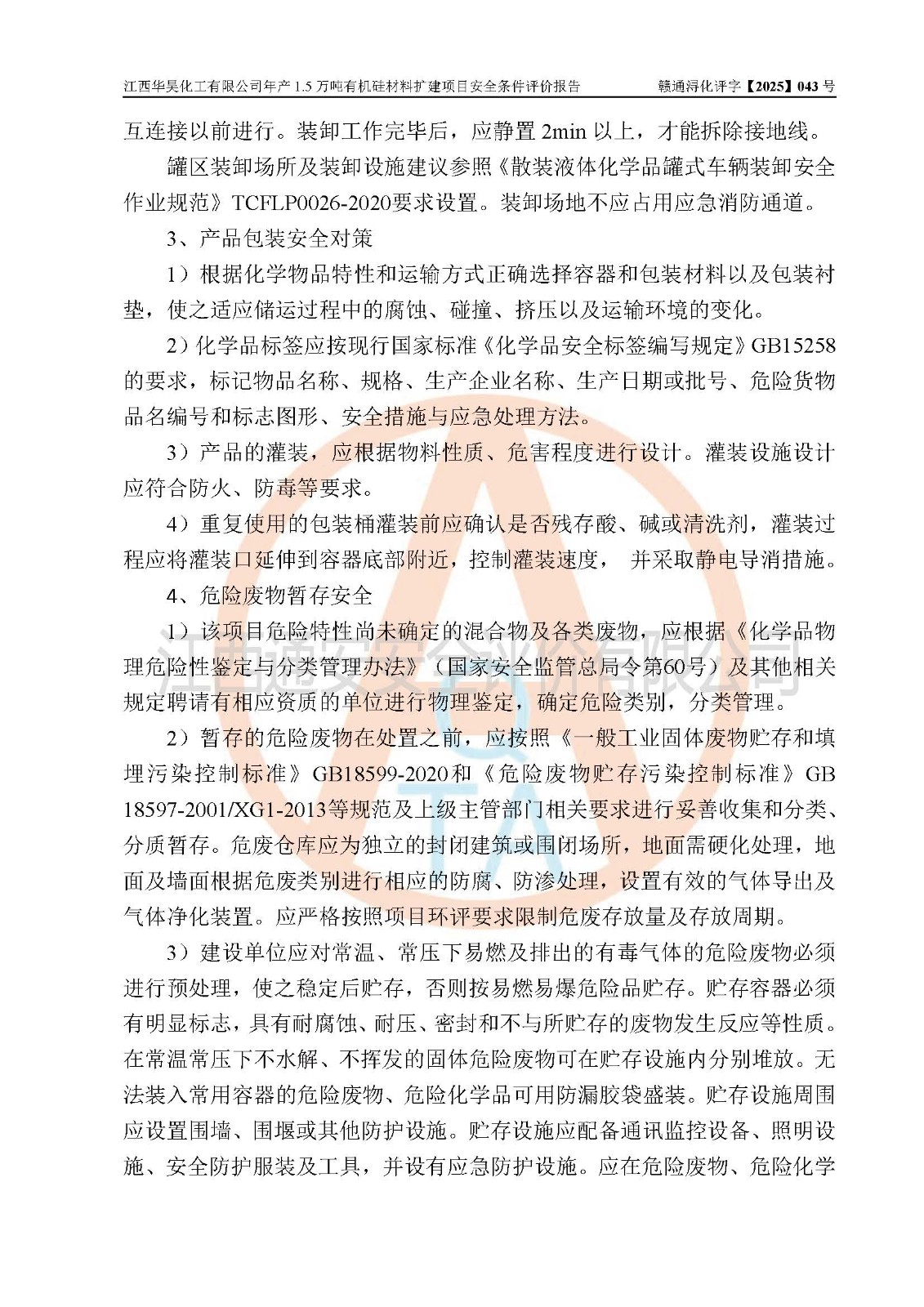 江西華昊化工有限公司是一家于2011年11月注冊成立的有限責任公司(自然人投資或控股),注冊地址位于永修縣云山經(jīng)濟開發(fā)區(qū)星火工業(yè)園星云大道旁,法定**人柴利兵,注冊資本1542萬元,經(jīng)營范圍包括許可項目和一般項目,許可項目為危險化學品生產(chǎn)、危險化學品經(jīng)營、貨物進出口、第二類醫(yī)療器械生產(chǎn),一般項目為合成材料制造(不含危險化學品)、合成材料銷售、第二類醫(yī)療器械銷售。 為滿足更大市場需求,同時解決企業(yè)原料及配套生產(chǎn)的需求,江西華昊化工有限公司擬投資5000萬元將廠區(qū)101硅油車間、102二車間原有項目改建為年產(chǎn)1.5萬噸有機硅材料擴建項目(以下簡稱“該項目”)。 該項目生產(chǎn)過程涉及的化學反應包括聚合(常壓)、水解、中和,涉及蒸餾、壓濾、流體輸送、熱交換、產(chǎn)品包裝等化工單元操作過程。該項目涉及的危險化學品包括四甲基氫氧化銨、氫氧化鉀、磷酸、30%氫氧化鈉溶液、六甲基二硅氧烷、乙醇、氯化氫、鹽酸、氮氣、DMC(二甲基環(huán)硅氧烷的混合物)、有機硅單體高沸物、**胺(廢氣組分)、甲醇(廢氣組分)、甲醚(廢氣組分),其中甲醇、甲醚屬于重點監(jiān)管的危險化學品,鹽酸屬于第三類易制毒化學品,乙醇、甲醇、甲醚屬于特別管控危險化學品,四甲基氫氧化銨、乙醇、**胺、甲醇、甲醚屬于第四類監(jiān)控化學品。該項目不涉及劇毒品、易制爆化學品、高毒物品,不涉及**、二、三類監(jiān)控化學品。 該項目不涉及重點監(jiān)管的典型危險化工工藝,生產(chǎn)單元、儲存單元不構成危險化學品重大危險源。 該項目副產(chǎn)品鹽酸、中間產(chǎn)品低粘度封頭劑(六甲基二硅氧烷)屬于危險化學品,該項目屬于危險化學品生產(chǎn)項目,依據(jù)《危險化學品生產(chǎn)企業(yè)安全生產(chǎn)許可證實施辦法》(**安全生產(chǎn)監(jiān)督管理總局令第41號,第79號、89號修改),項目需要辦理危險化學品安全生產(chǎn)許可證。 |