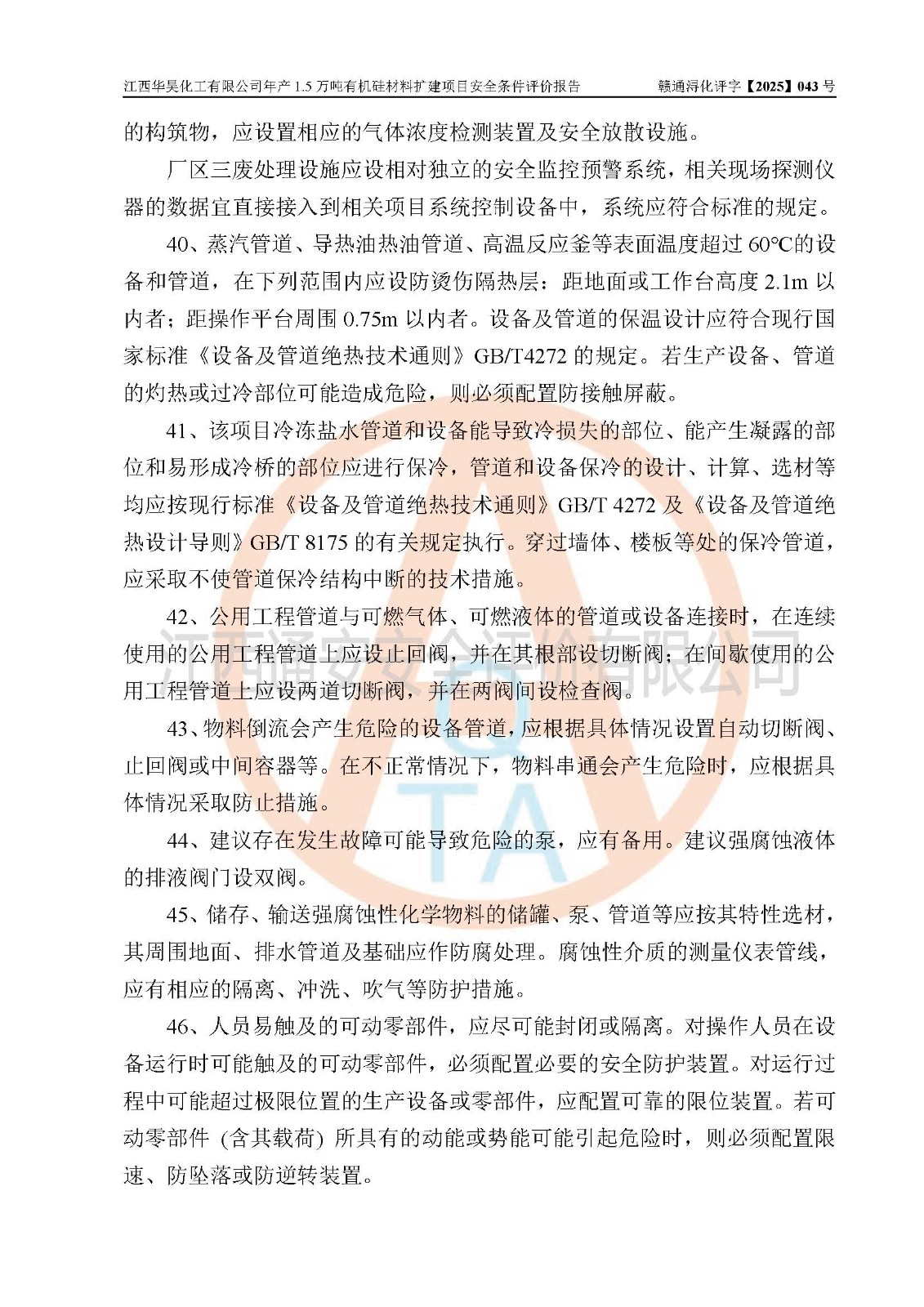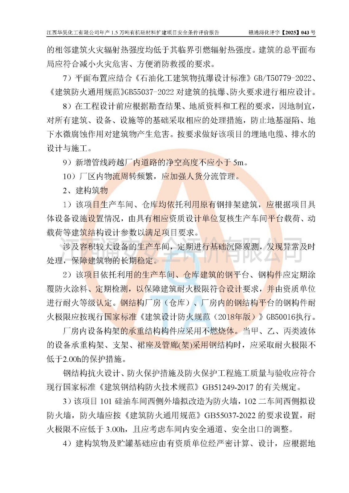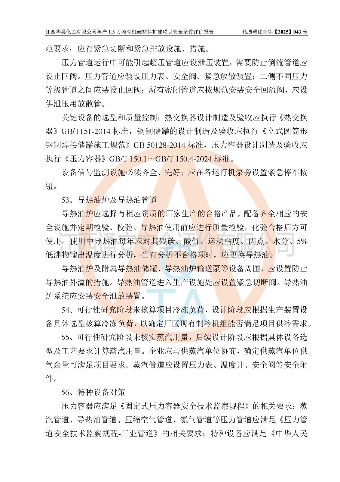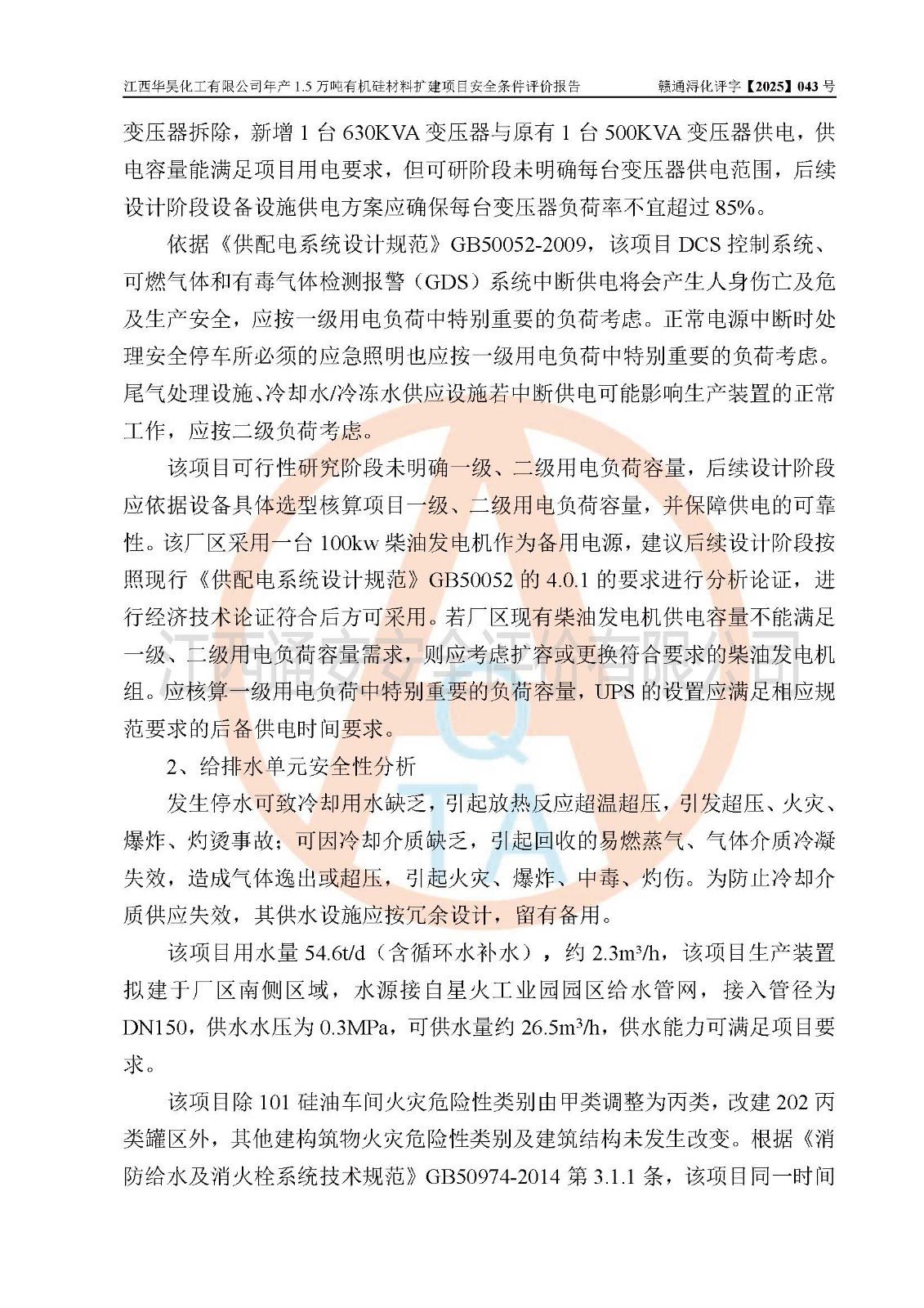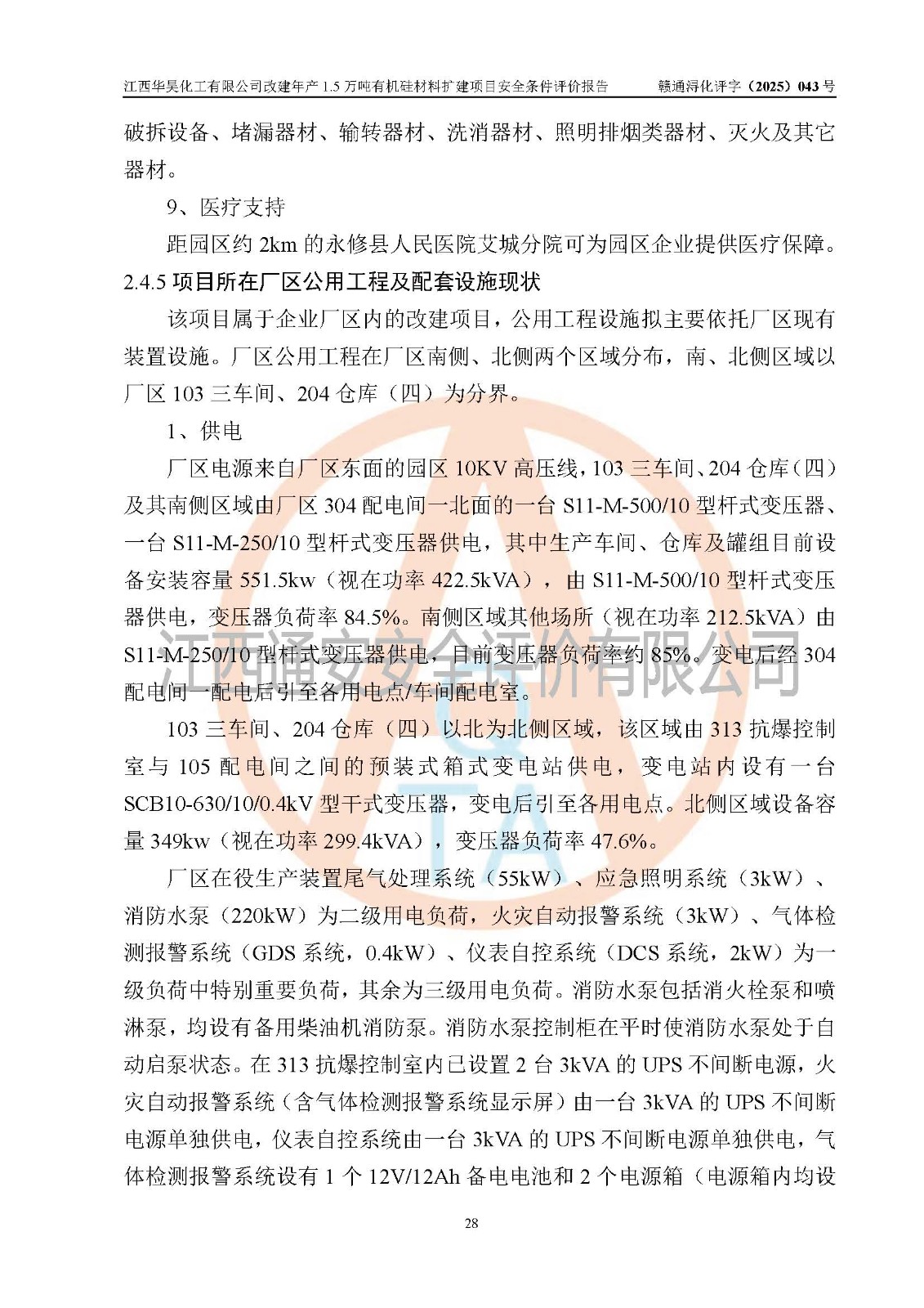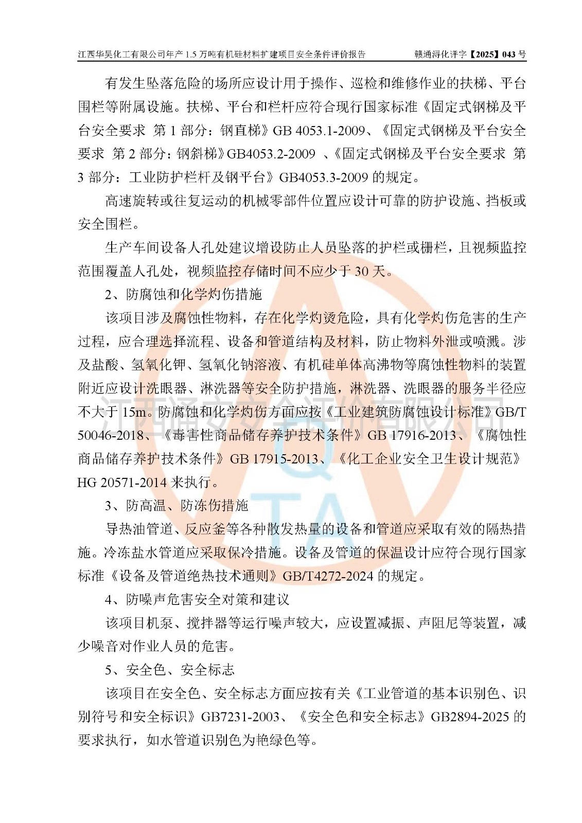 江西華昊化工有限公司是一家于2011年11月注冊成立的有限責任公司(自然人投資或控股),注冊地址位于永修縣云山經(jīng)濟開發(fā)區(qū)星火工業(yè)園星云大道旁,法定**人柴利兵,注冊資本1542萬元,經(jīng)營范圍包括許可項目和一般項目,許可項目為危險化學品生產(chǎn)、危險化學品經(jīng)營、貨物進出口、第二類醫(yī)療器械生產(chǎn),一般項目為合成材料制造(不含危險化學品)、合成材料銷售、第二類醫(yī)療器械銷售。 為滿足更大市場需求,同時解決企業(yè)原料及配套生產(chǎn)的需求,江西華昊化工有限公司擬投資5000萬元將廠區(qū)101硅油車間、102二車間原有項目改建為年產(chǎn)1.5萬噸有機硅材料擴建項目(以下簡稱“該項目”)。 該項目生產(chǎn)過程涉及的化學反應包括聚合(常壓)、水解、中和,涉及蒸餾、壓濾、流體輸送、熱交換、產(chǎn)品包裝等化工單元操作過程。該項目涉及的危險化學品包括四甲基氫氧化銨、氫氧化鉀、磷酸、30%氫氧化鈉溶液、六甲基二硅氧烷、乙醇、氯化氫、鹽酸、氮氣、DMC(二甲基環(huán)硅氧烷的混合物)、有機硅單體高沸物、**胺(廢氣組分)、甲醇(廢氣組分)、甲醚(廢氣組分),其中甲醇、甲醚屬于重點監(jiān)管的危險化學品,鹽酸屬于第三類易制毒化學品,乙醇、甲醇、甲醚屬于特別管控危險化學品,四甲基氫氧化銨、乙醇、**胺、甲醇、甲醚屬于第四類監(jiān)控化學品。該項目不涉及劇毒品、易制爆化學品、高毒物品,不涉及**、二、三類監(jiān)控化學品。 該項目不涉及重點監(jiān)管的典型危險化工工藝,生產(chǎn)單元、儲存單元不構成危險化學品重大危險源。 該項目副產(chǎn)品鹽酸、中間產(chǎn)品低粘度封頭劑(六甲基二硅氧烷)屬于危險化學品,該項目屬于危險化學品生產(chǎn)項目,依據(jù)《危險化學品生產(chǎn)企業(yè)安全生產(chǎn)許可證實施辦法》(**安全生產(chǎn)監(jiān)督管理總局令第41號,第79號、89號修改),項目需要辦理危險化學品安全生產(chǎn)許可證。 |