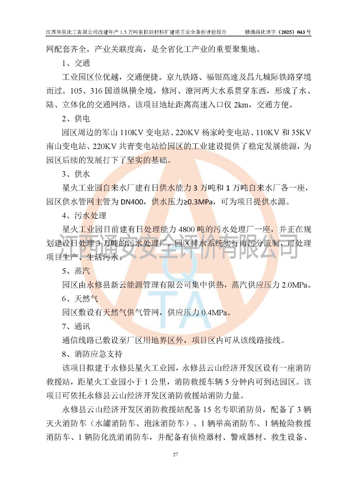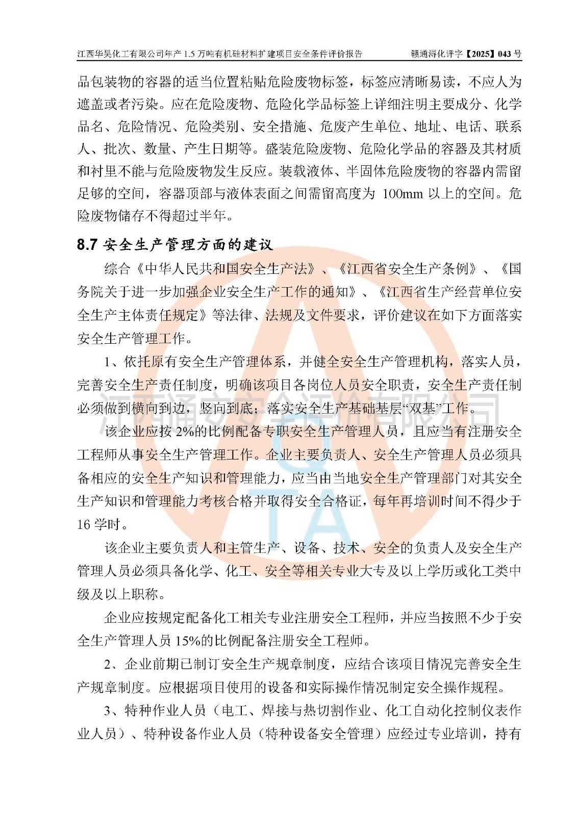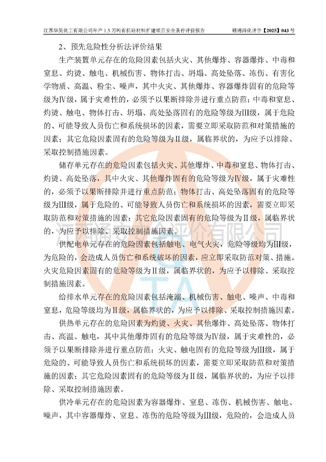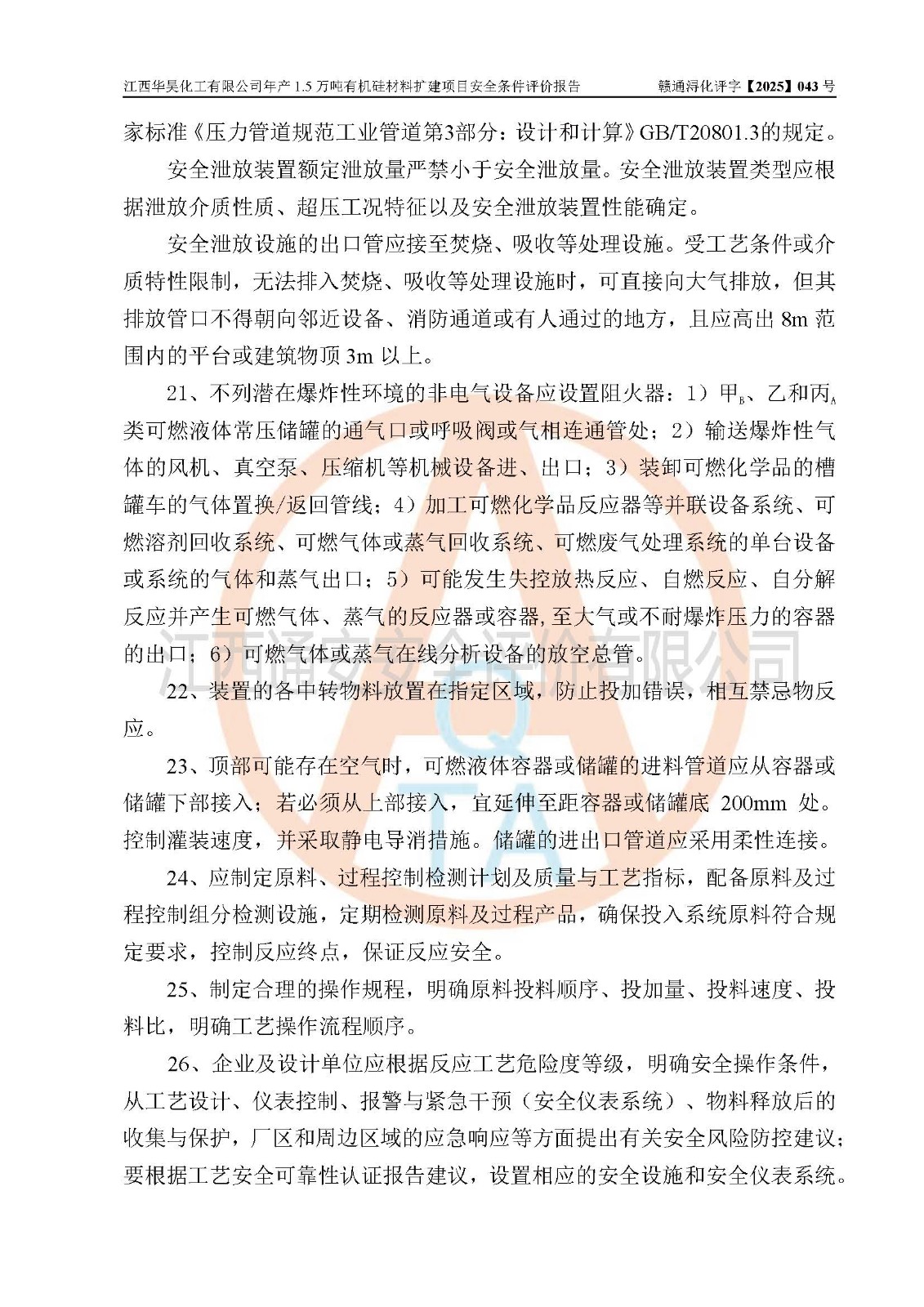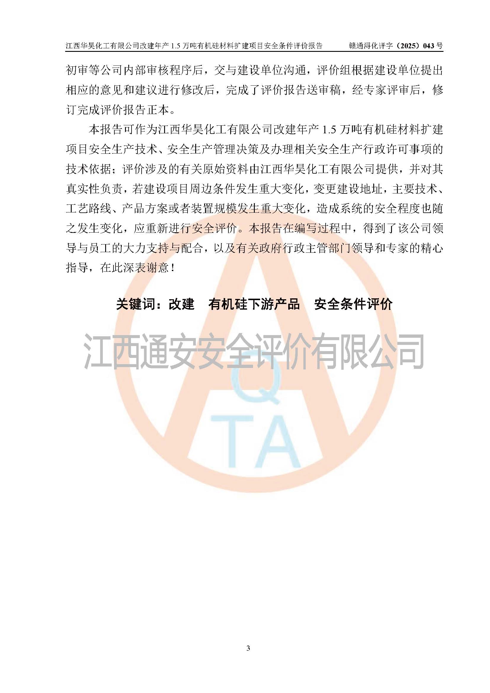 江西華昊化工有限公司是一家于2011年11月注冊成立的有限責任公司(自然人投資或控股),注冊地址位于永修縣云山經(jīng)濟開發(fā)區(qū)星火工業(yè)園星云大道旁,法定**人柴利兵,注冊資本1542萬元,經(jīng)營范圍包括許可項目和一般項目,許可項目為危險化學品生產(chǎn)、危險化學品經(jīng)營、貨物進出口、第二類醫(yī)療器械生產(chǎn),一般項目為合成材料制造(不含危險化學品)、合成材料銷售、第二類醫(yī)療器械銷售。 為滿足更大市場需求,同時解決企業(yè)原料及配套生產(chǎn)的需求,江西華昊化工有限公司擬投資5000萬元將廠區(qū)101硅油車間、102二車間原有項目改建為年產(chǎn)1.5萬噸有機硅材料擴建項目(以下簡稱“該項目”)。 該項目生產(chǎn)過程涉及的化學反應包括聚合(常壓)、水解、中和,涉及蒸餾、壓濾、流體輸送、熱交換、產(chǎn)品包裝等化工單元操作過程。該項目涉及的危險化學品包括四甲基氫氧化銨、氫氧化鉀、磷酸、30%氫氧化鈉溶液、六甲基二硅氧烷、乙醇、氯化氫、鹽酸、氮氣、DMC(二甲基環(huán)硅氧烷的混合物)、有機硅單體高沸物、**胺(廢氣組分)、甲醇(廢氣組分)、甲醚(廢氣組分),其中甲醇、甲醚屬于重點監(jiān)管的危險化學品,鹽酸屬于第三類易制毒化學品,乙醇、甲醇、甲醚屬于特別管控危險化學品,四甲基氫氧化銨、乙醇、**胺、甲醇、甲醚屬于第四類監(jiān)控化學品。該項目不涉及劇毒品、易制爆化學品、高毒物品,不涉及**、二、三類監(jiān)控化學品。 該項目不涉及重點監(jiān)管的典型危險化工工藝,生產(chǎn)單元、儲存單元不構成危險化學品重大危險源。 該項目副產(chǎn)品鹽酸、中間產(chǎn)品低粘度封頭劑(六甲基二硅氧烷)屬于危險化學品,該項目屬于危險化學品生產(chǎn)項目,依據(jù)《危險化學品生產(chǎn)企業(yè)安全生產(chǎn)許可證實施辦法》(**安全生產(chǎn)監(jiān)督管理總局令第41號,第79號、89號修改),項目需要辦理危險化學品安全生產(chǎn)許可證。 |